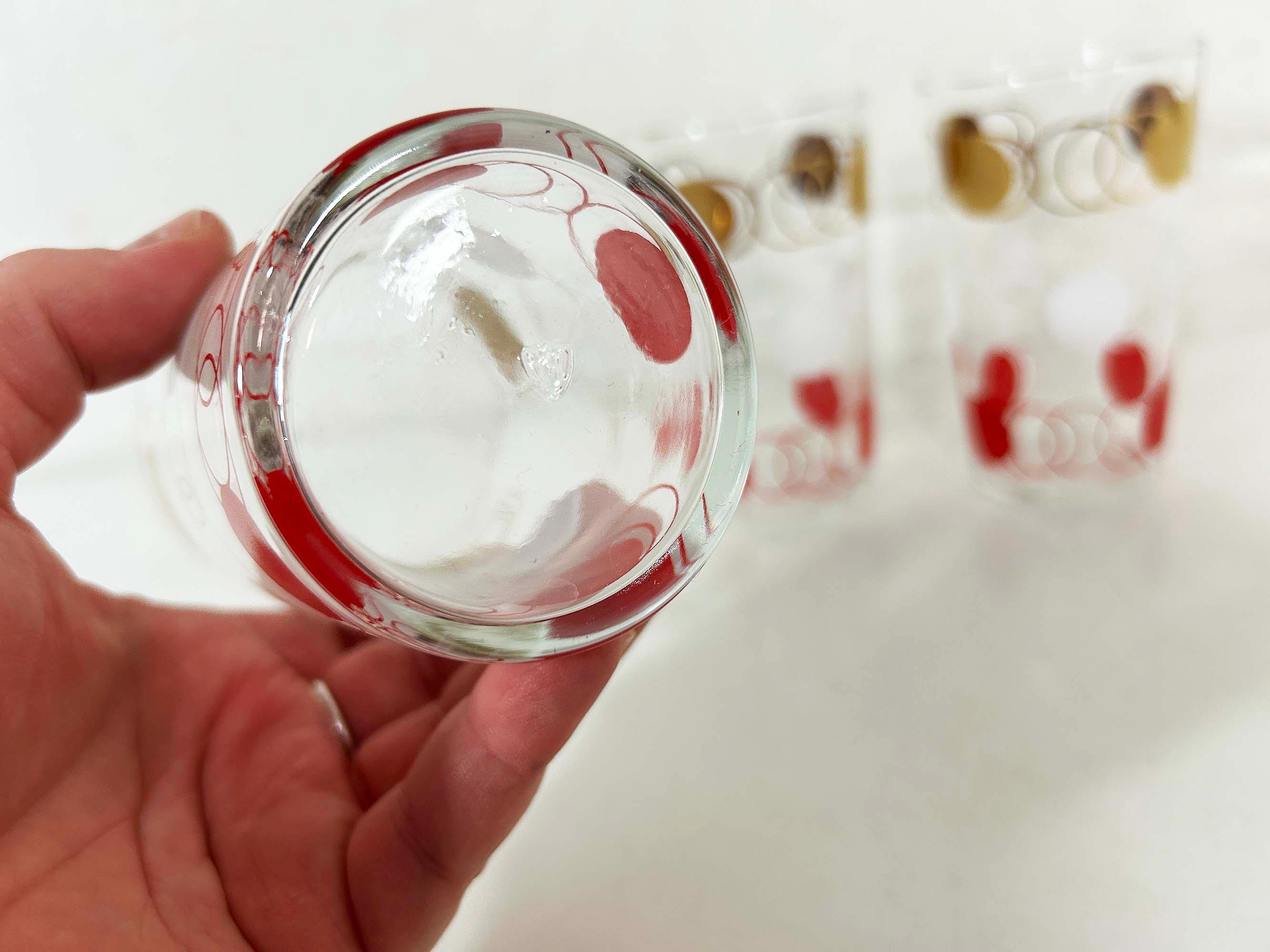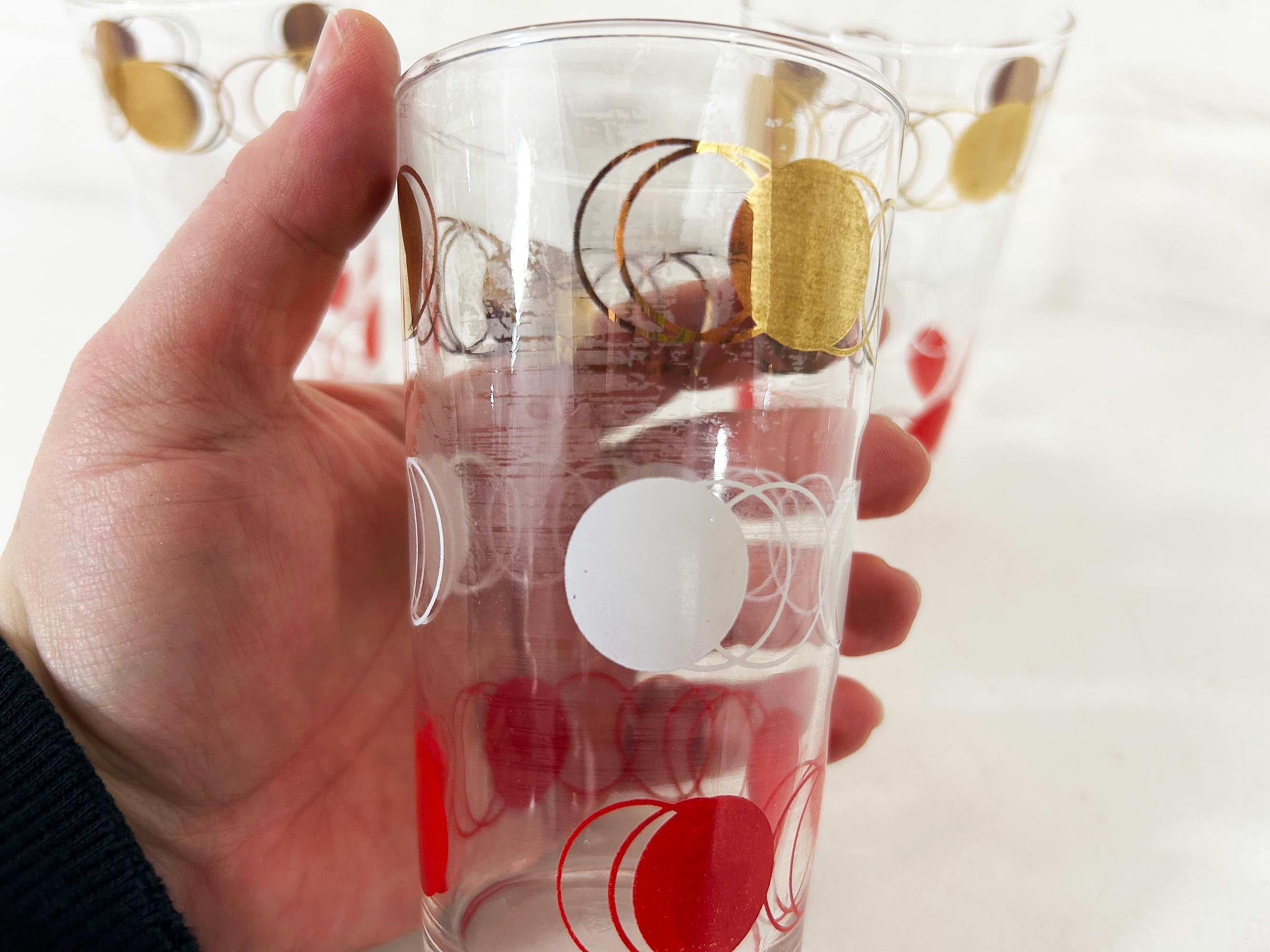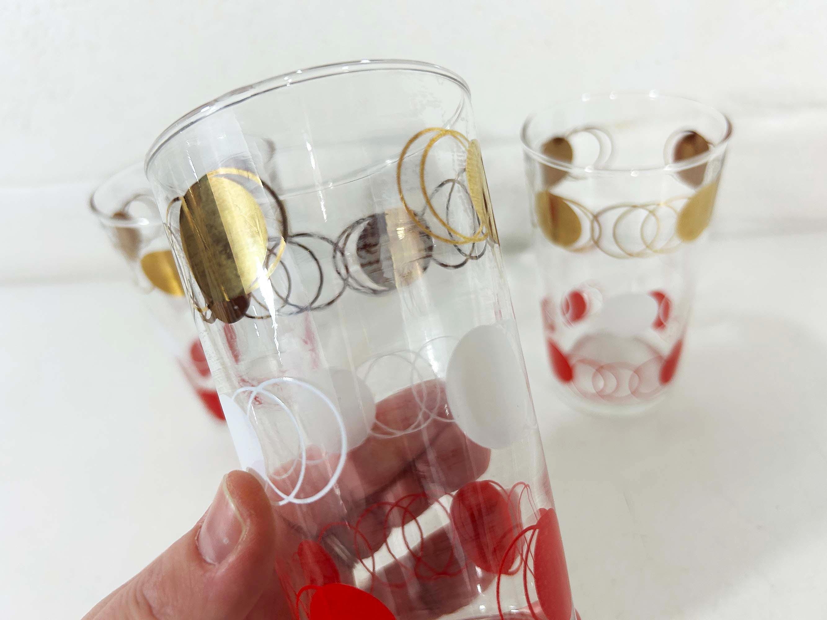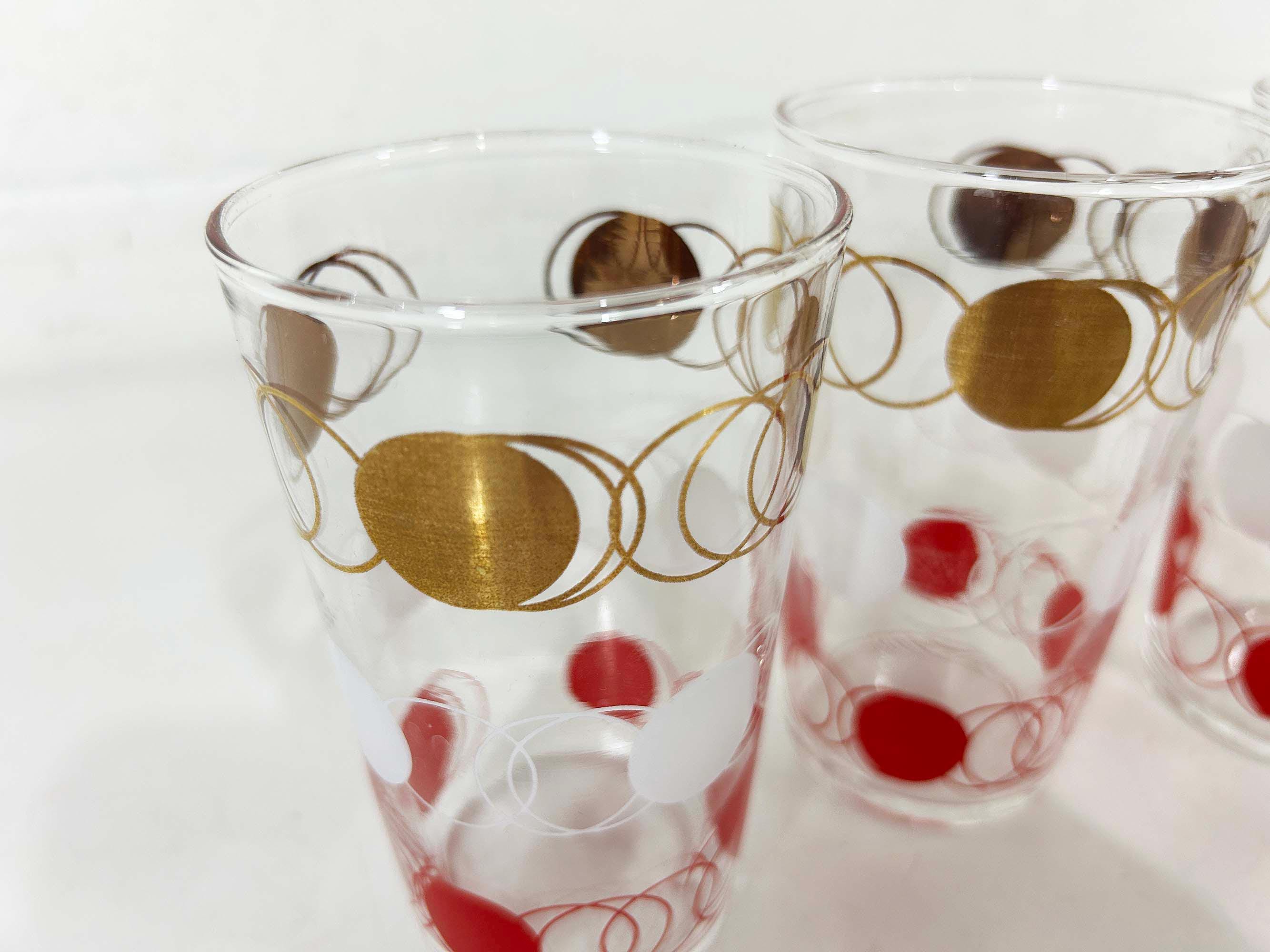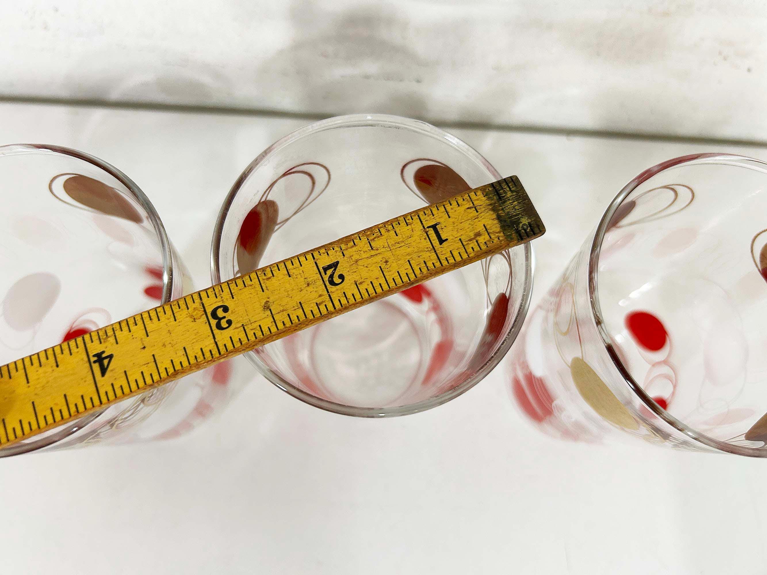 Vintage set of 3 small atomic glasses made by Federal Glass. A perfect addition to any bar or vintage kitchen! All are in good vintage condition with some paint loss and fogging from prior use - please see photos. Each glass is approximately 4 3/4 inches tall and 2 3/4 inches in diameter across the top. Each glass holds approximately 12 ounces of liquid when filled to the brim.