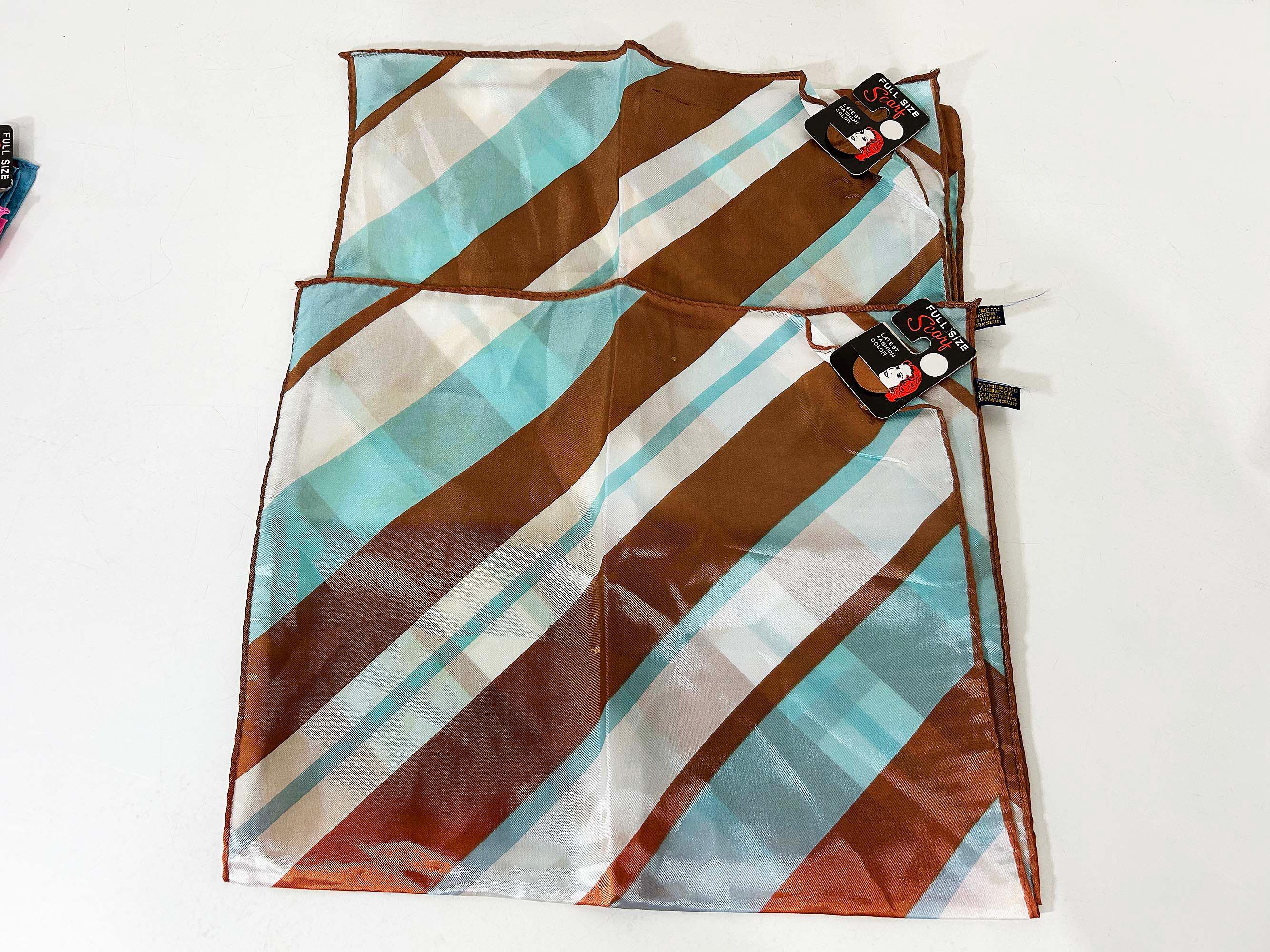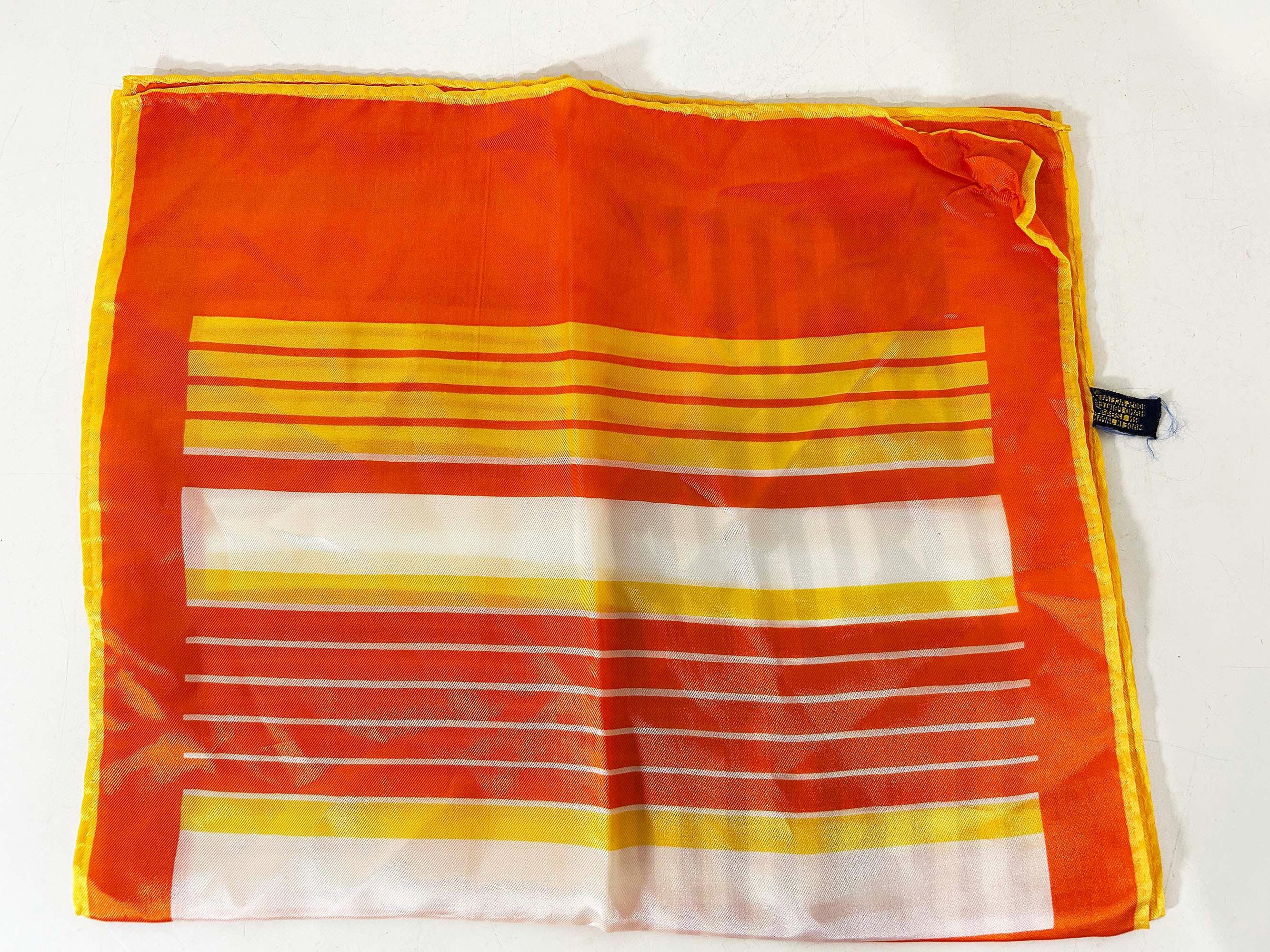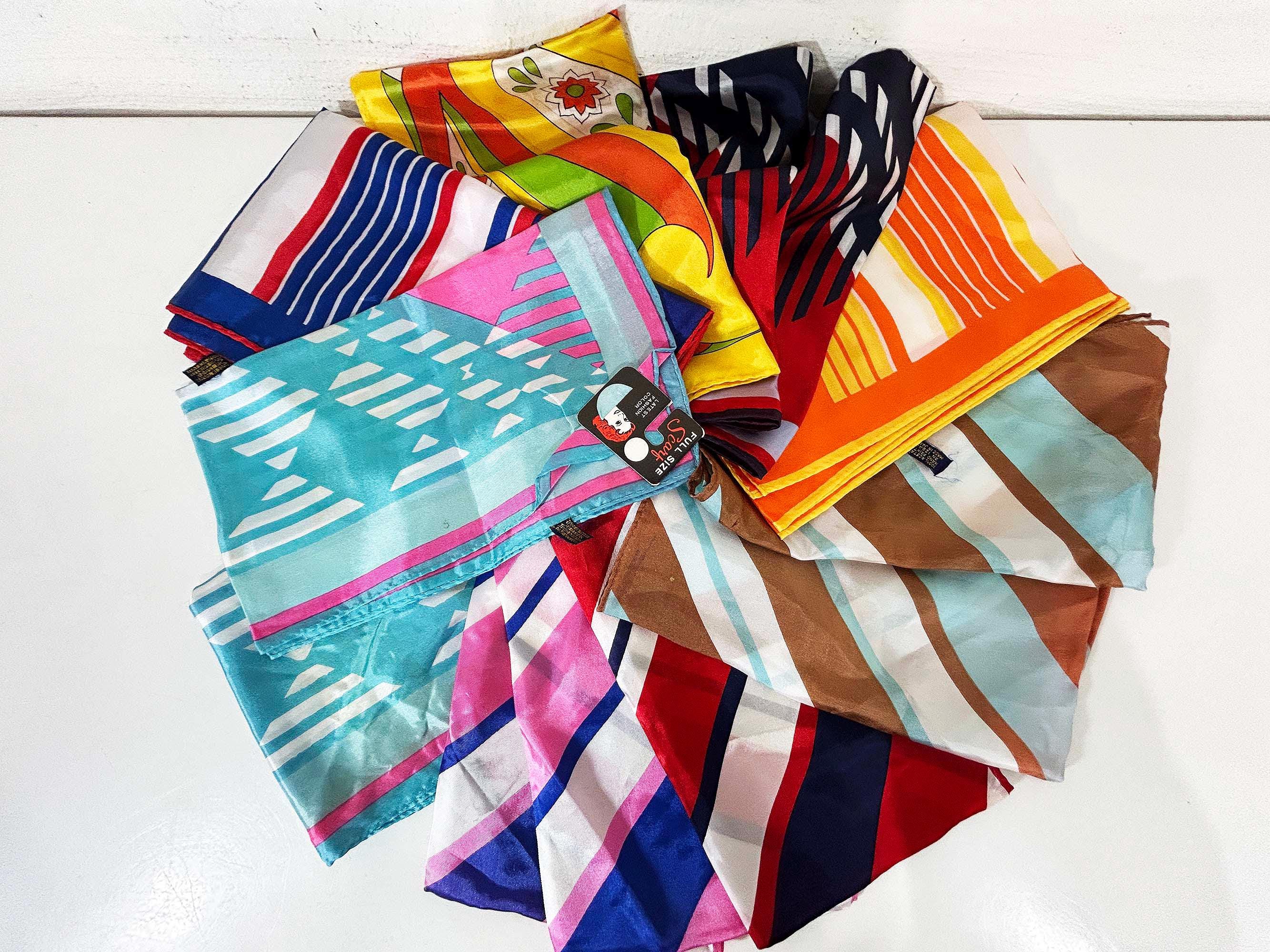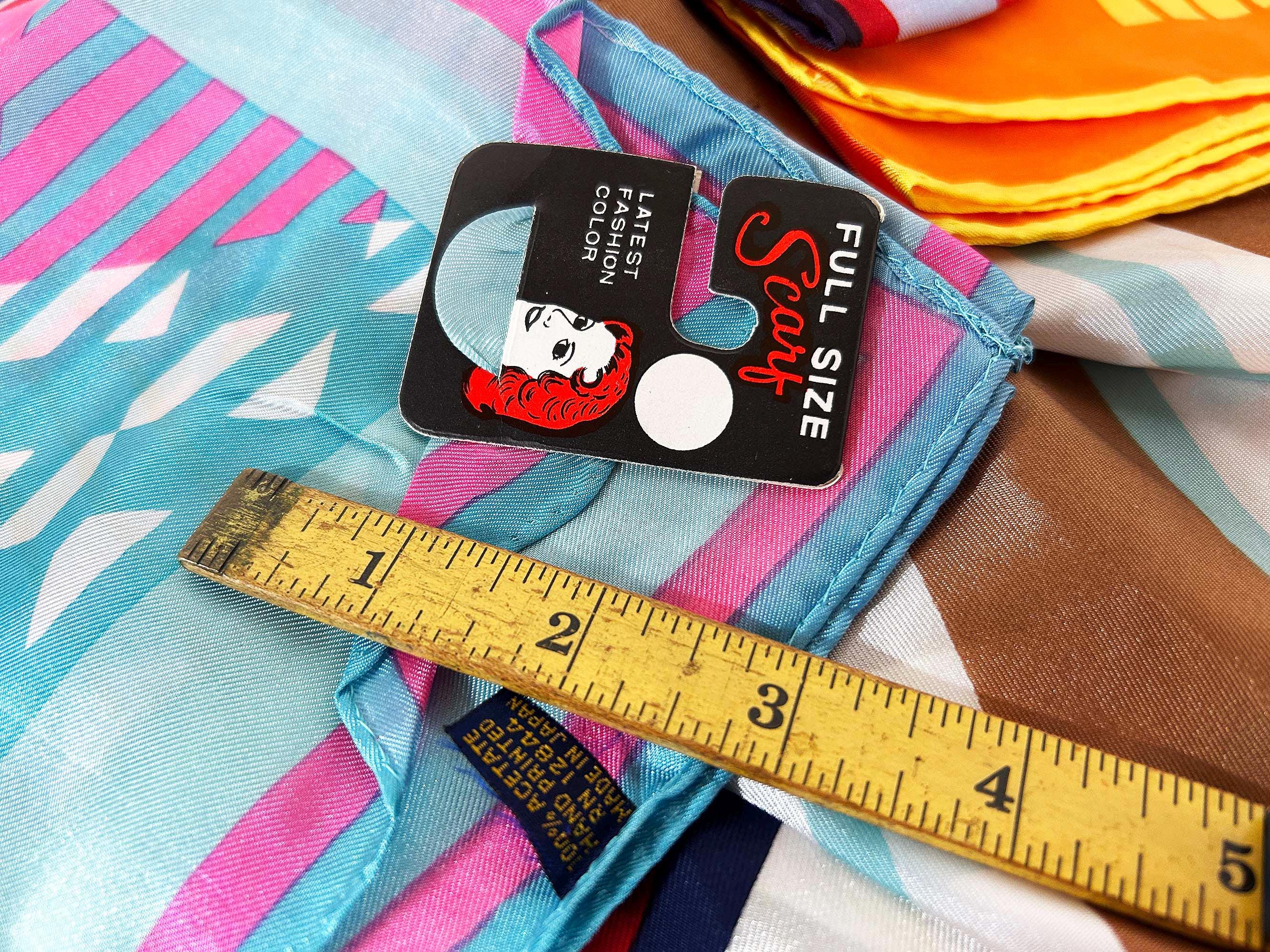 Lovely scarves in a rainbow of colors! These scarves are long so they can be used as a head wrap too. The scarves are lightweight with a bit of sheerness. Each scarf is in good vintage condition with some light stains likely from storage - please be sure to inspect all photos closely. Each scarf is approximately 43 1/2 inches long and 13 inches wide. They come with their tags still attached except for the orange striped one that does not. Please choose the one you'd like to purchase from the drop down menu.