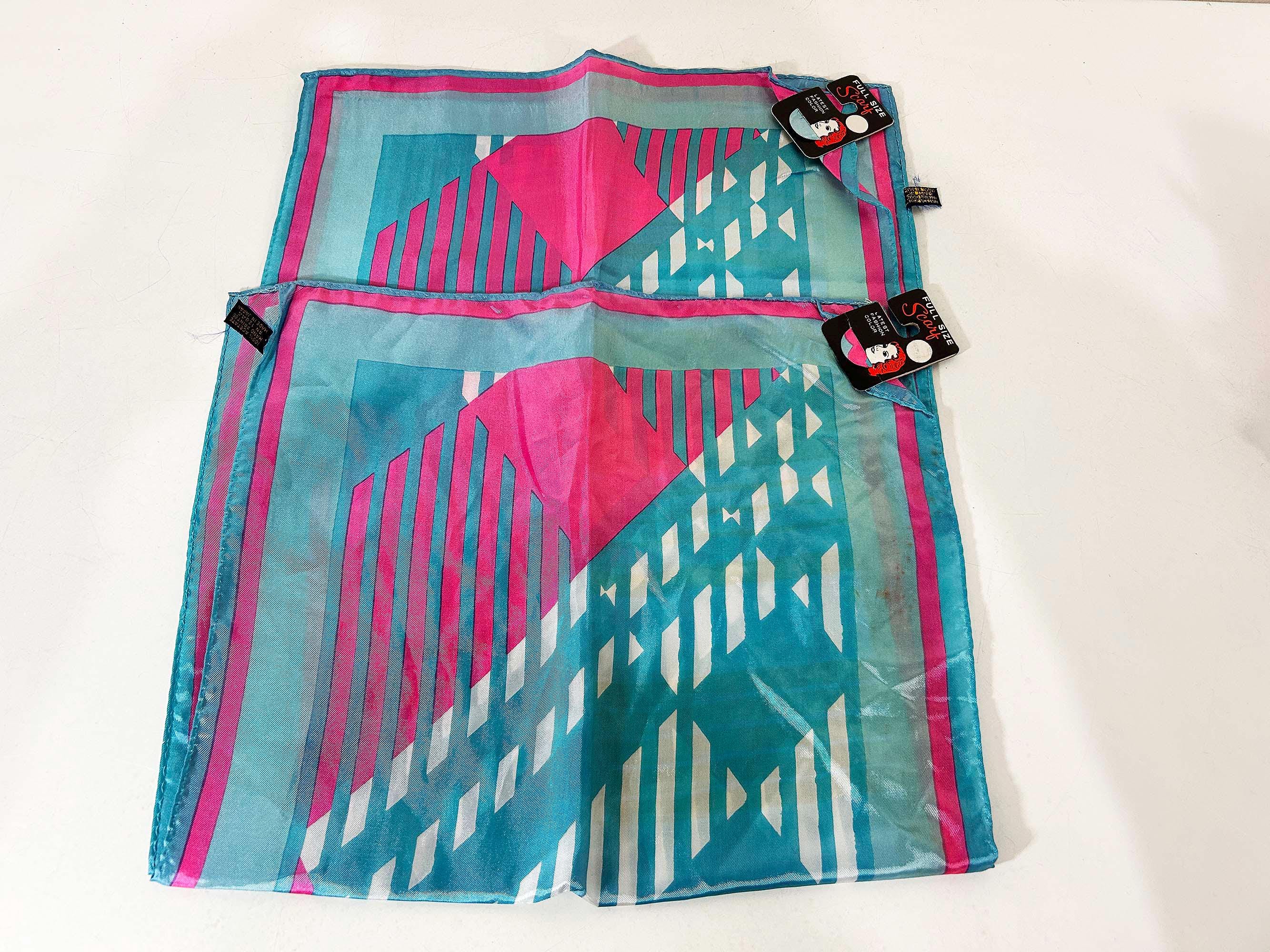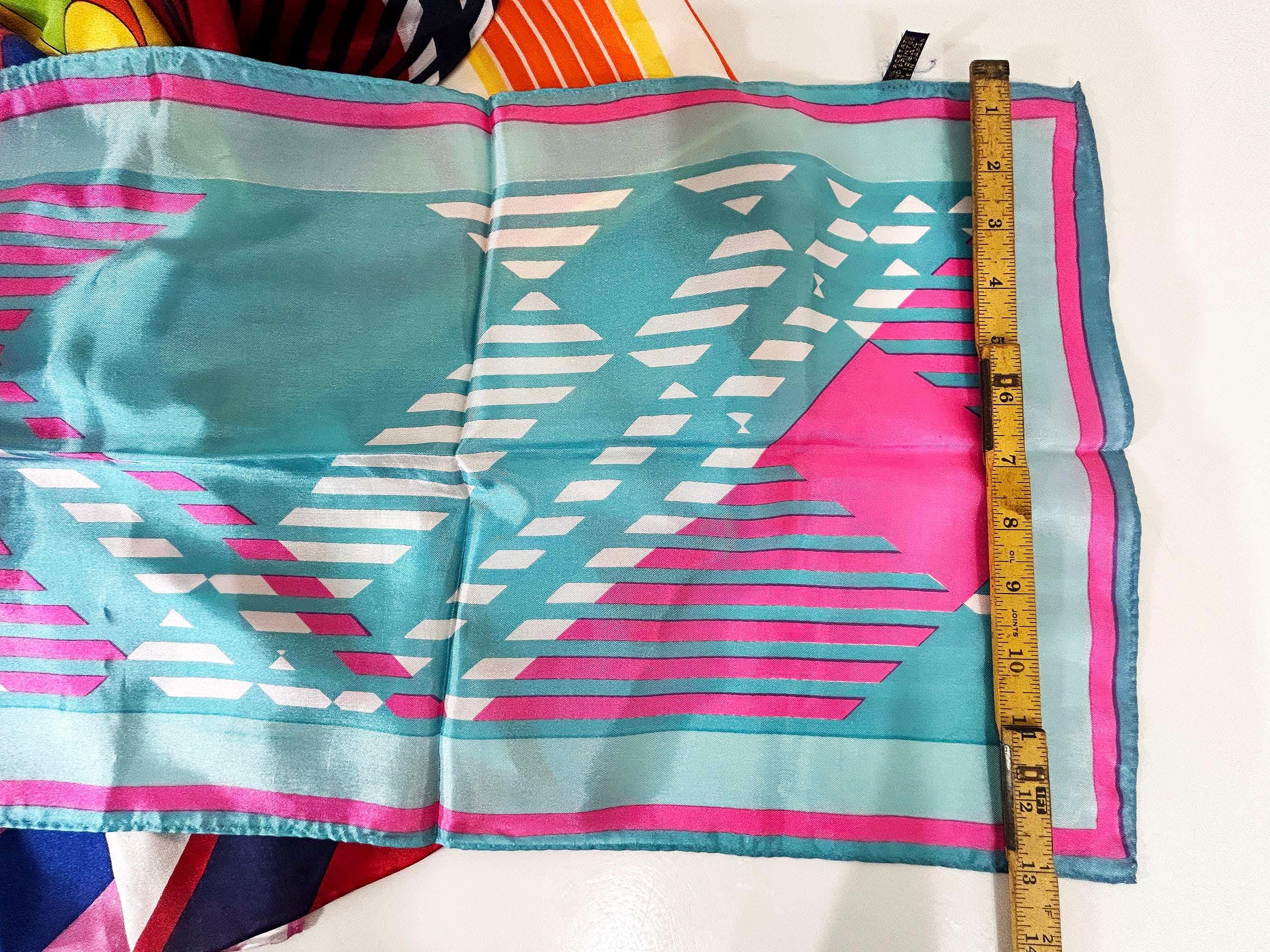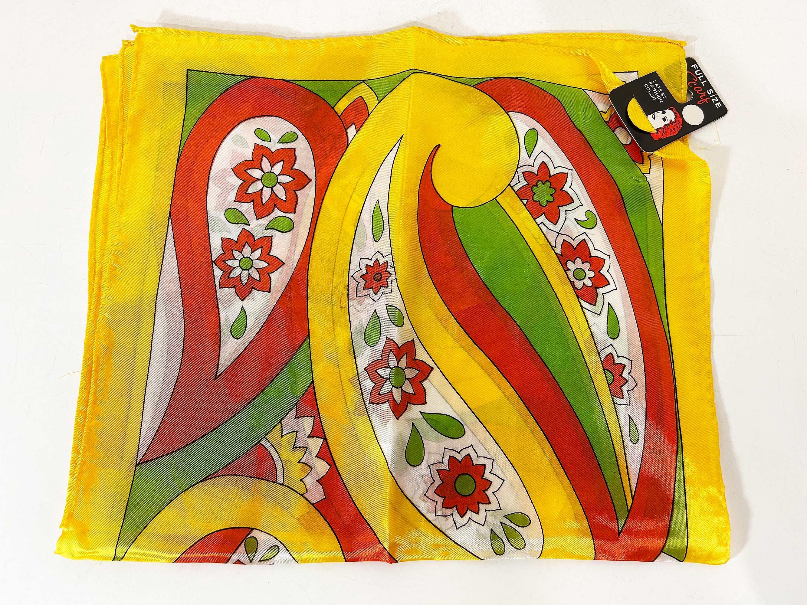 Lovely scarves in a rainbow of colors! These scarves are long so they can be used as a head wrap too. The scarves are lightweight with a bit of sheerness. Each scarf is in good vintage condition with some light stains likely from storage - please be sure to inspect all photos closely. Each scarf is approximately 43 1/2 inches long and 13 inches wide. They come with their tags still attached except for the orange striped one that does not. Please choose the one you'd like to purchase from the drop down menu.