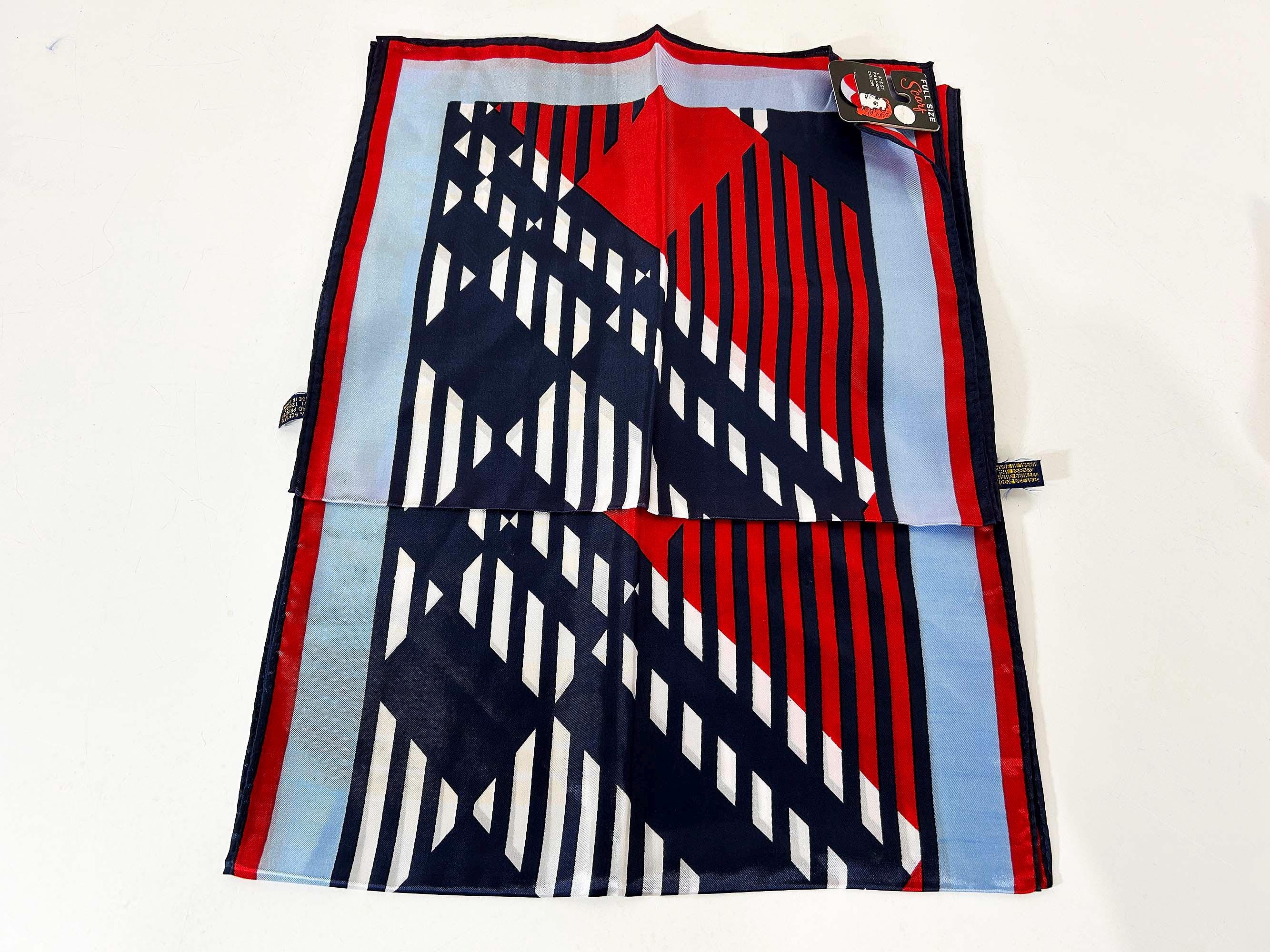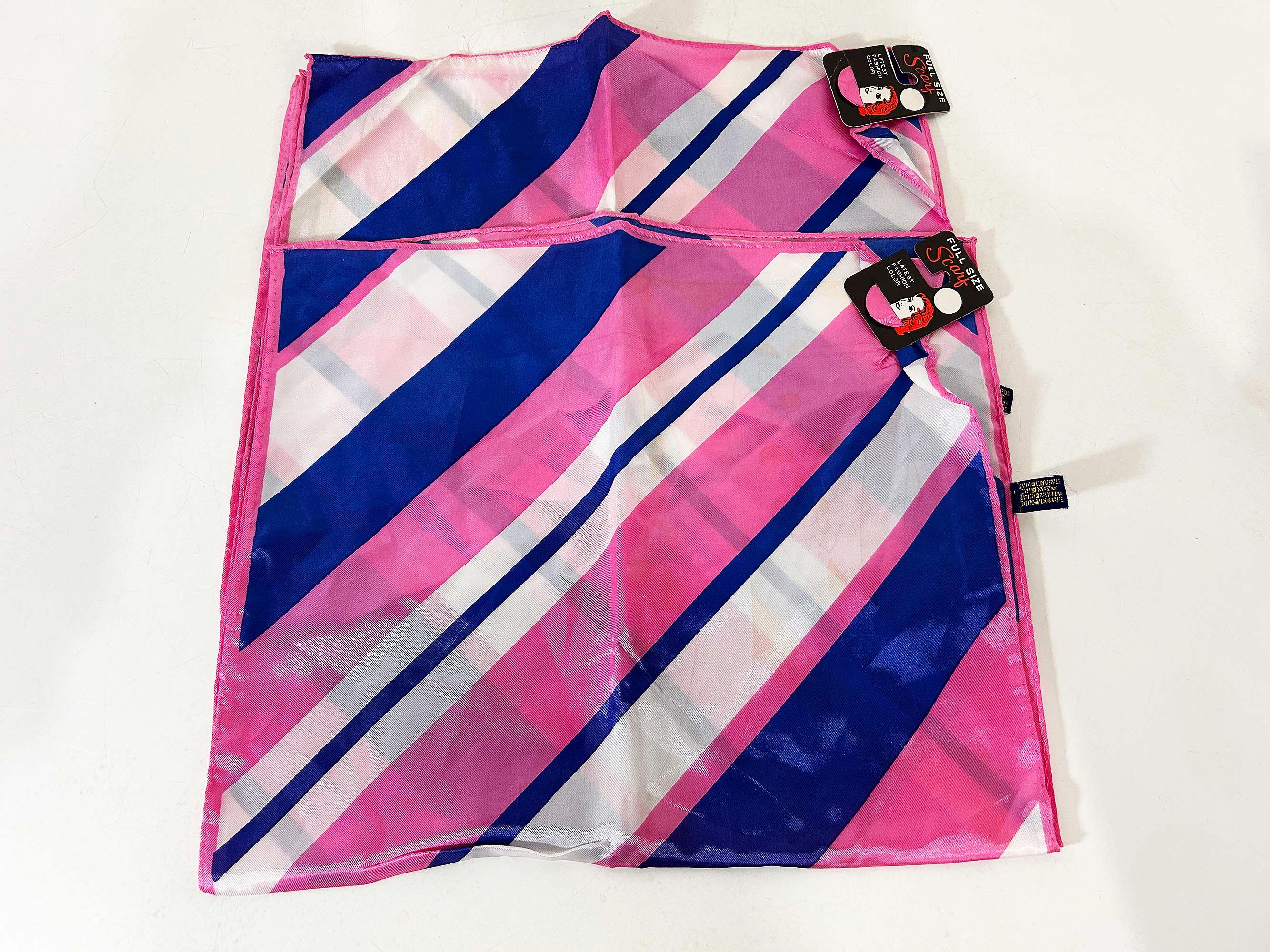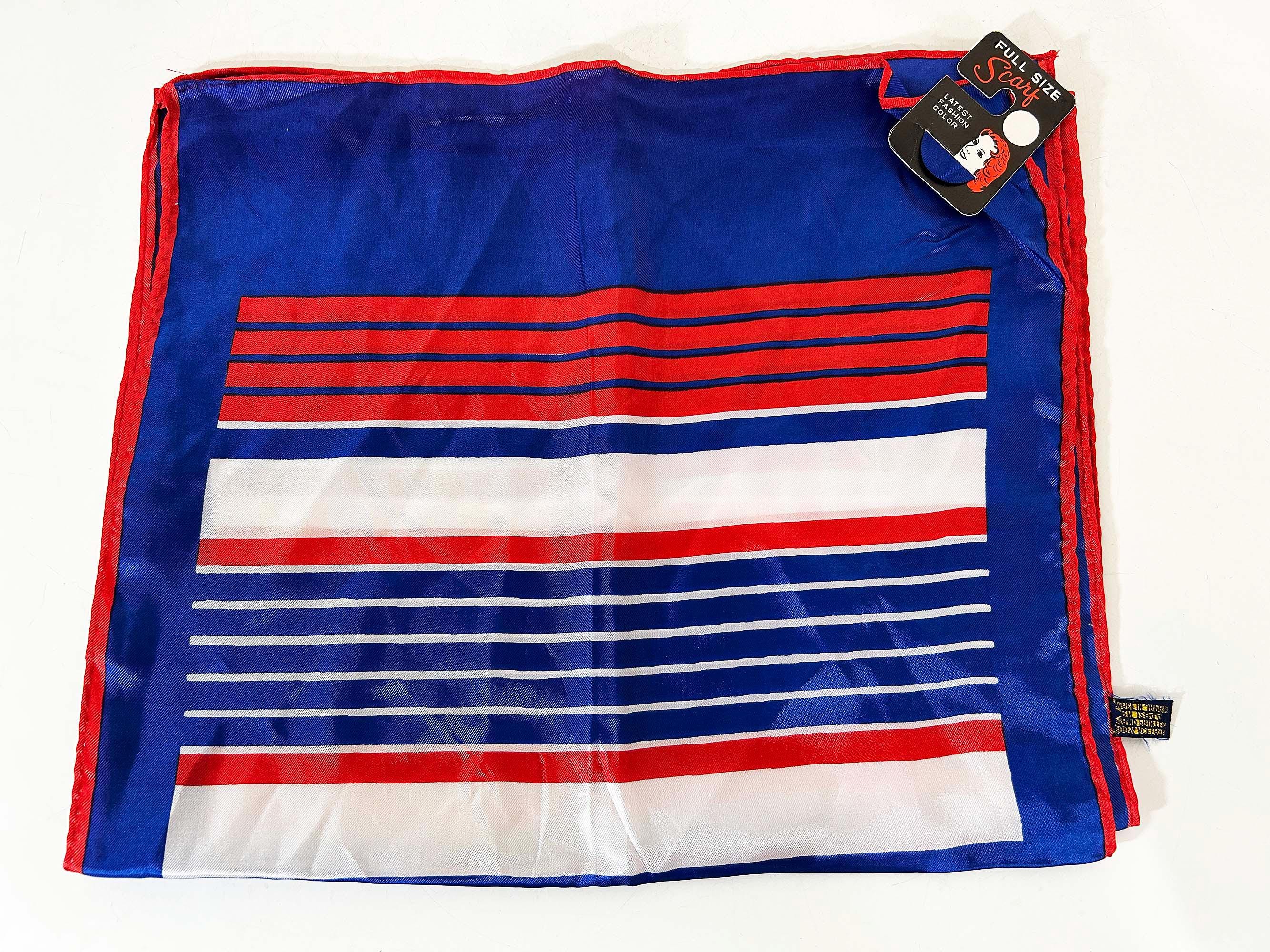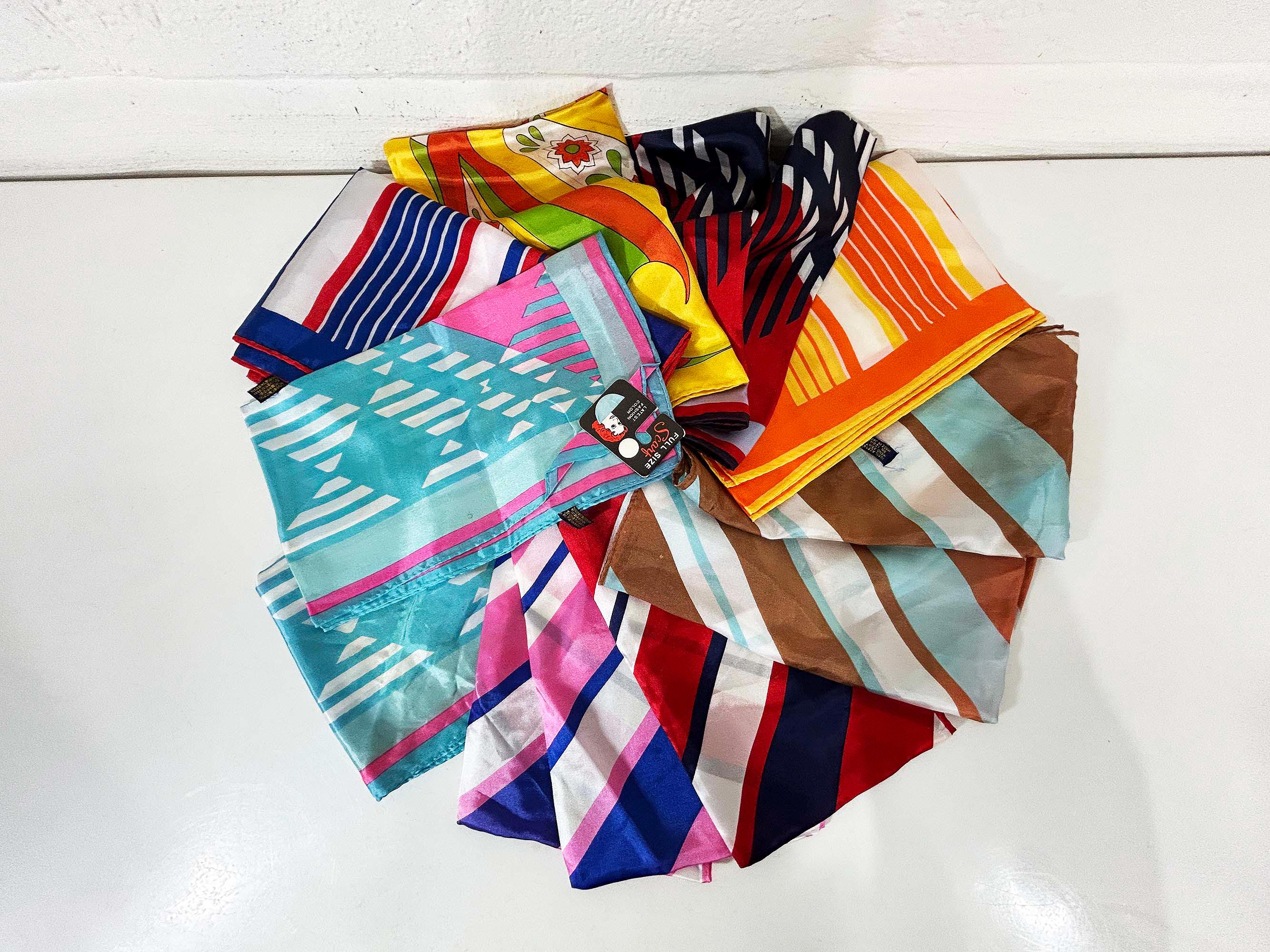 Lovely scarves in a rainbow of colors! These scarves are long so they can be used as a head wrap too. The scarves are lightweight with a bit of sheerness. Each scarf is in good vintage condition with some light stains likely from storage - please be sure to inspect all photos closely. Each scarf is approximately 43 1/2 inches long and 13 inches wide. They come with their tags still attached except for the orange striped one that does not. Please choose the one you'd like to purchase from the drop down menu.
