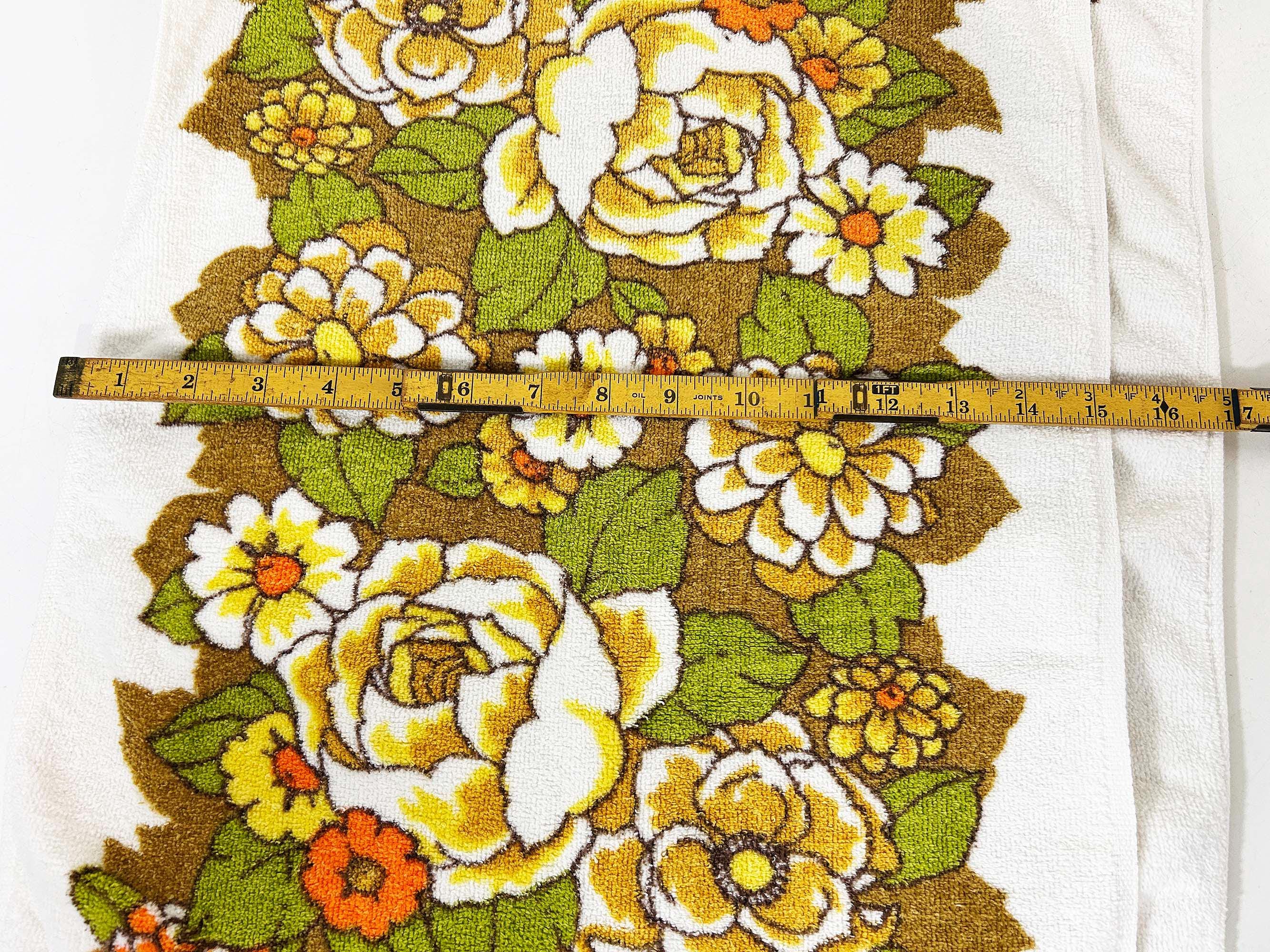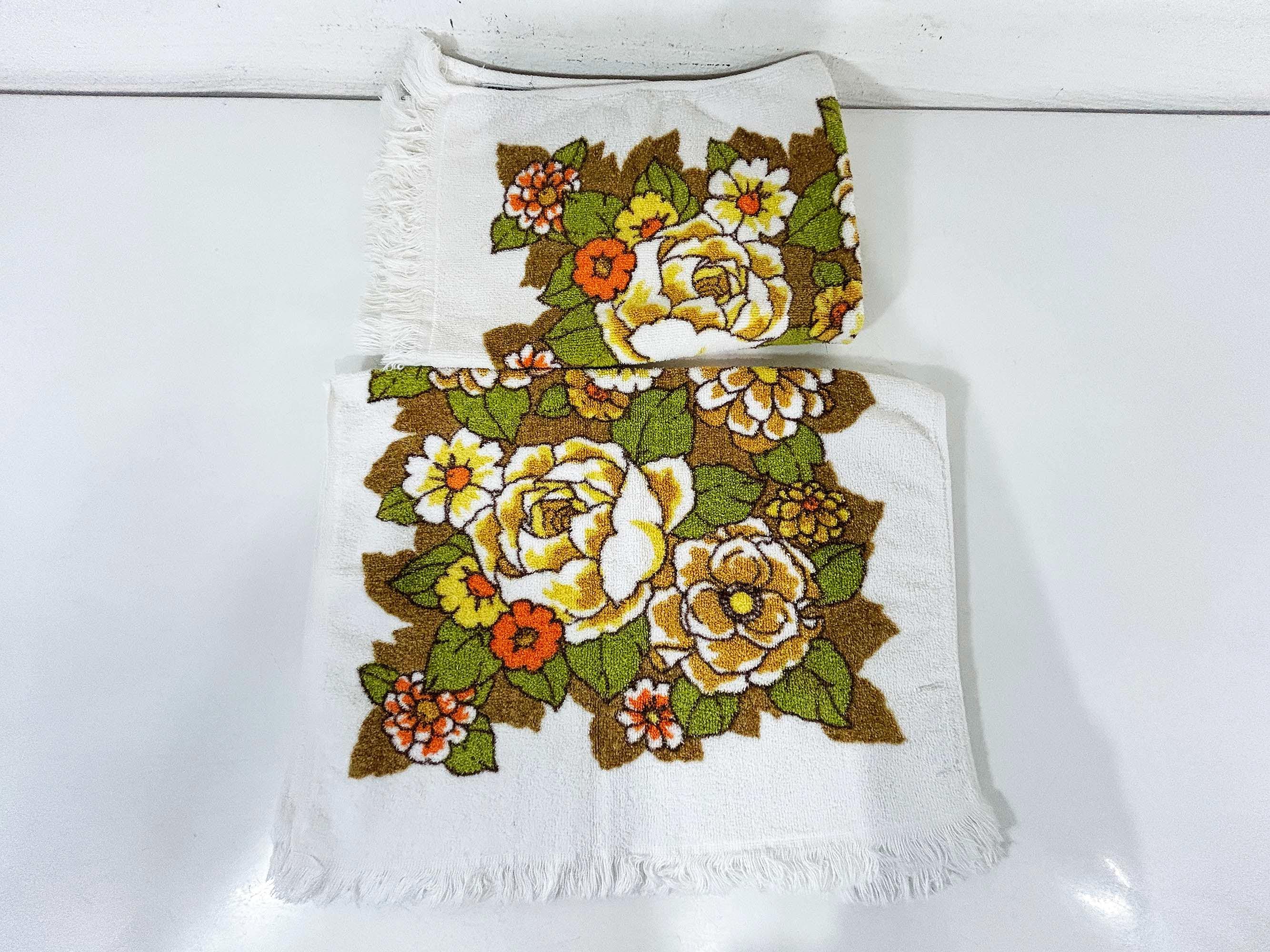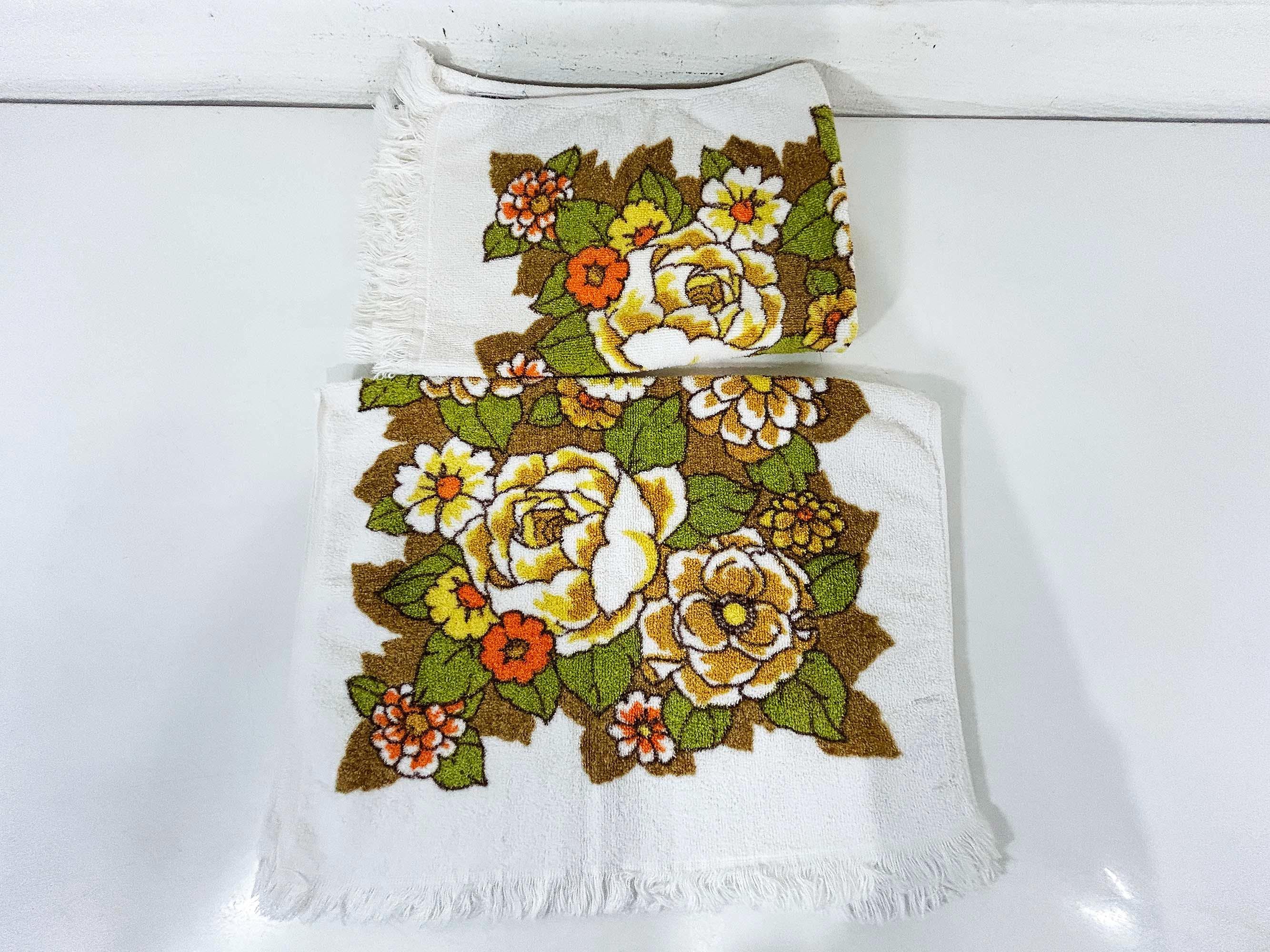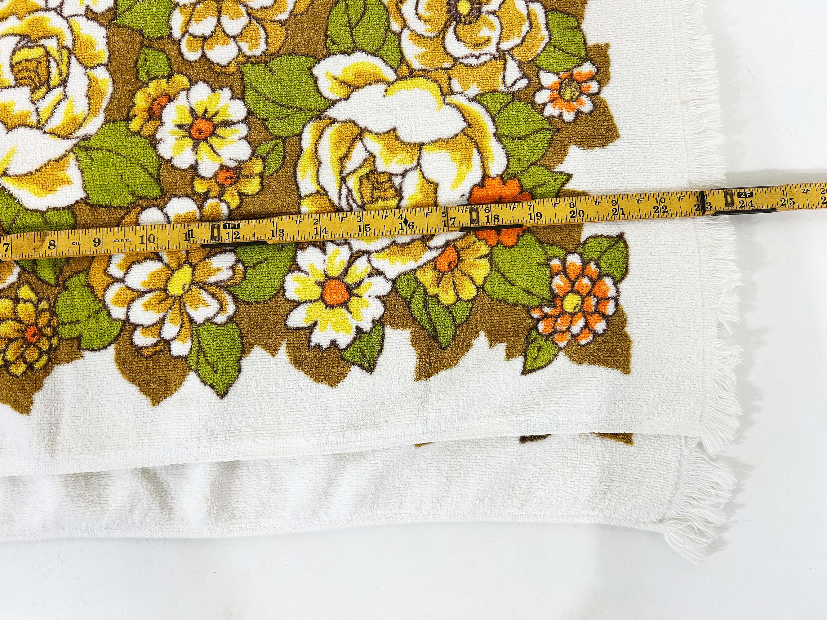 Super adorable hand towel set with a pretty yellow, green, and brown floral pattern - perfect for your vintage bathroom! Each towel is approximately 37 inches long and 24 inches wide. Keep in mind vintage towels are typically smaller than modern ones. They are in good vintage condition, still pretty fluffy!