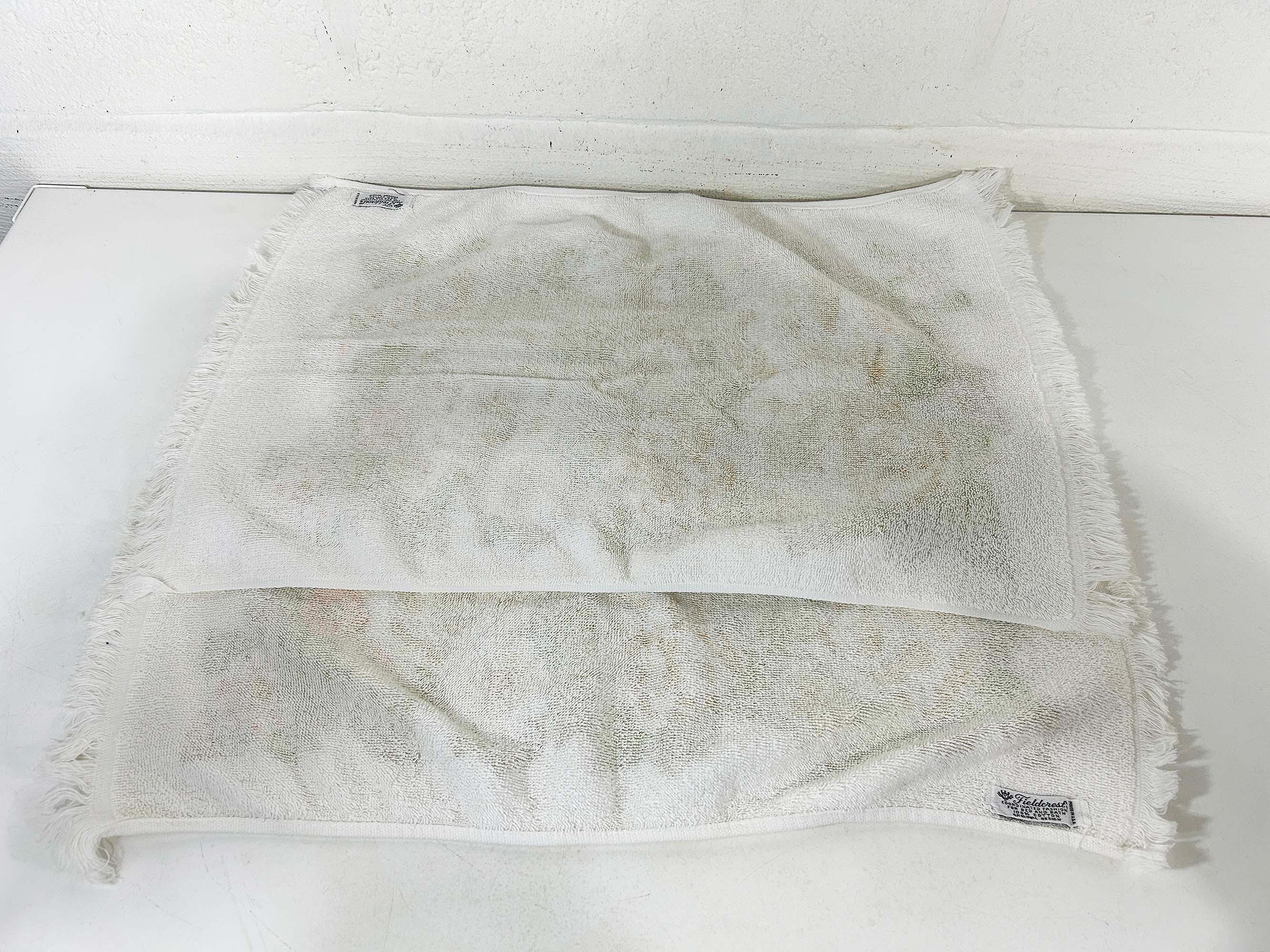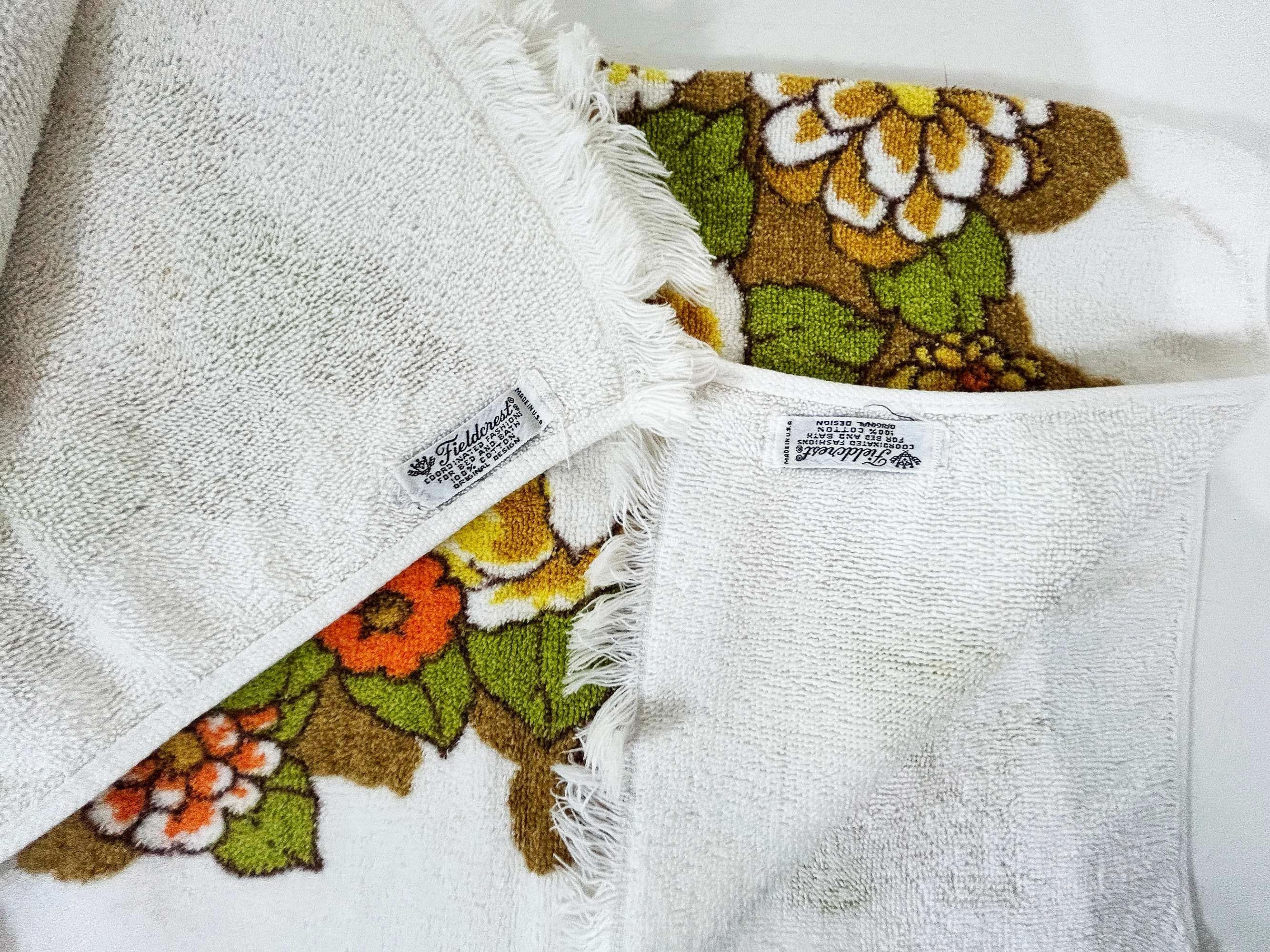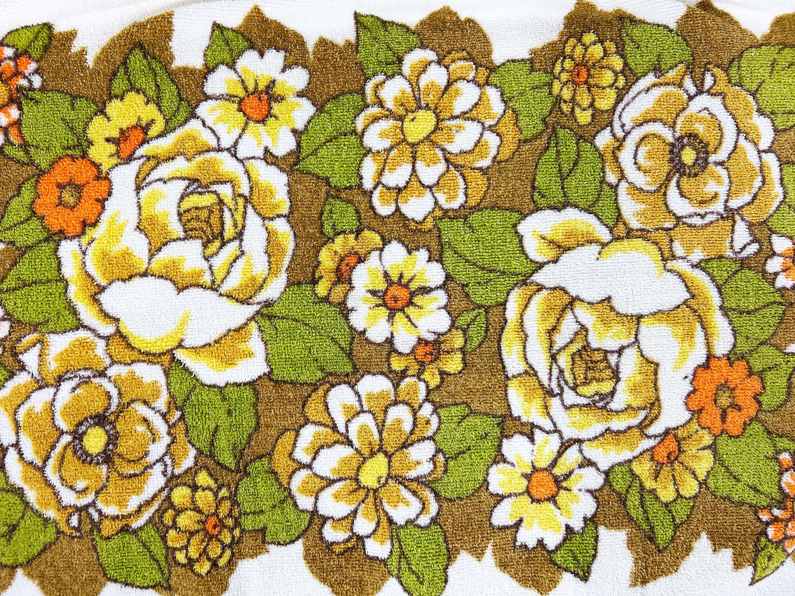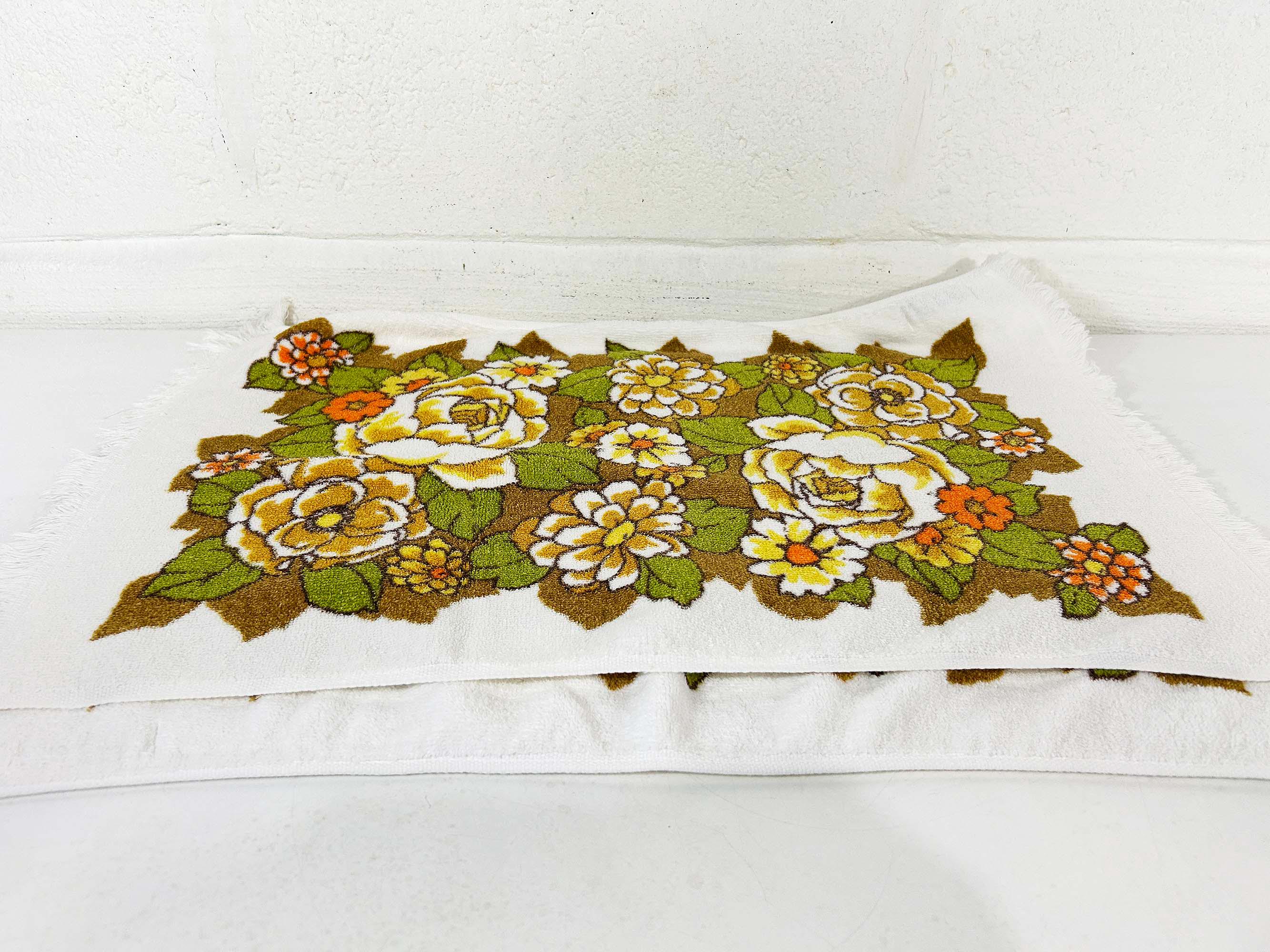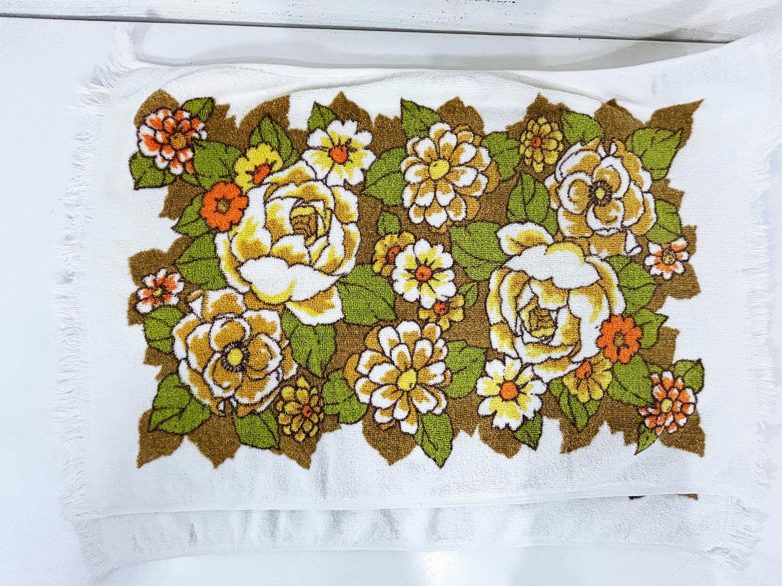 Super adorable hand towel set with a pretty yellow, green, and brown floral pattern - perfect for your vintage bathroom! Each towel is approximately 37 inches long and 24 inches wide. Keep in mind vintage towels are typically smaller than modern ones. They are in good vintage condition, still pretty fluffy!