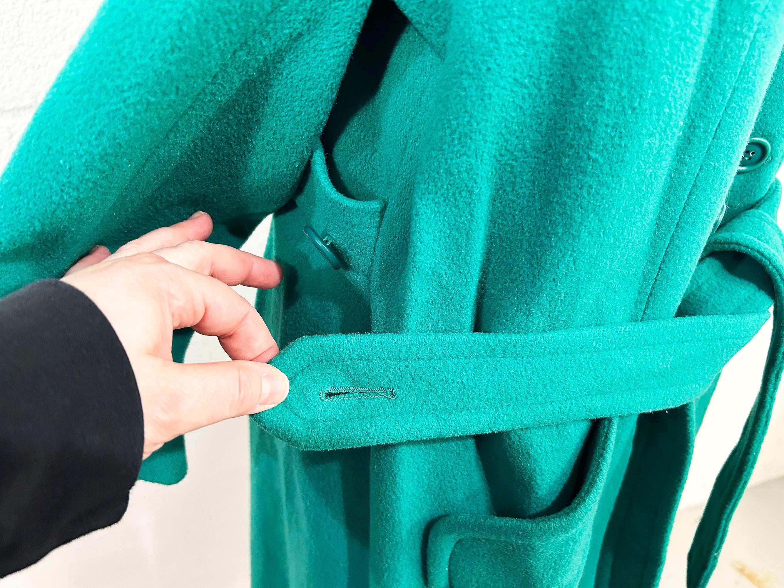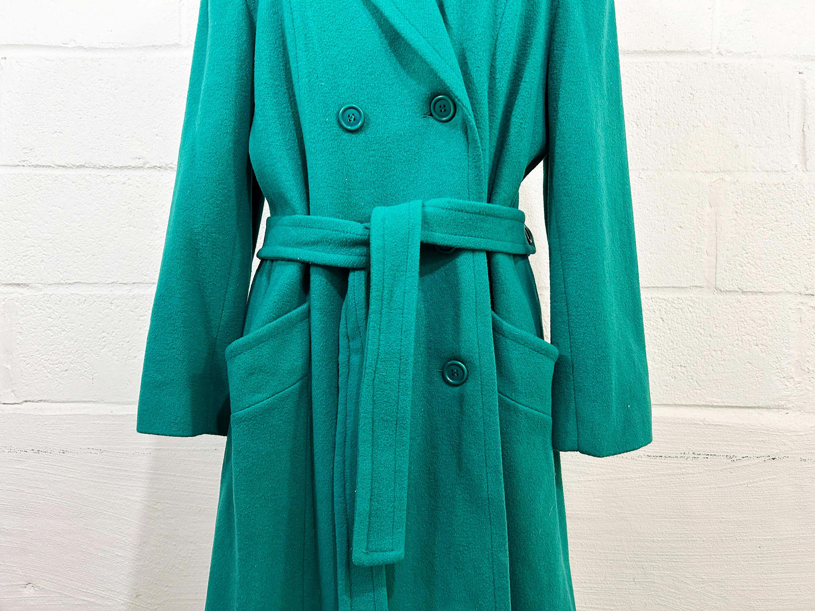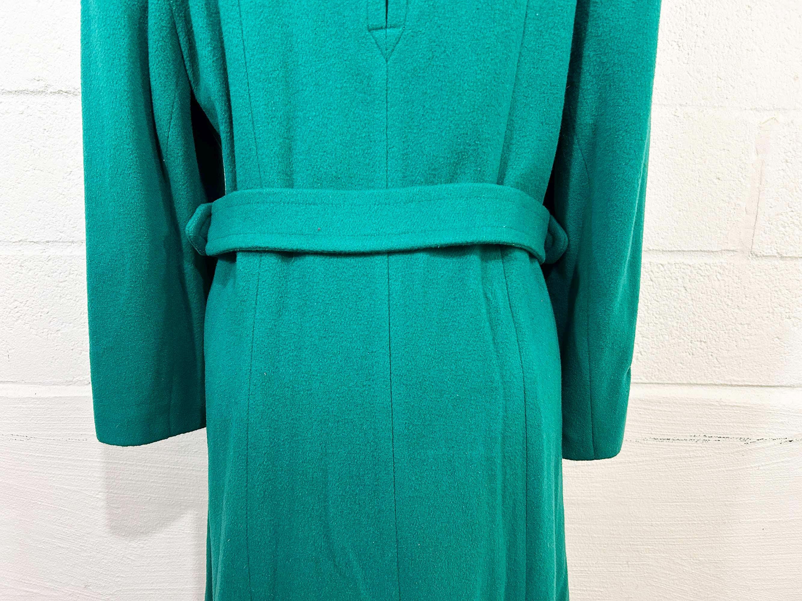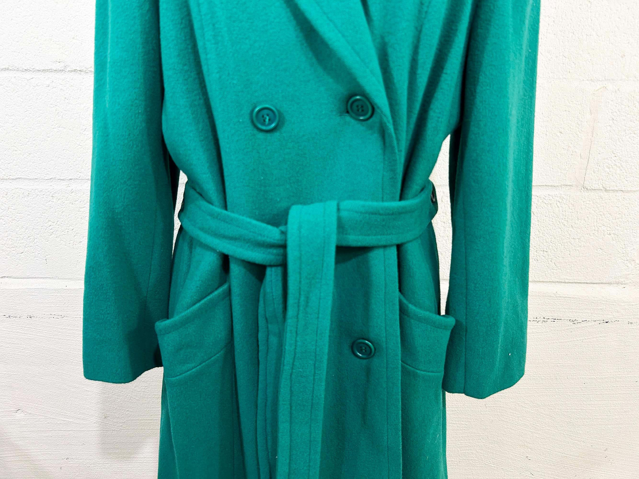 Cozy aqua green long belted peacoat. There are two front pockets, one interior pocket, and a button front. Coat is in good shape and lined with a satin fabric. There are a few small spots that are threadbare but they are not too noticeable. Fabric has NO stretch. The belt can be removed if you'd like.