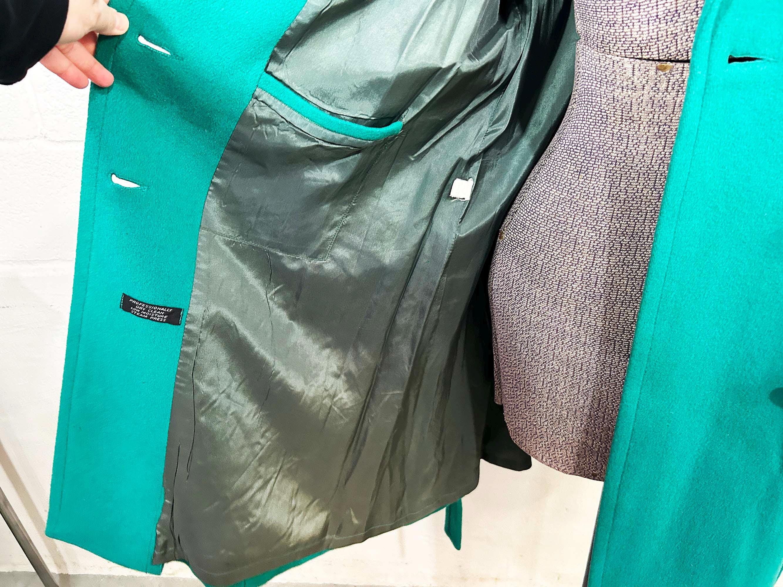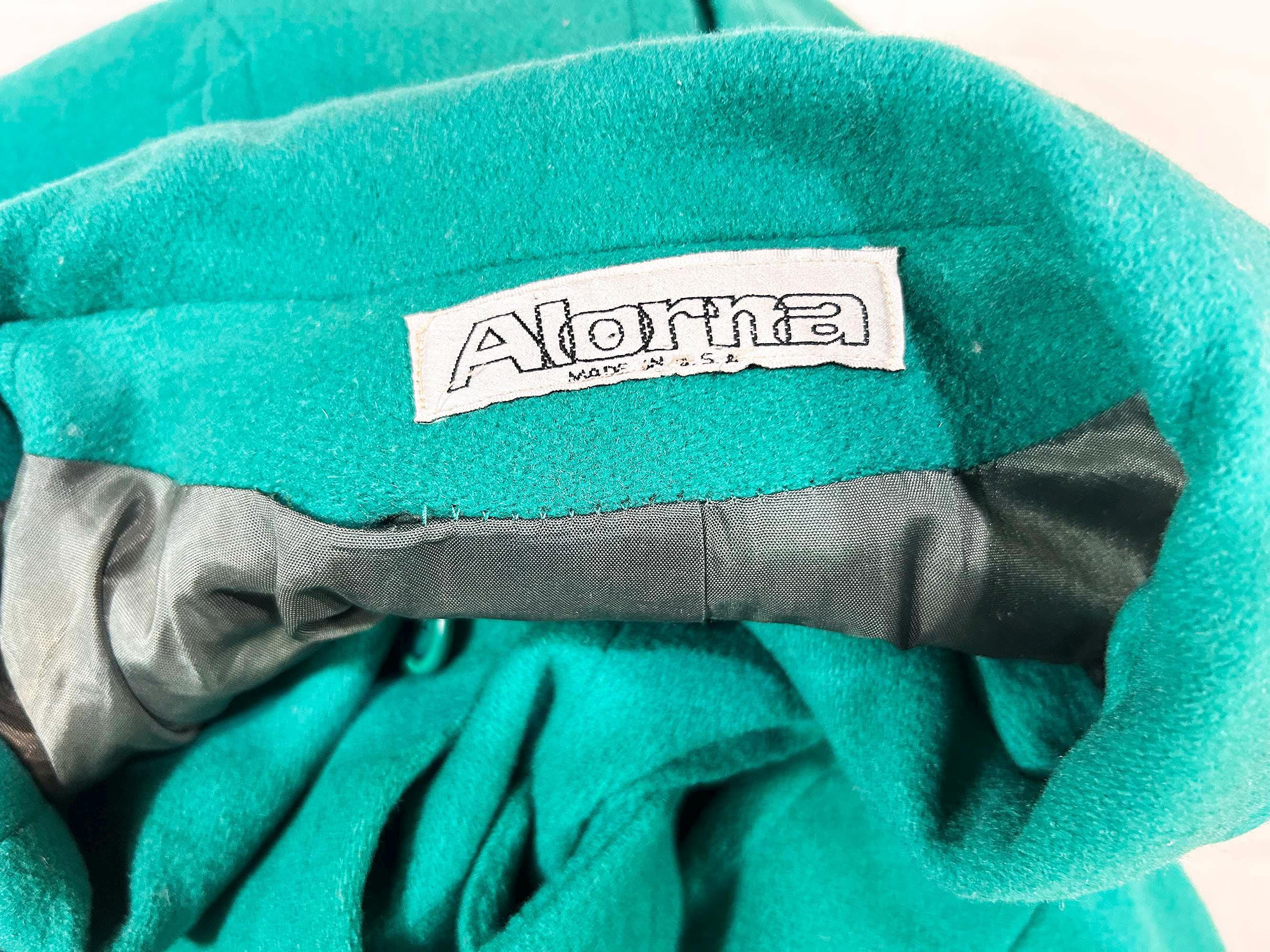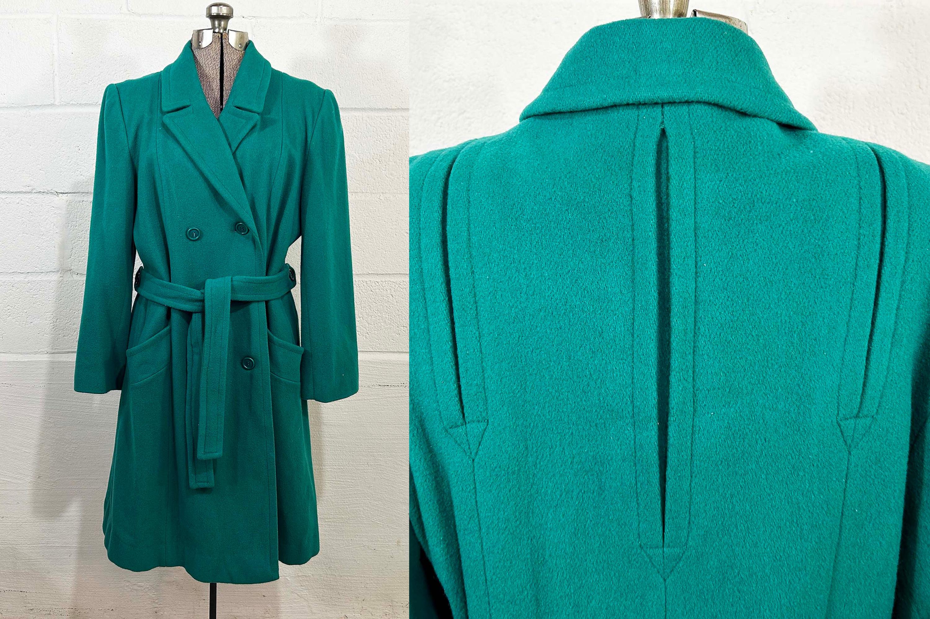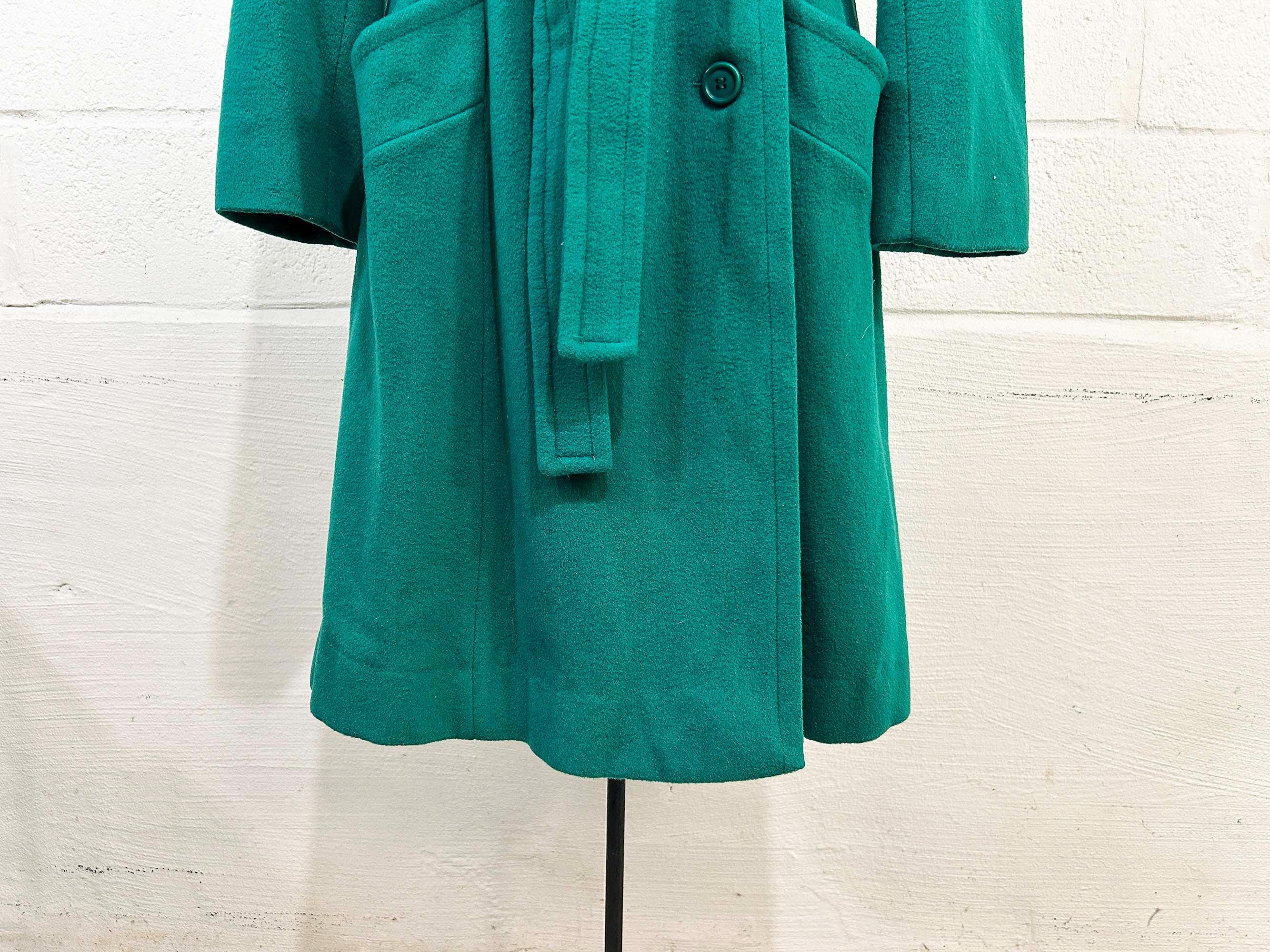 Cozy aqua green long belted peacoat. There are two front pockets, one interior pocket, and a button front. Coat is in good shape and lined with a satin fabric. There are a few small spots that are threadbare but they are not too noticeable. Fabric has NO stretch. The belt can be removed if you'd like.