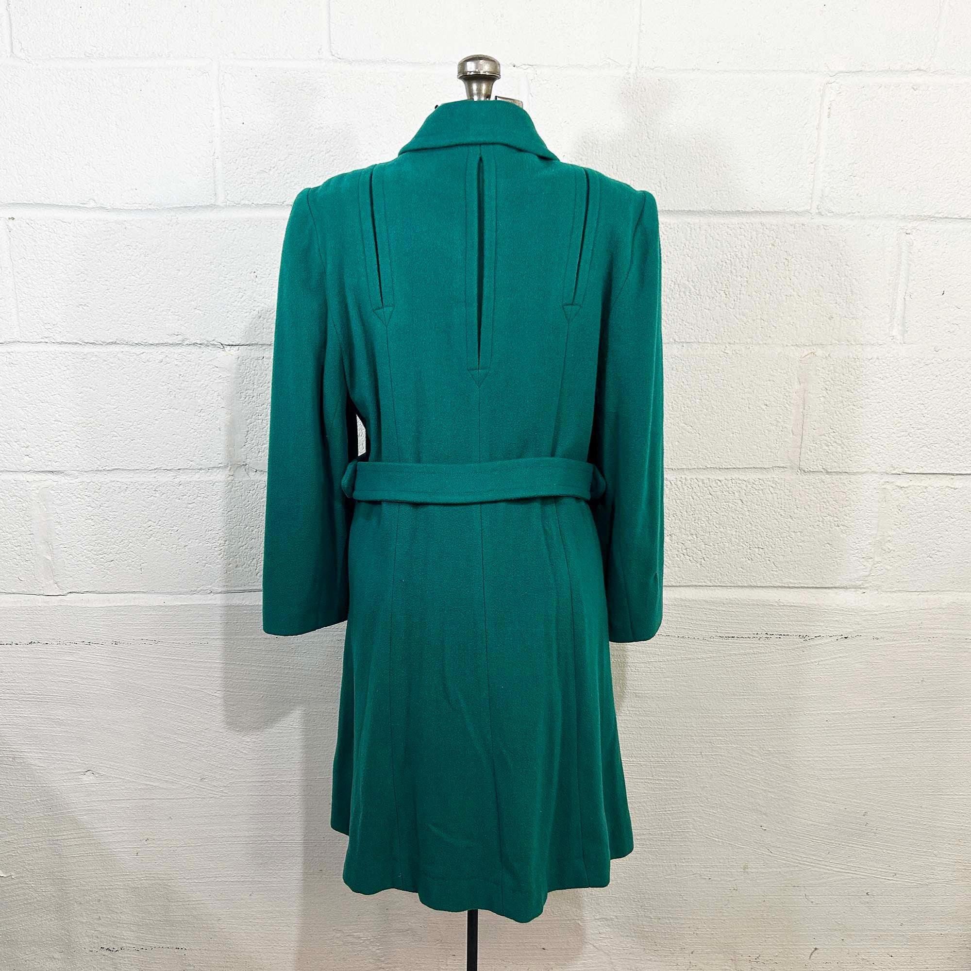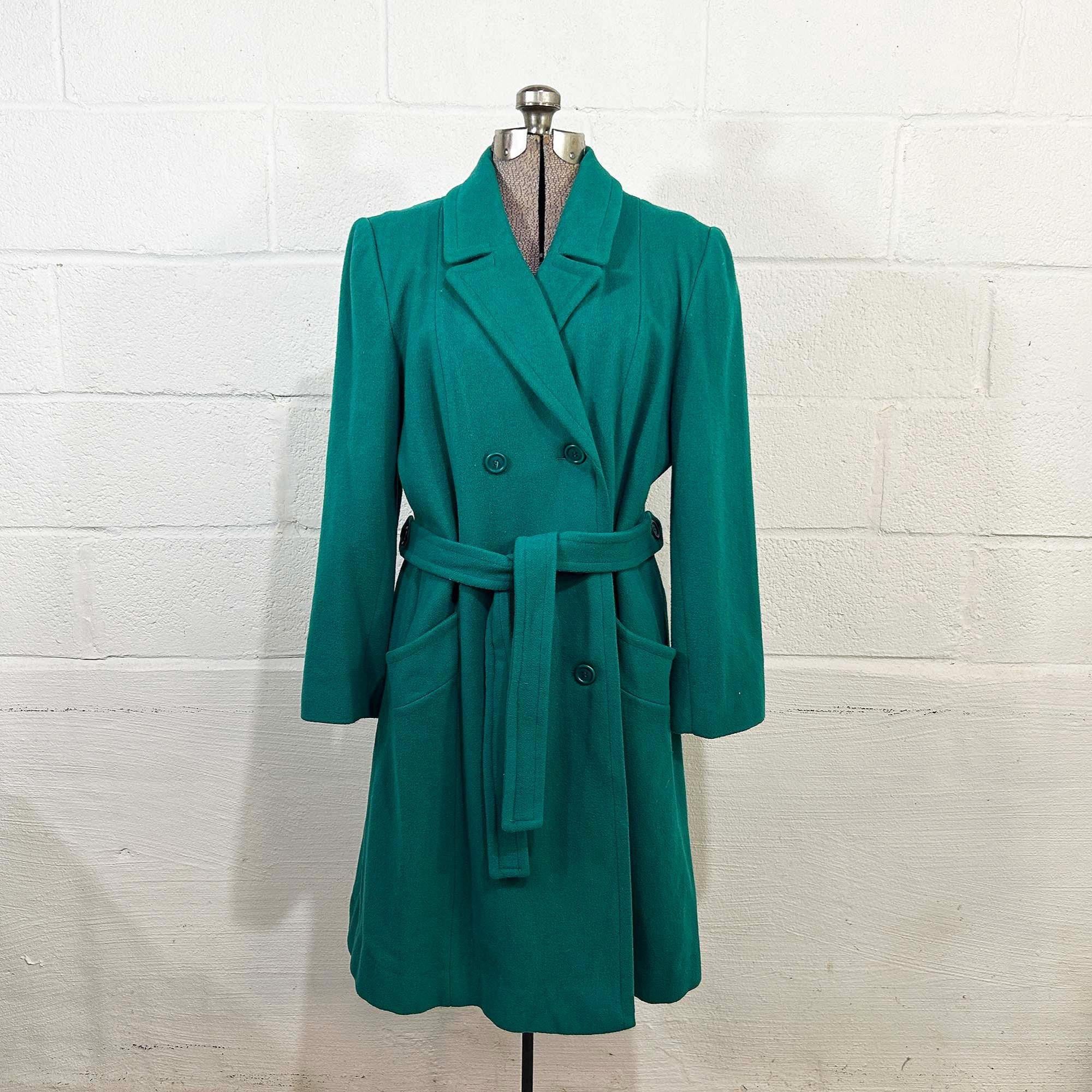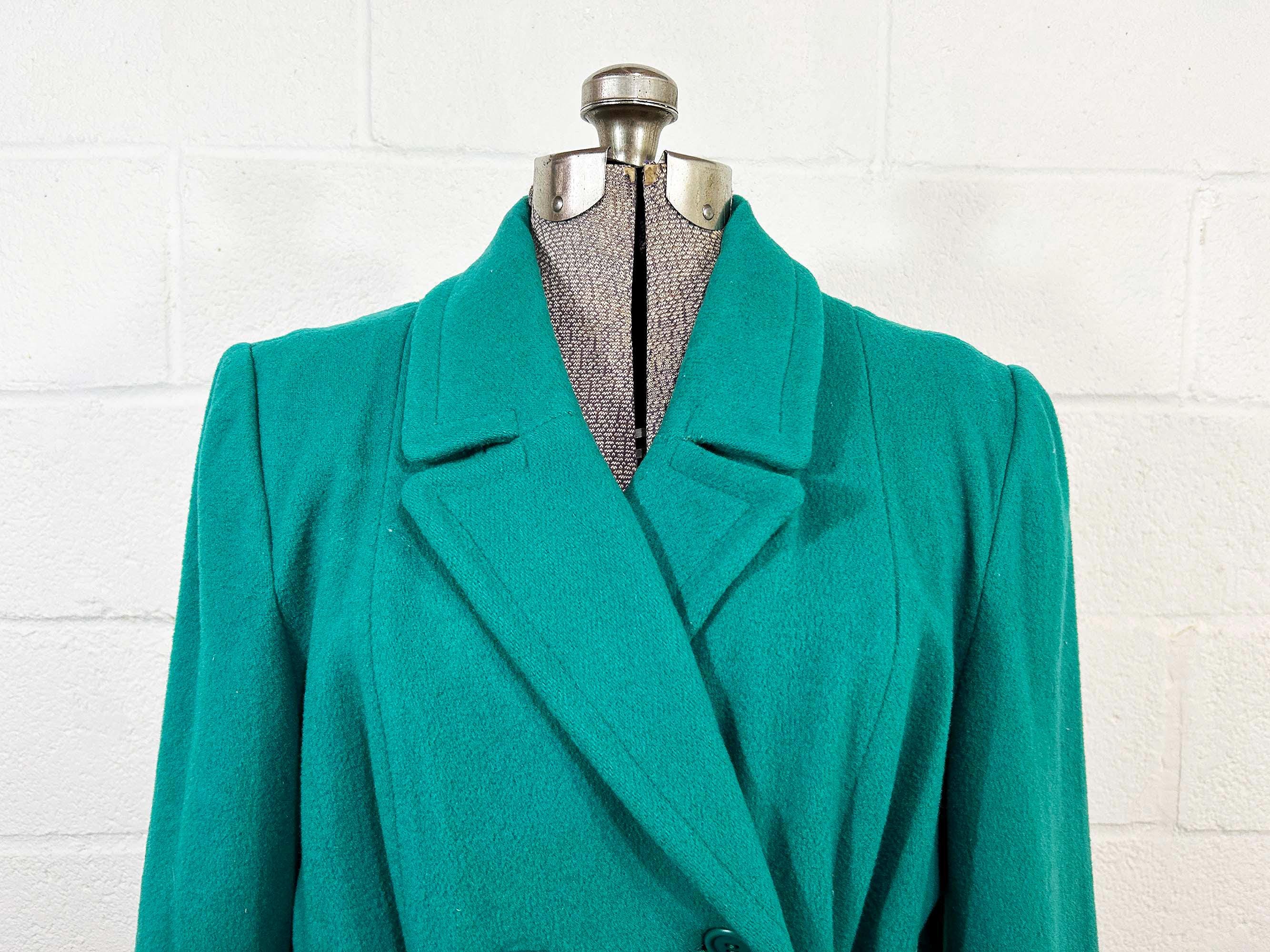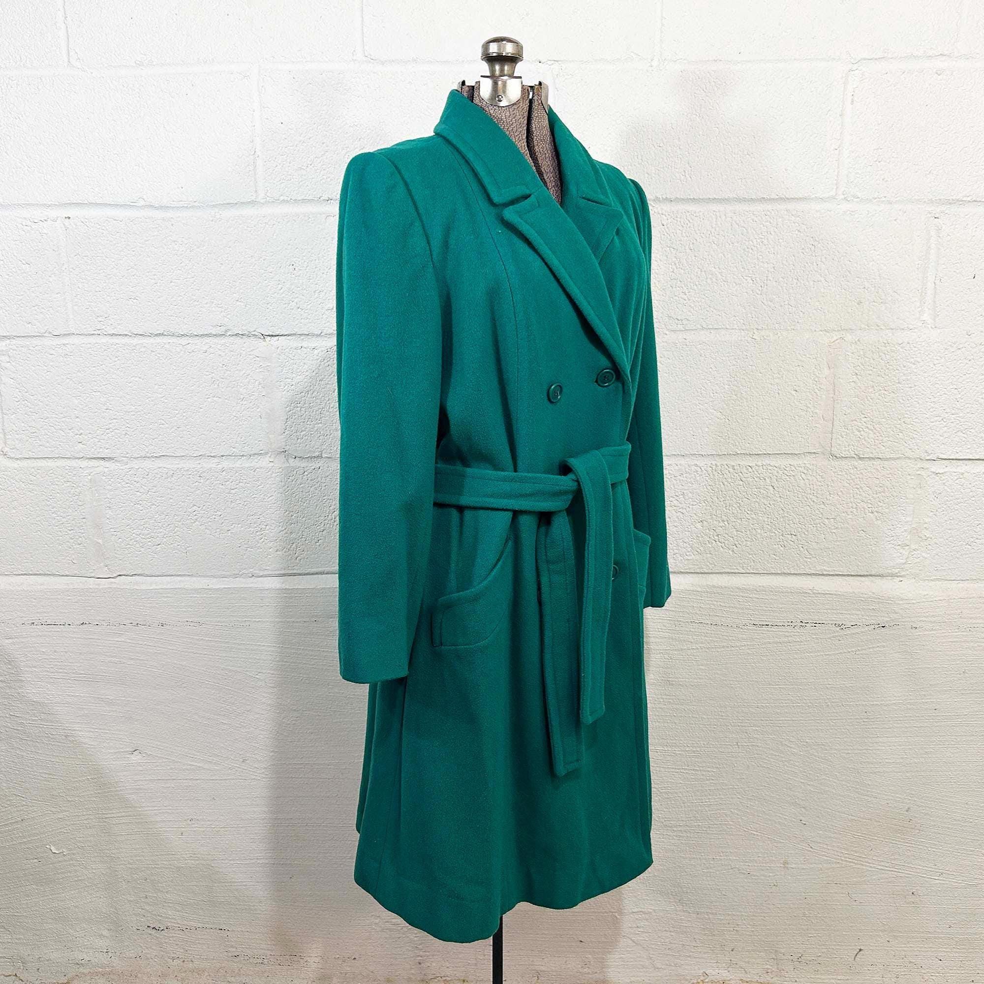 Cozy aqua green long belted peacoat. There are two front pockets, one interior pocket, and a button front. Coat is in good shape and lined with a satin fabric. There are a few small spots that are threadbare but they are not too noticeable. Fabric has NO stretch. The belt can be removed if you'd like.