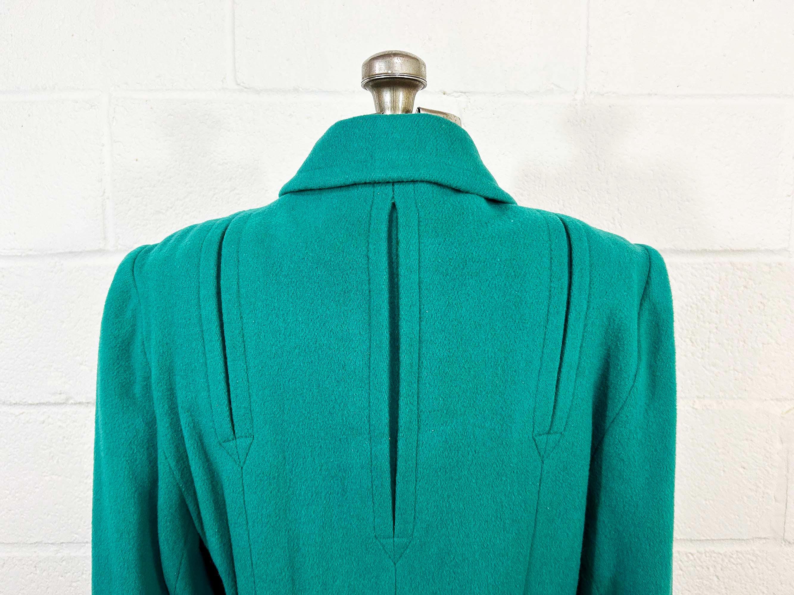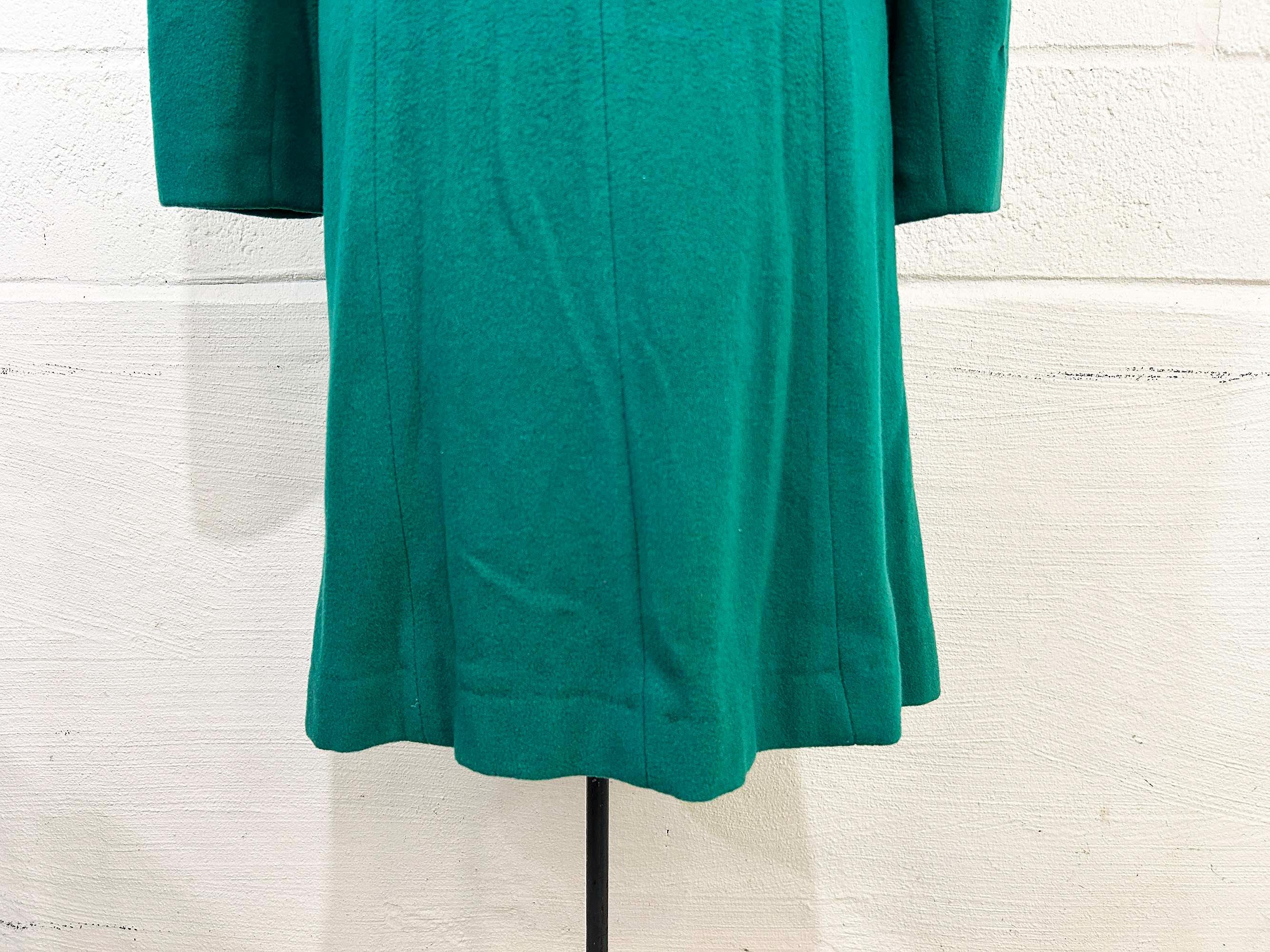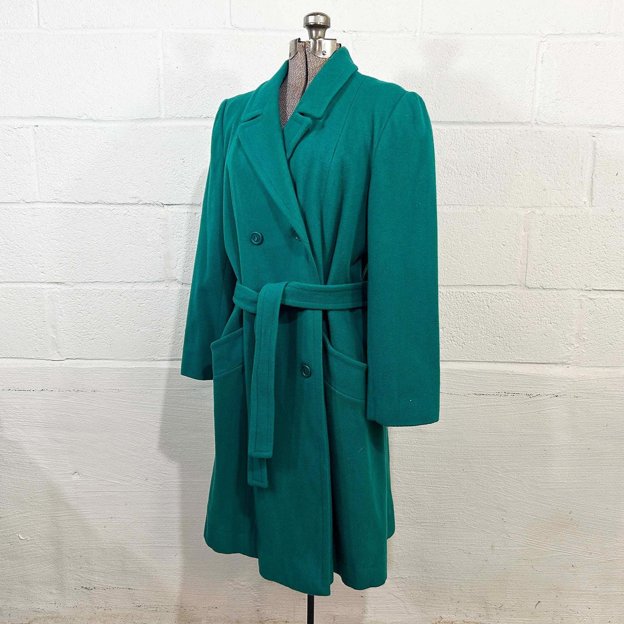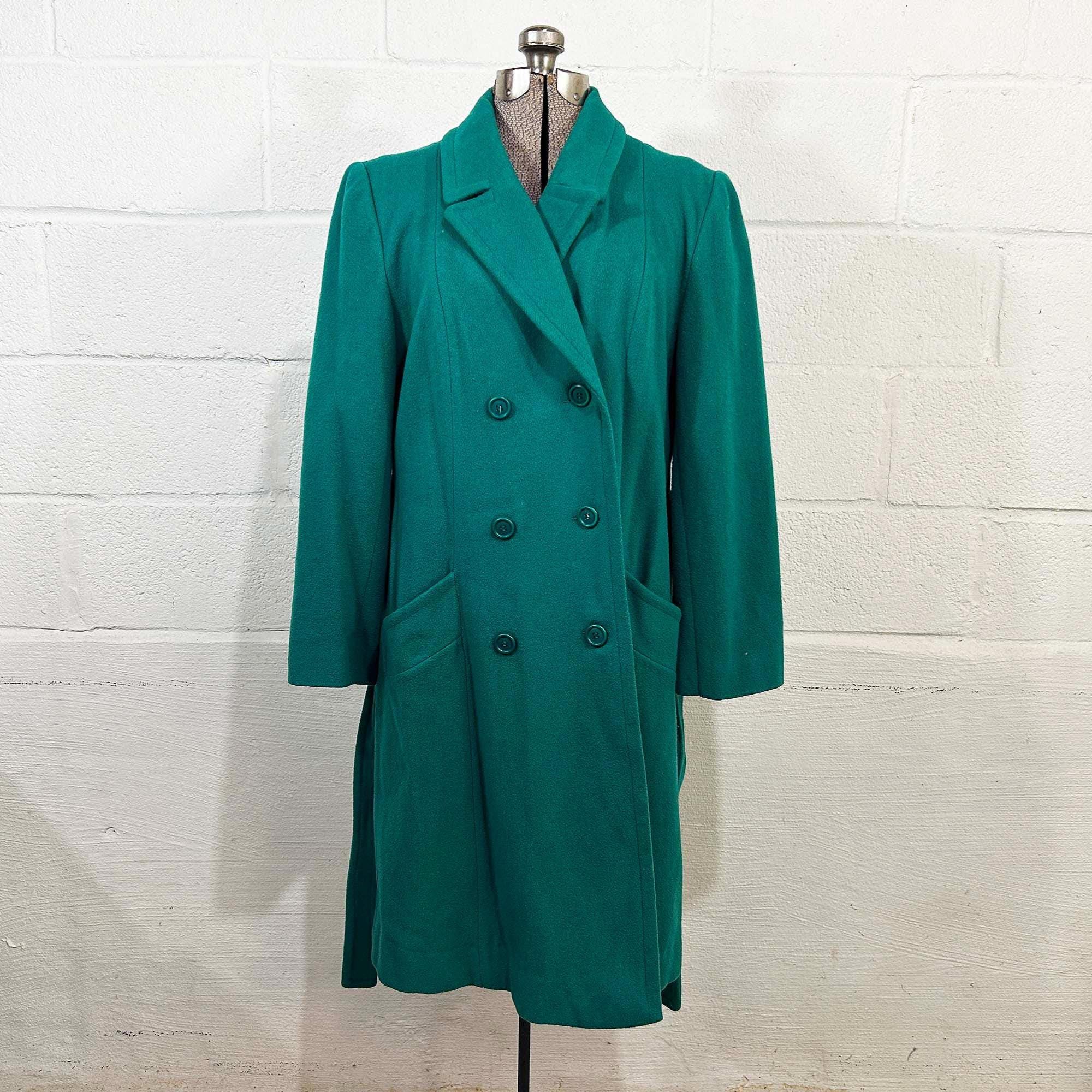 Cozy aqua green long belted peacoat. There are two front pockets, one interior pocket, and a button front. Coat is in good shape and lined with a satin fabric. There are a few small spots that are threadbare but they are not too noticeable. Fabric has NO stretch. The belt can be removed if you'd like.
