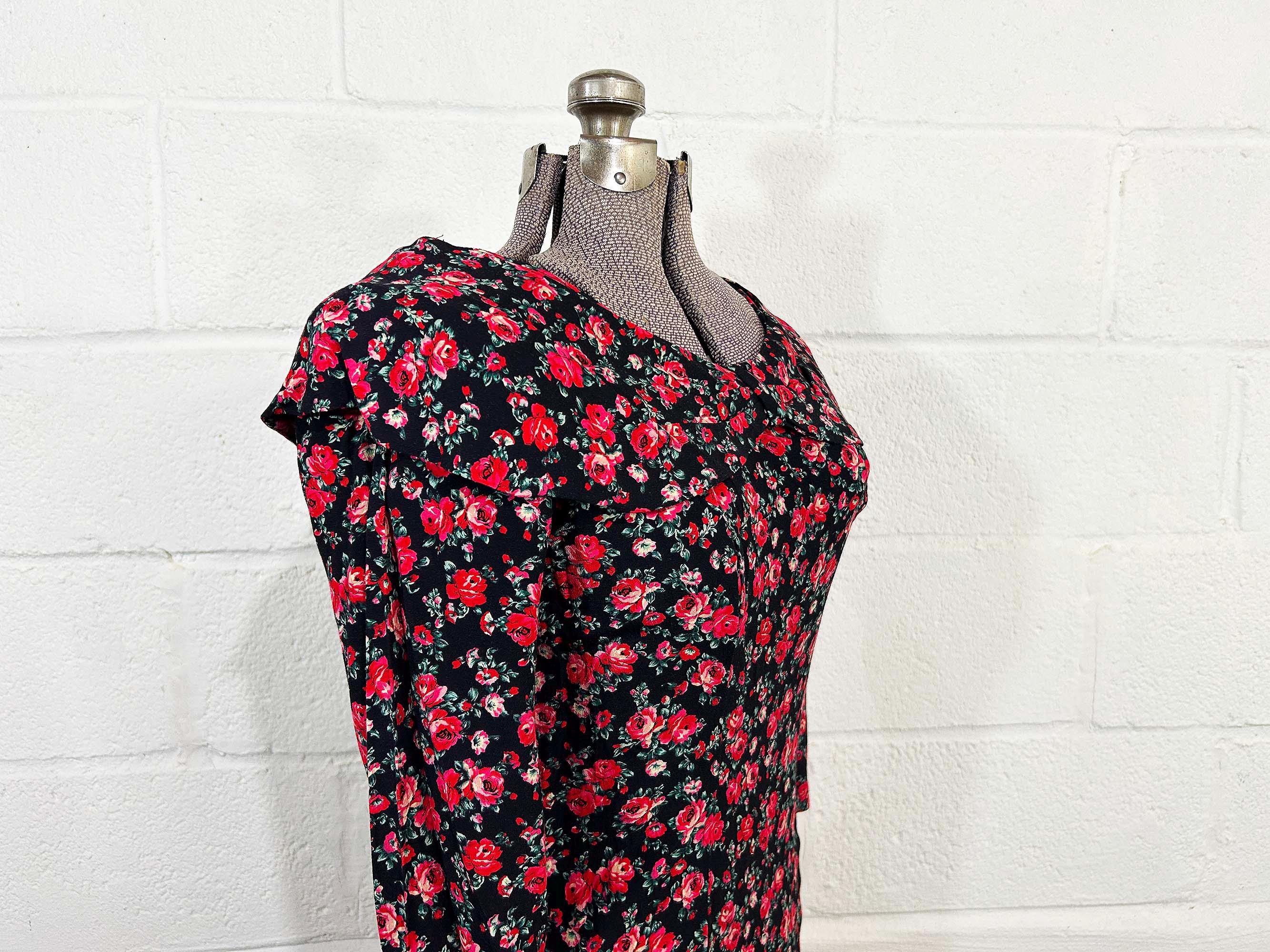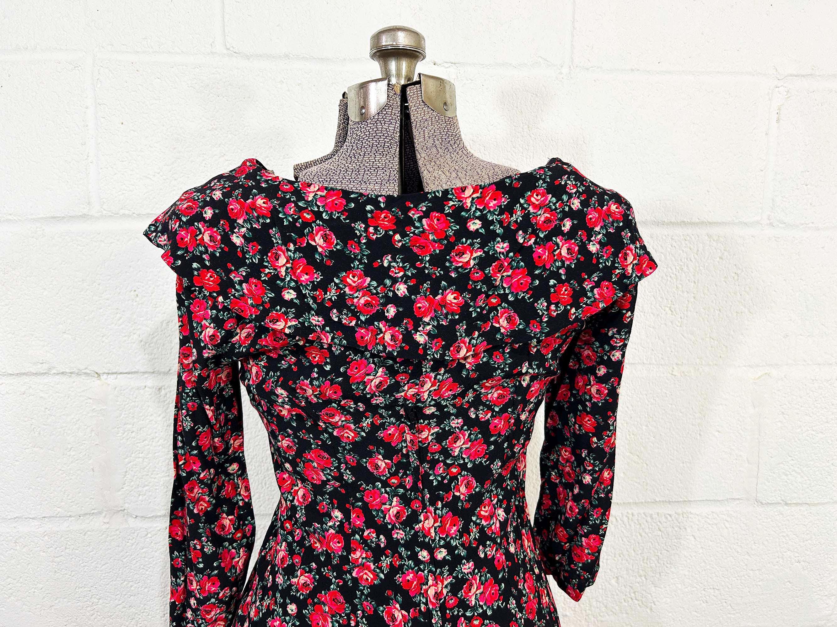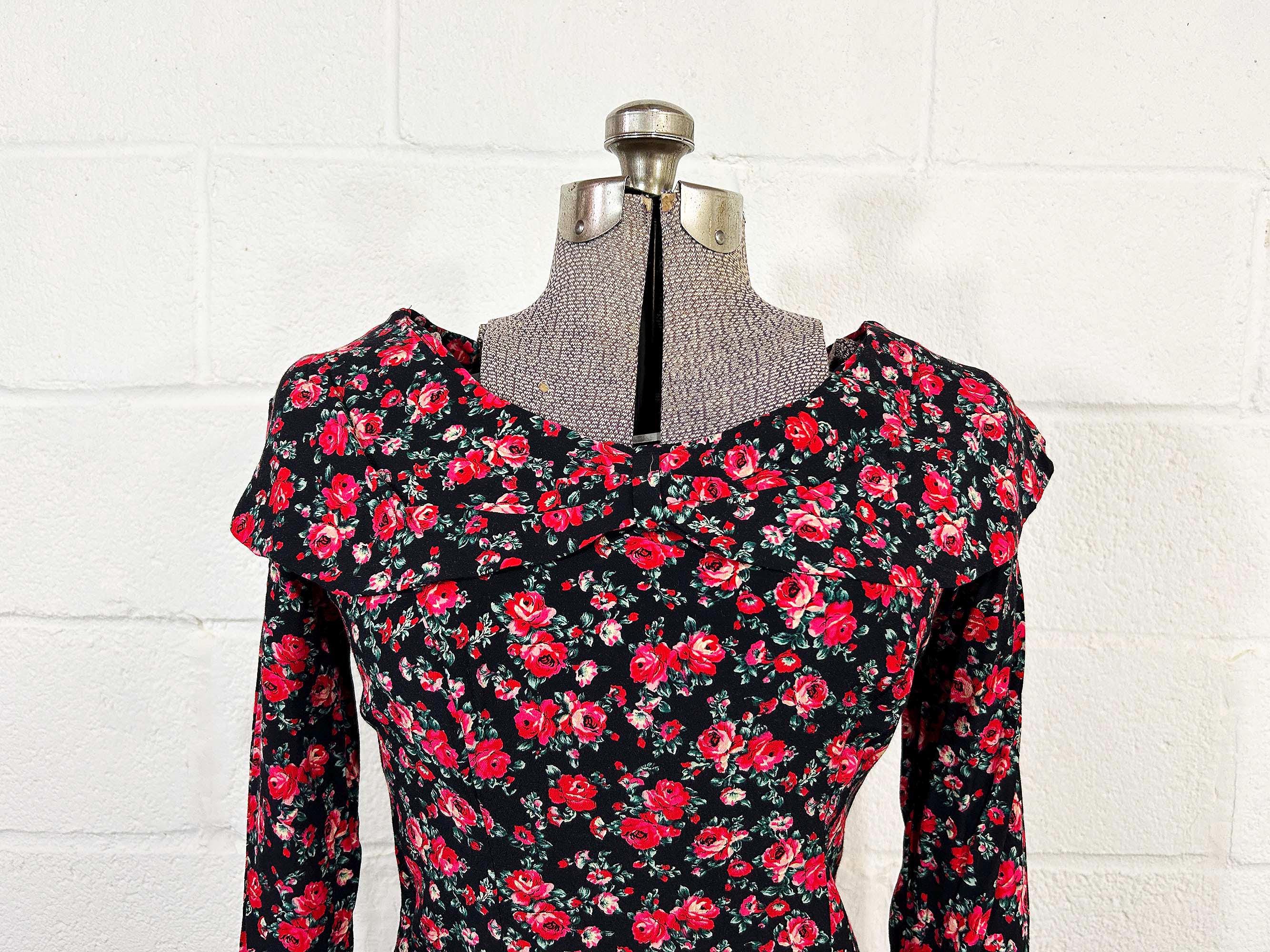Adorable red roses floral grunge style dress. Pullover style with wide collar, zipper in the back, and a-line cut. Long sleeves and a slit at the back hem for movement. Fabric has slight stretch.
