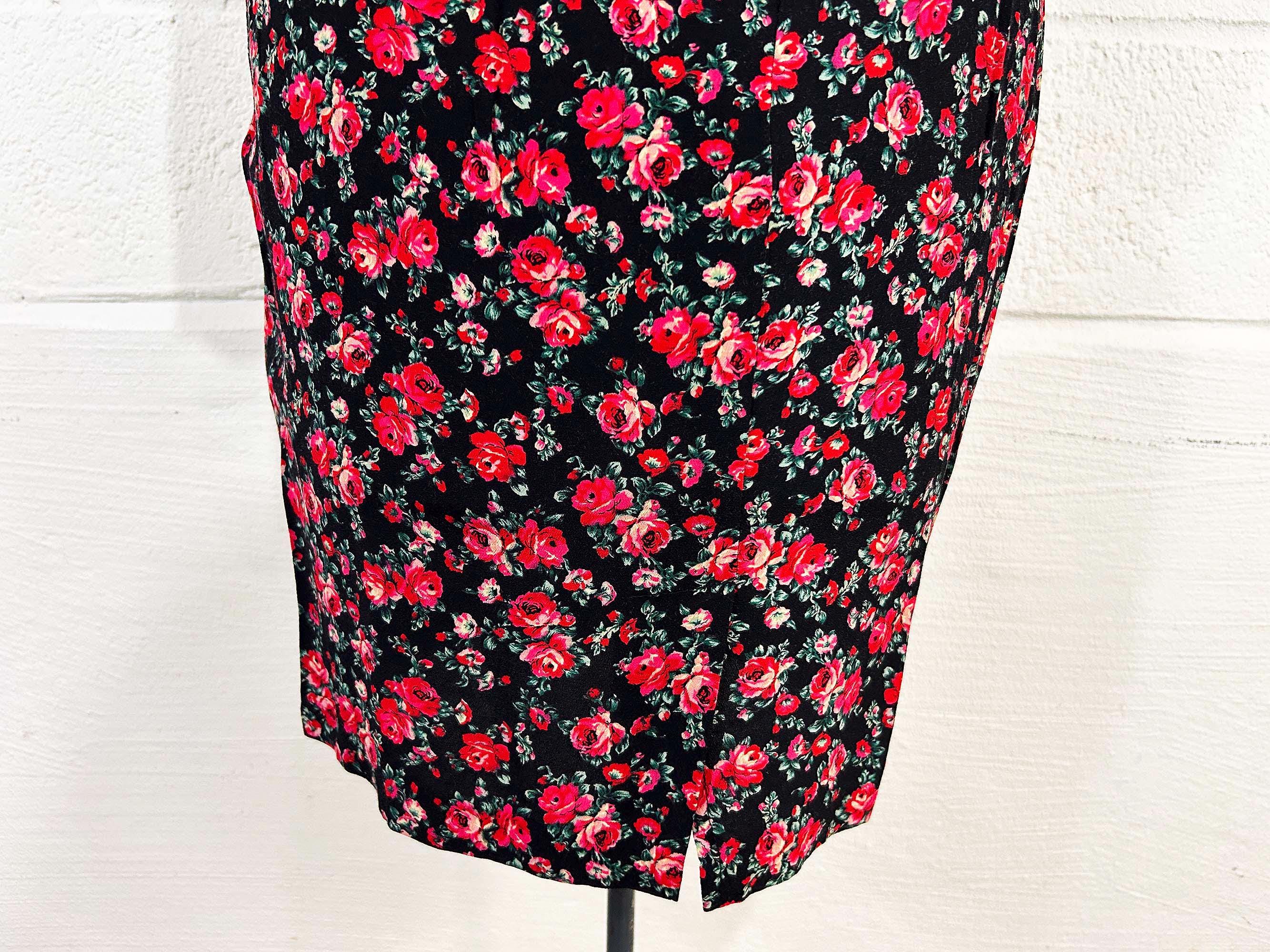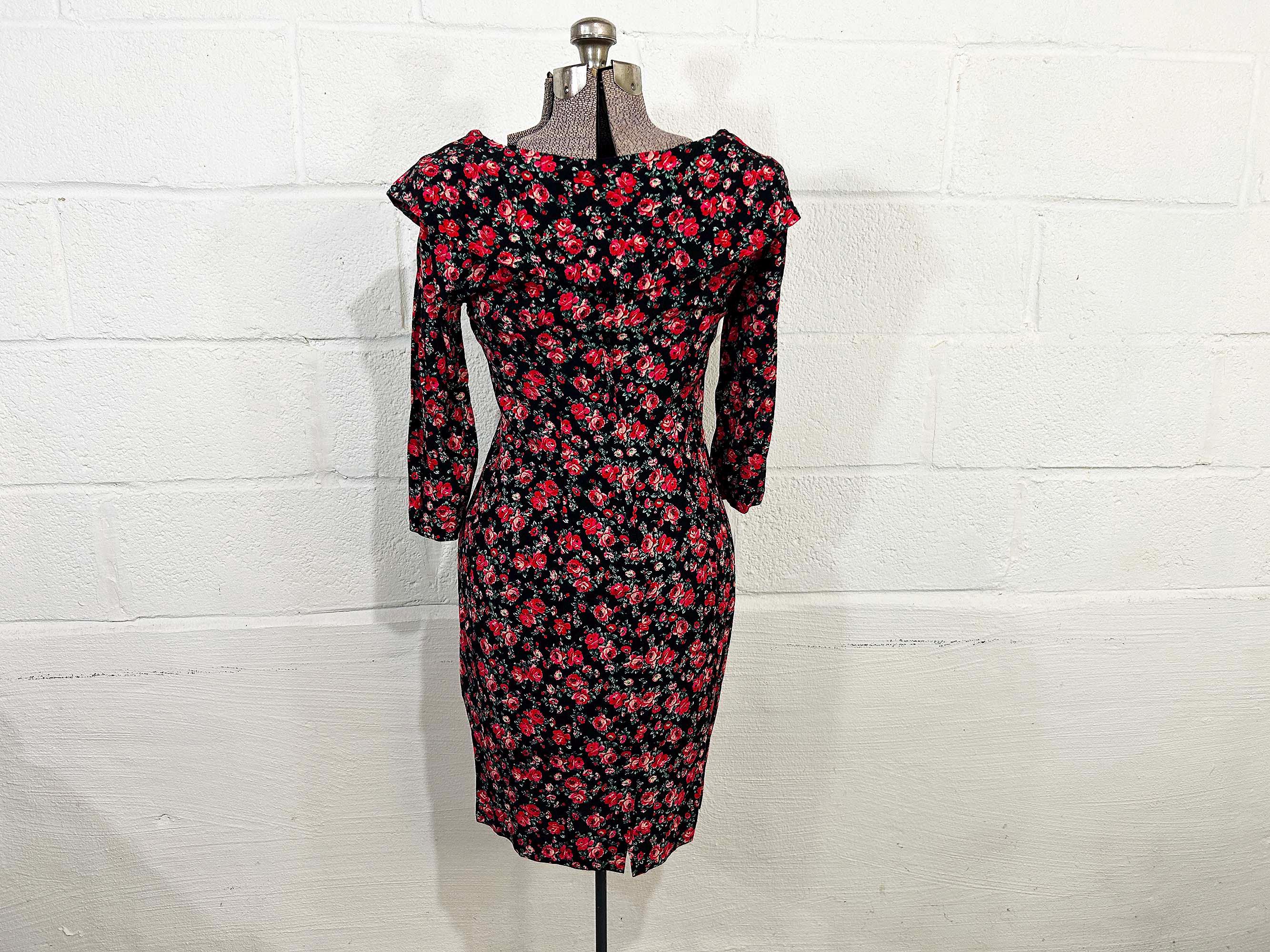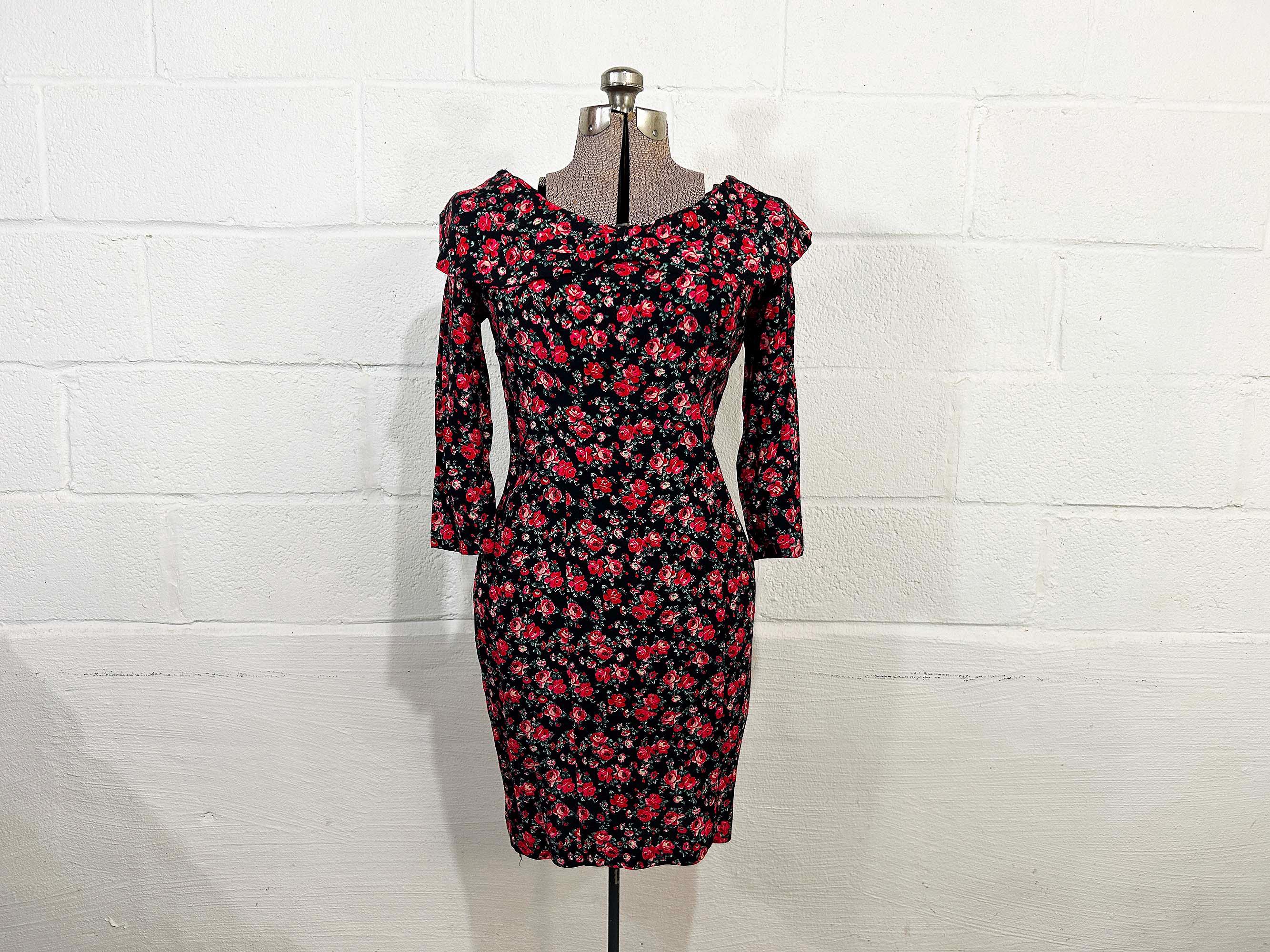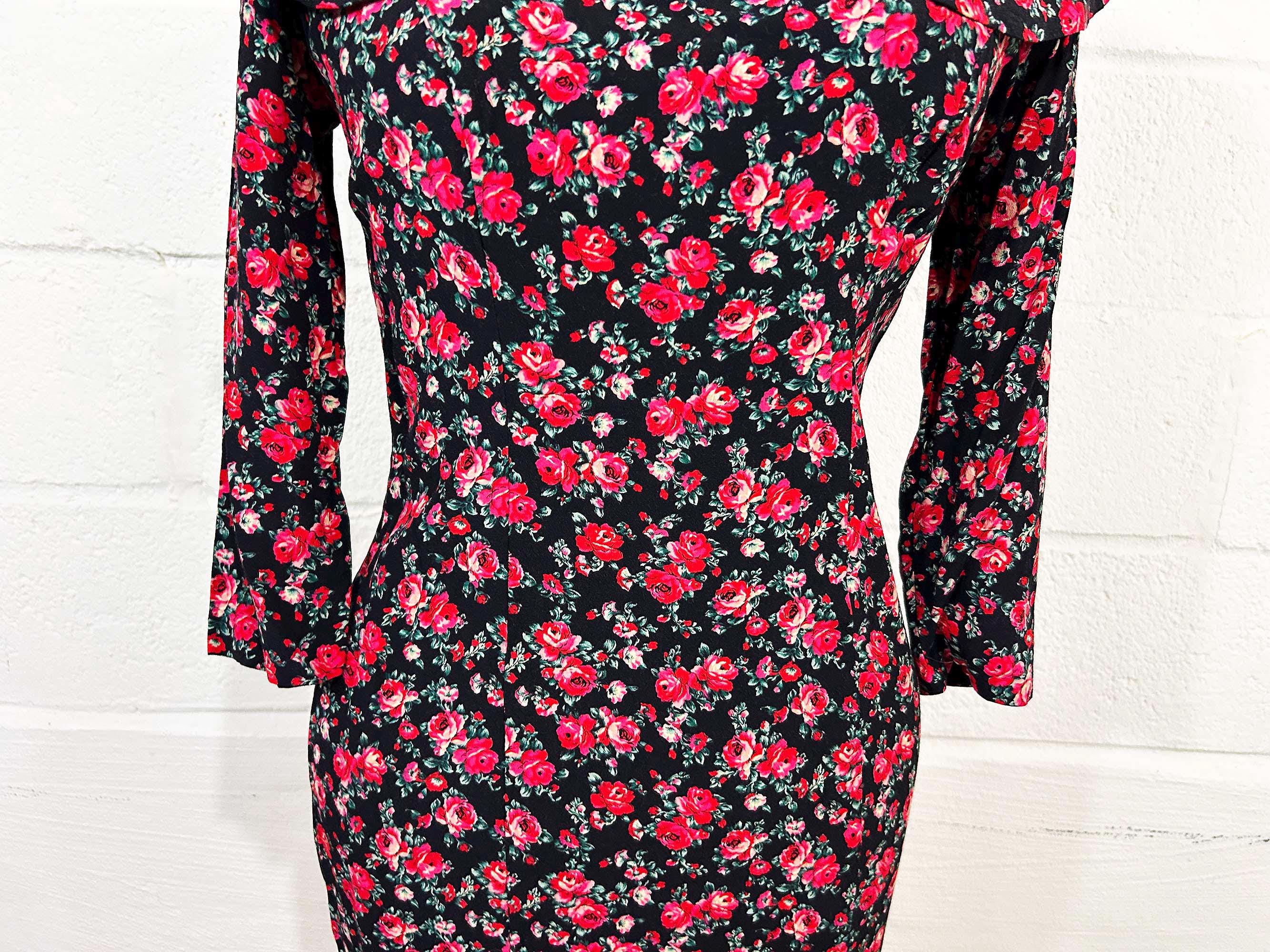 Adorable red roses floral grunge style dress. Pullover style with wide collar, zipper in the back, and a-line cut. Long sleeves and a slit at the back hem for movement. Fabric has slight stretch.