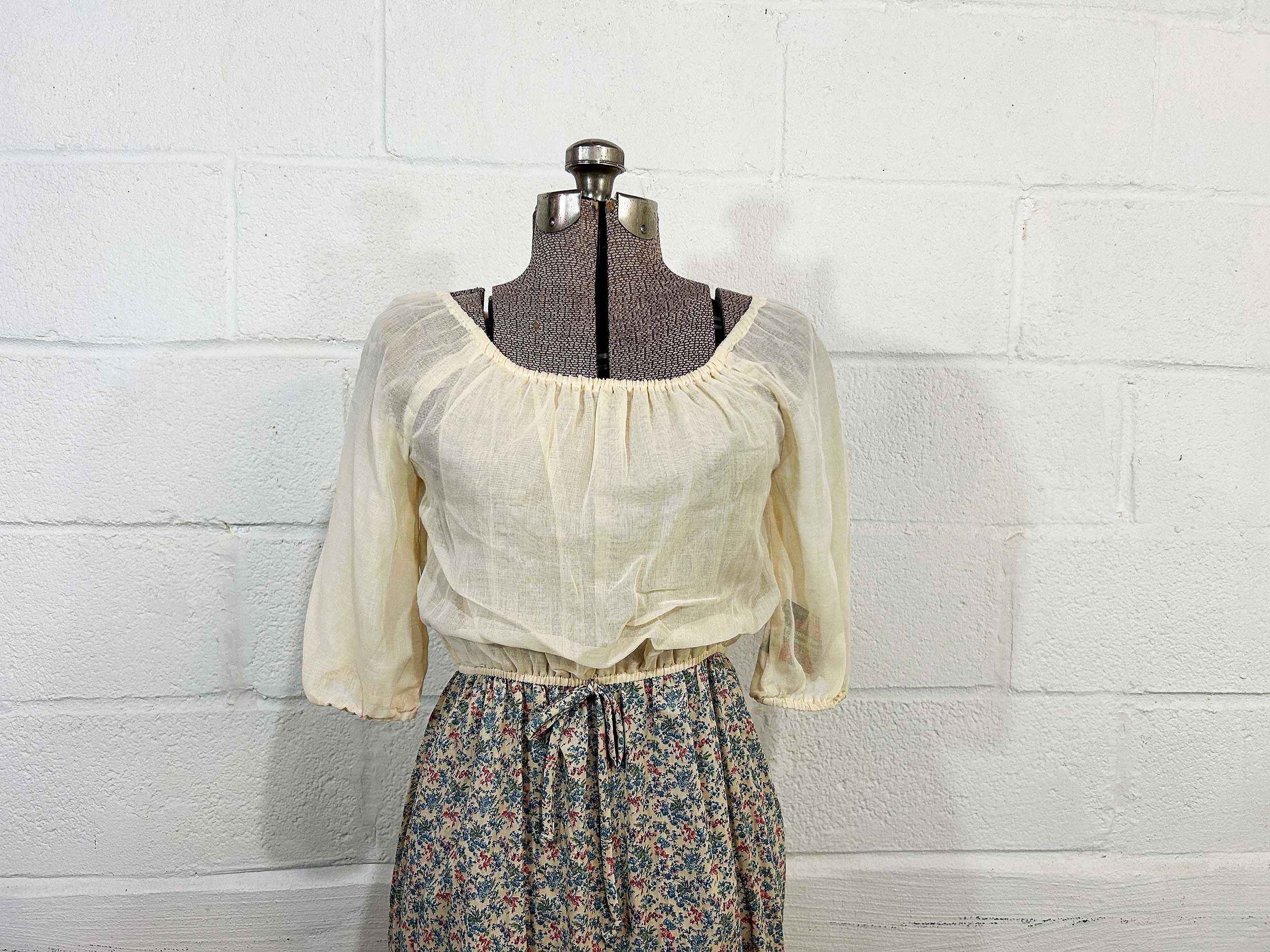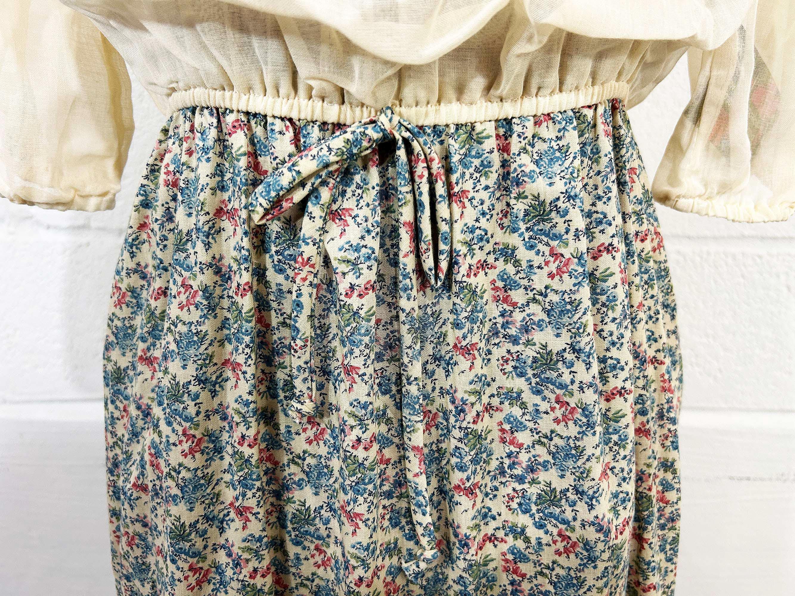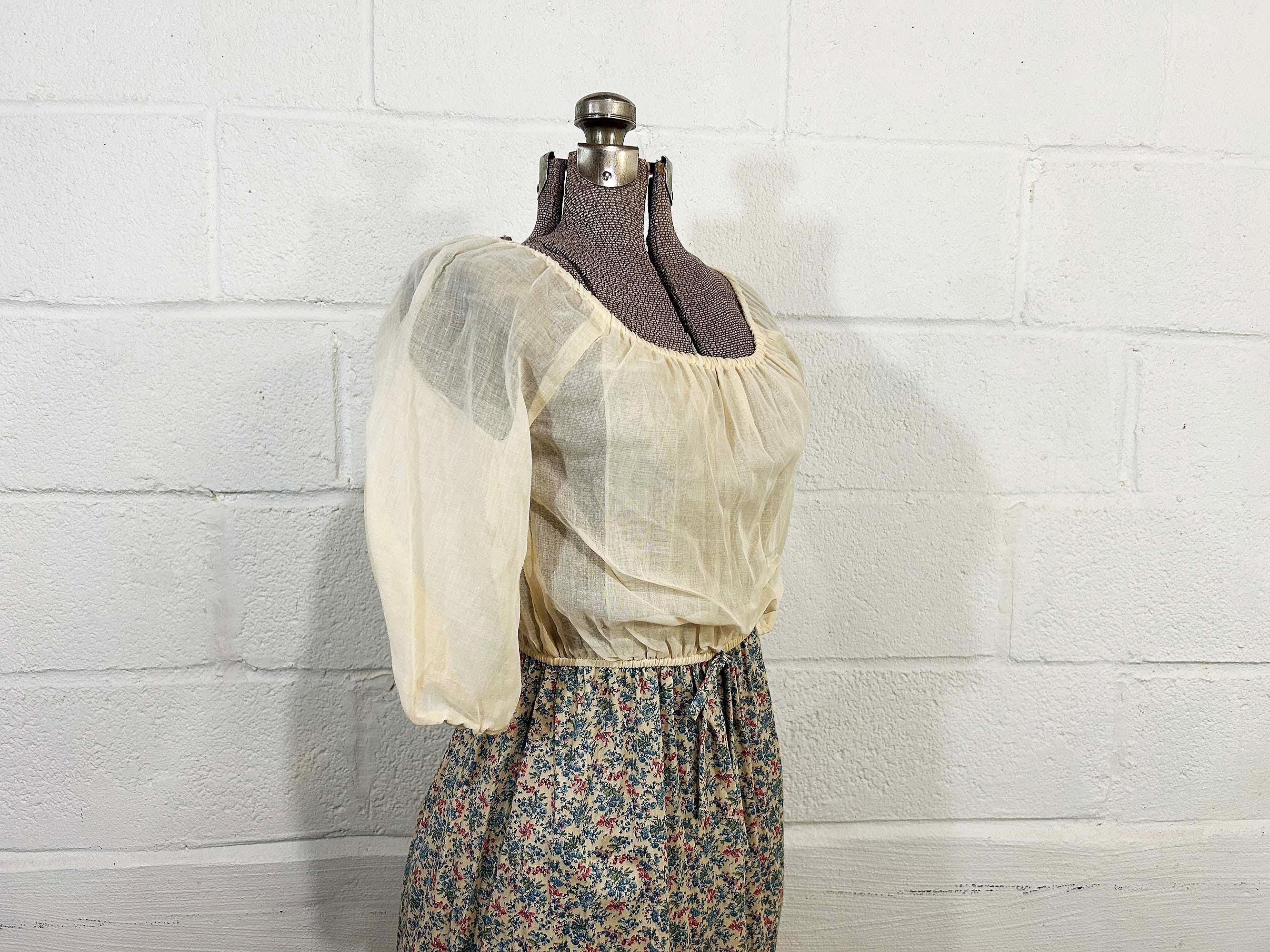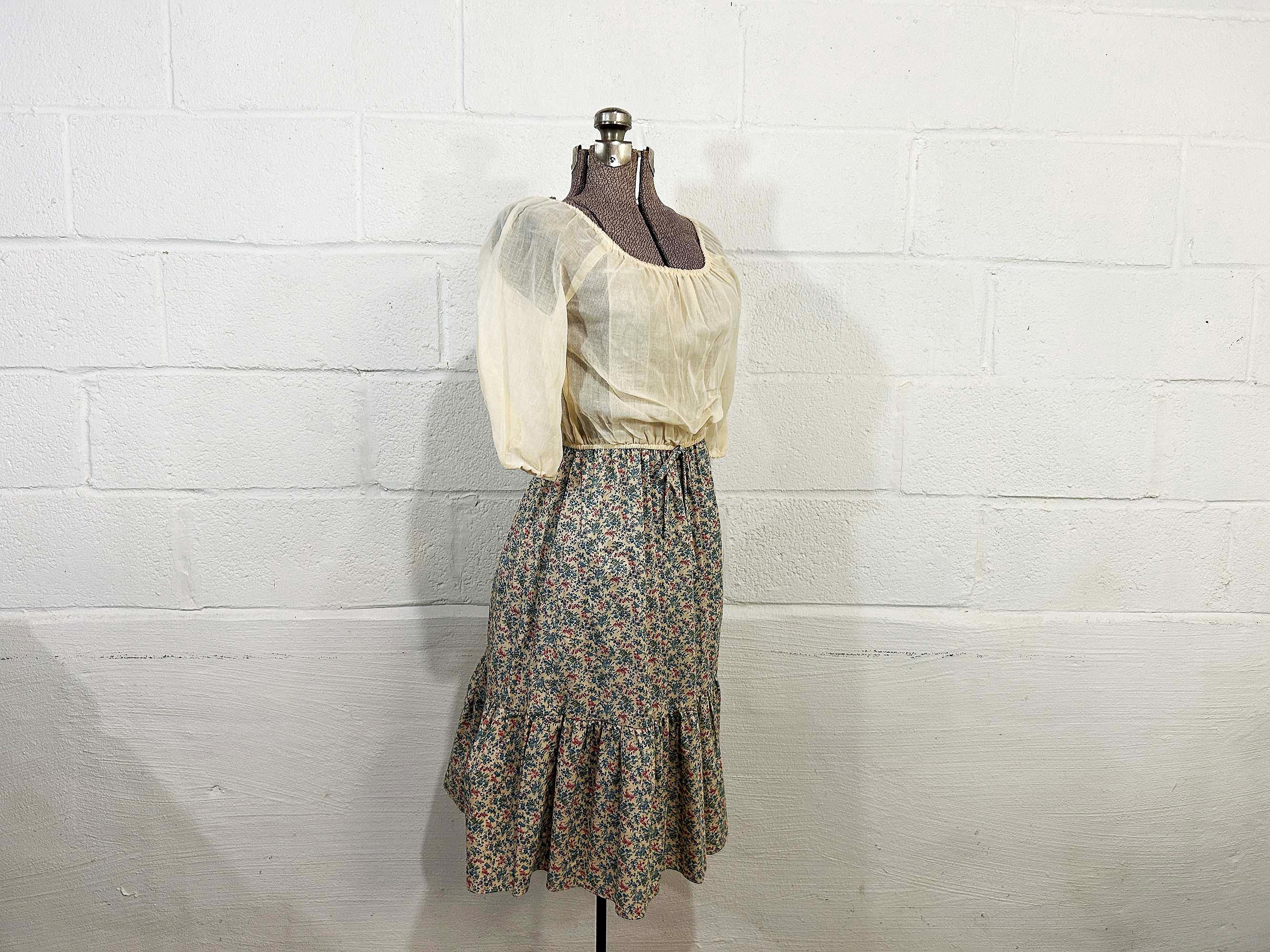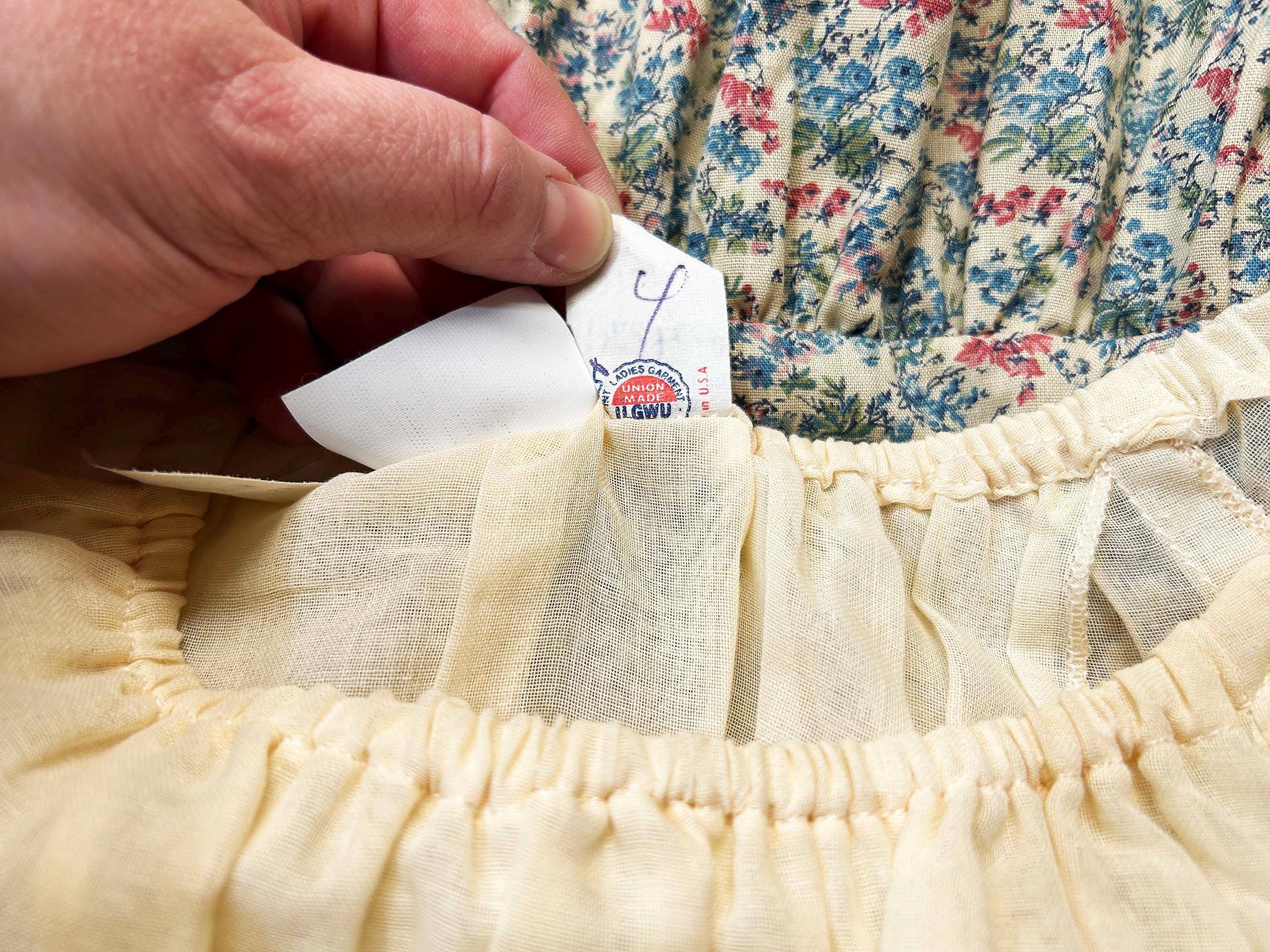 Cute floral wide neck dress with elasticized sleeves and neckline. Dress is in excellent shape with no significant flaws. It has half sleeves and a elasticized peasant neckline and elastic waist. Fabric has NO stretch. Dress is union made.