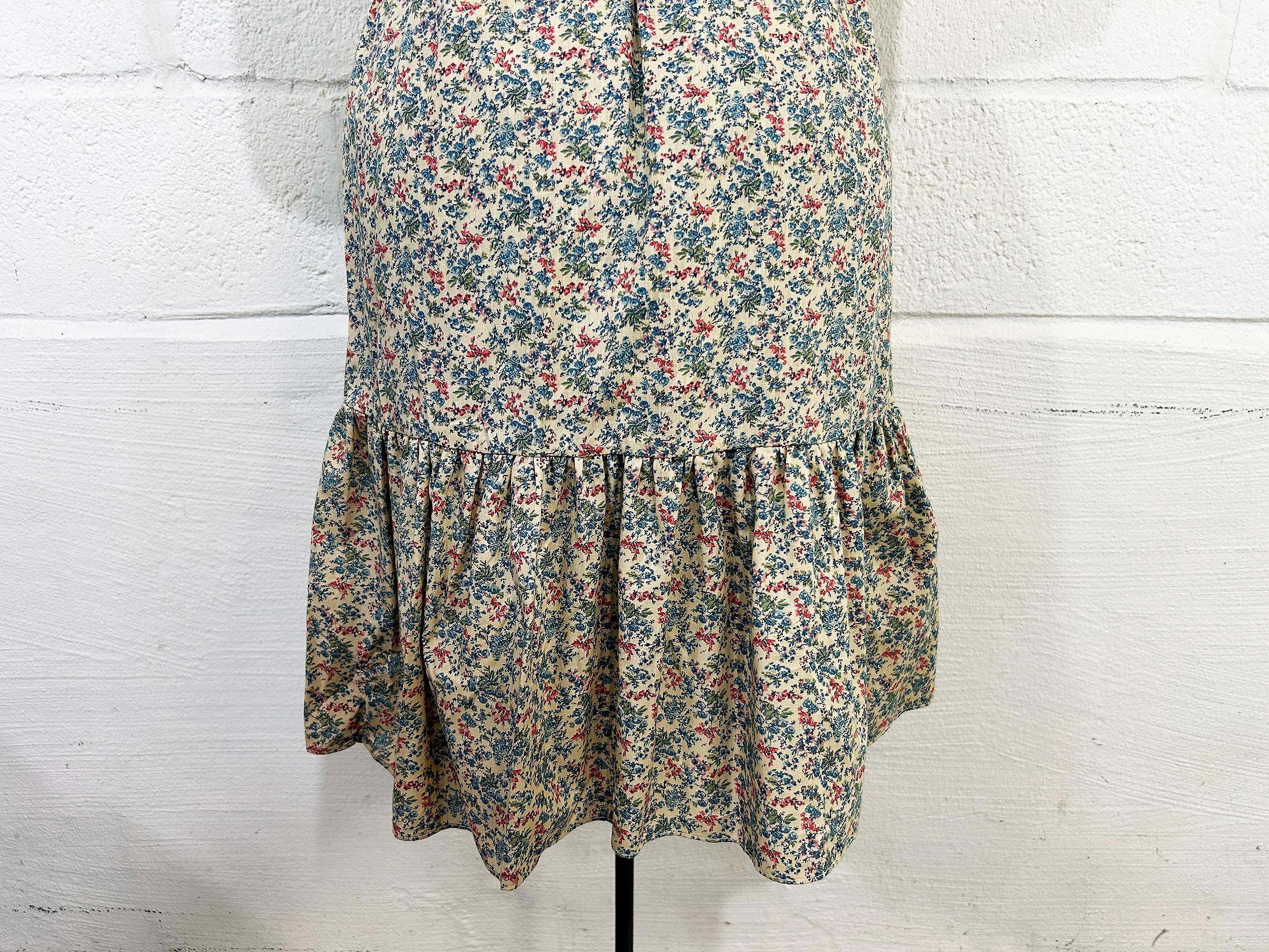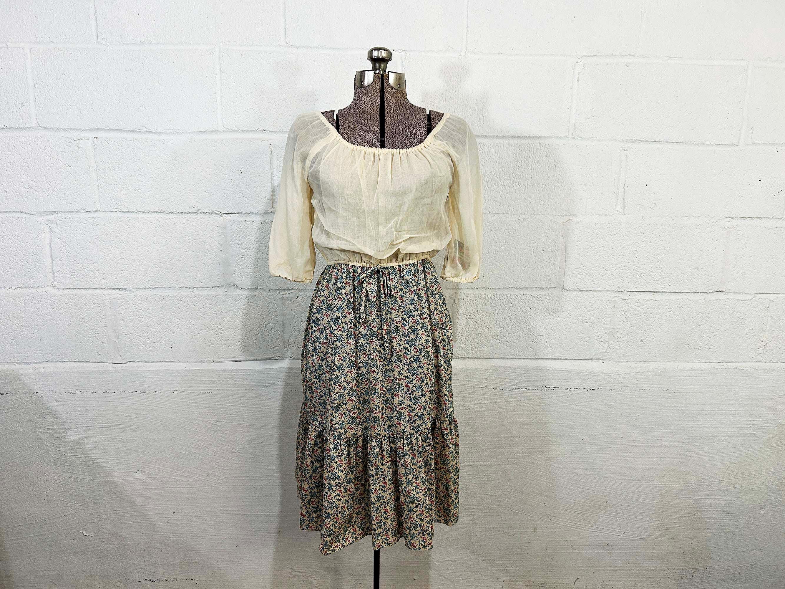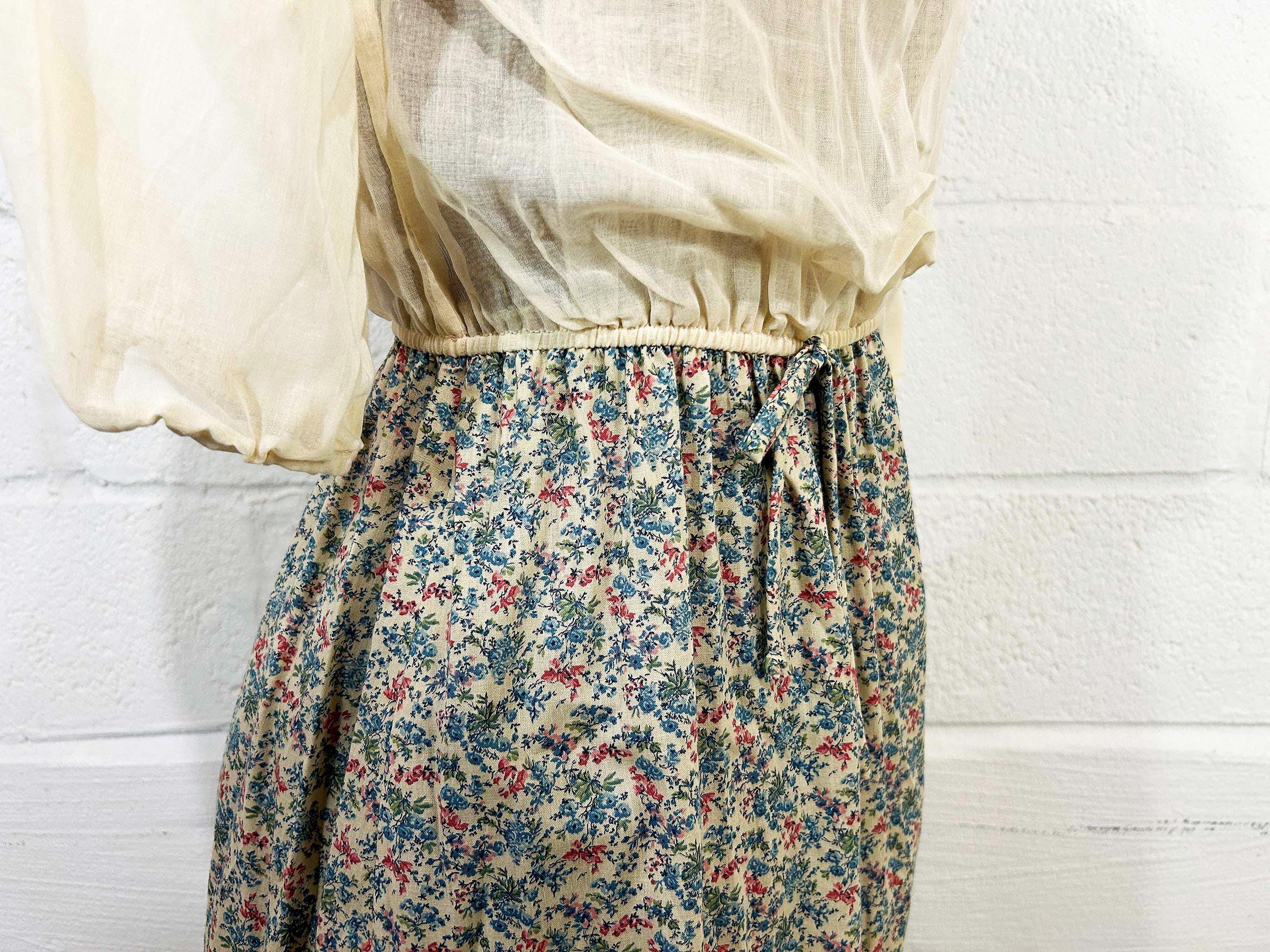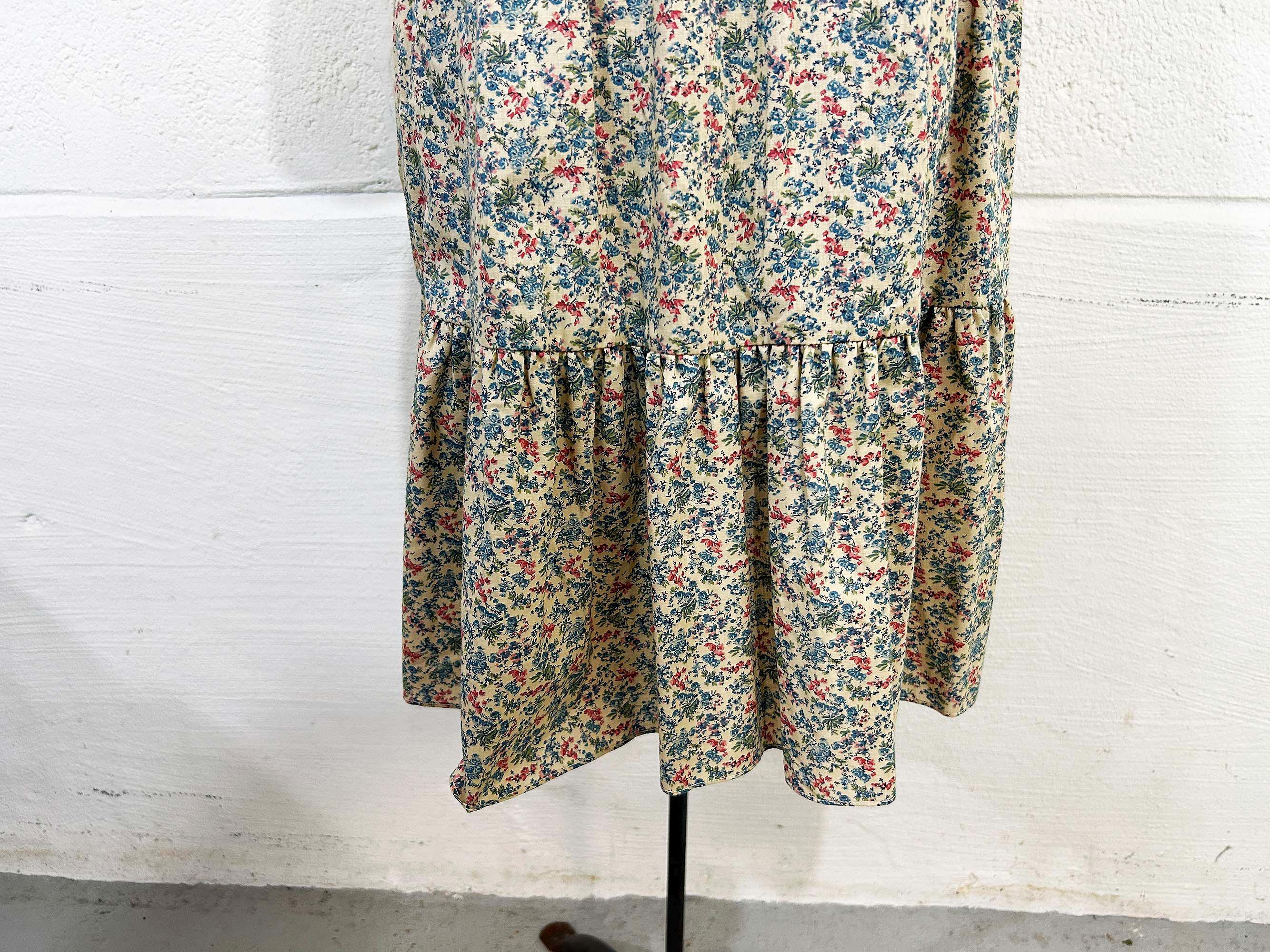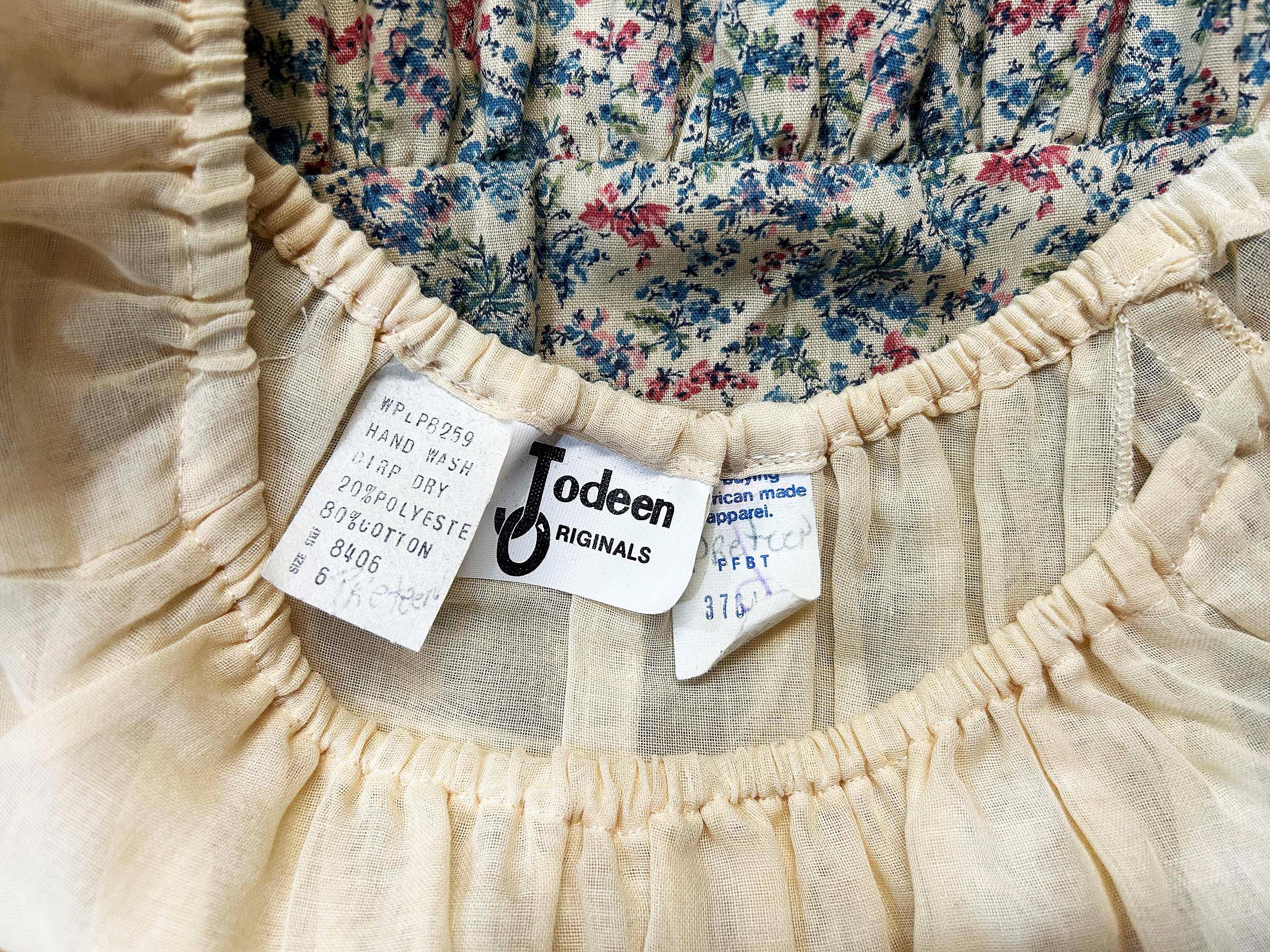 Cute floral wide neck dress with elasticized sleeves and neckline. Dress is in excellent shape with no significant flaws. It has half sleeves and a elasticized peasant neckline and elastic waist. Fabric has NO stretch. Dress is union made.