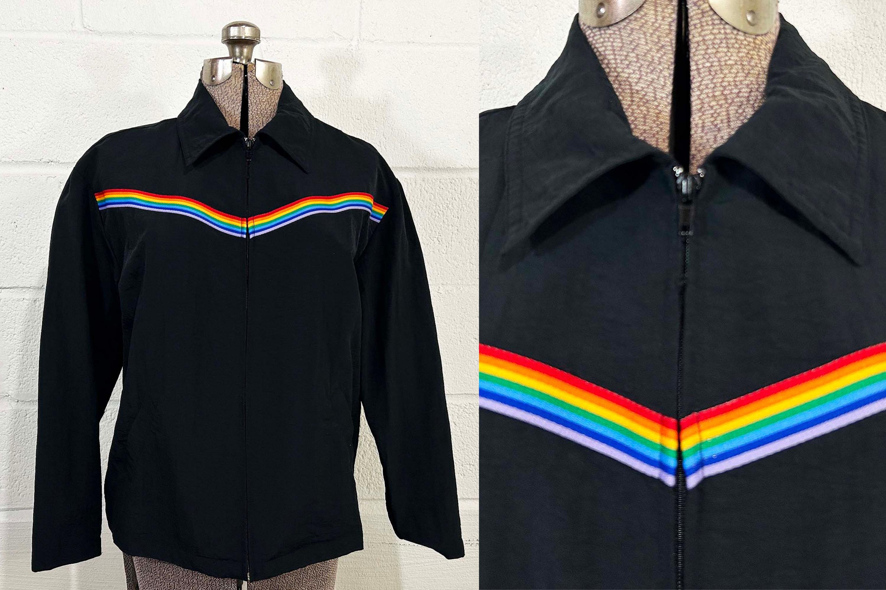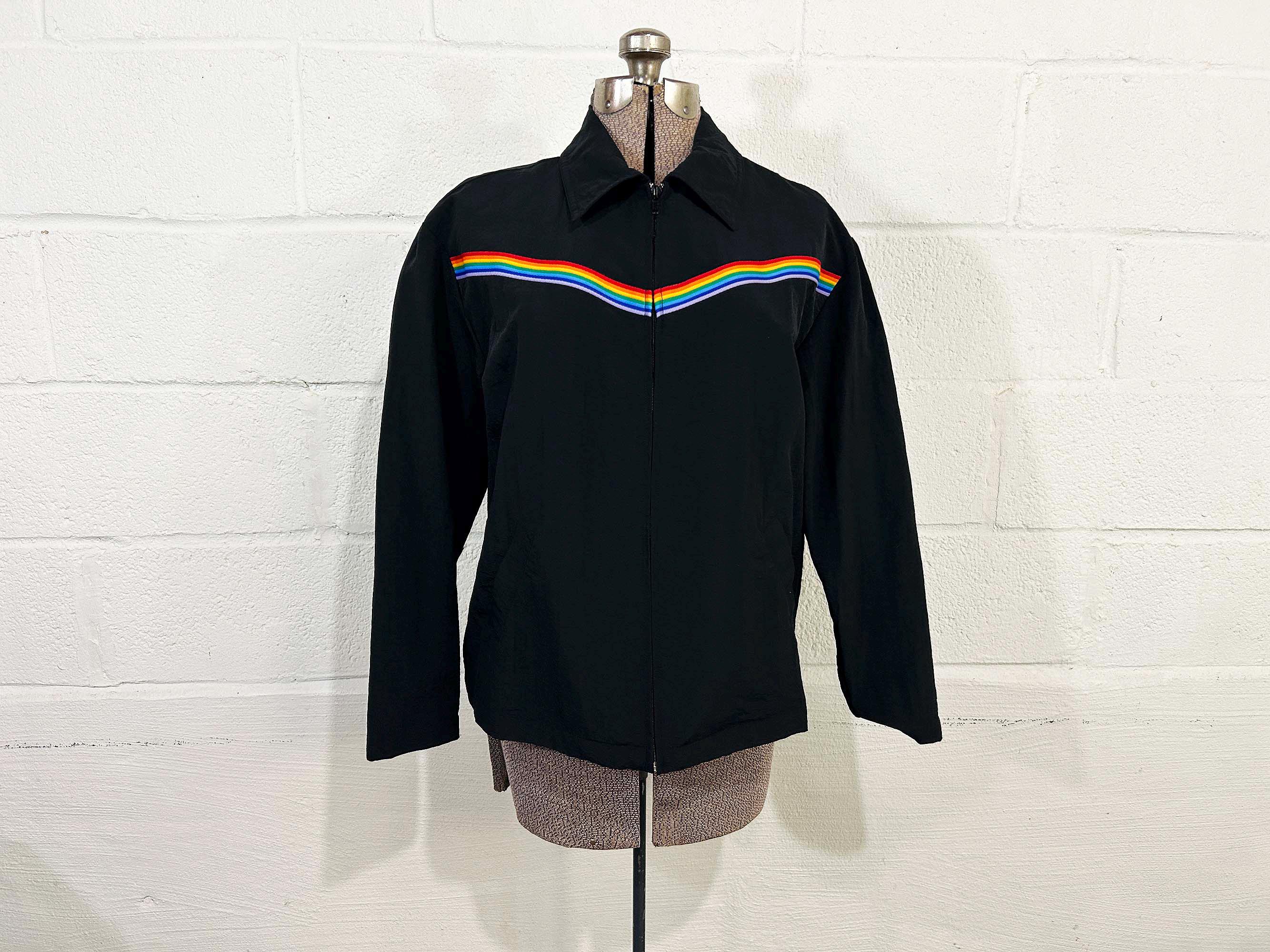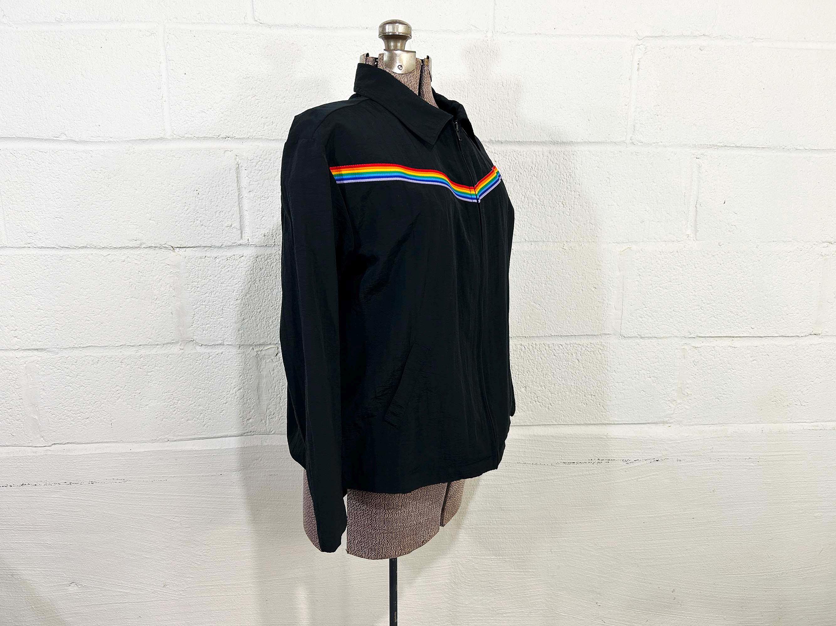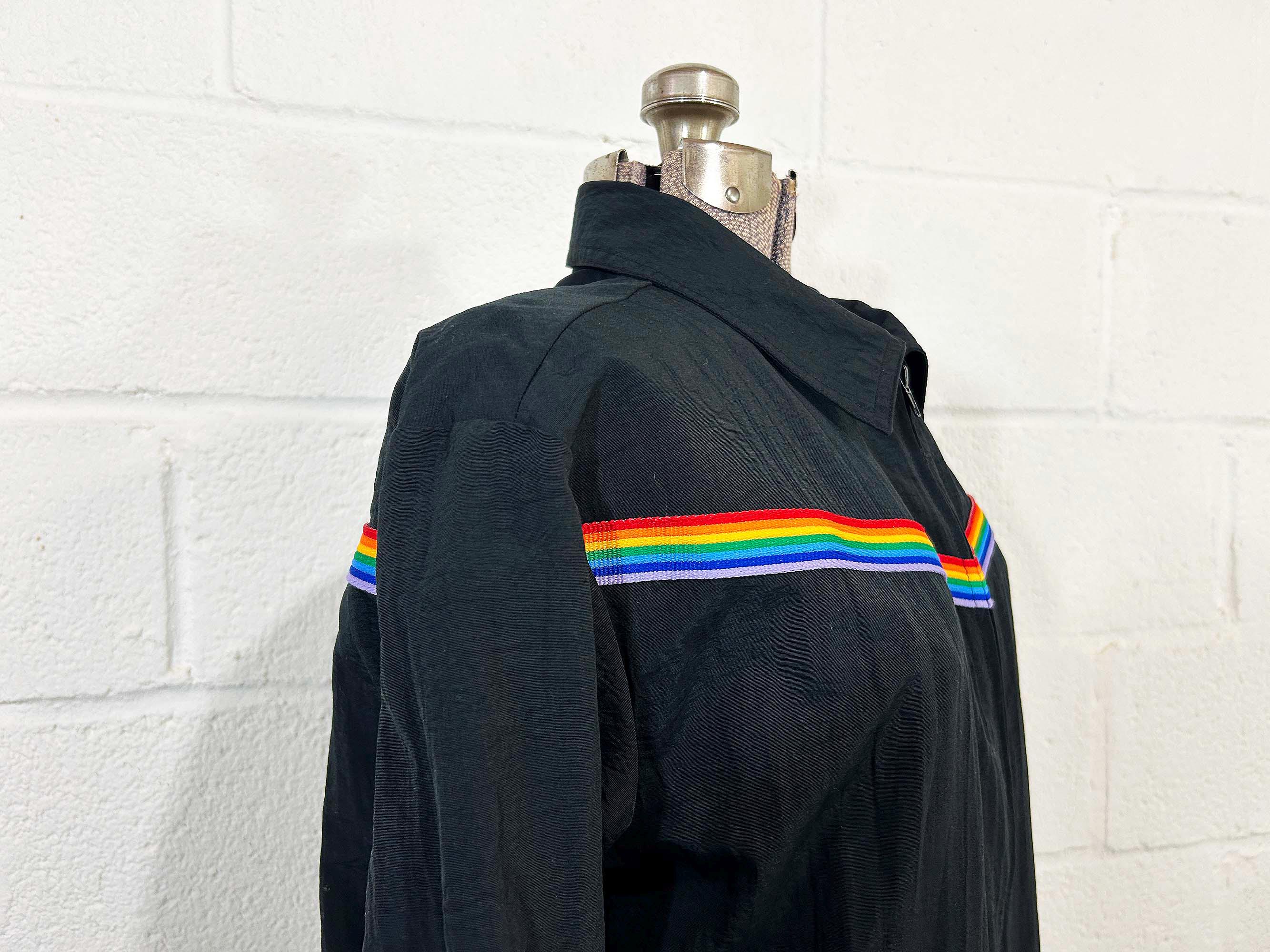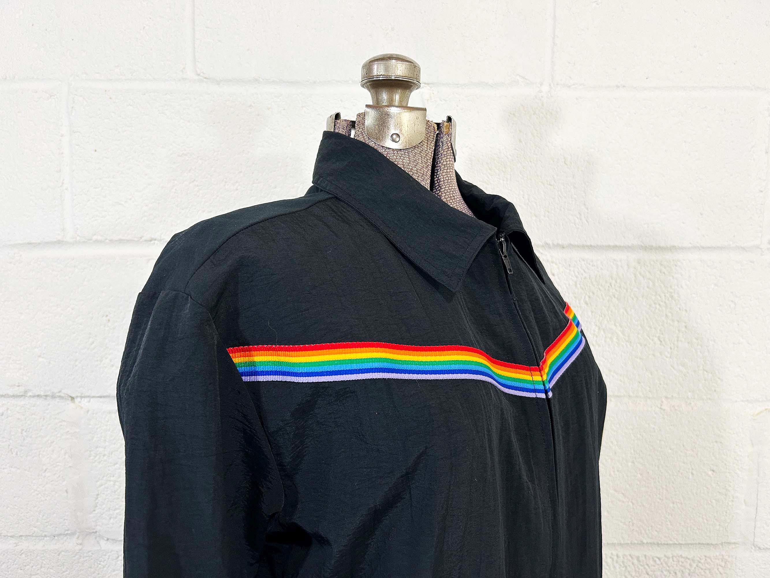 Adorable rainbow trimmed black windbreaker jacket! It's in great vintage shape with no significant wear. Two front hip pockets and a zip front with collar. Fabric has NO stretch.