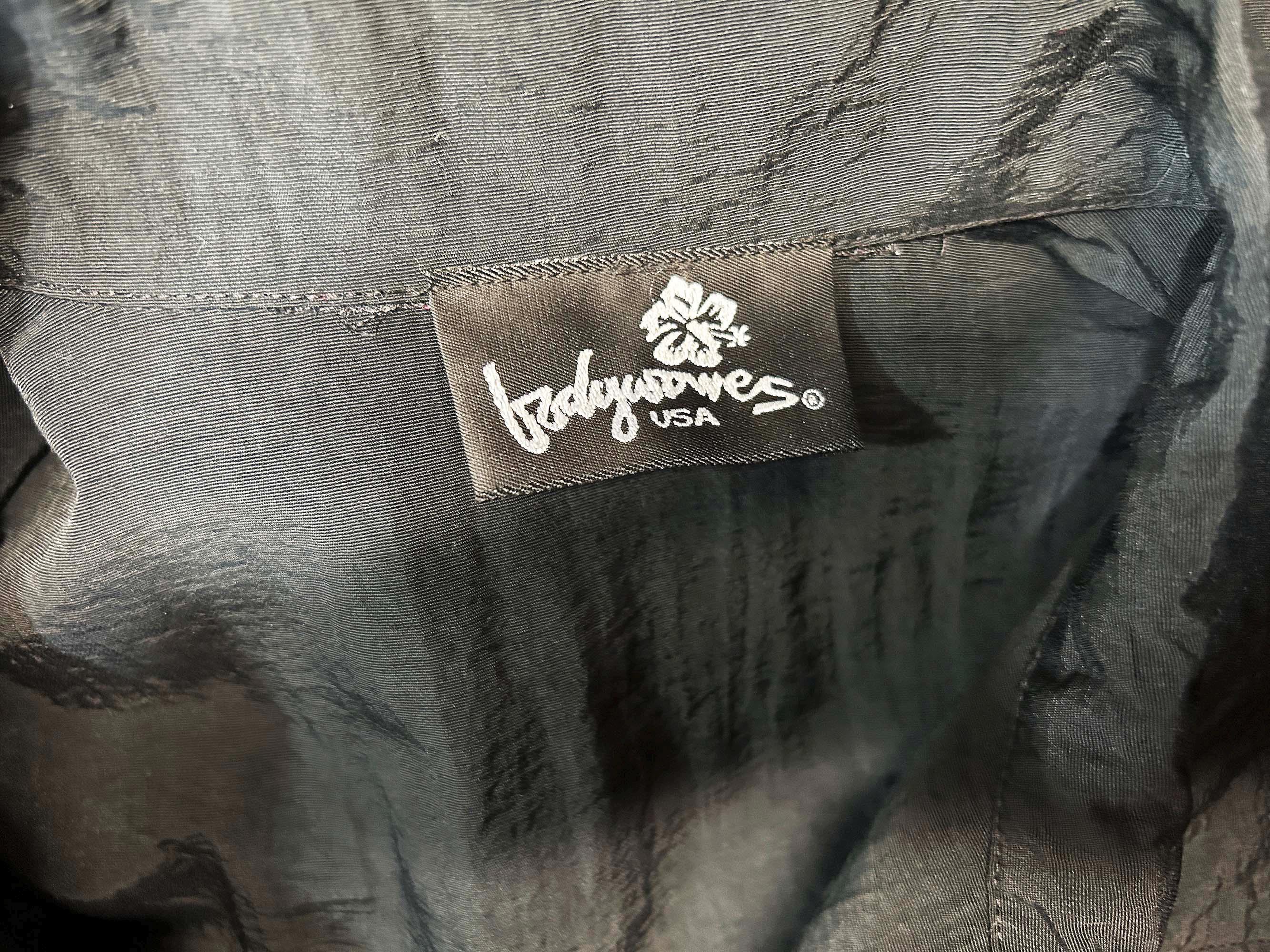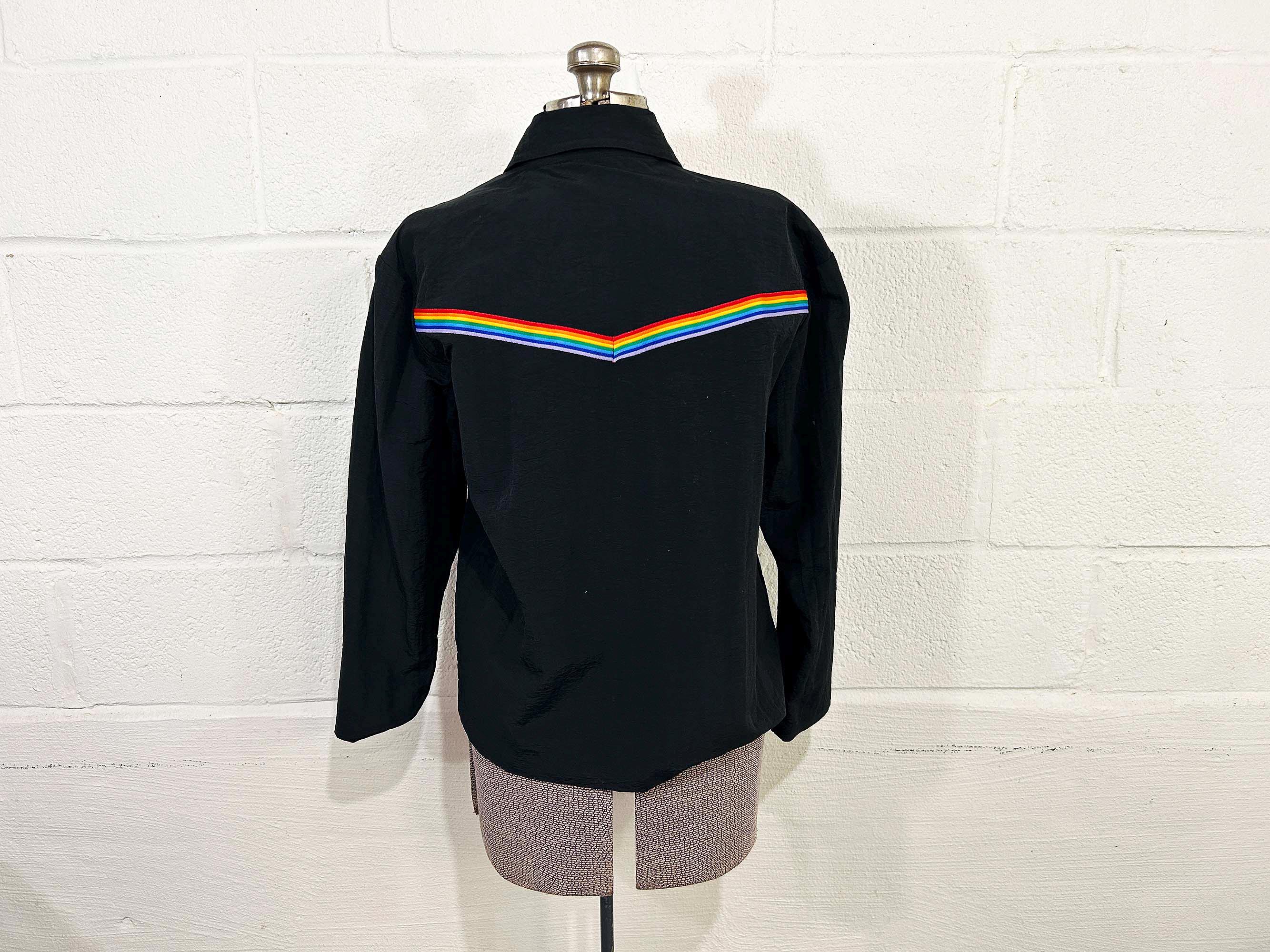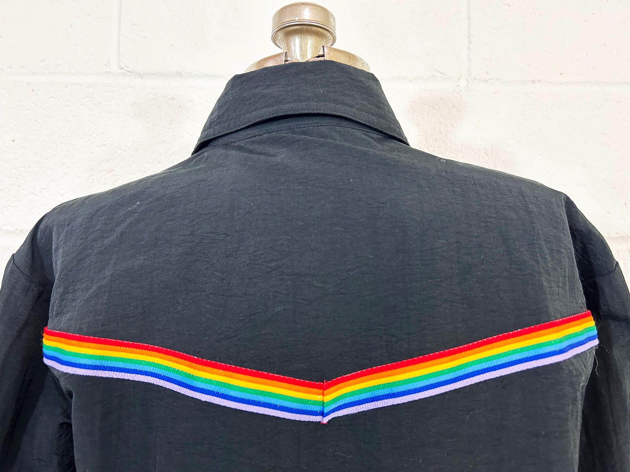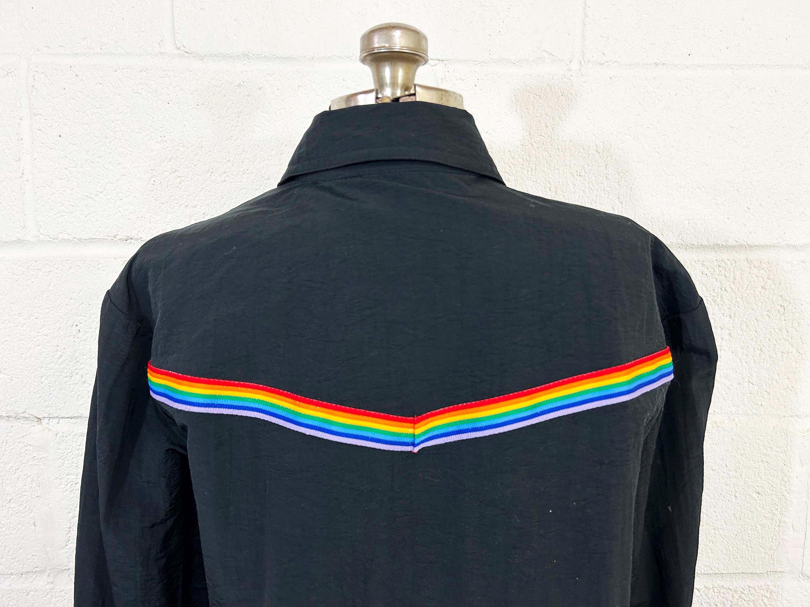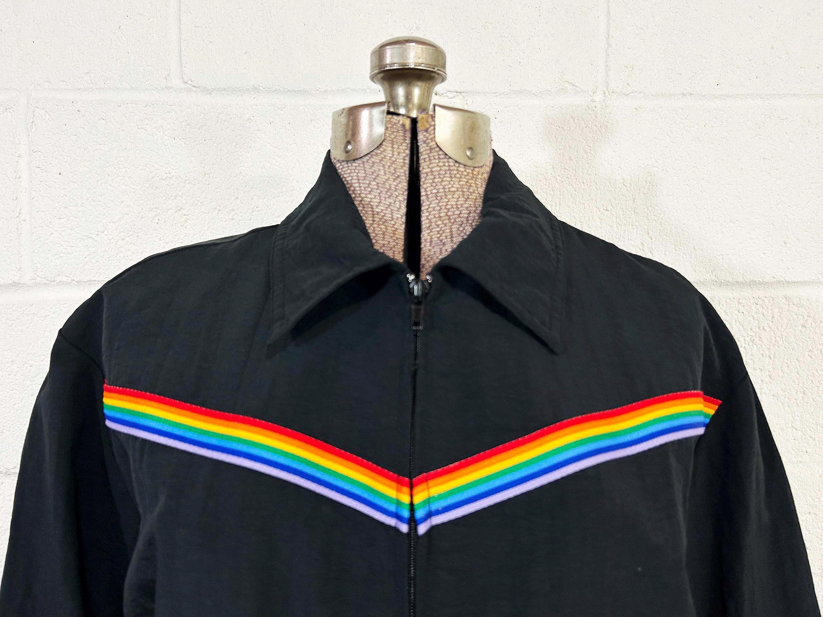 Adorable rainbow trimmed black windbreaker jacket! It's in great vintage shape with no significant wear. Two front hip pockets and a zip front with collar. Fabric has NO stretch.