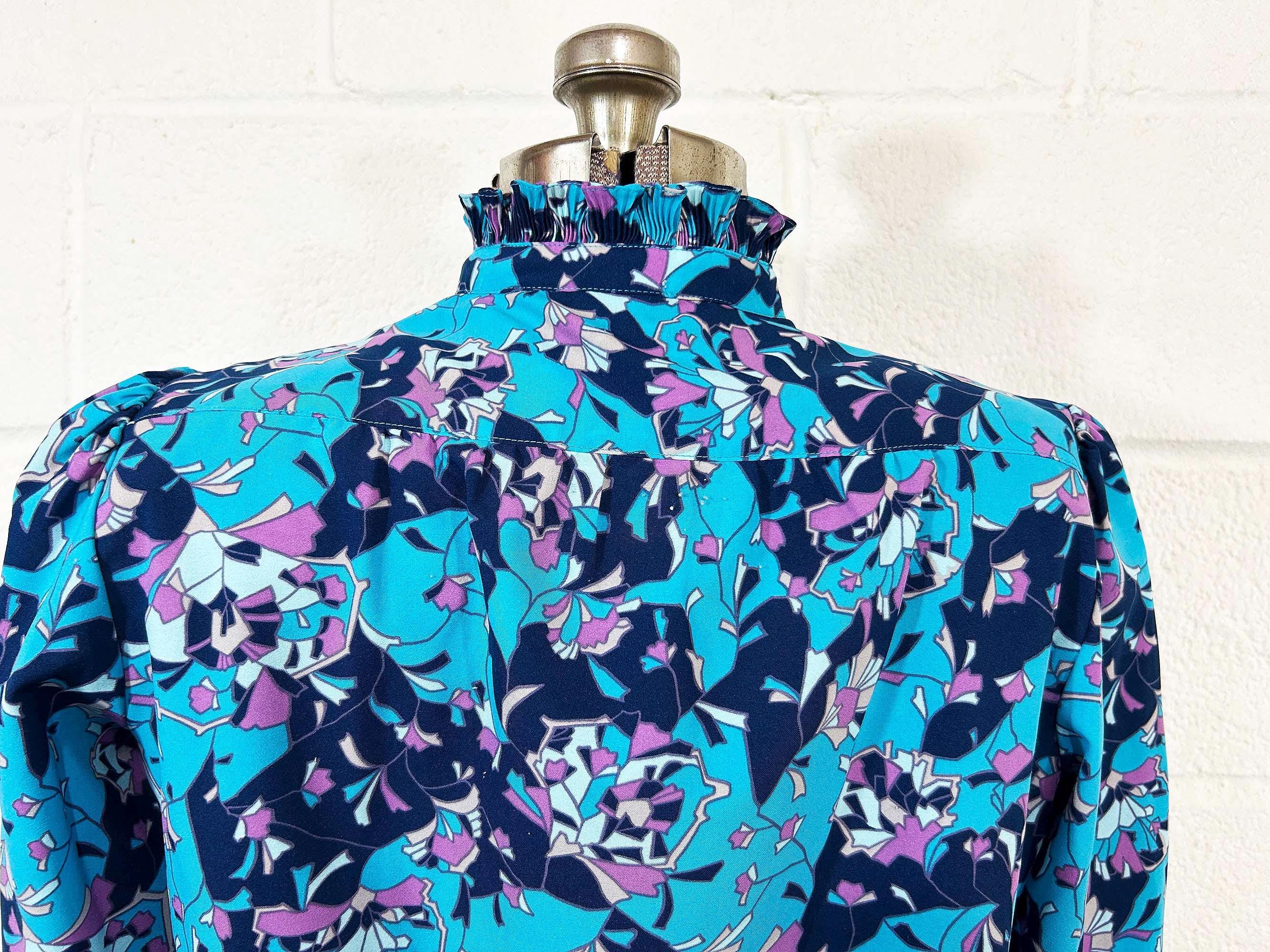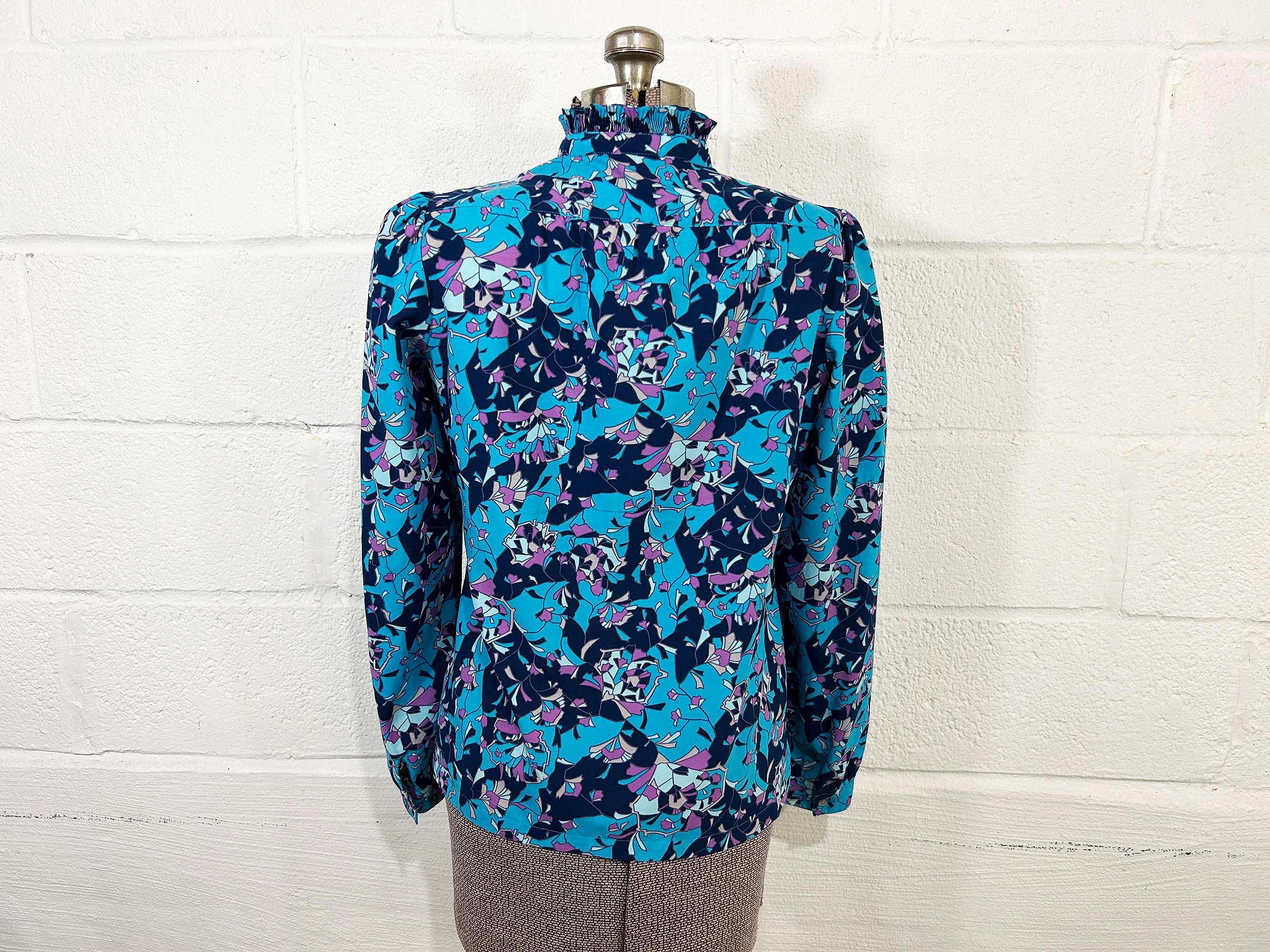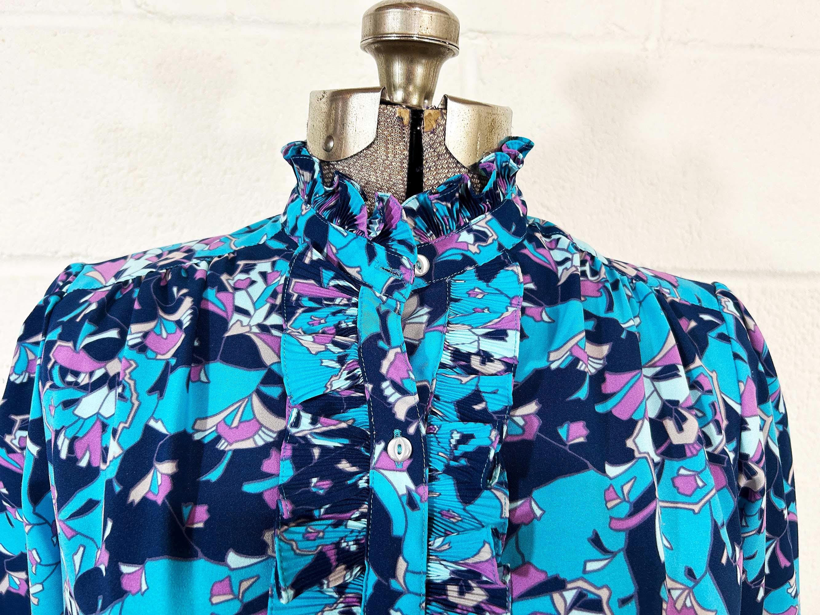 Cute blue abstract blouse with a unique ruffle collar and button front. So adorable. In good vintage condition with no significant wear. Fabric has no stretch.