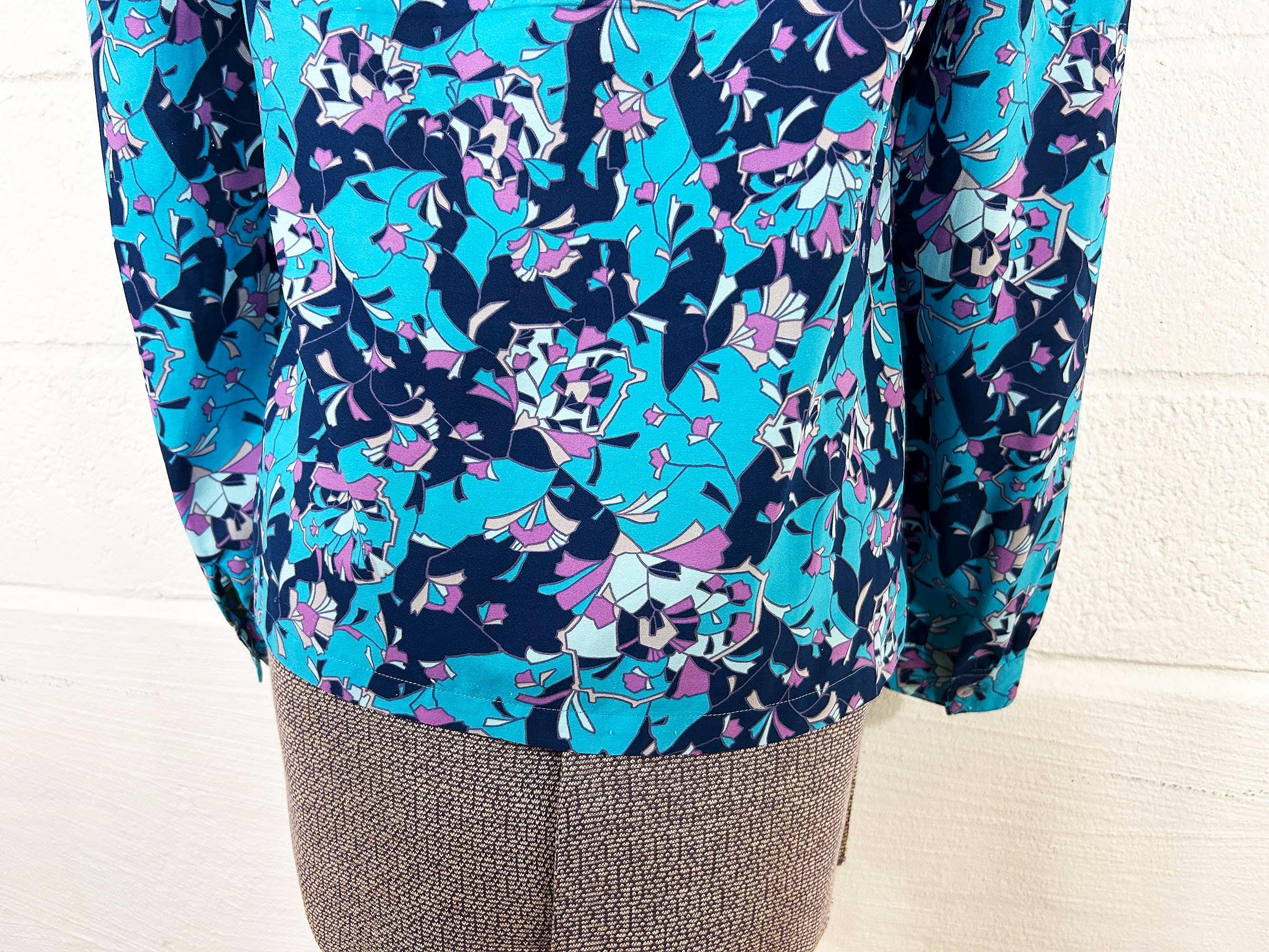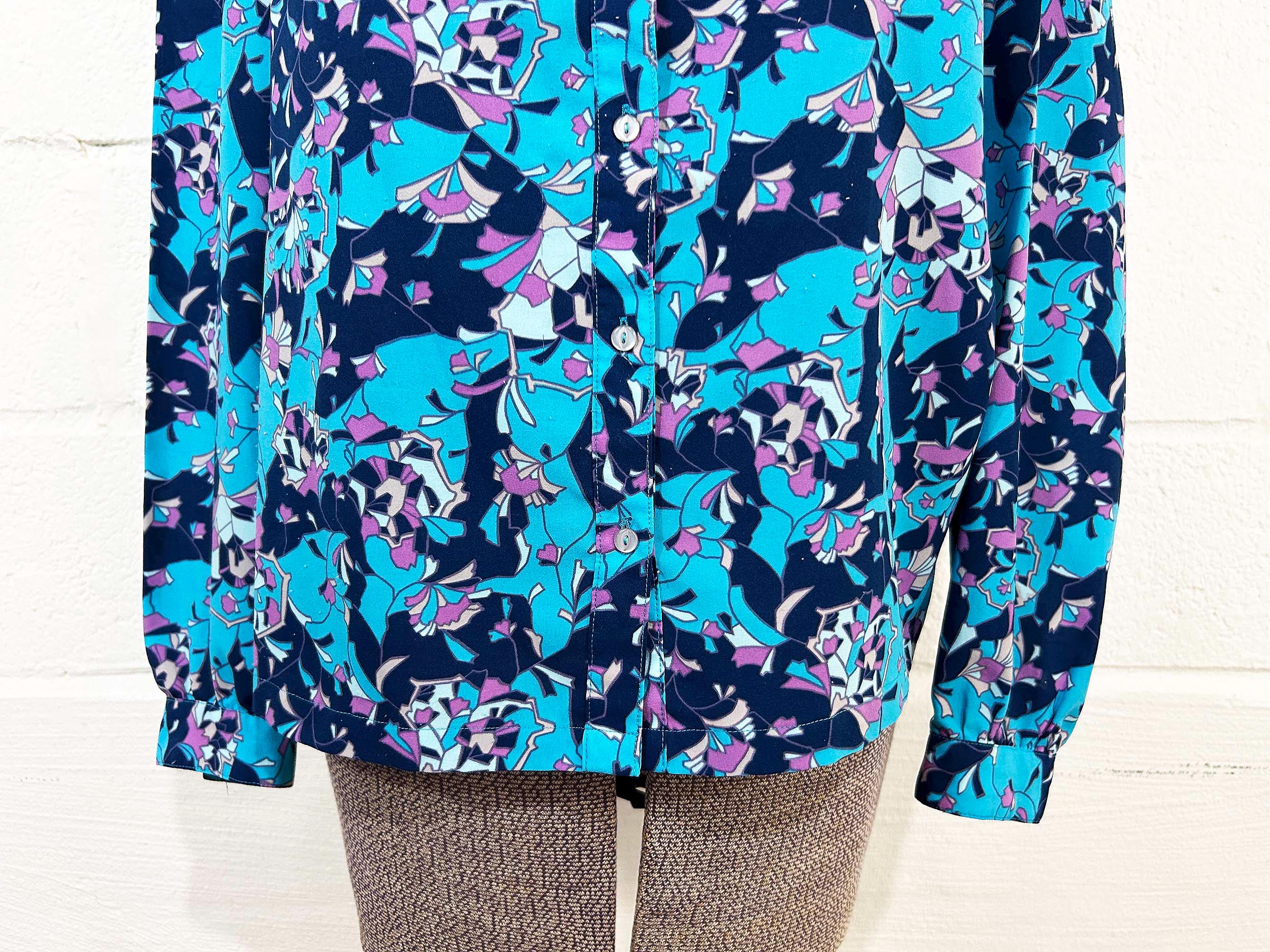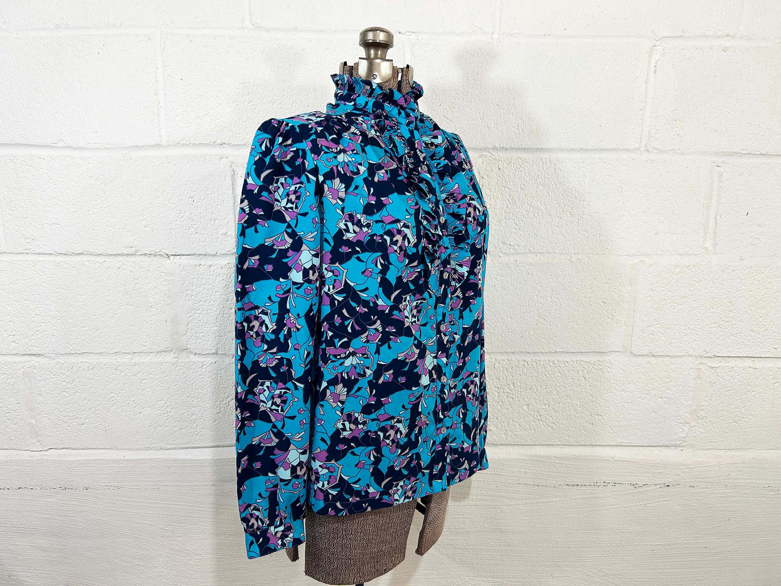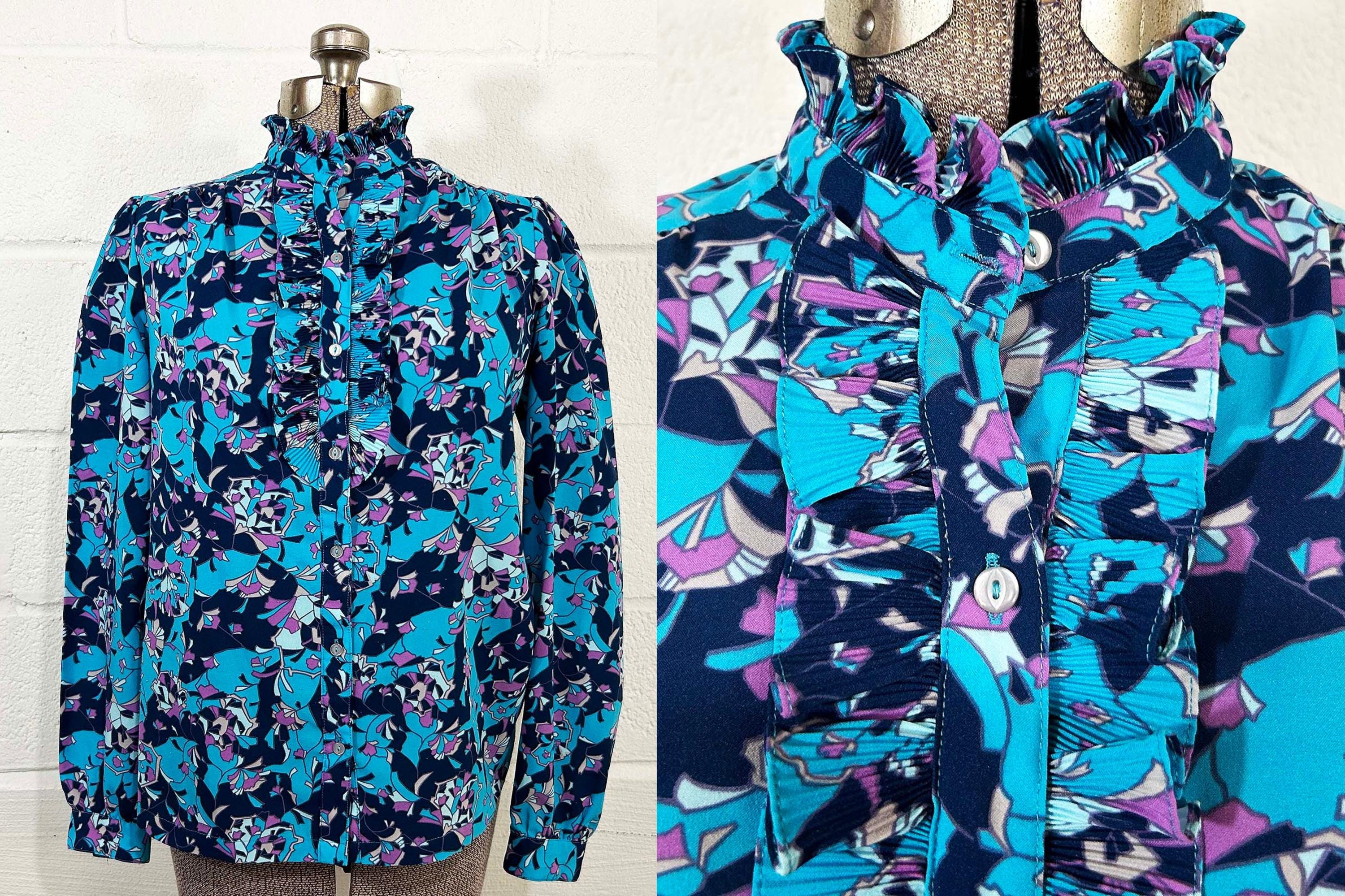 Cute blue abstract blouse with a unique ruffle collar and button front. So adorable. In good vintage condition with no significant wear. Fabric has no stretch.