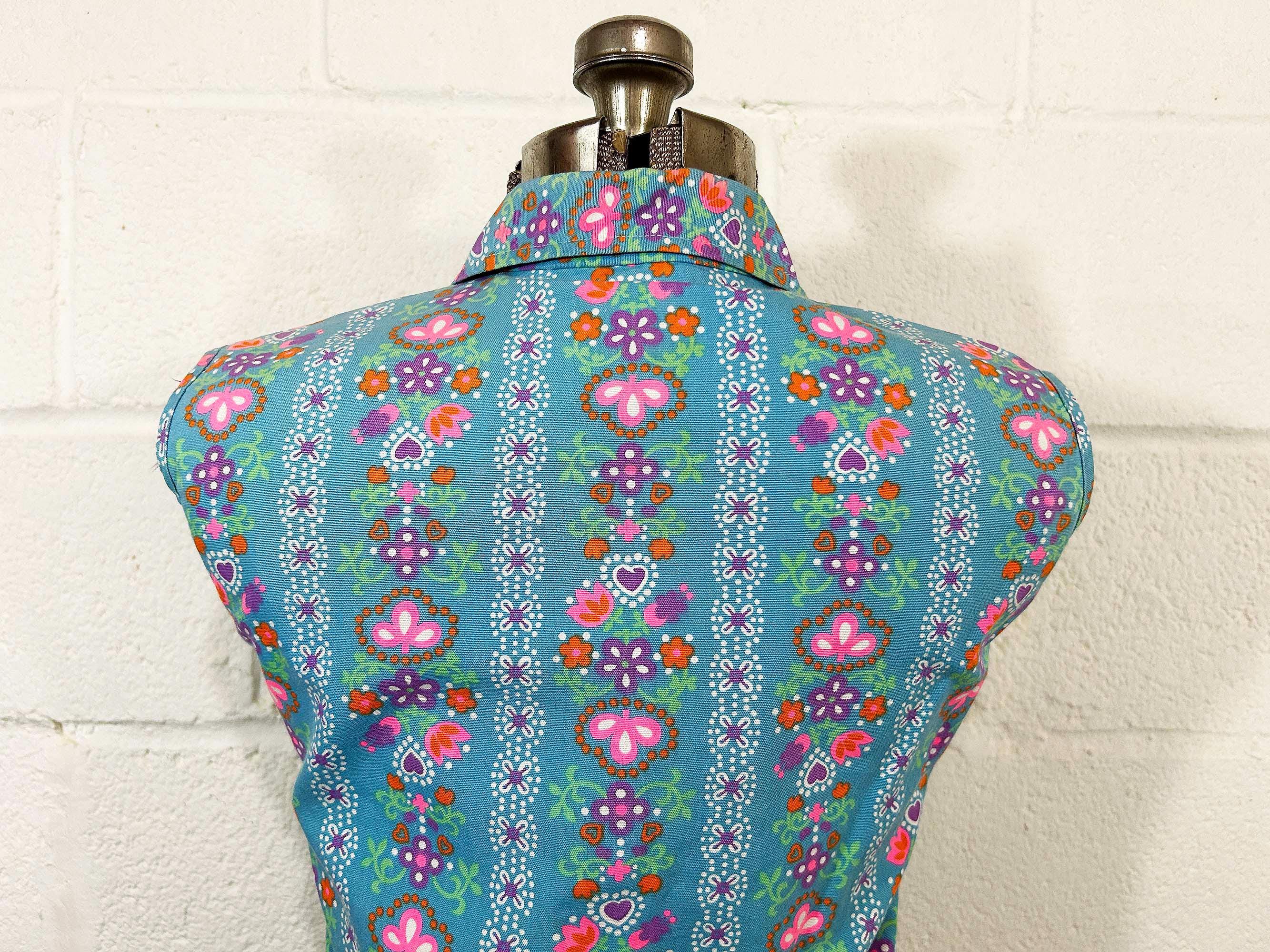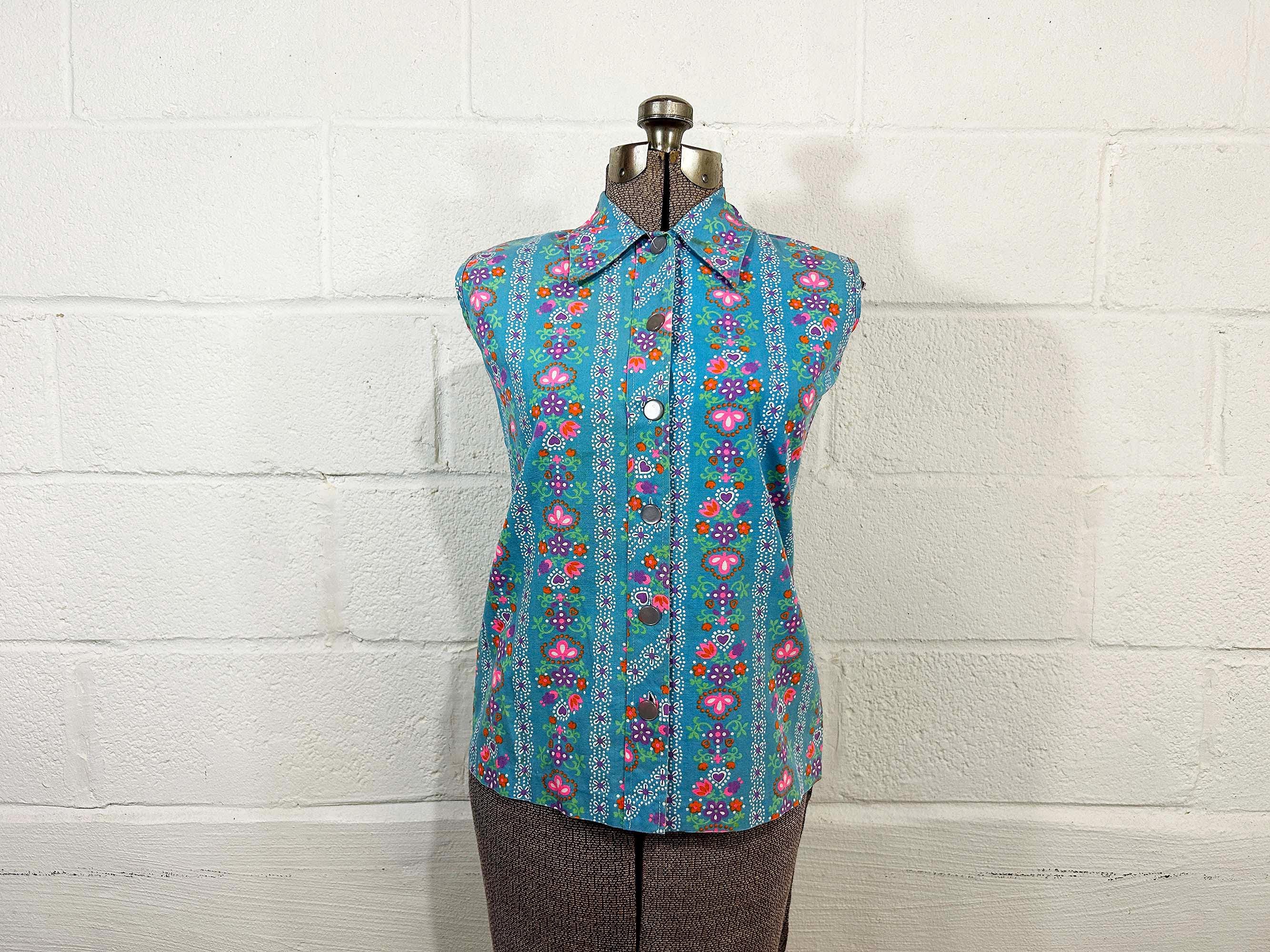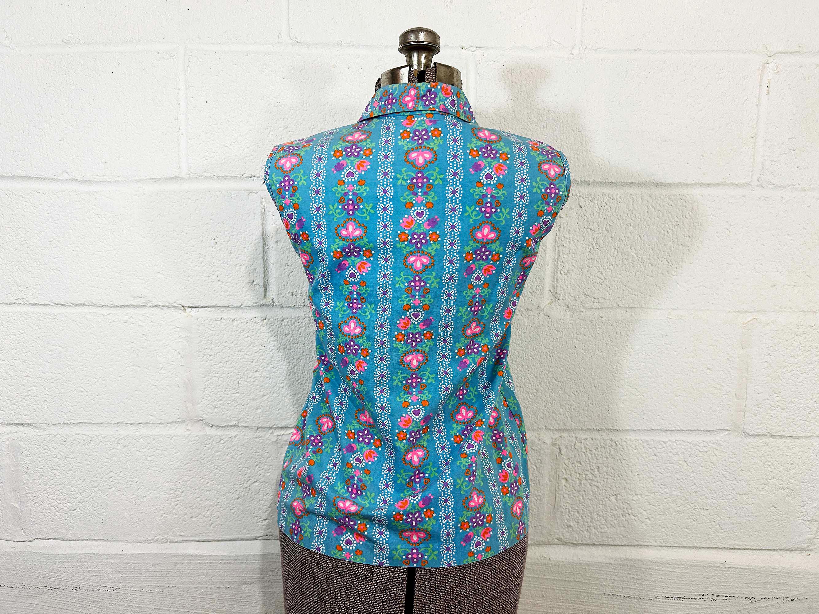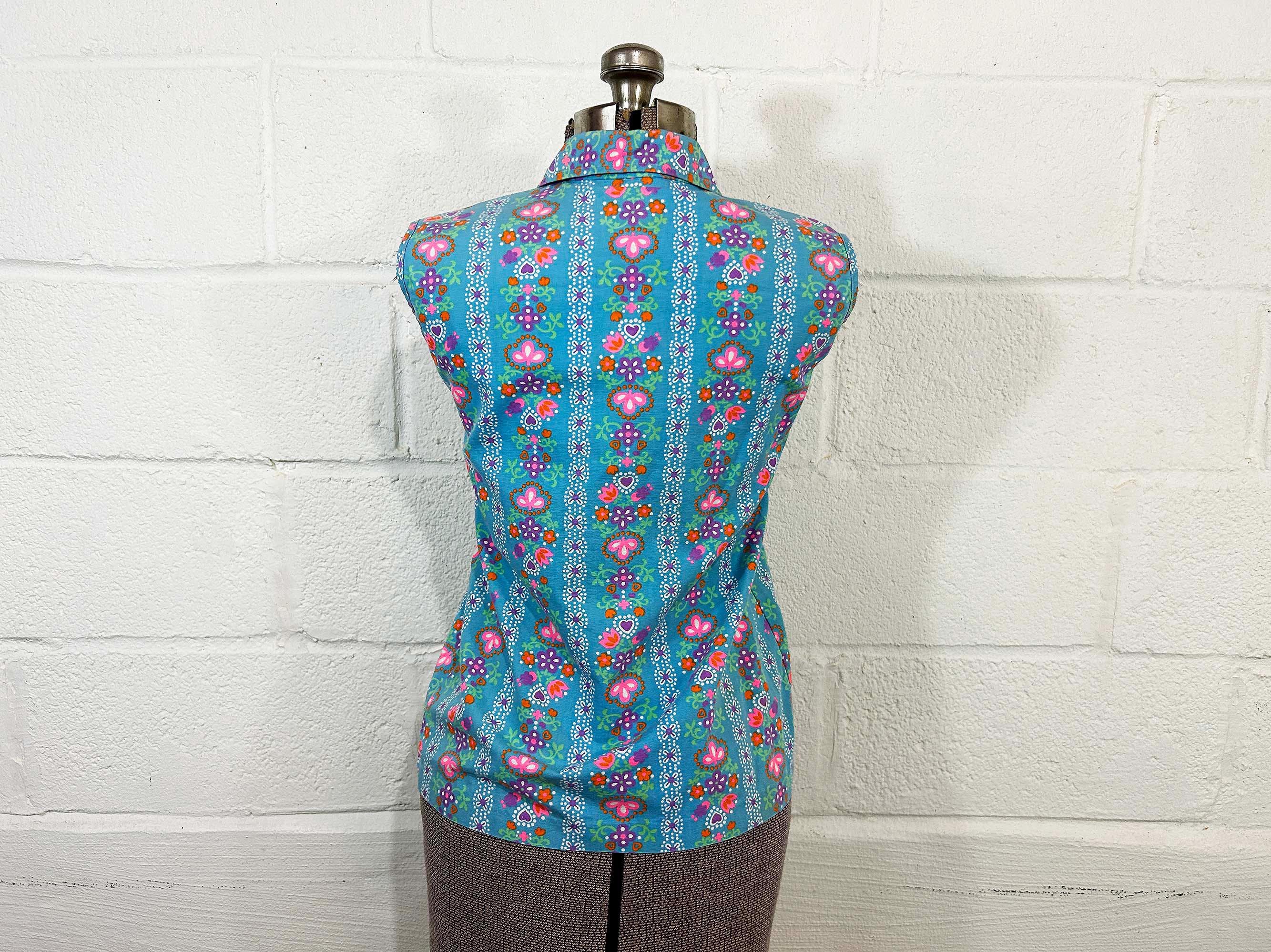 Super cute button front sleeveless collared shirt. In great condition with no significant wear. Fabric has NO stretch. Please note at the arm holes on this shirt are particularly small - about 4 1/2 inches in diameter.