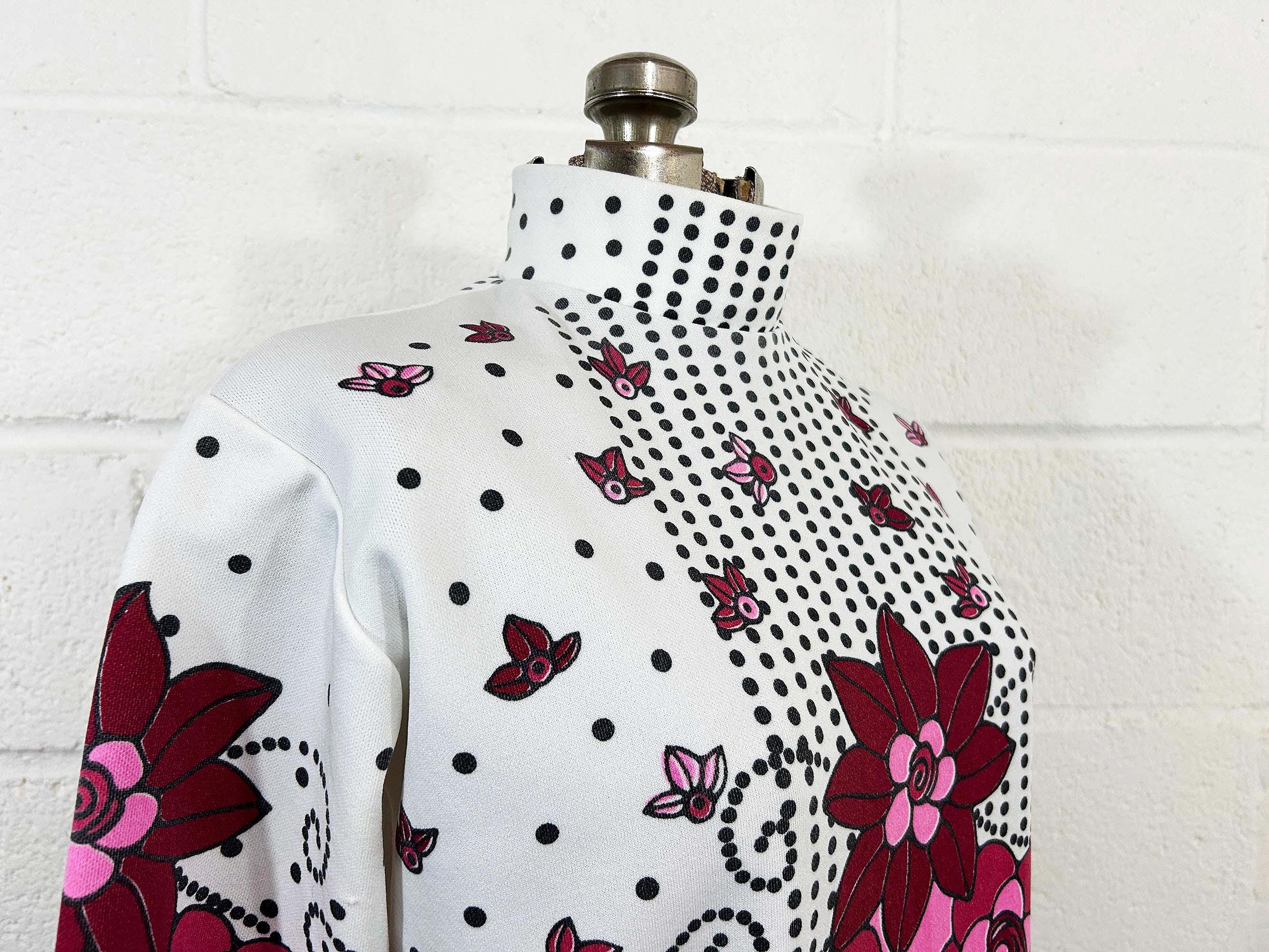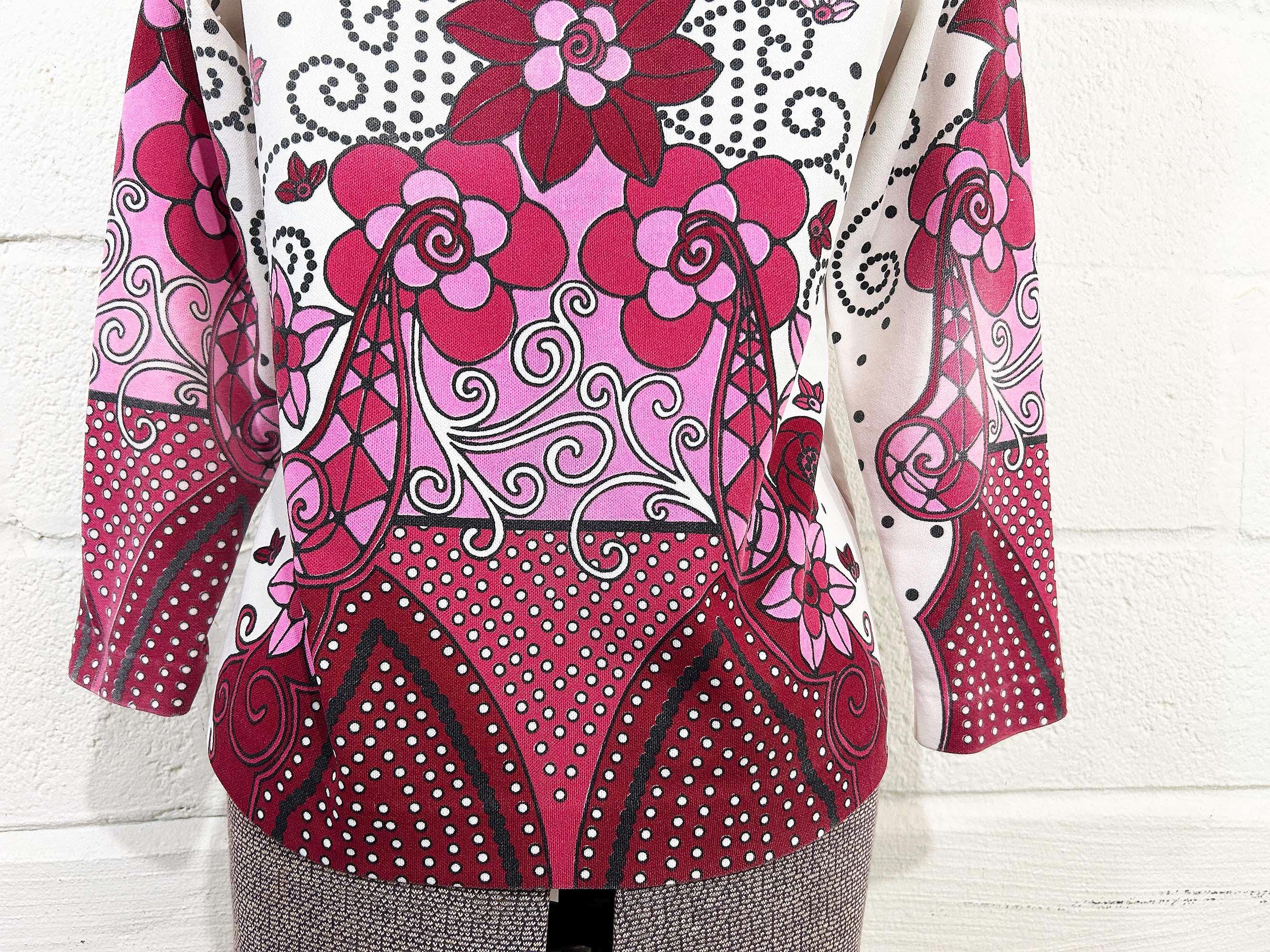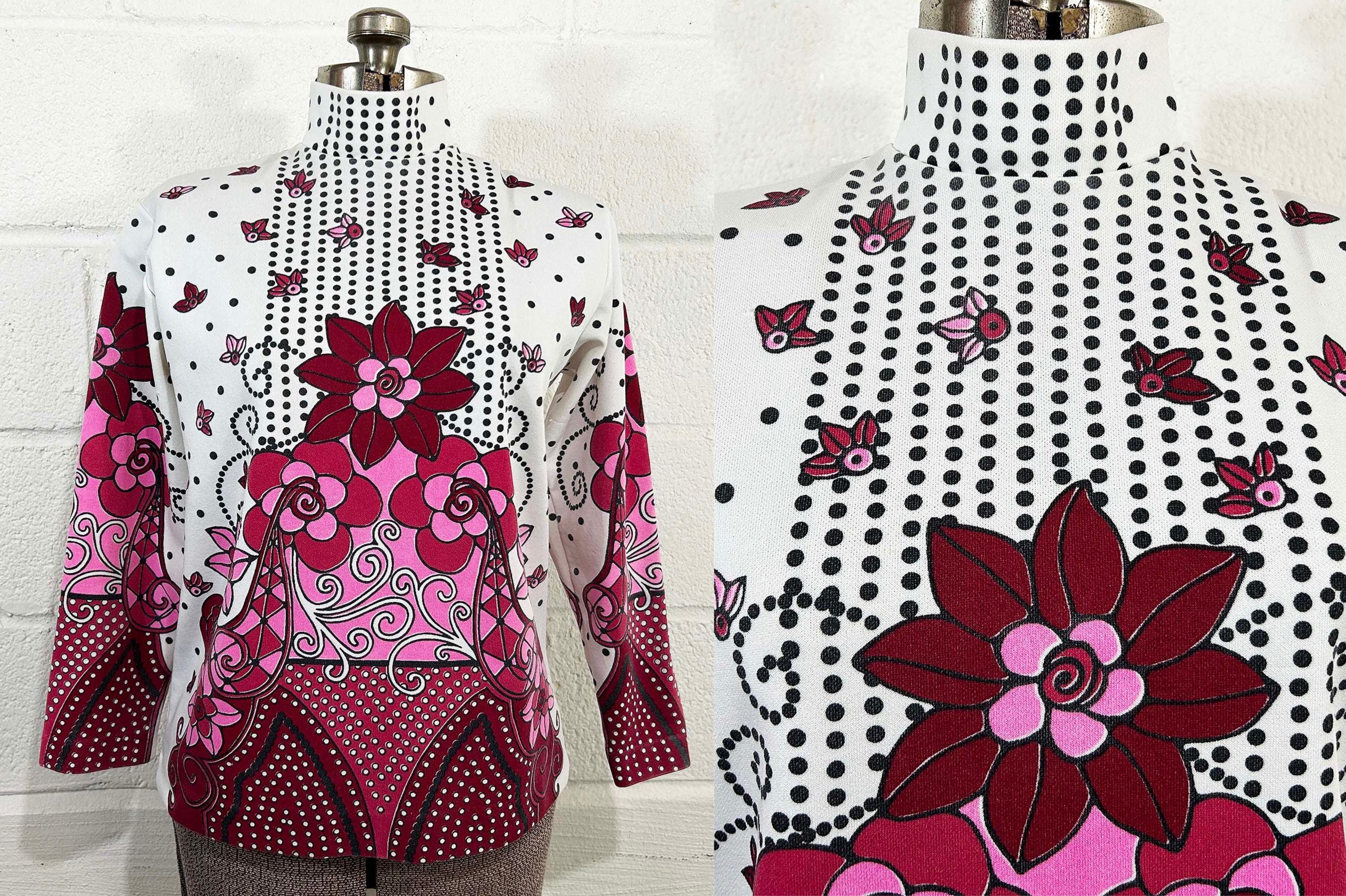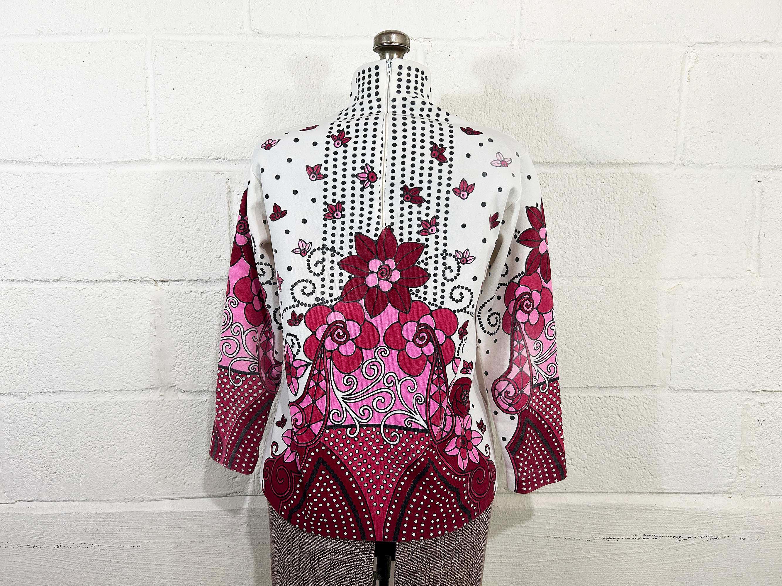 Adorable vintage pink floral long sleeve mockneck top! It is in great vintage condition. Zipper at the back of the neck. Fabric has slight stretch. There is some fading in a few spots on the design - please be sure to inspect all photos closely.