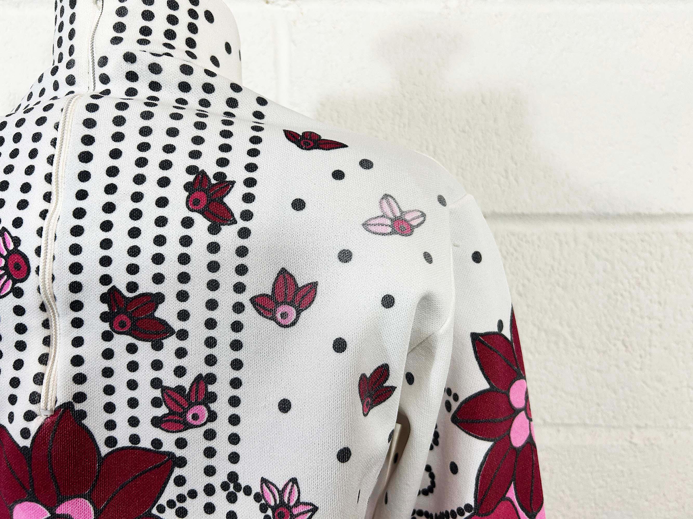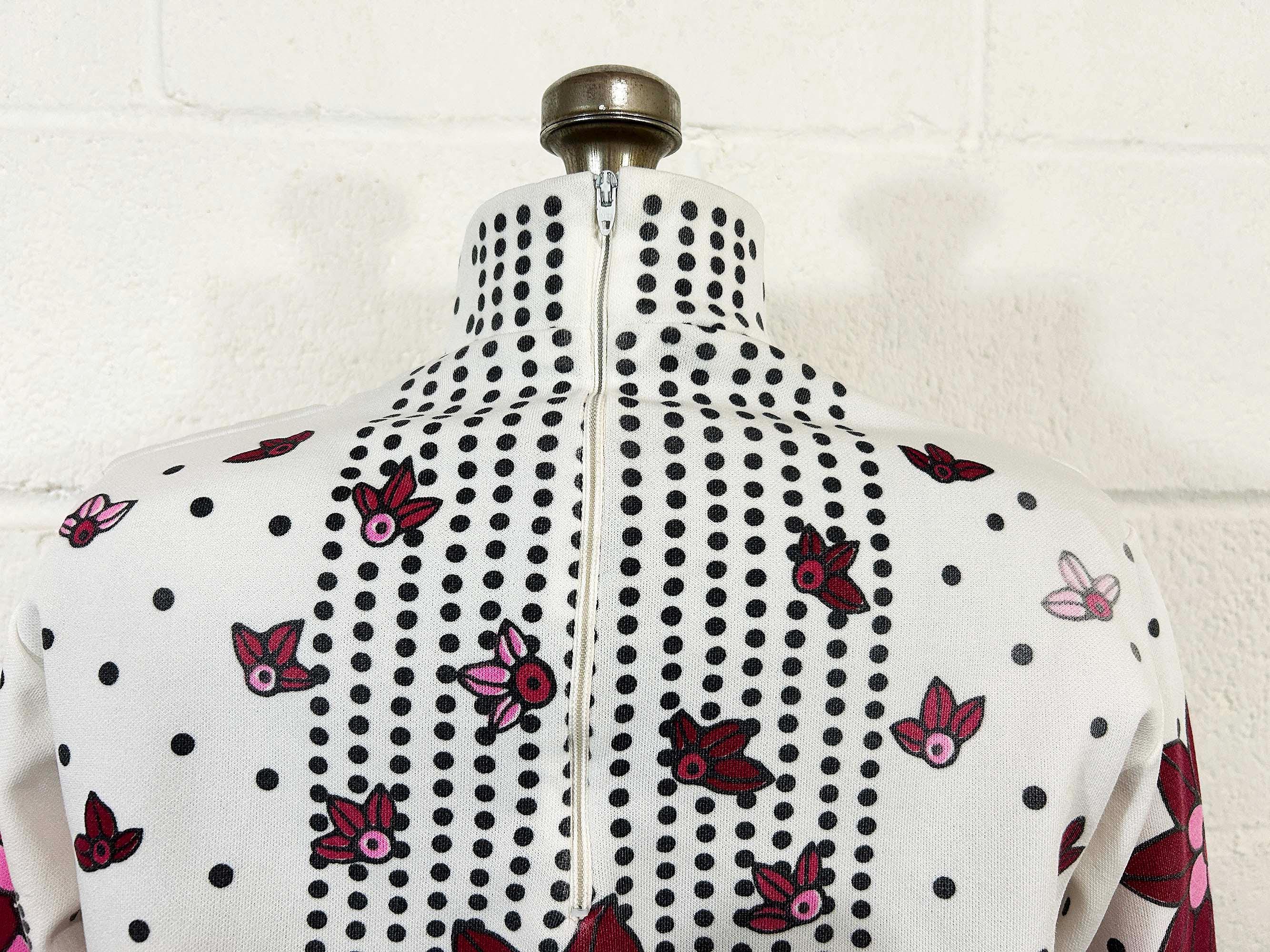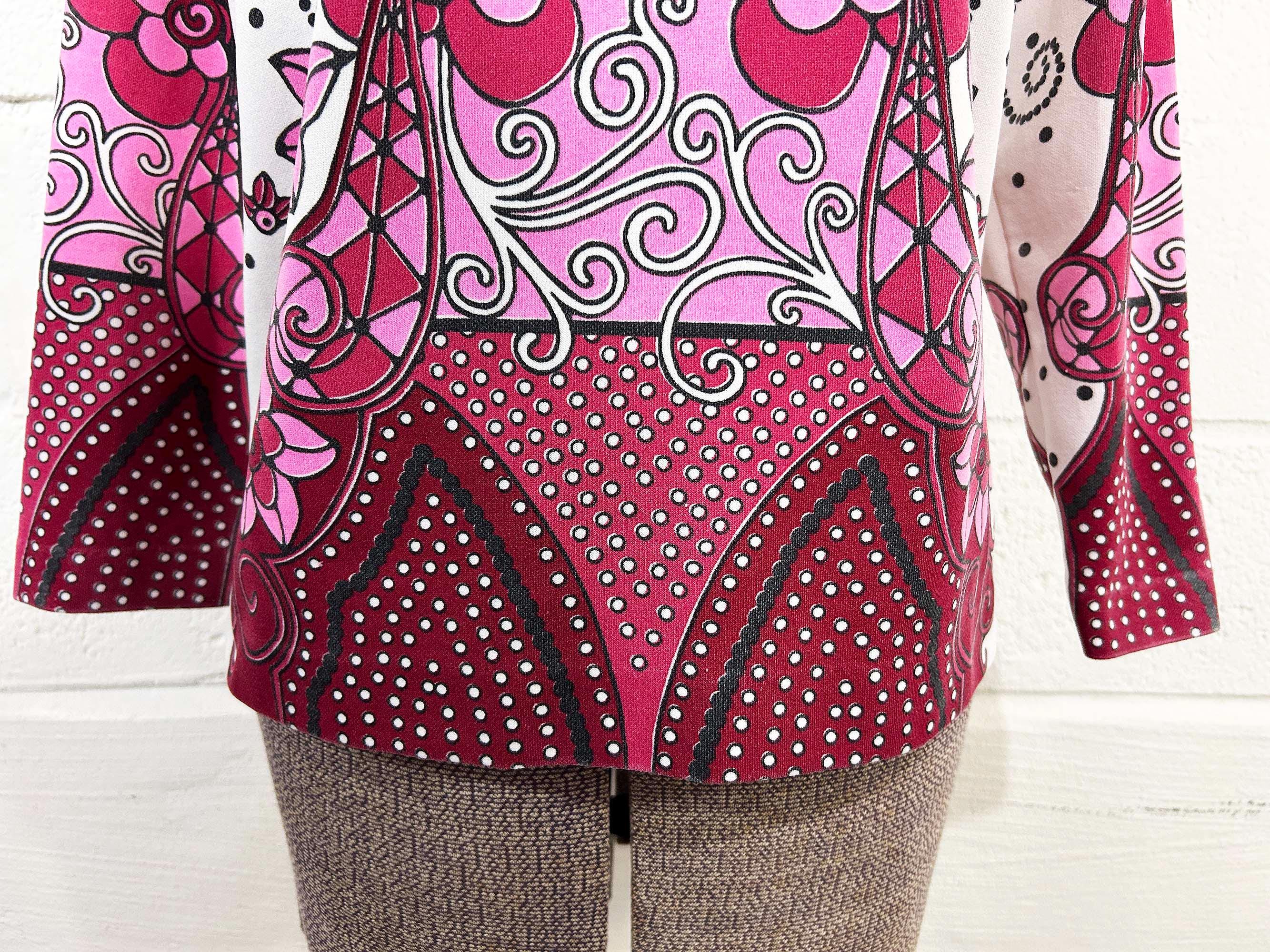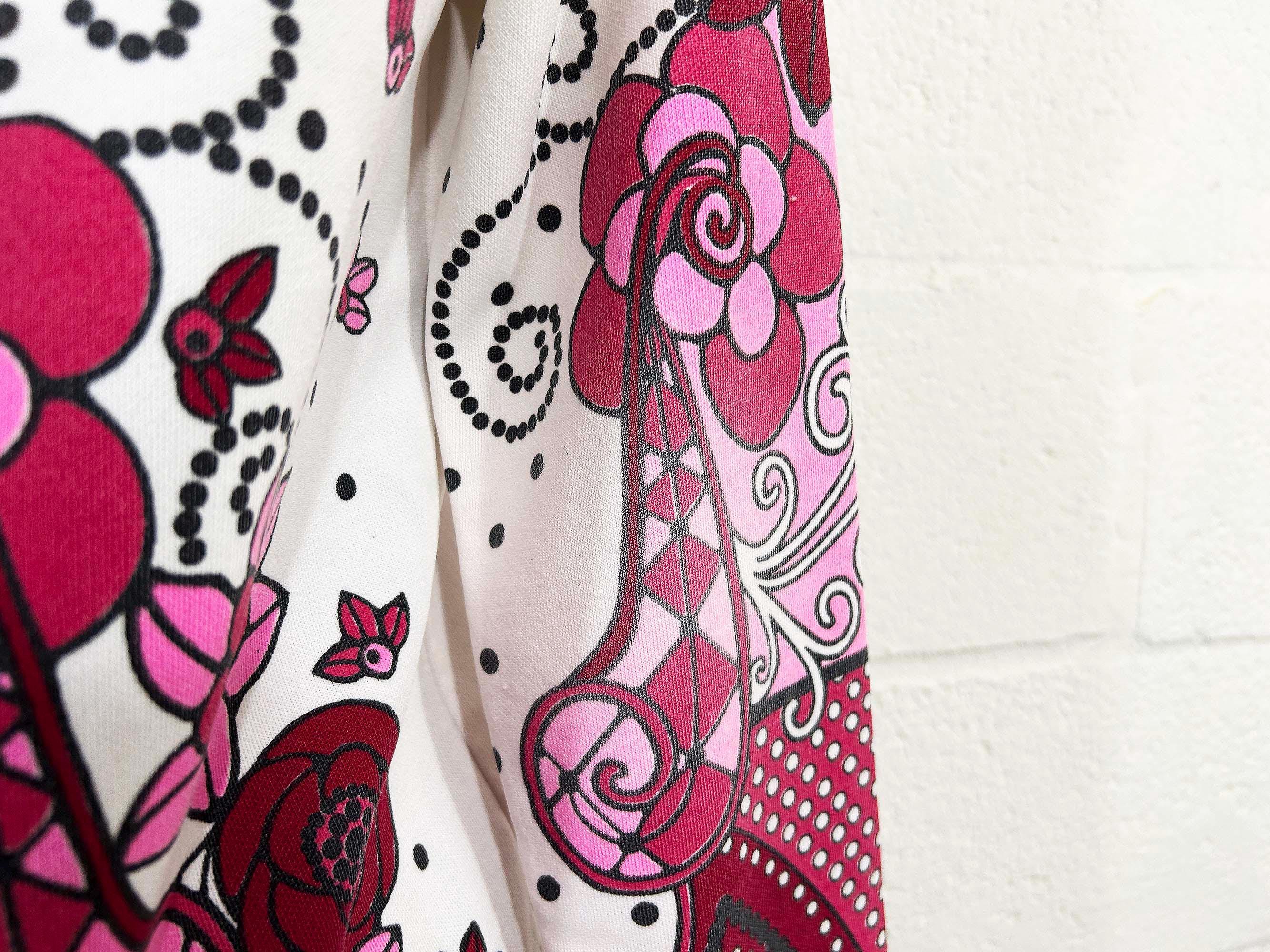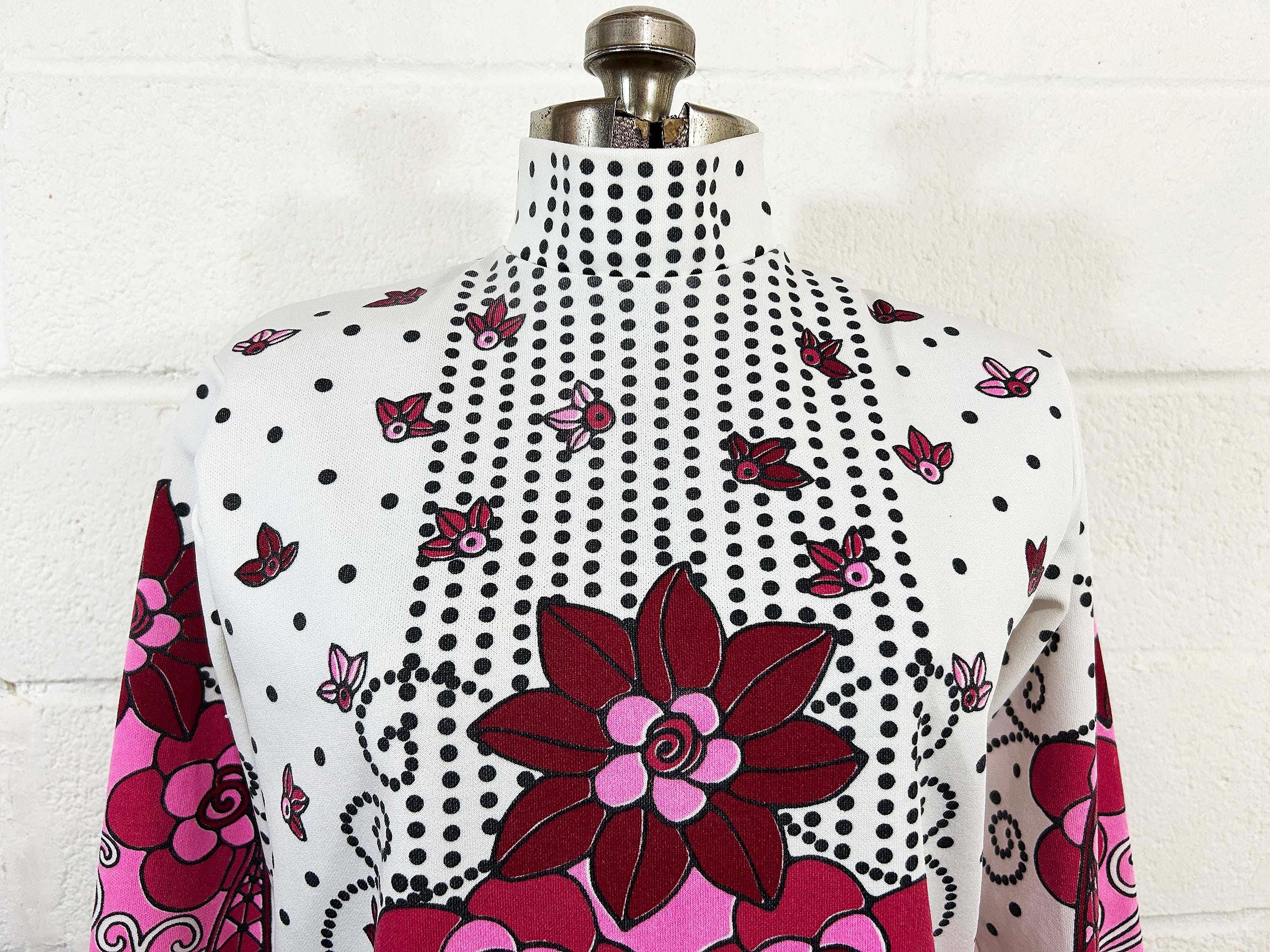 Adorable vintage pink floral long sleeve mockneck top! It is in great vintage condition. Zipper at the back of the neck. Fabric has slight stretch. There is some fading in a few spots on the design - please be sure to inspect all photos closely.