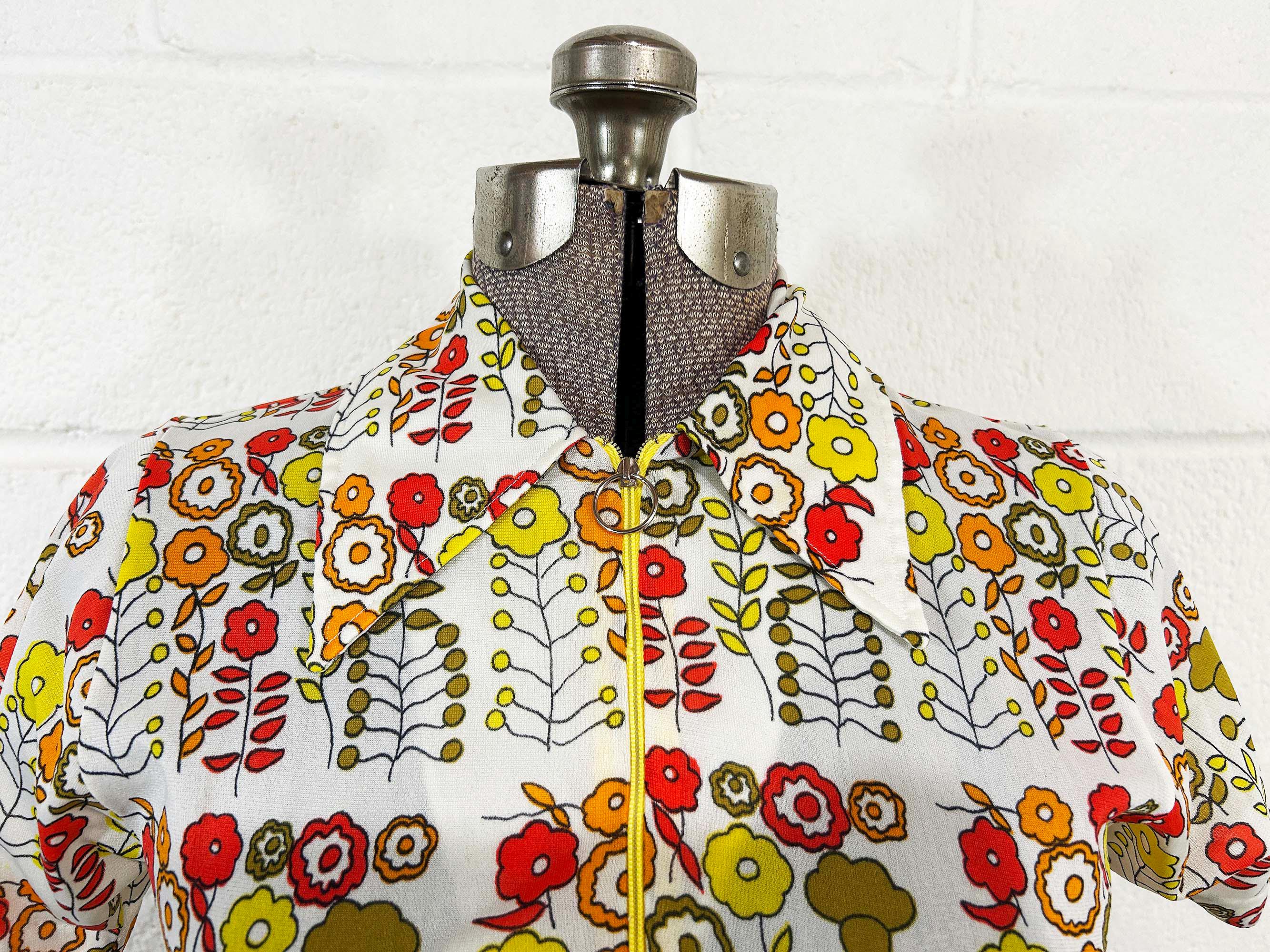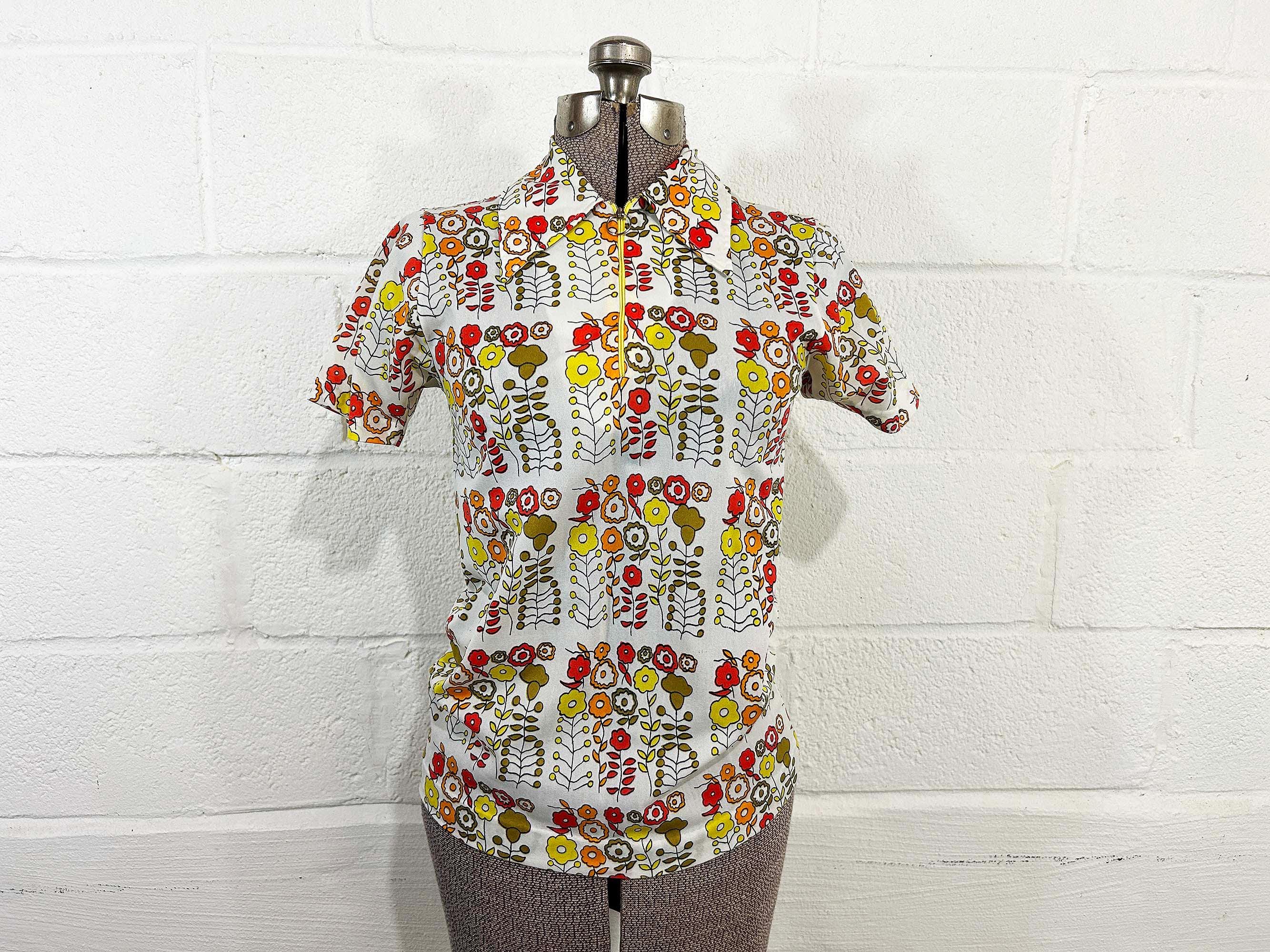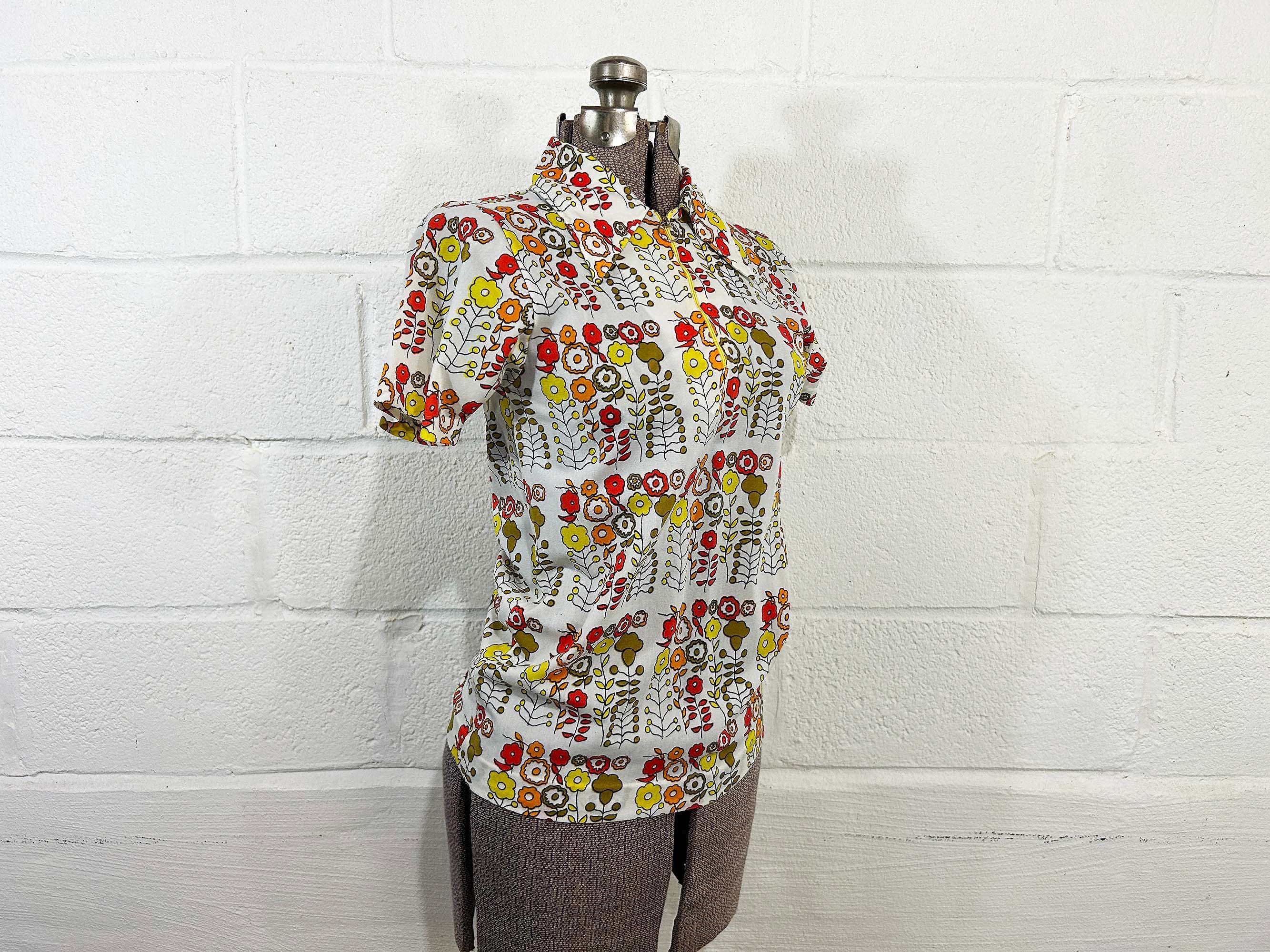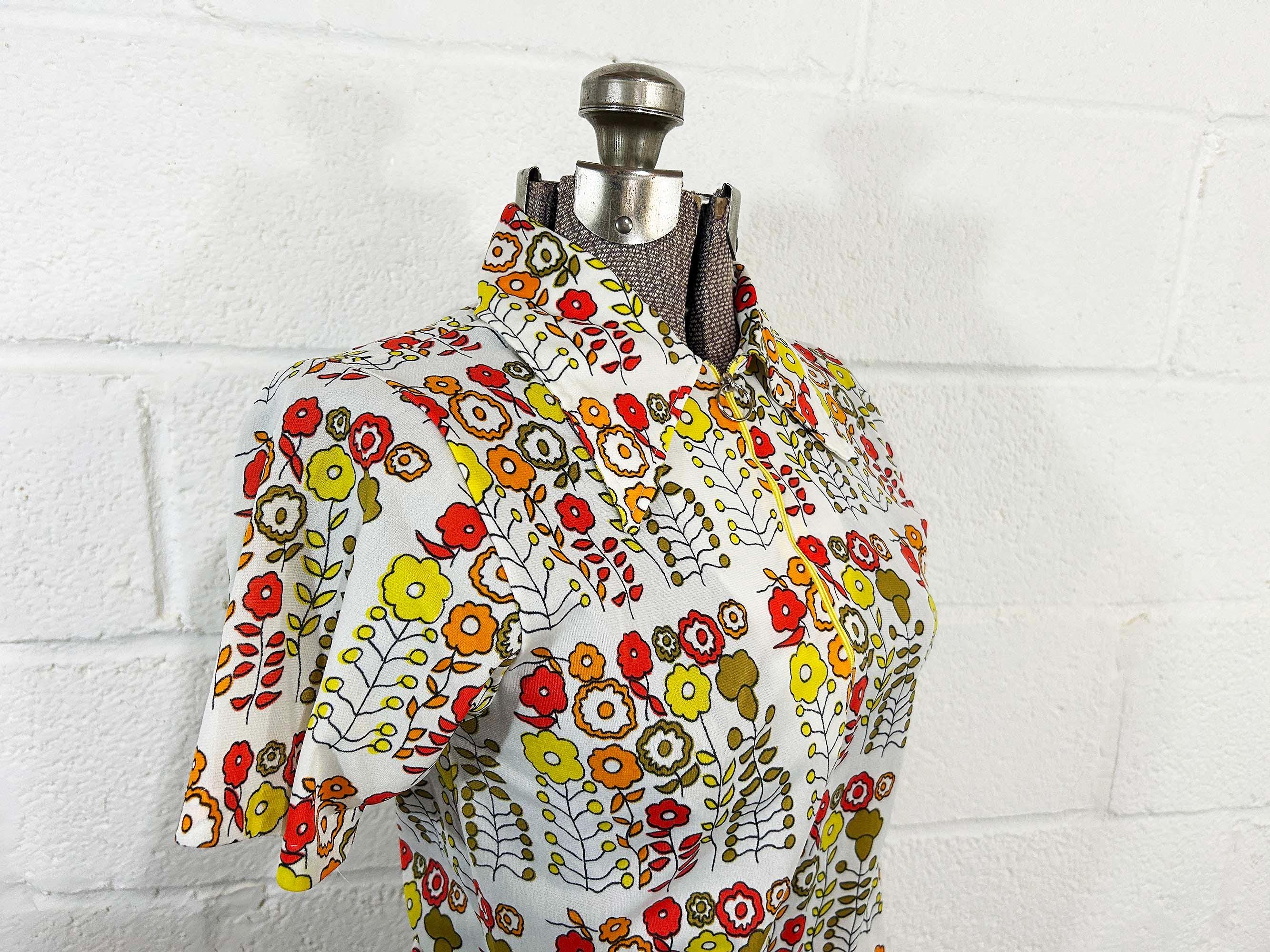 Vintage 1960s mod floral top with short sleeves. In great condition with no significant flaws. It has a o-ring half zip front and collar. Fabric has slight stretch.