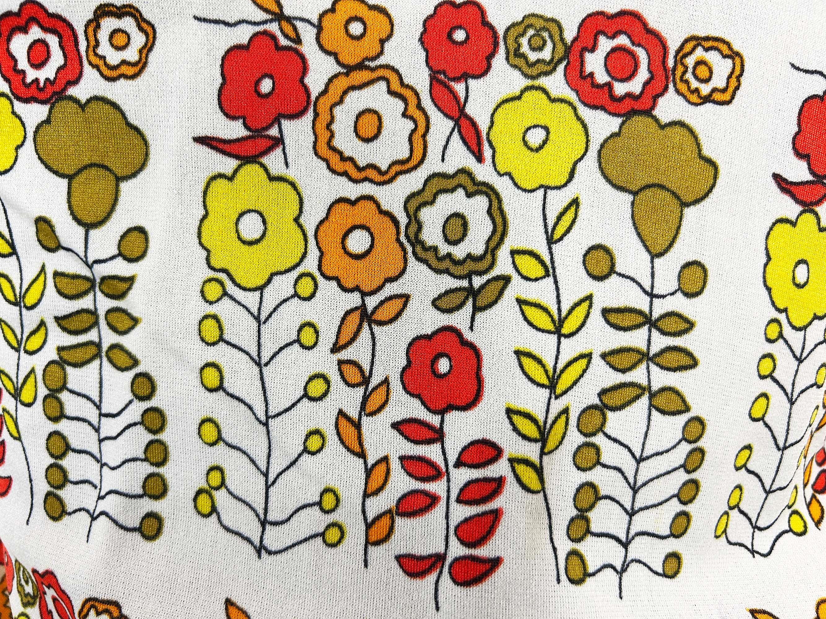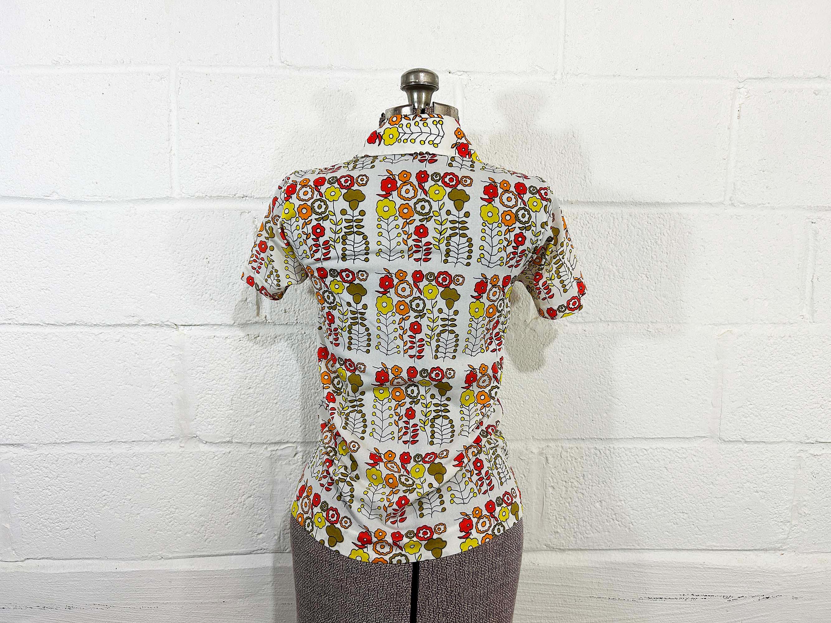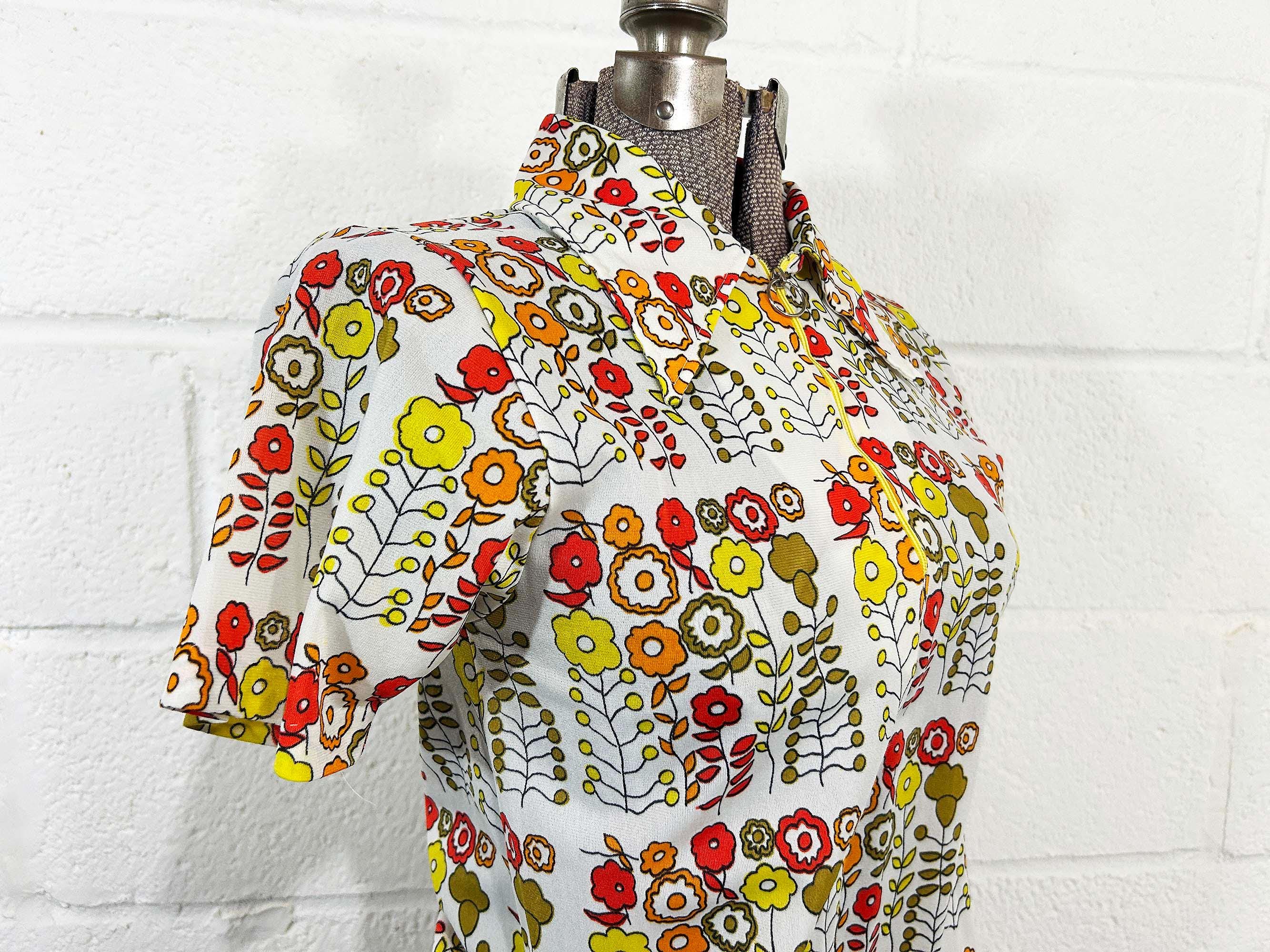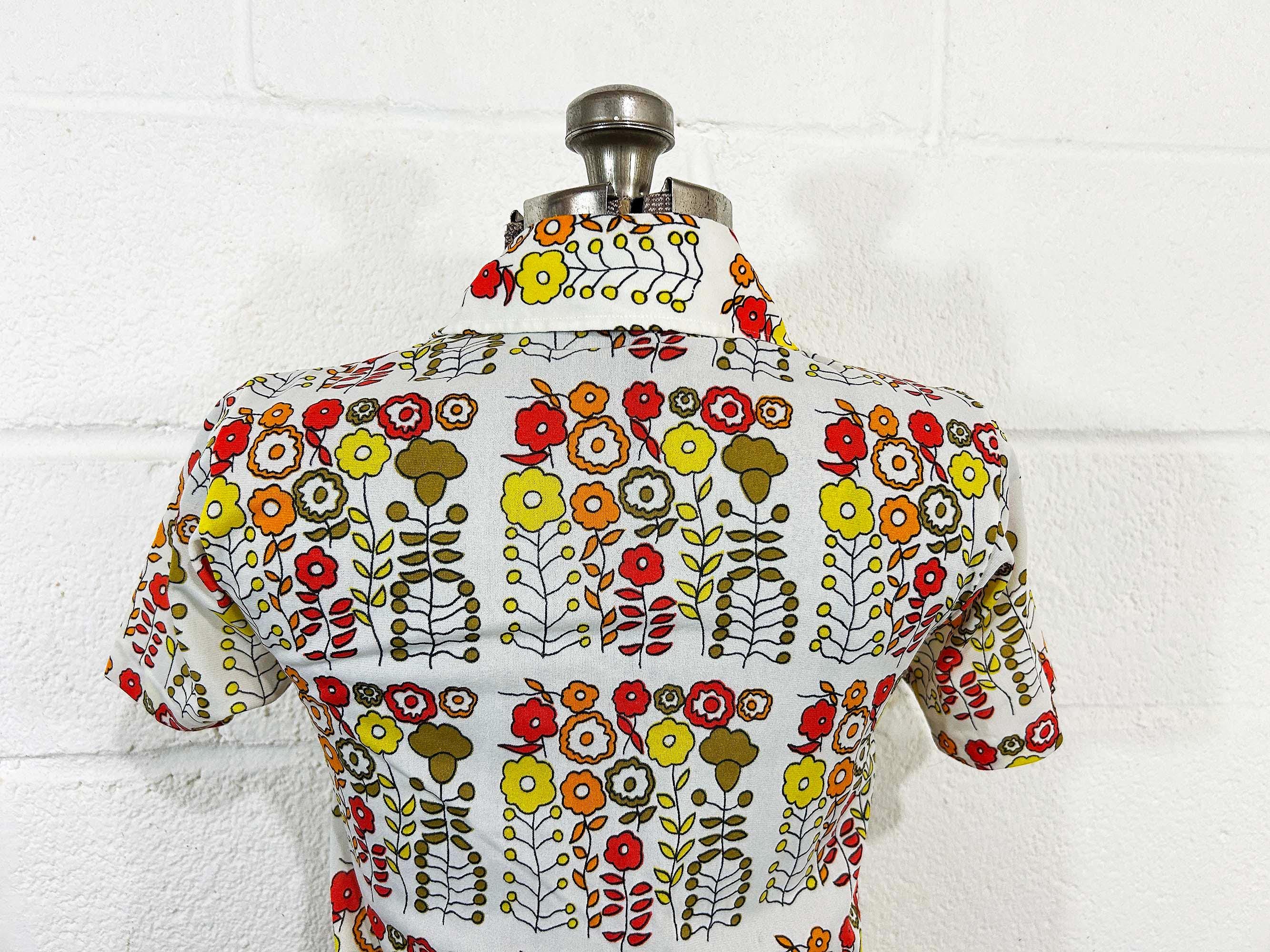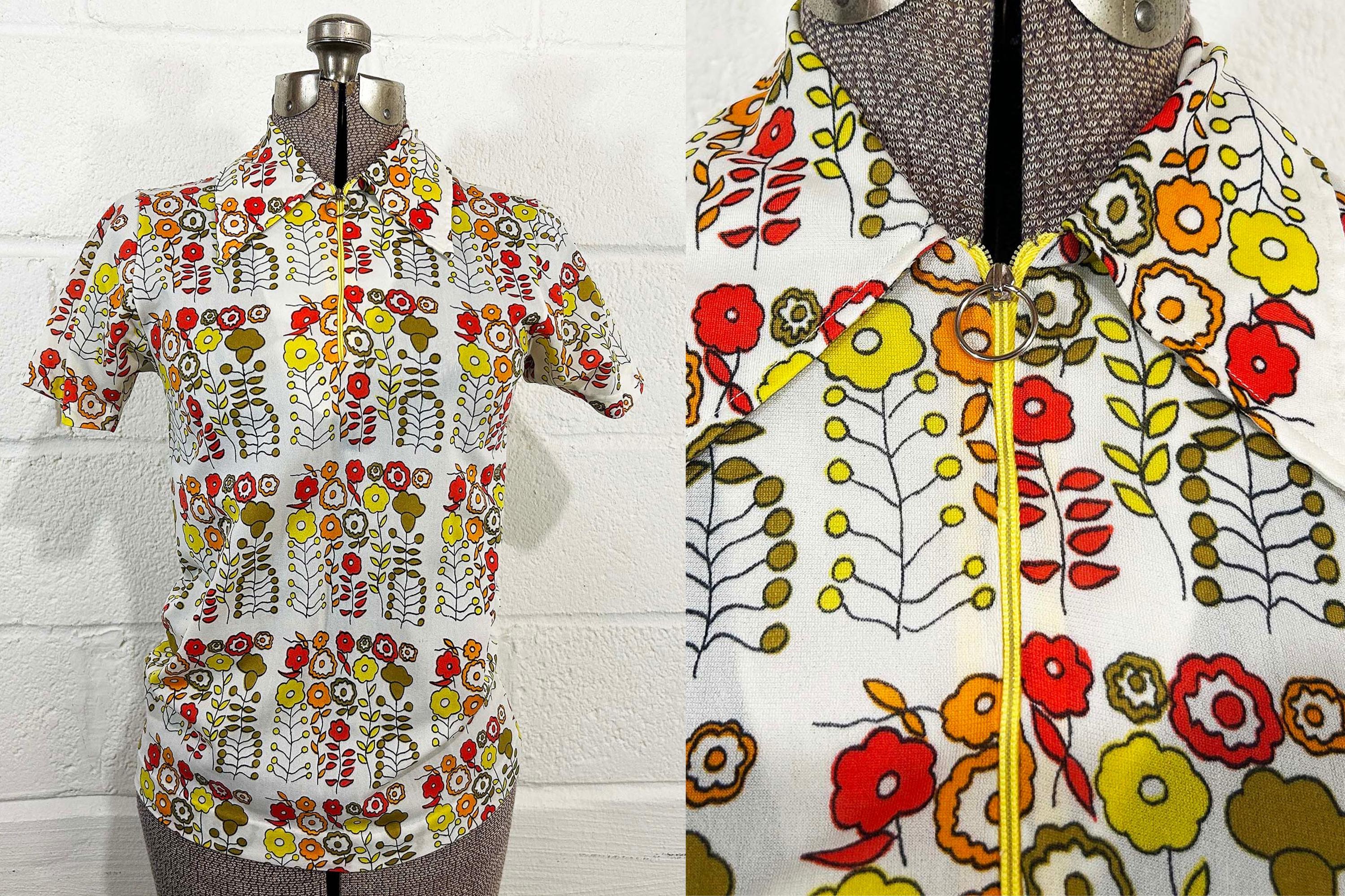 Vintage 1960s mod floral top with short sleeves. In great condition with no significant flaws. It has a o-ring half zip front and collar. Fabric has slight stretch.