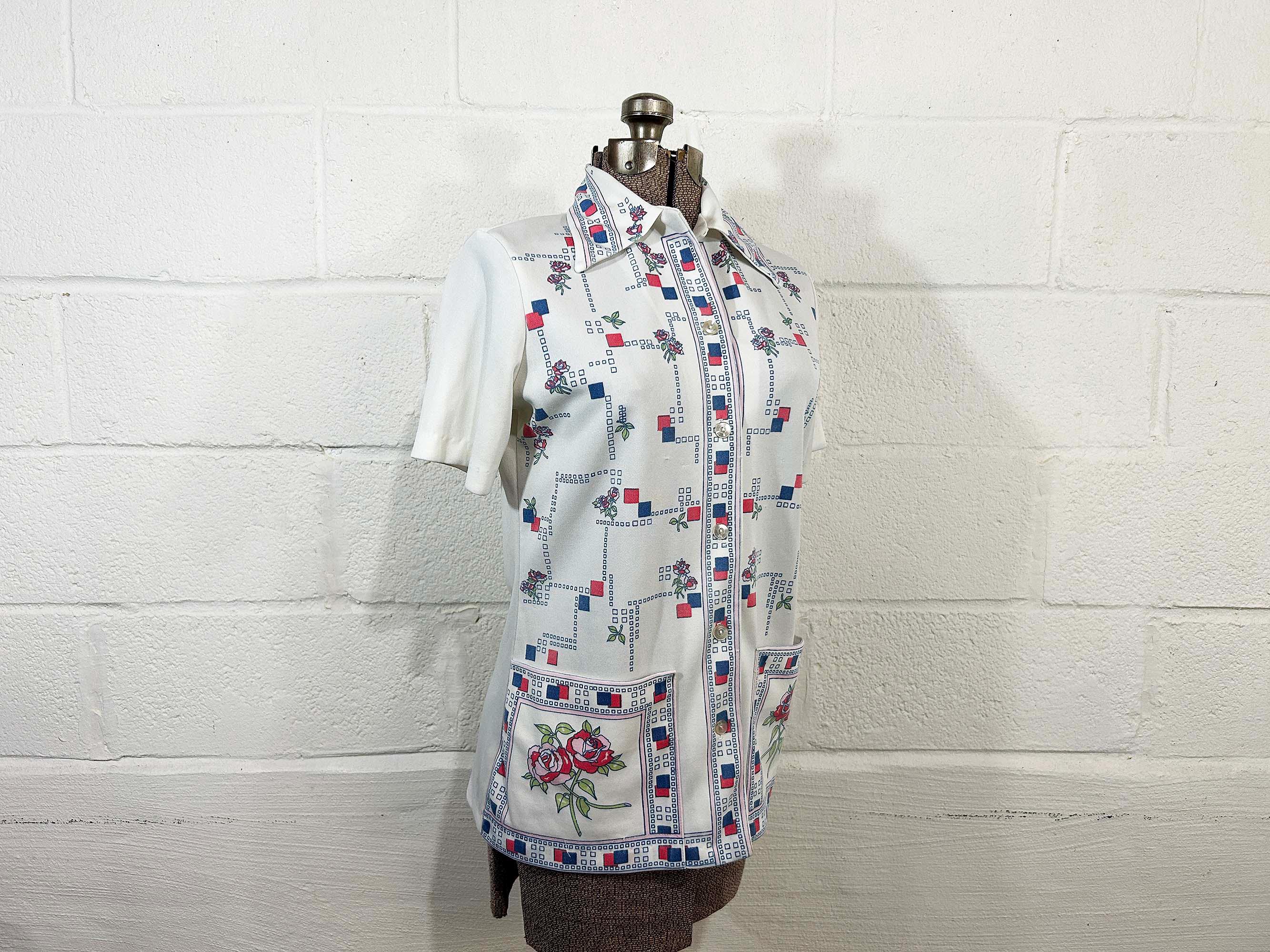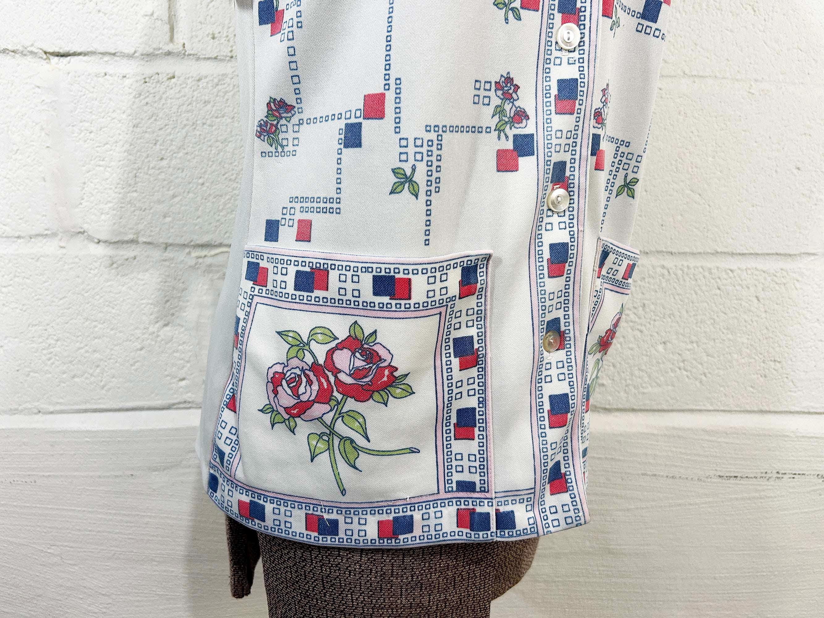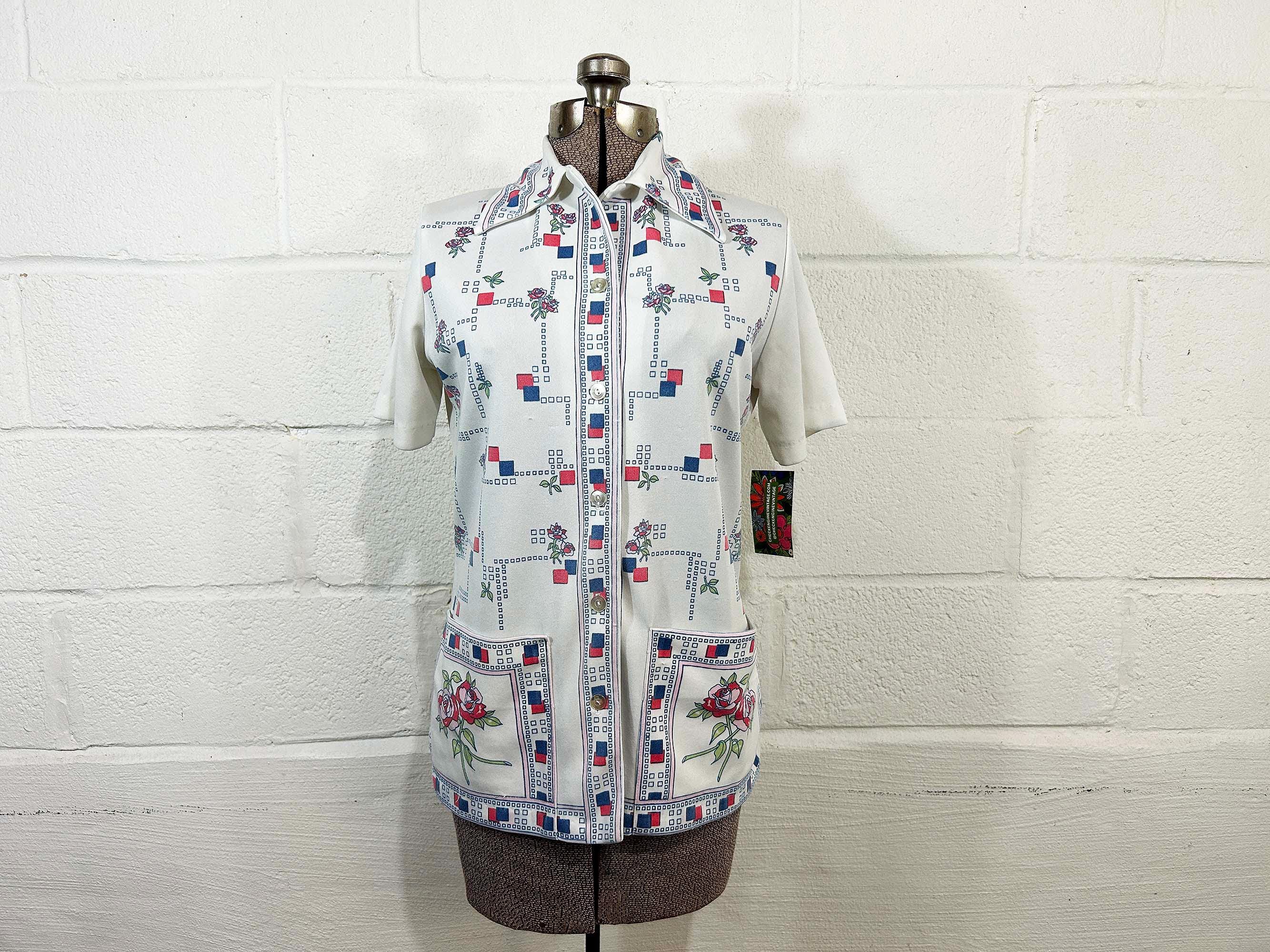 True vintage button front short sleeved shirt. Collar and two large front patch pockets. There is some fading on the design - please be sure to inspect all photos closely. Fabric has slight stretch.