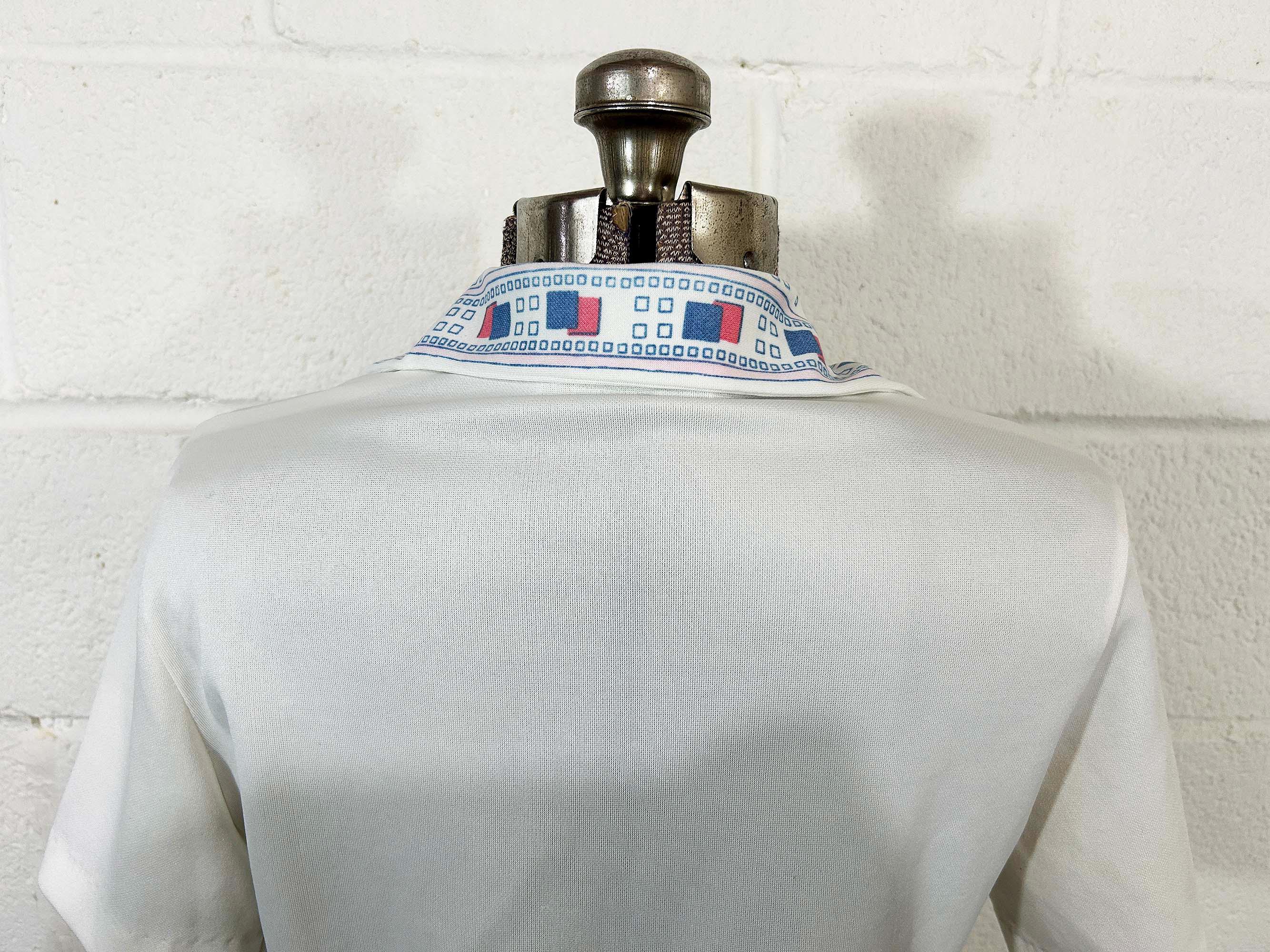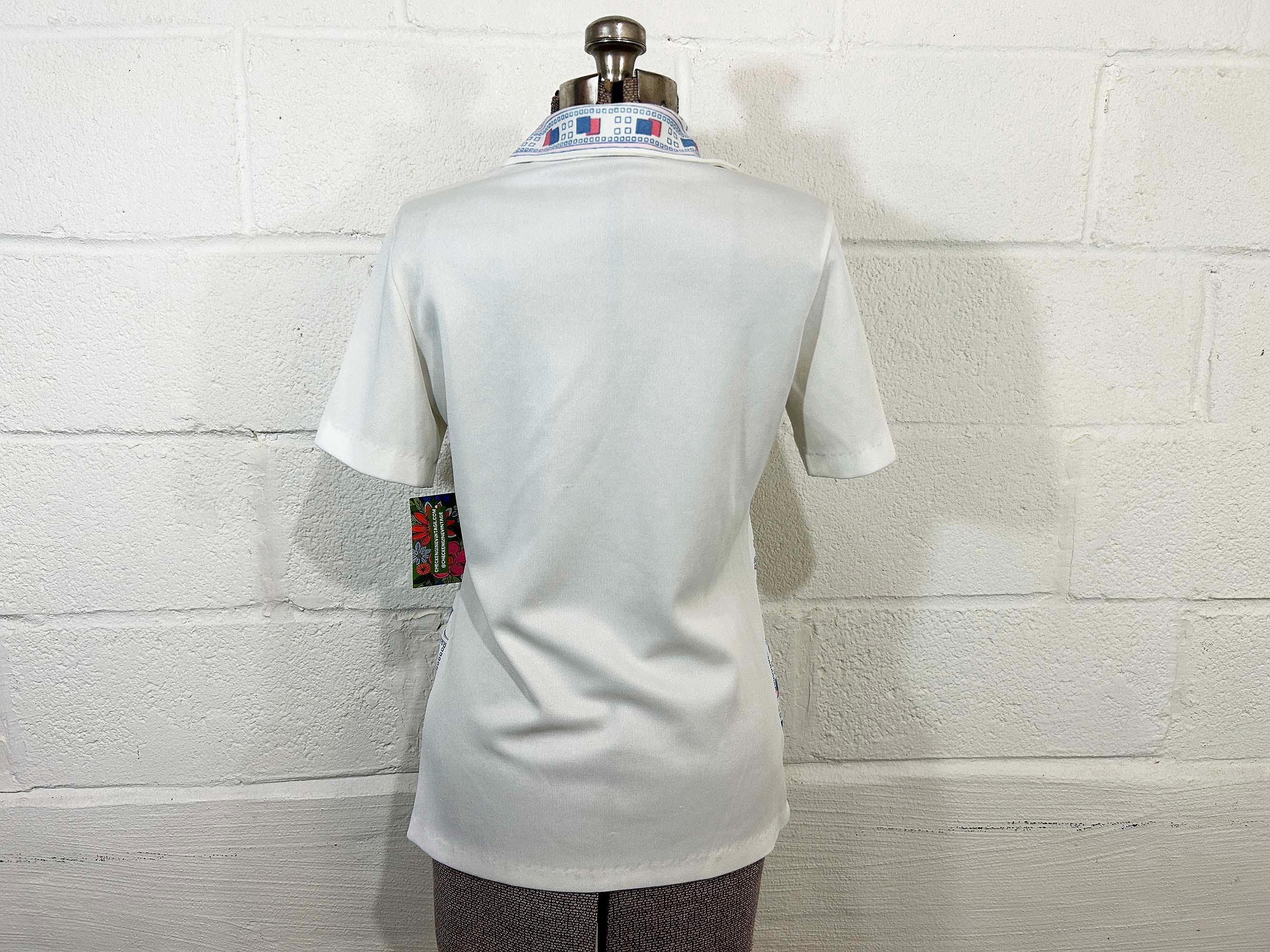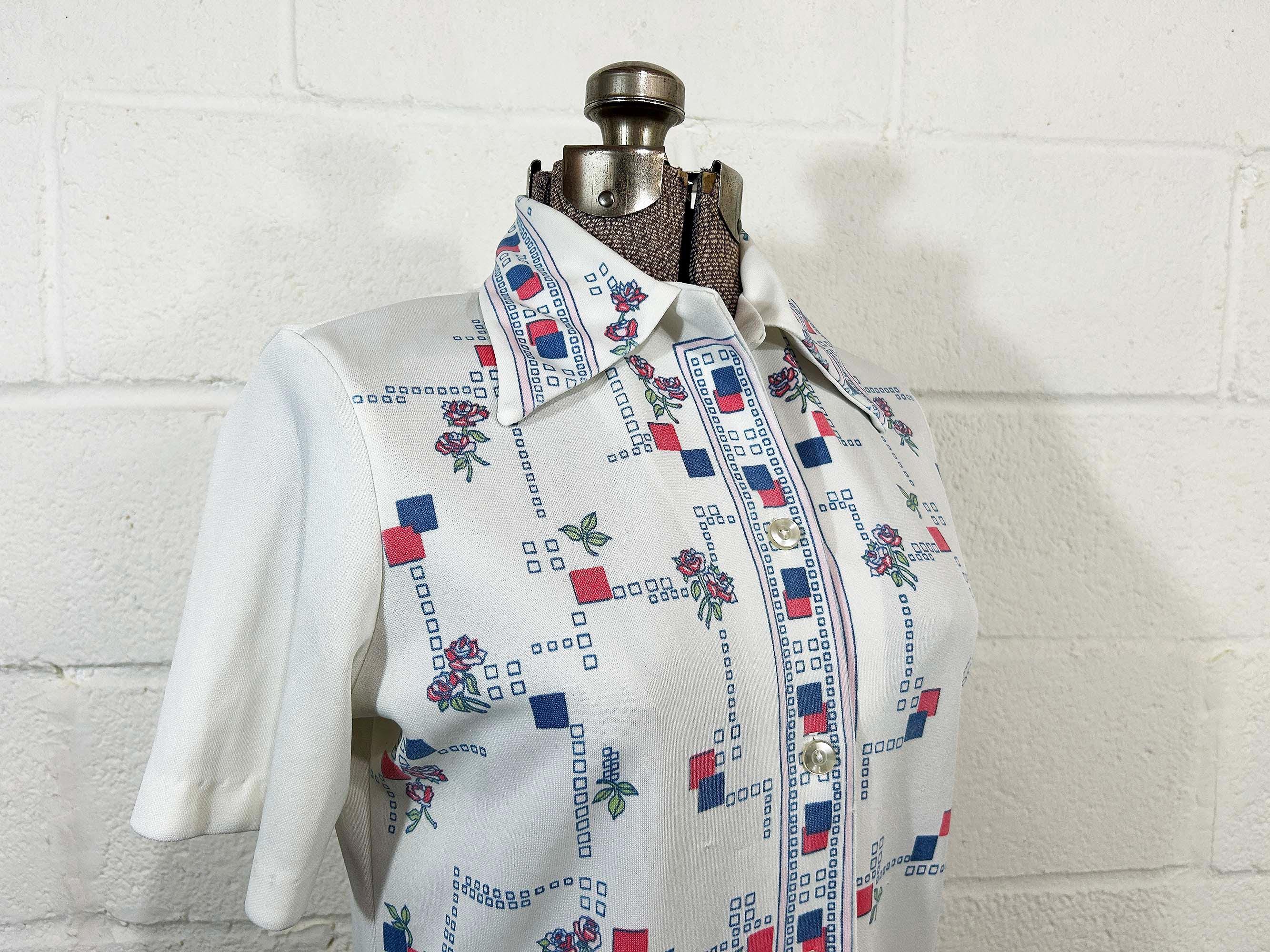 True vintage button front short sleeved shirt. Collar and two large front patch pockets. There is some fading on the design - please be sure to inspect all photos closely. Fabric has slight stretch.