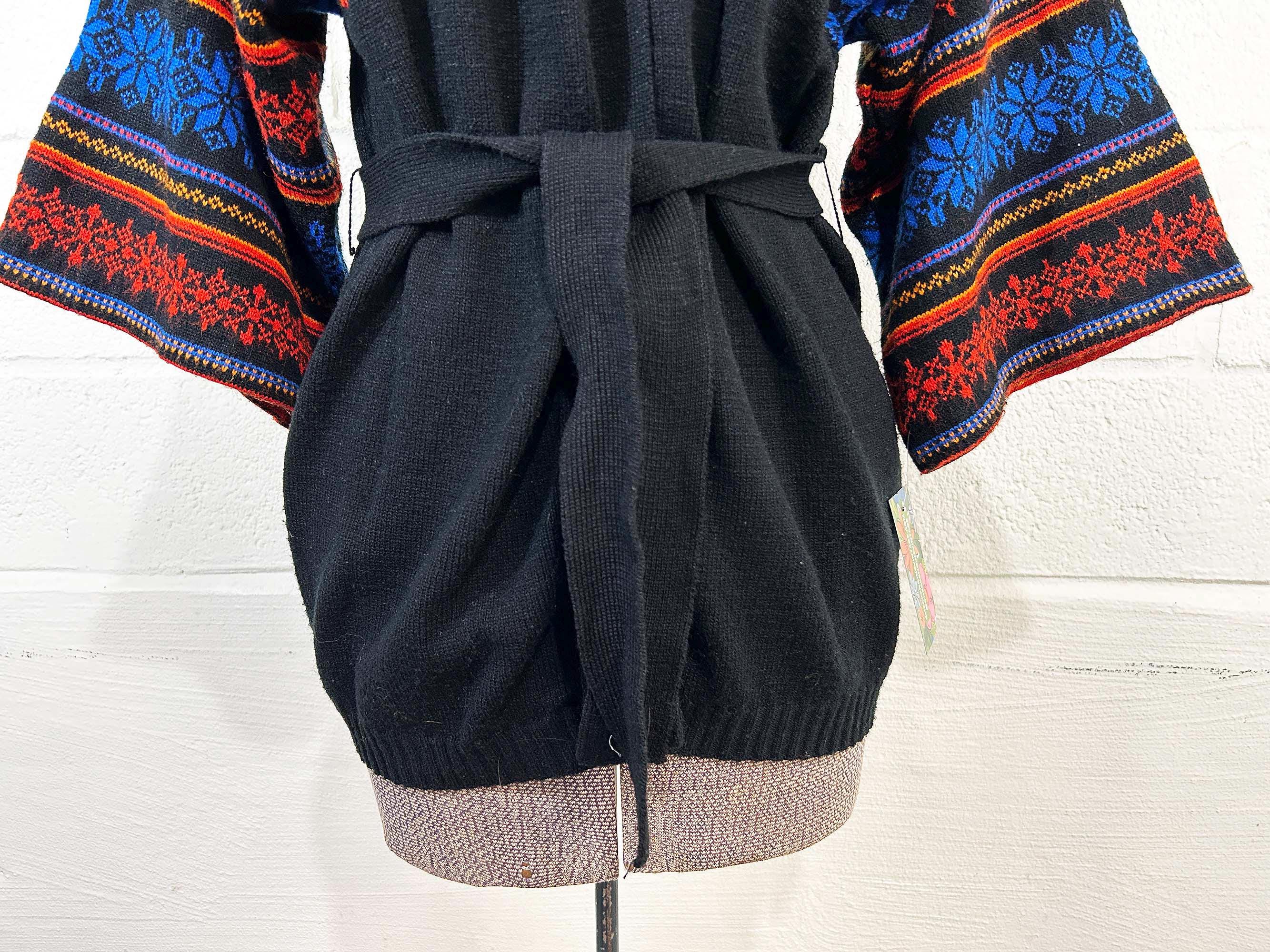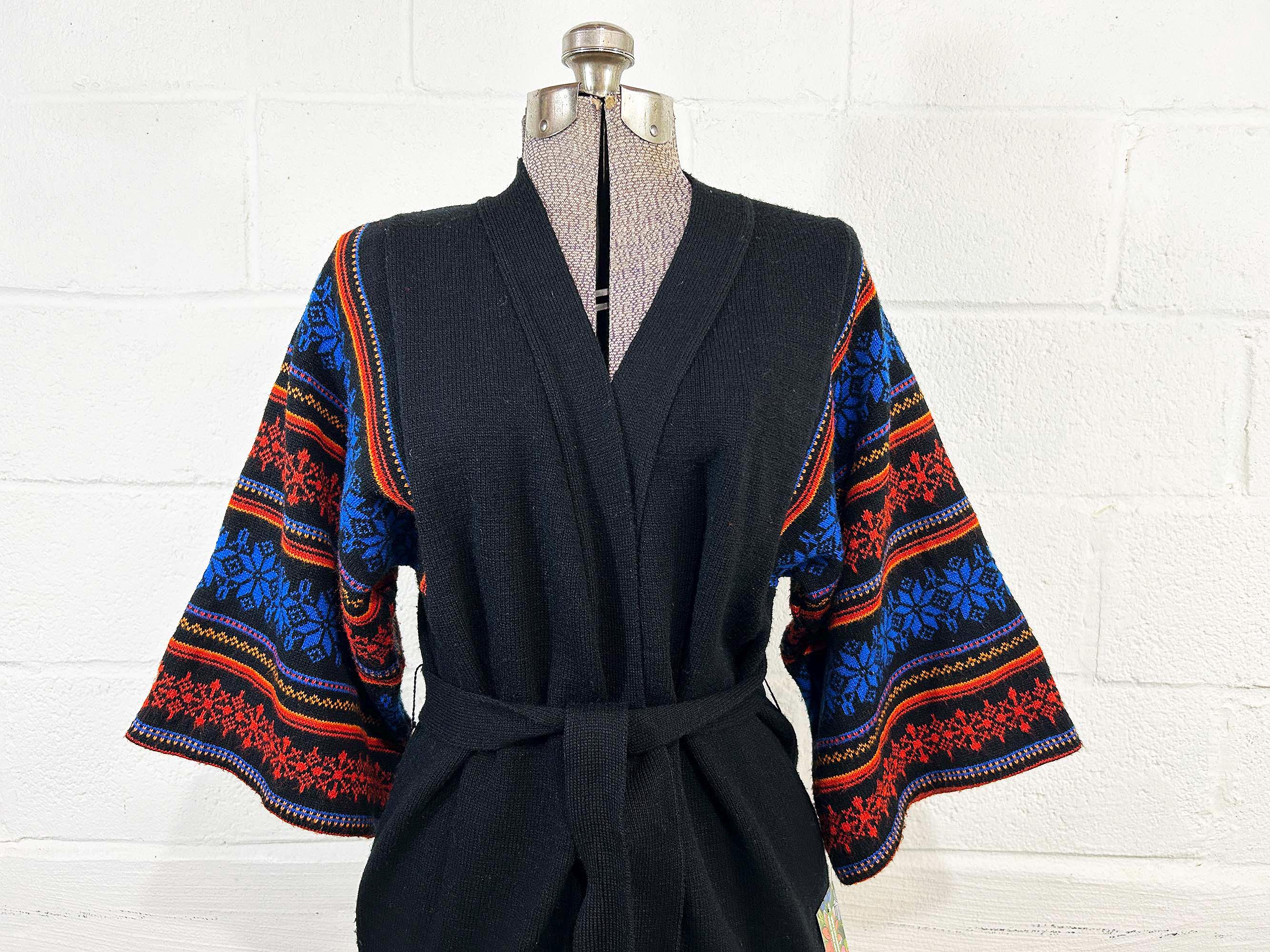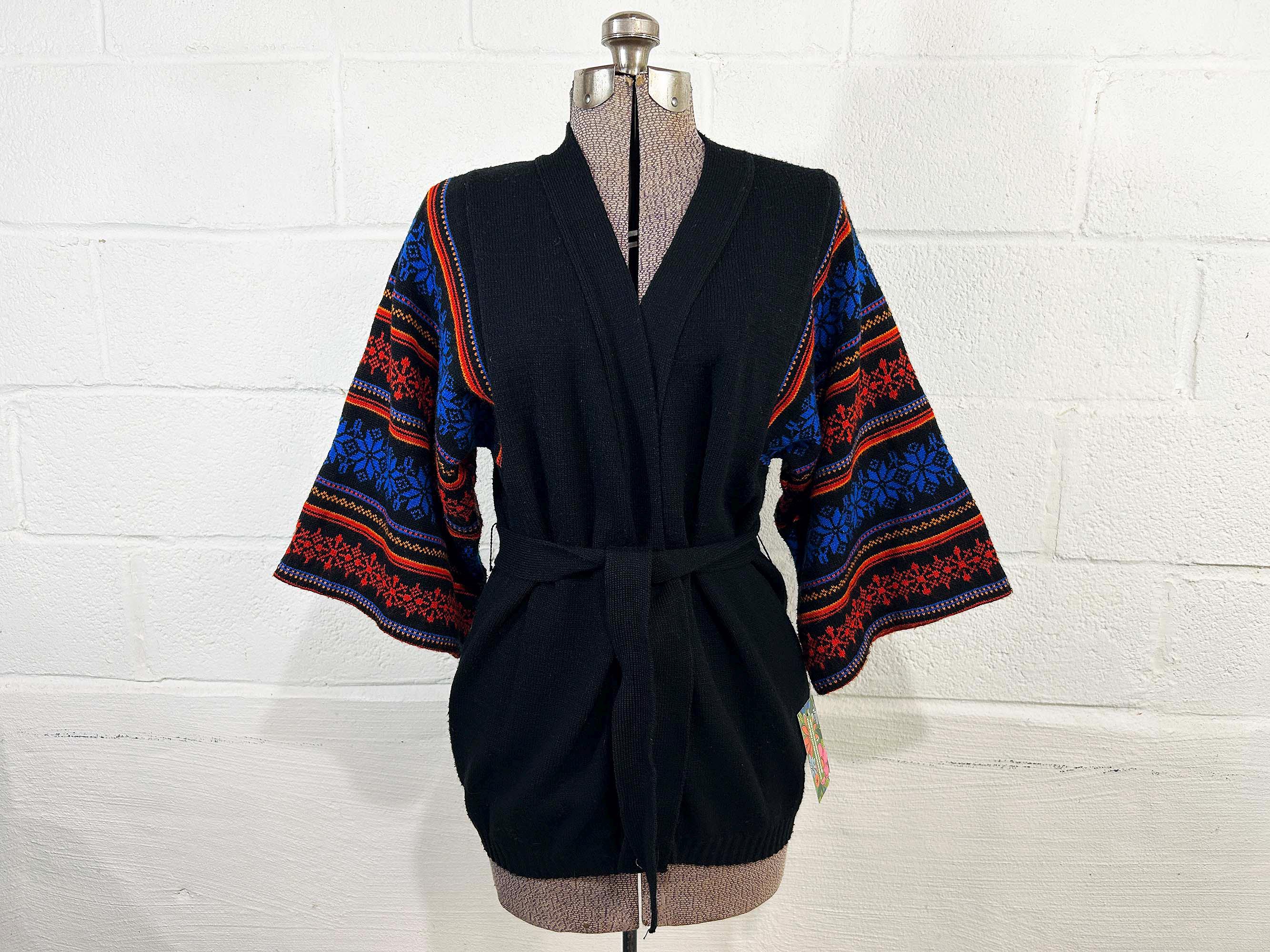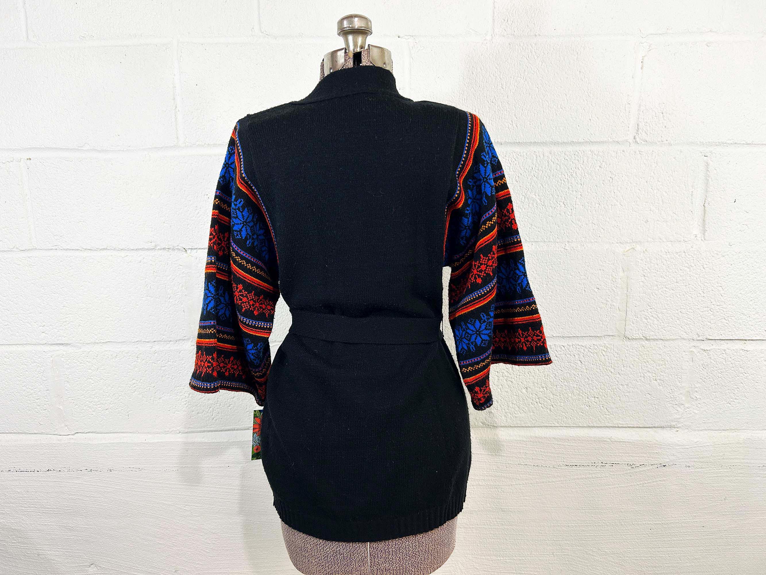 Super cute fair isle open front belted sweater. In good vintage condition - there is some pilling and a few snags which is to be expected for a vintage knit item. Open front with a v neck tie belt at the waist. Sleeves flare a bit and are about 3/4 length. Fabric has stretch.