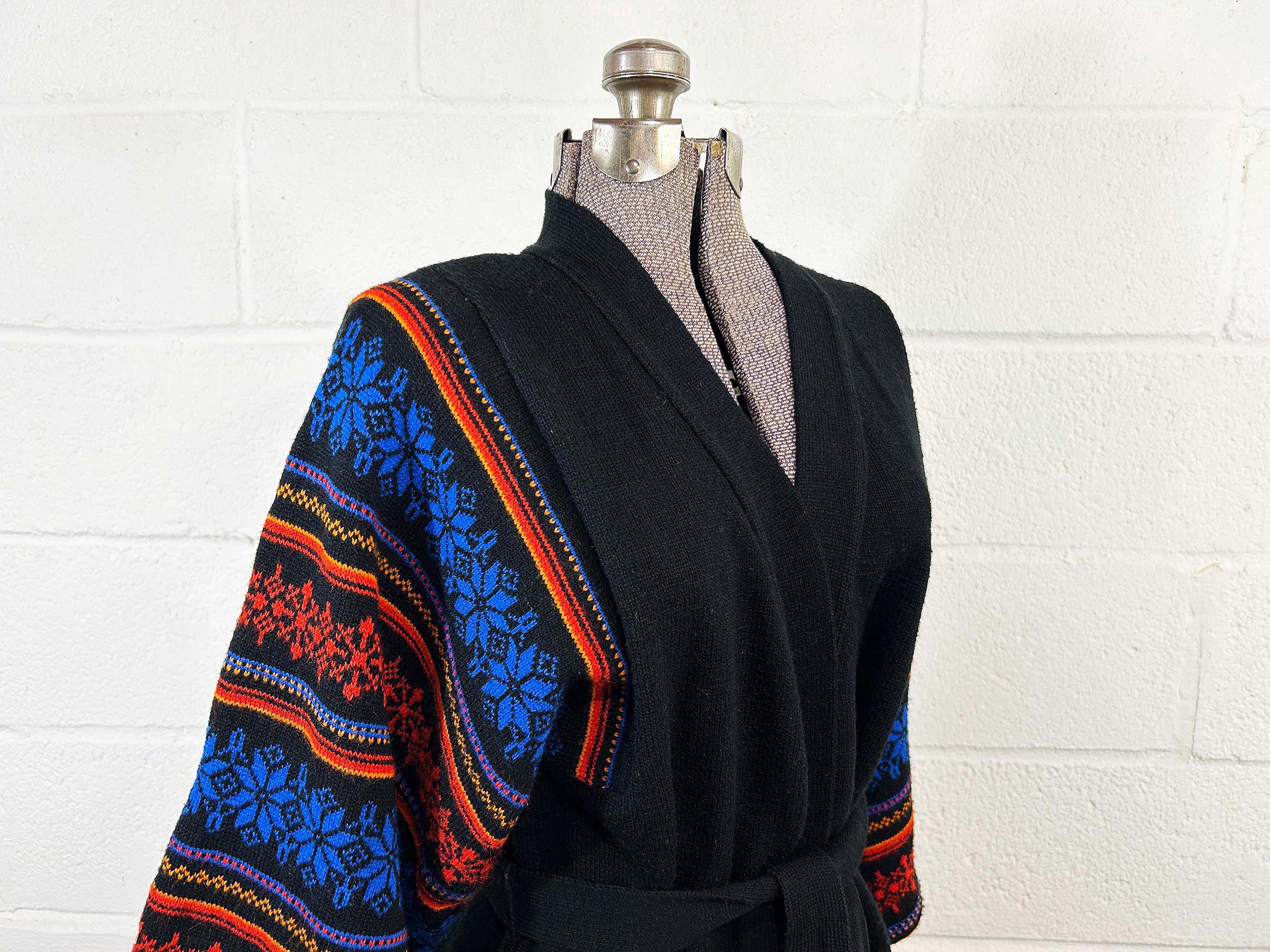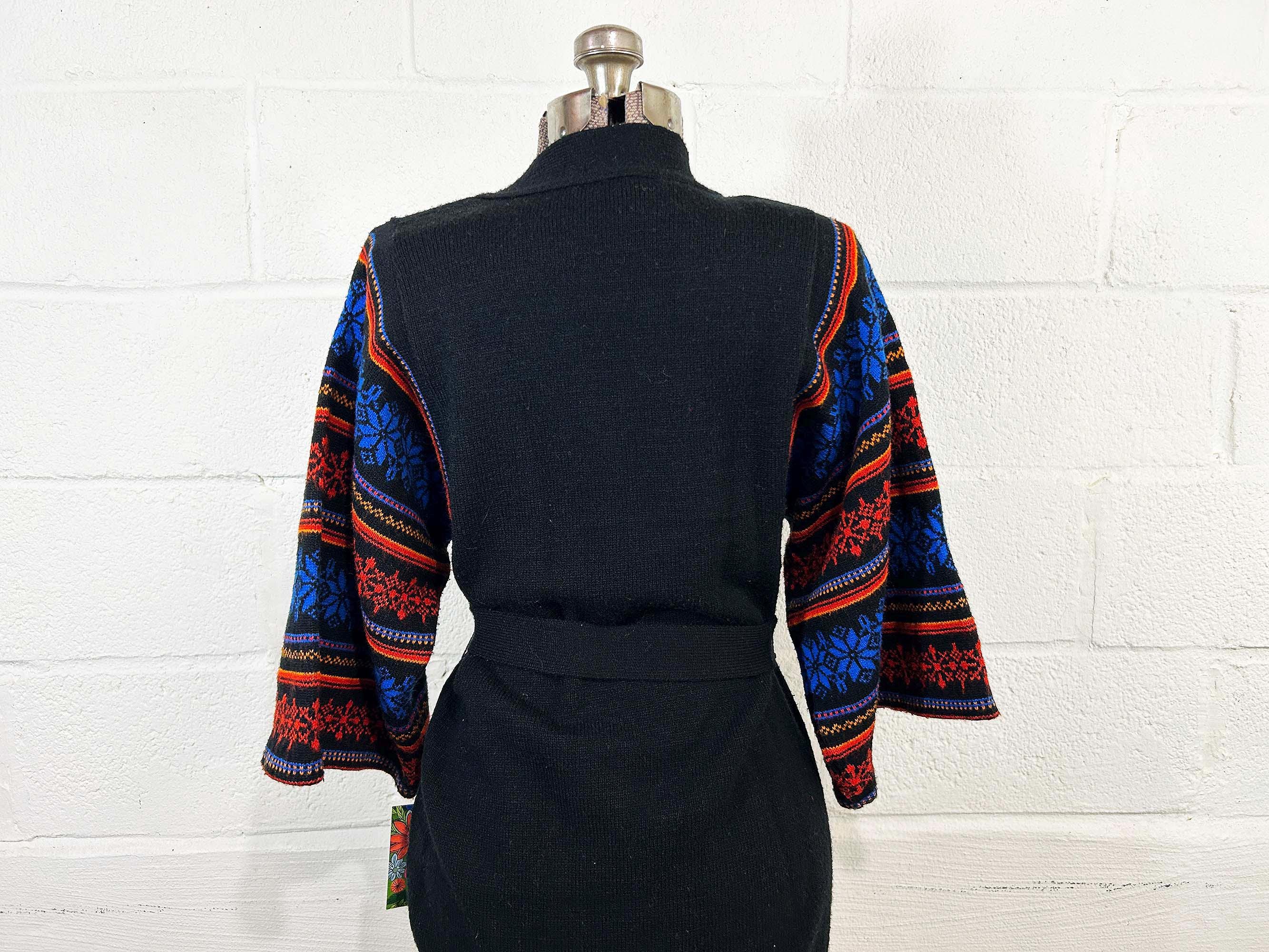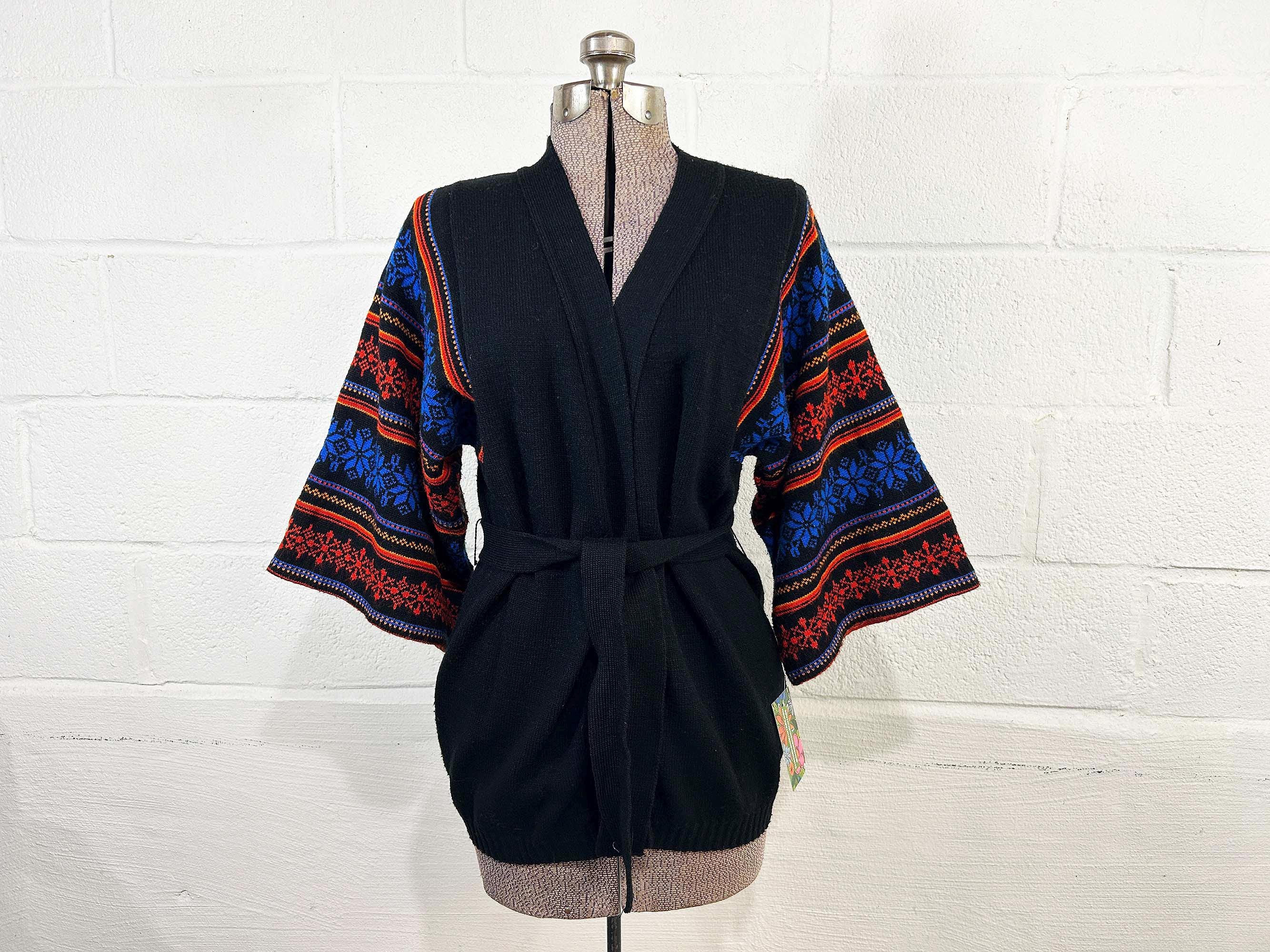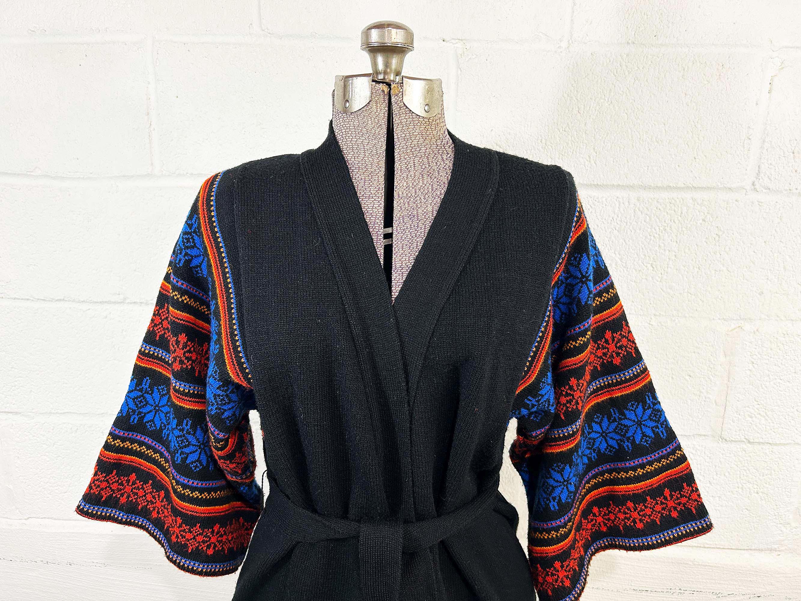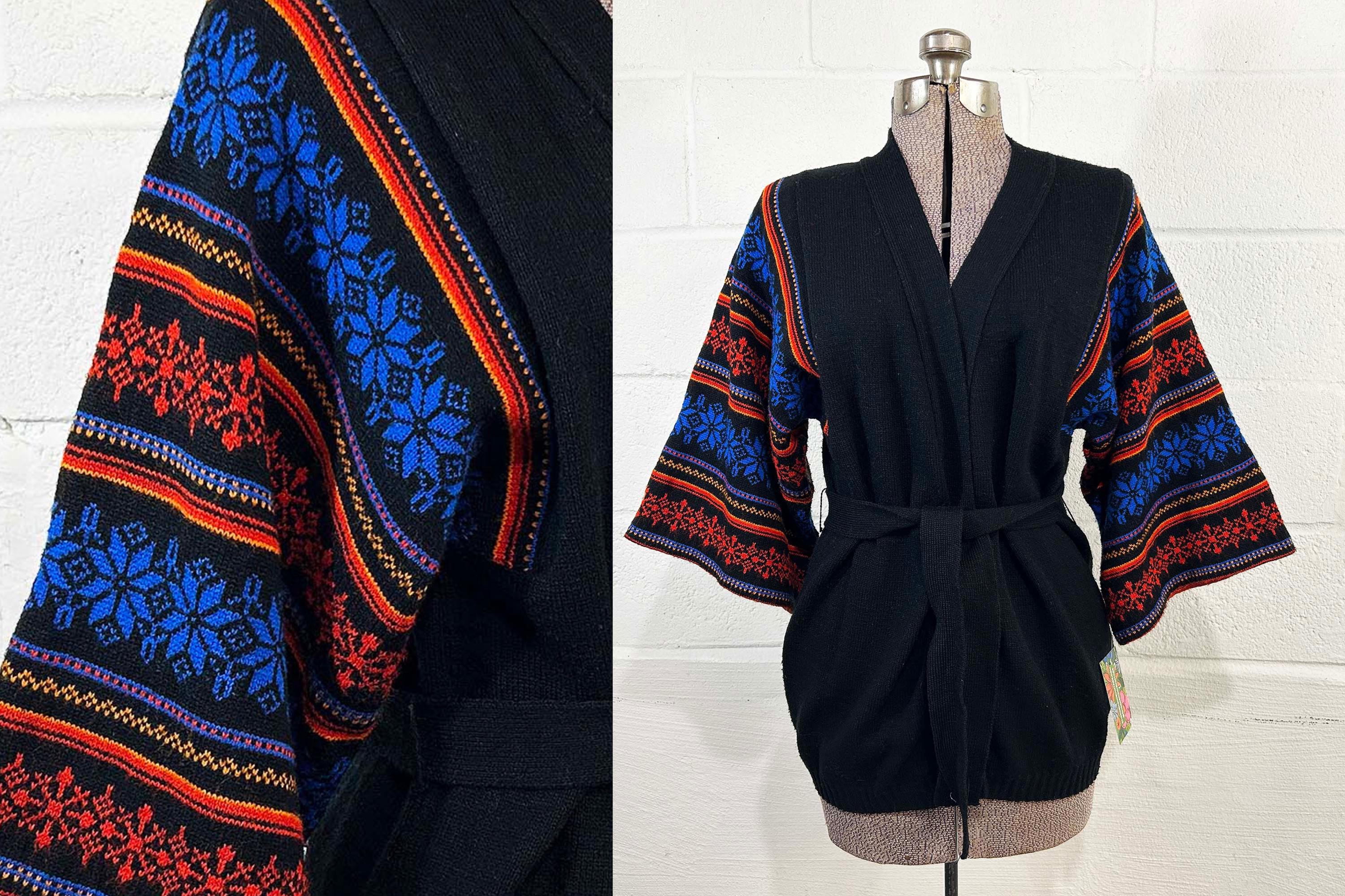 Super cute fair isle open front belted sweater. In good vintage condition - there is some pilling and a few snags which is to be expected for a vintage knit item. Open front with a v neck tie belt at the waist. Sleeves flare a bit and are about 3/4 length. Fabric has stretch.