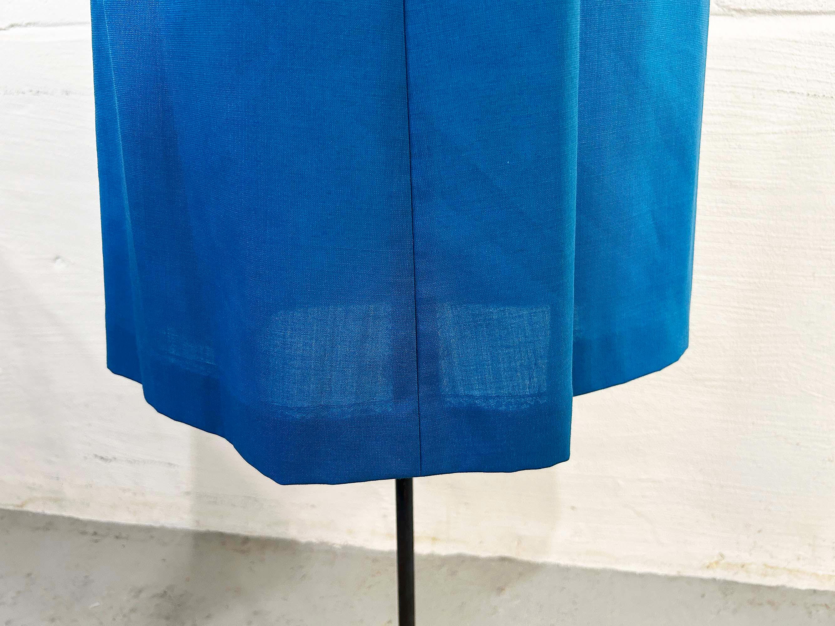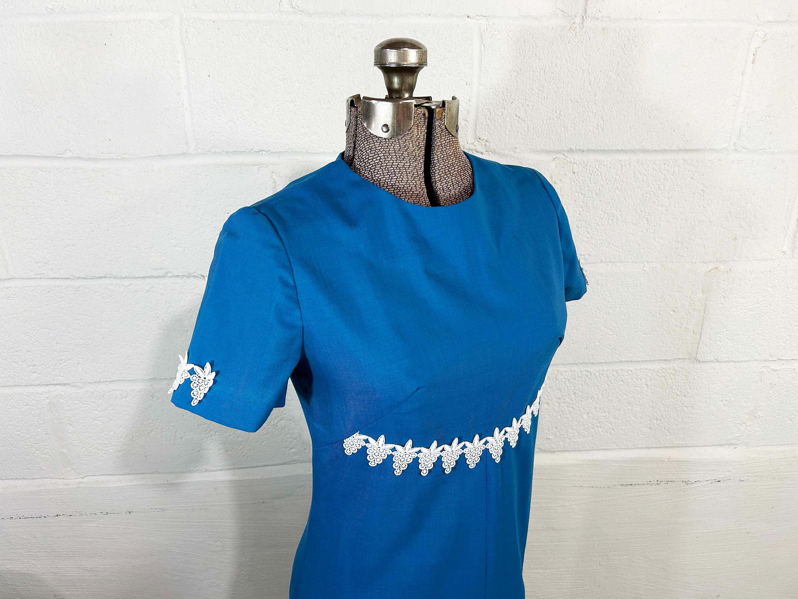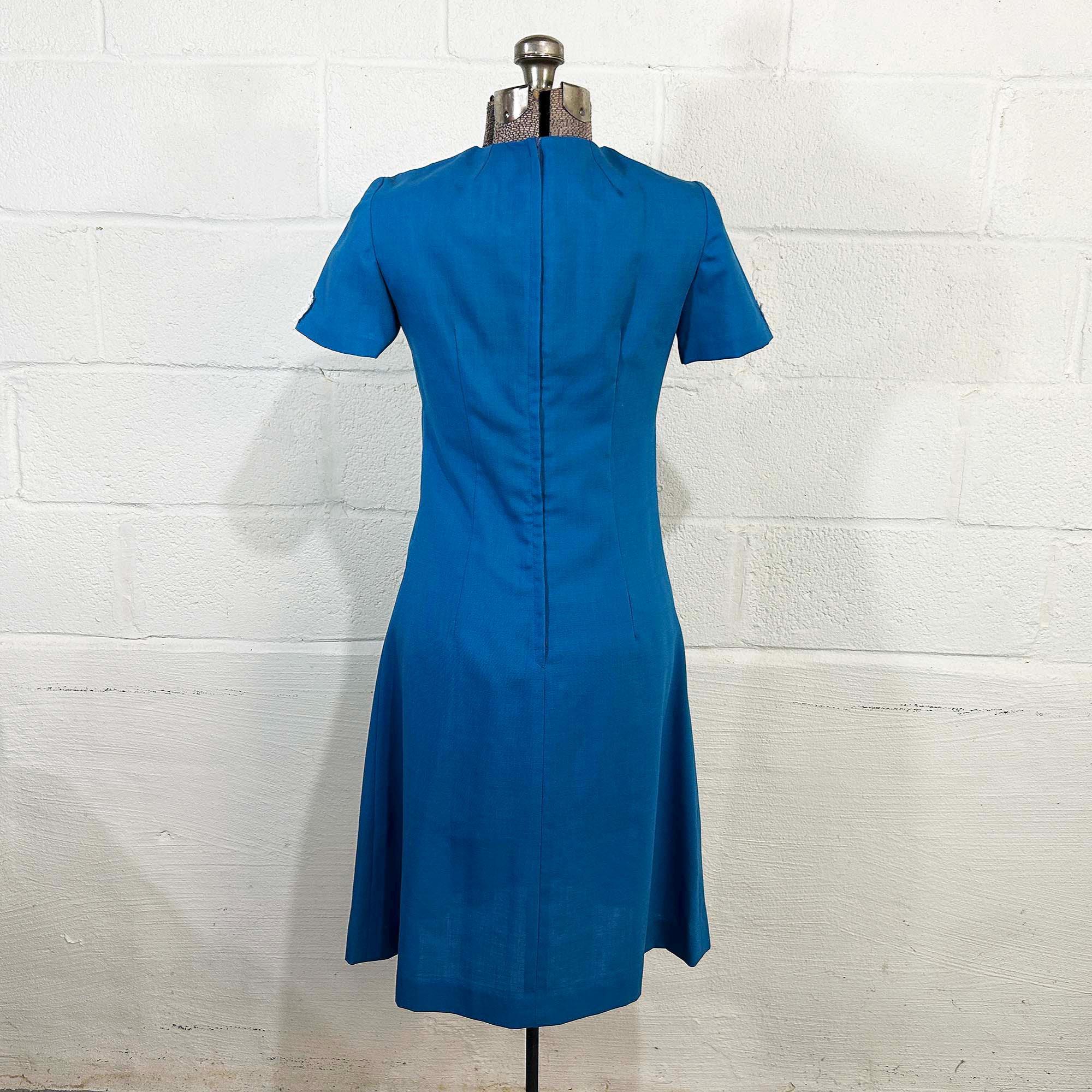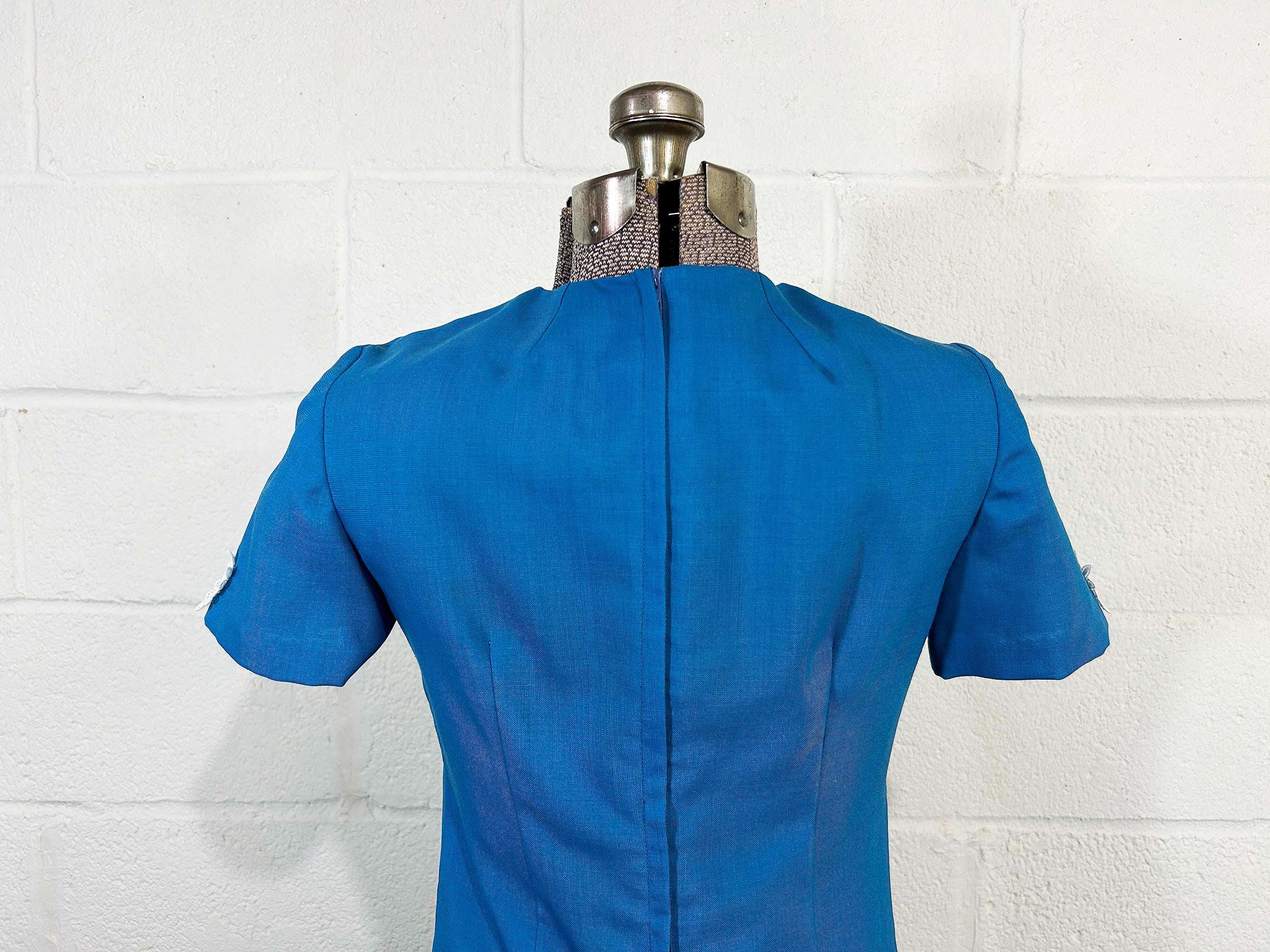Incredible 60s dusty blue a-line dress. Short sleeves with zipper in the back. The fabric has no stretch. It is in excellent condition and appears to be handmade.