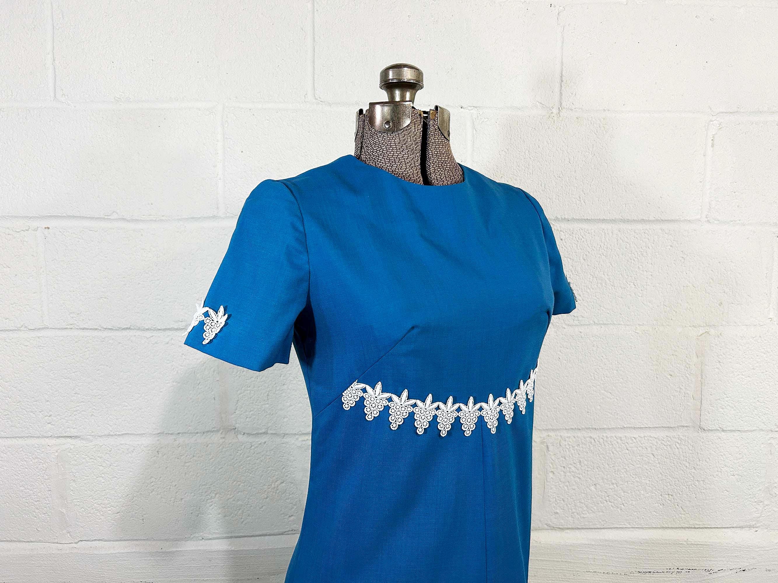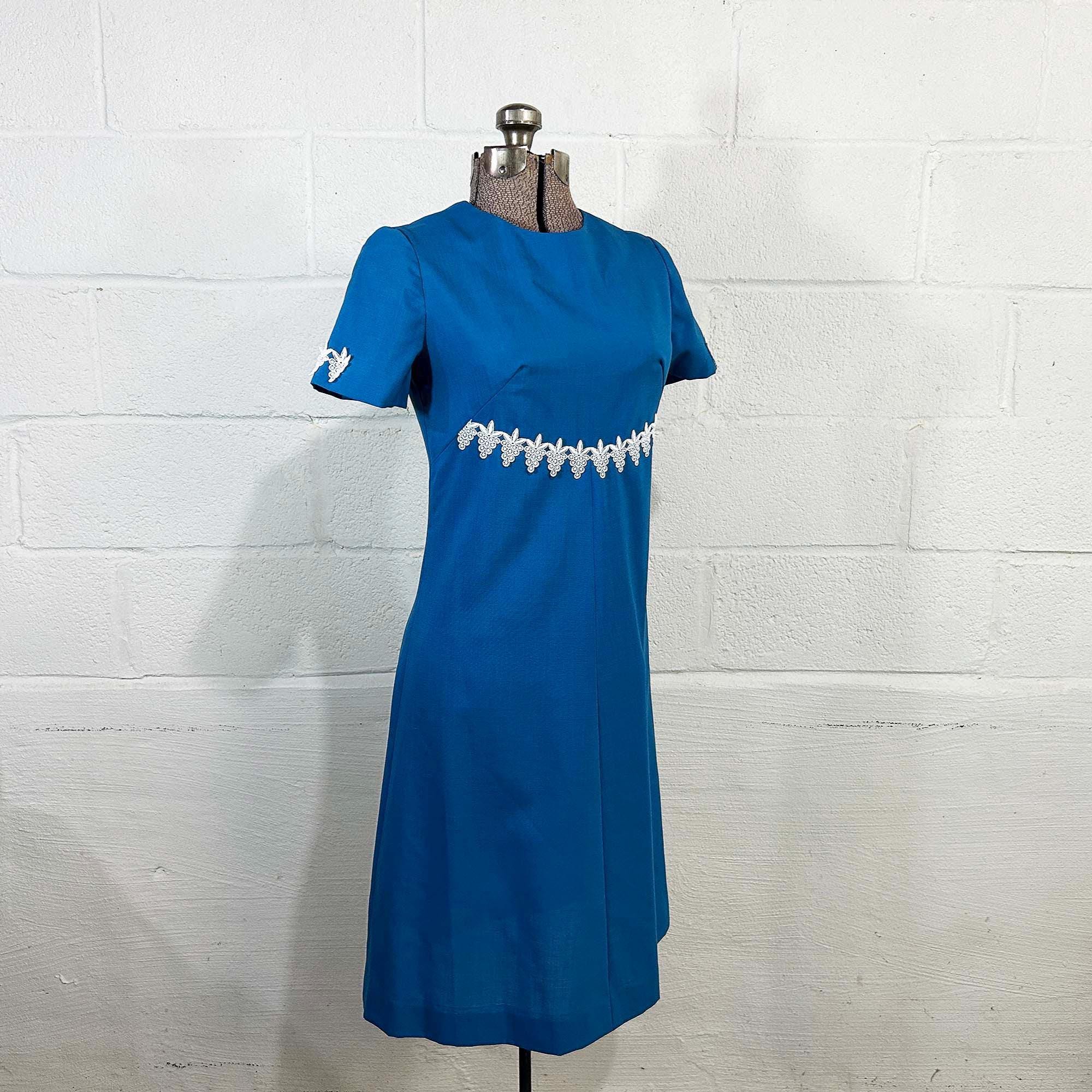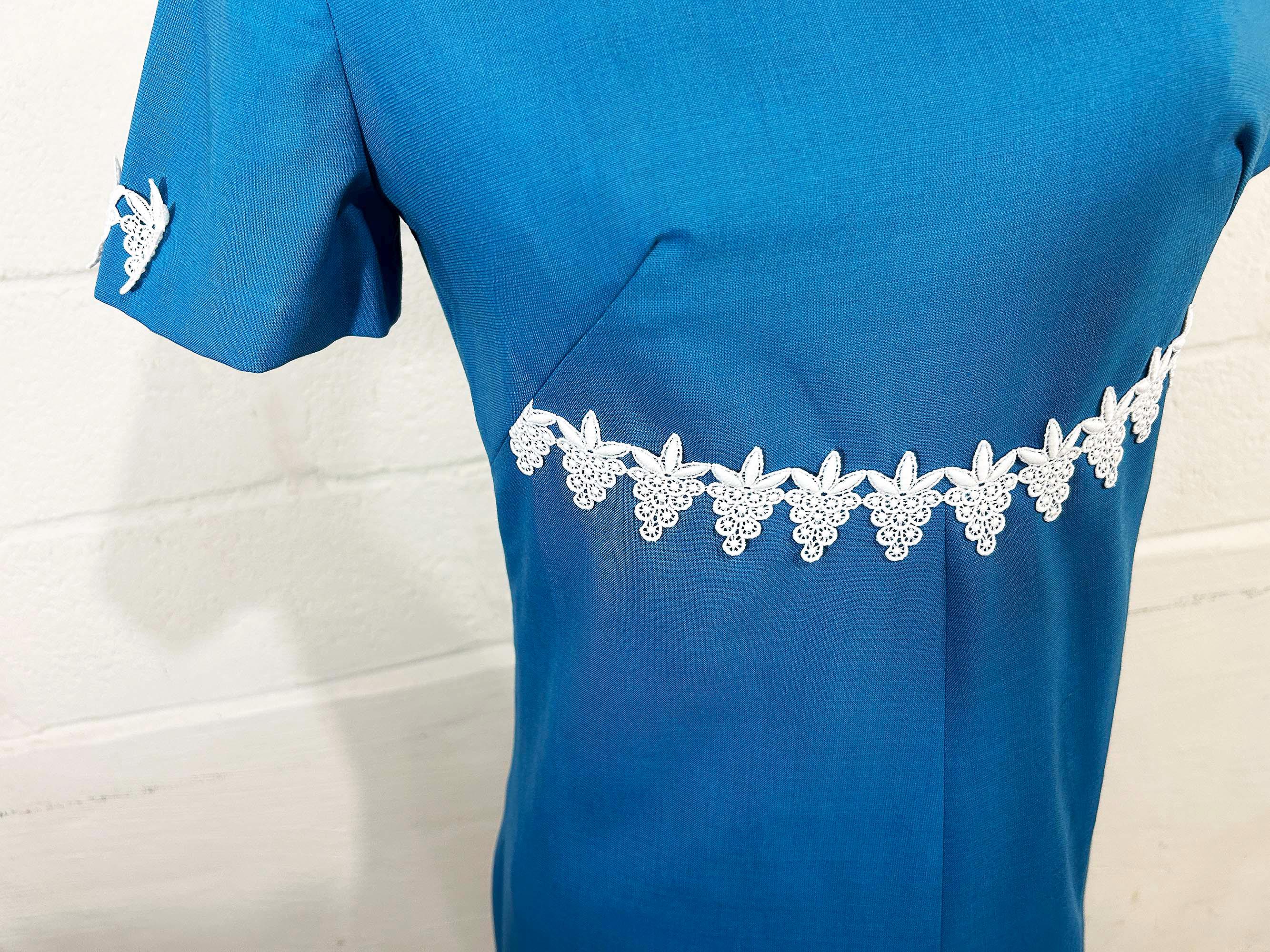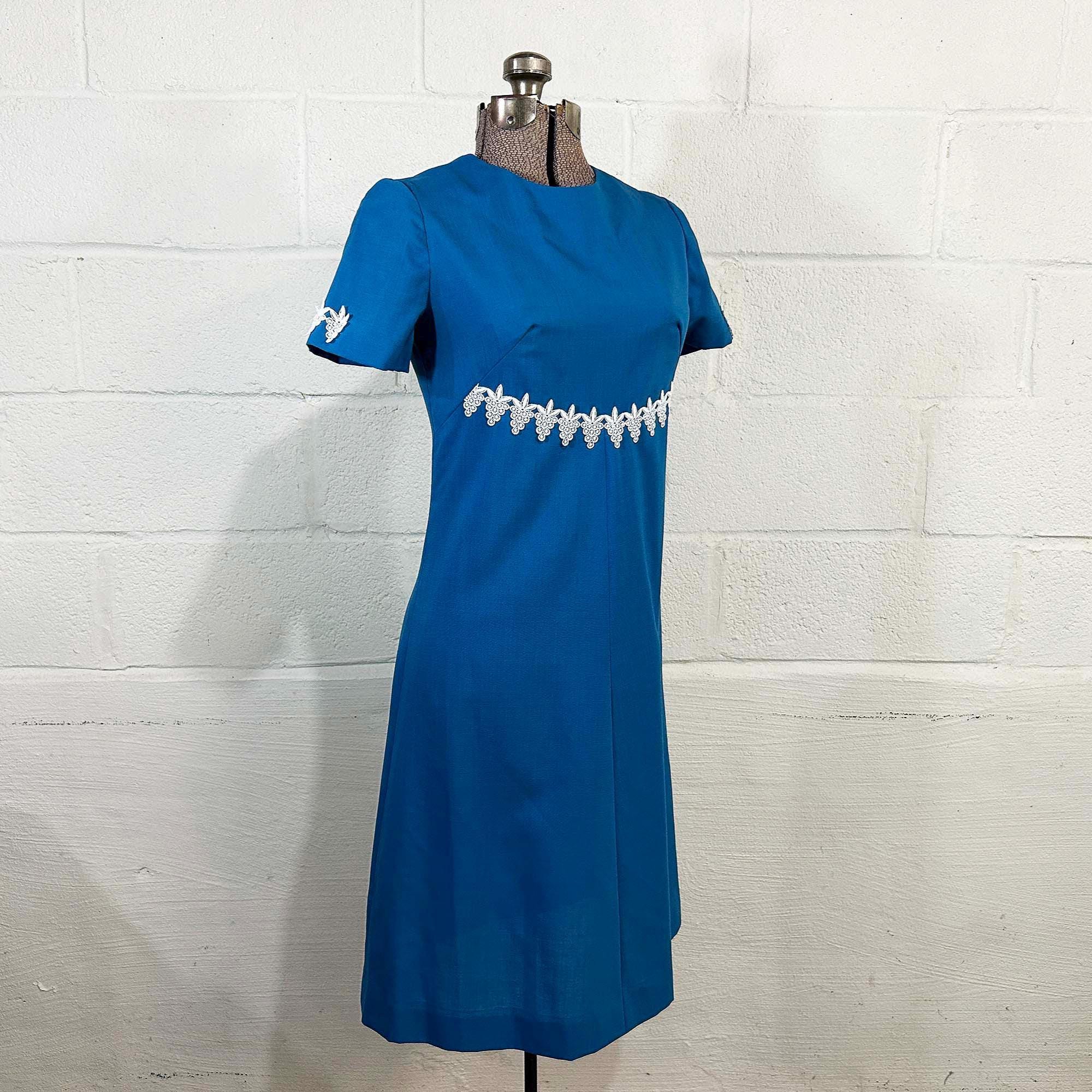 Incredible 60s dusty blue a-line dress. Short sleeves with zipper in the back. The fabric has no stretch. It is in excellent condition and appears to be handmade.