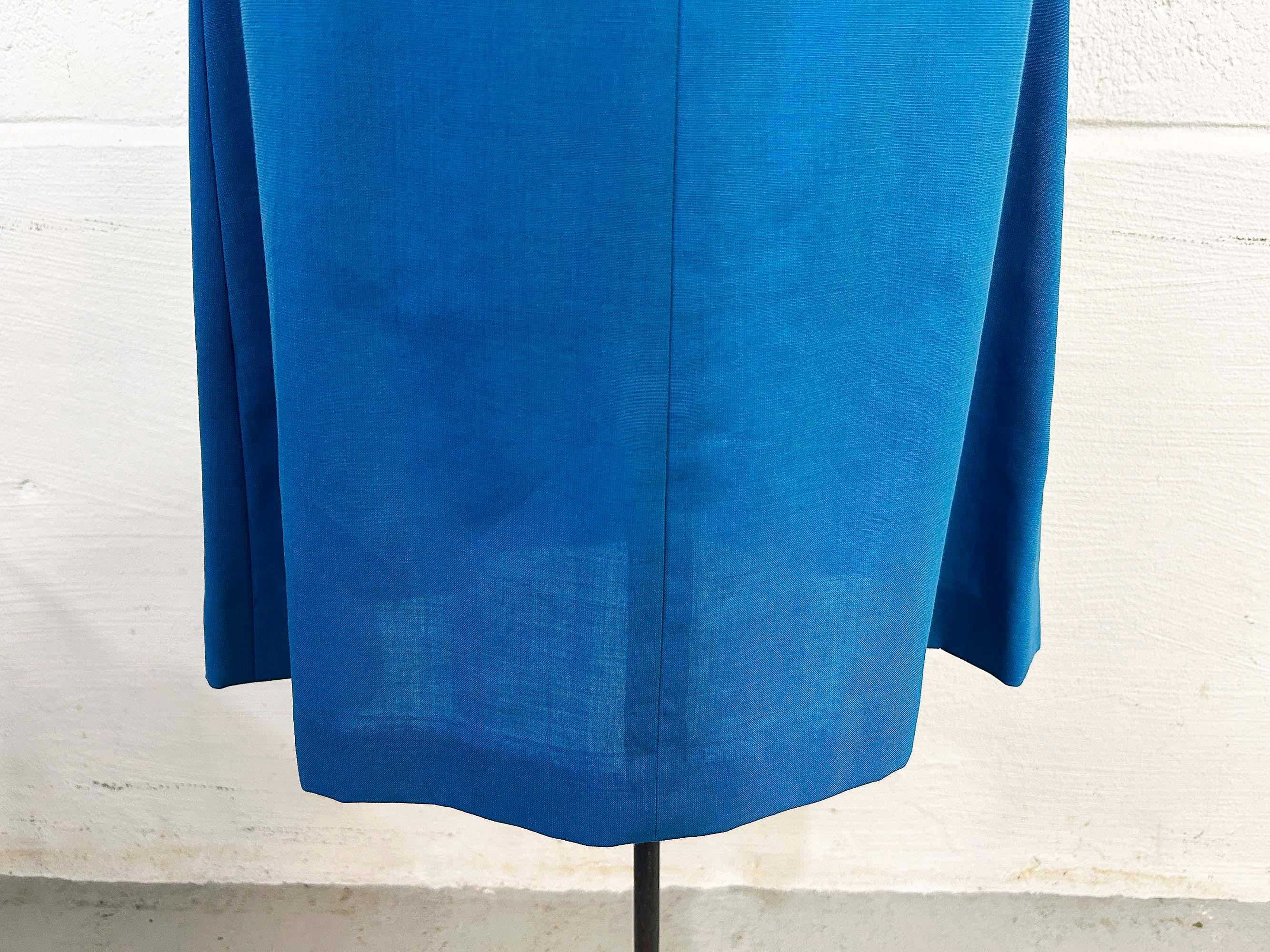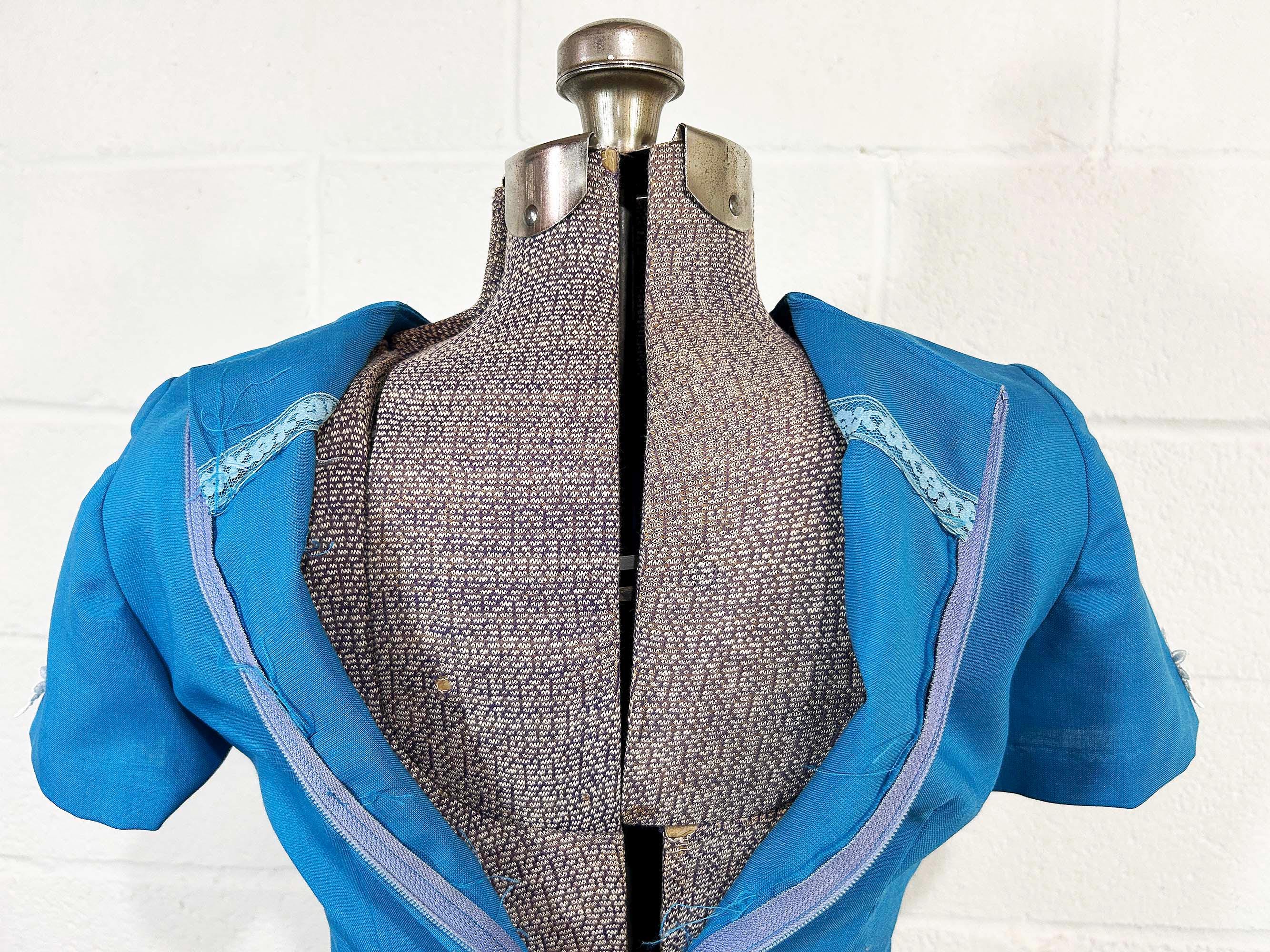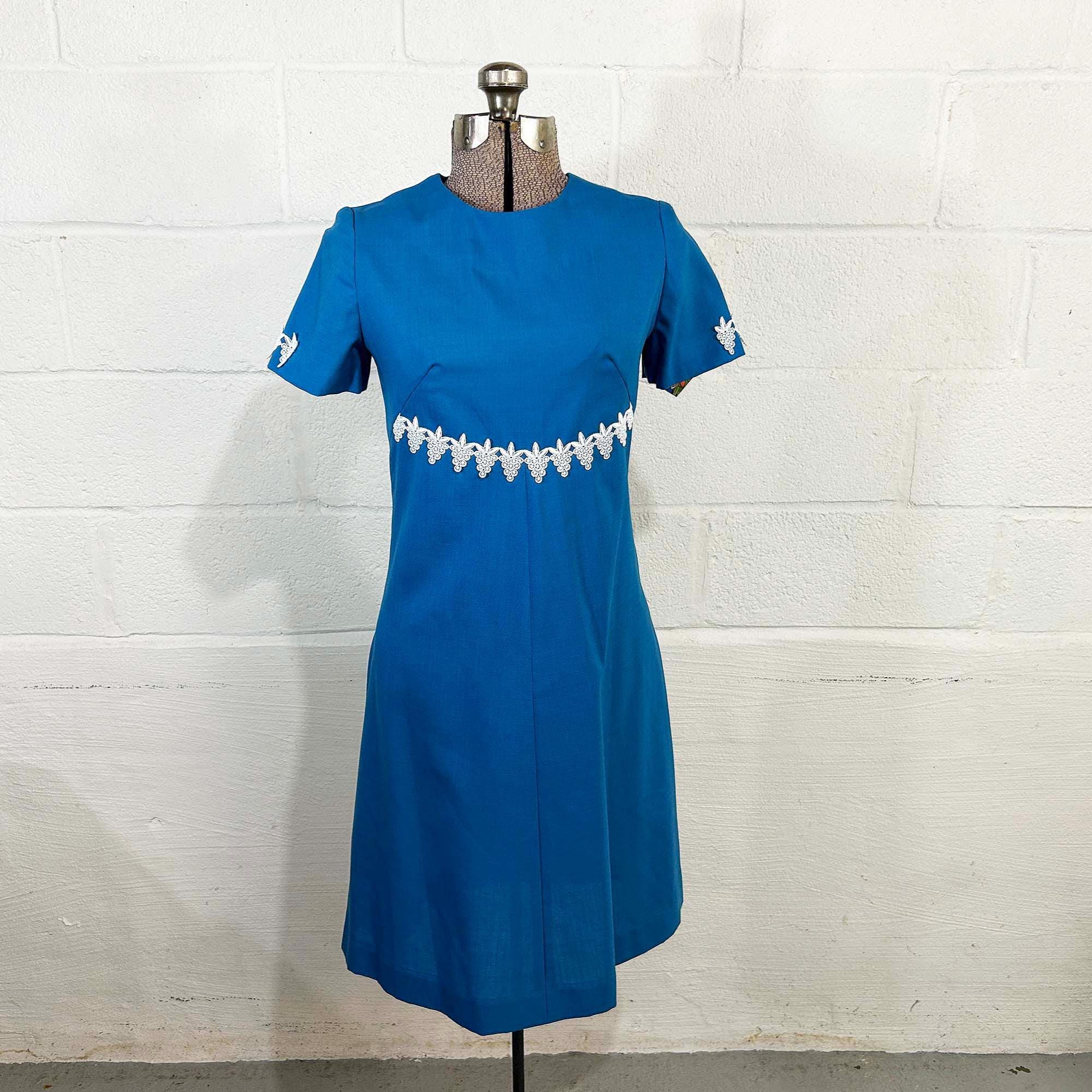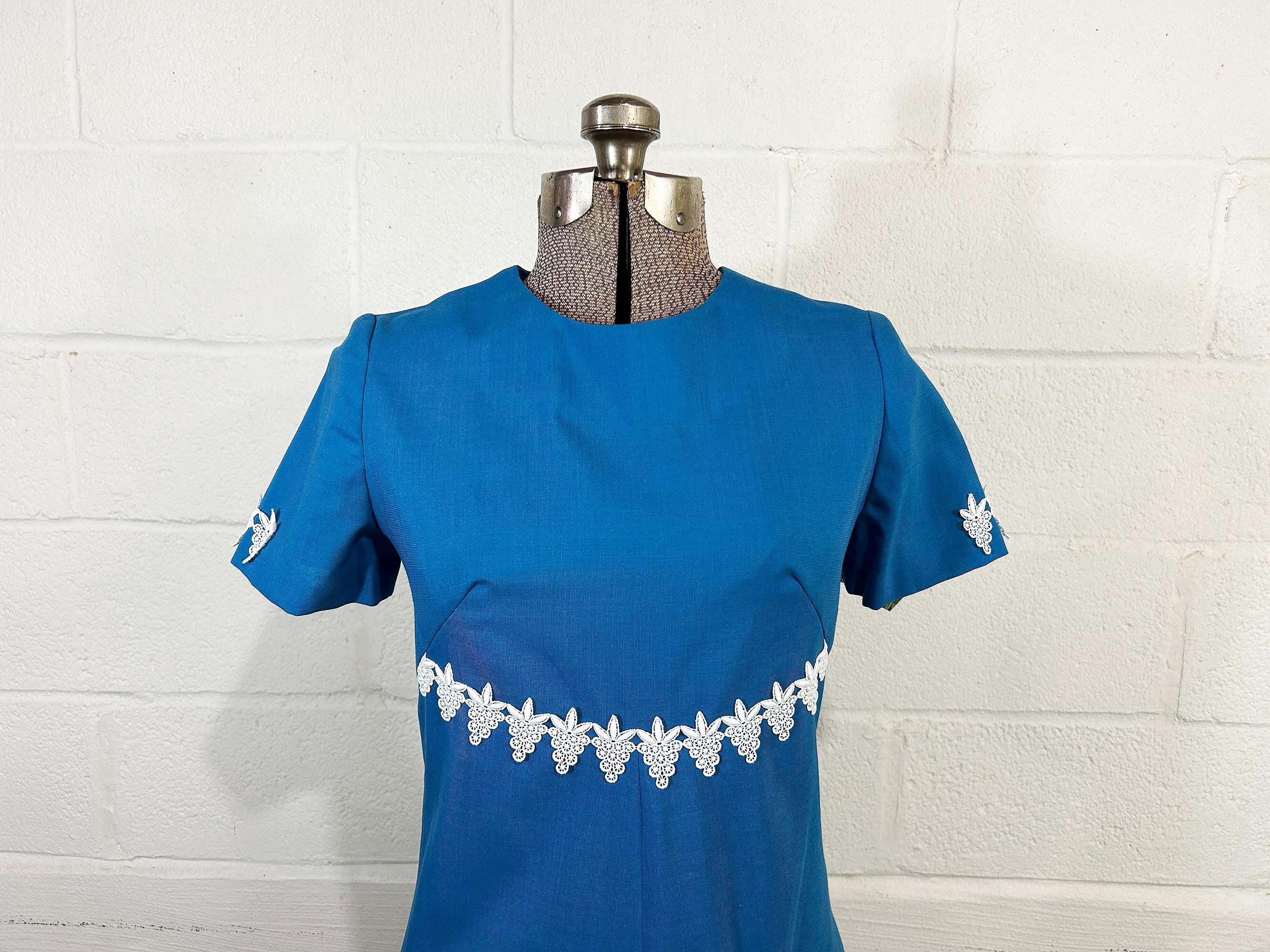 Incredible 60s dusty blue a-line dress. Short sleeves with zipper in the back. The fabric has no stretch. It is in excellent condition and appears to be handmade.