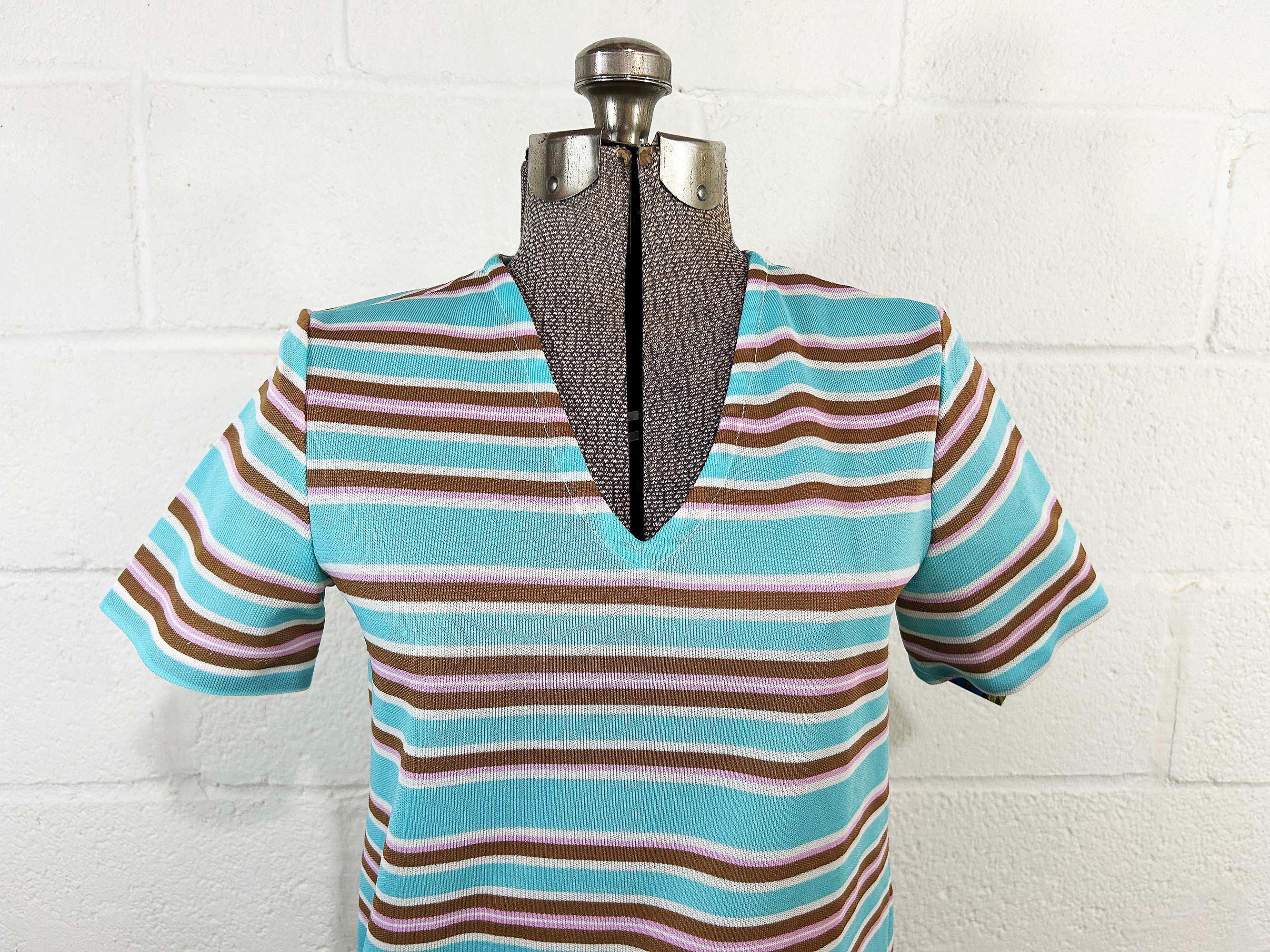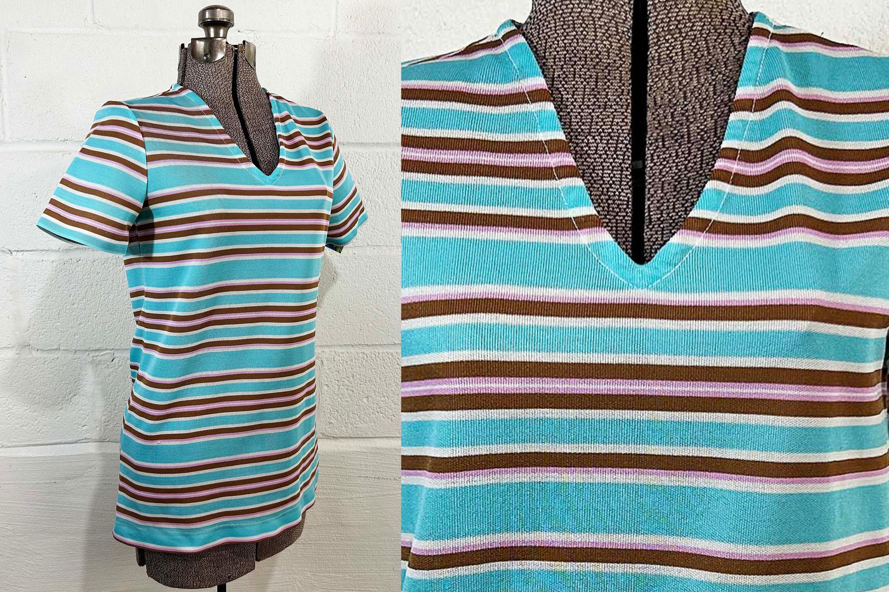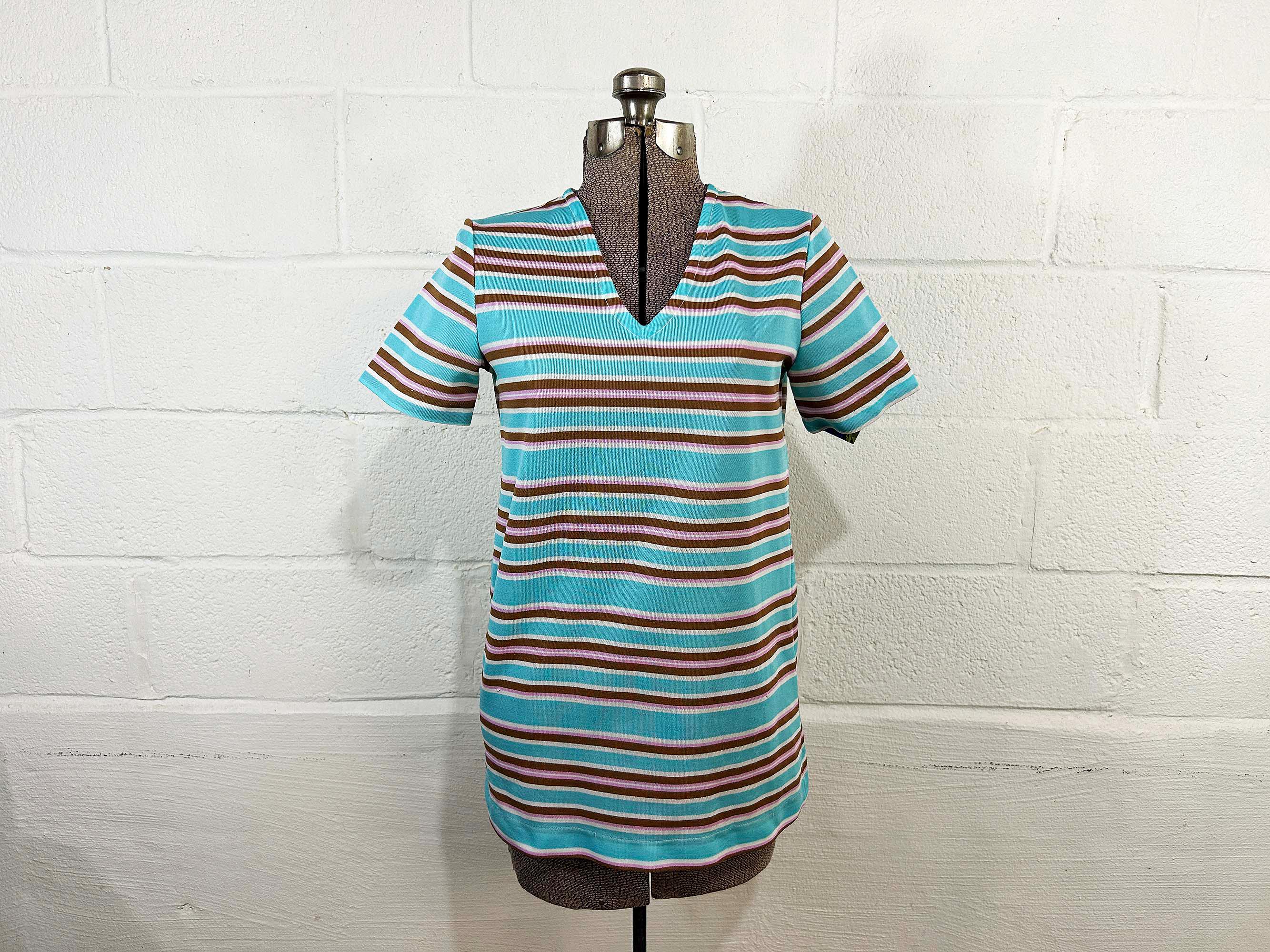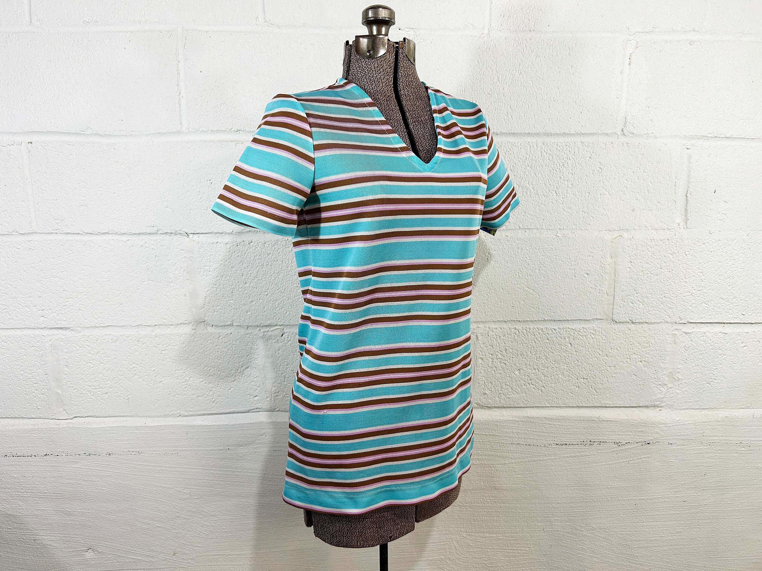 Super cute tunic length blue striped shirt! Deep v neck with short sleeves. Fabric has slight stretch. It is in good vintage condition with a few small snags.