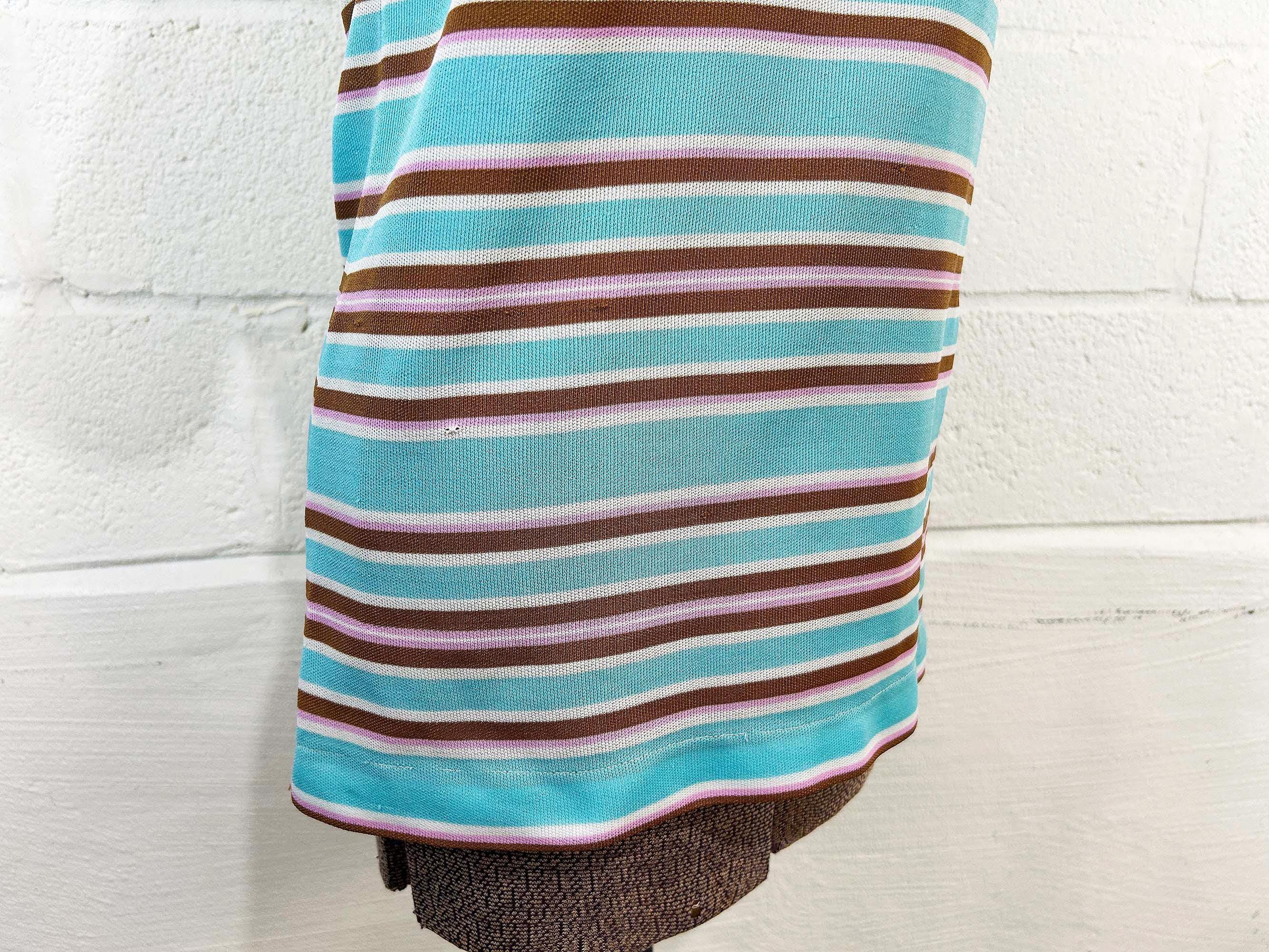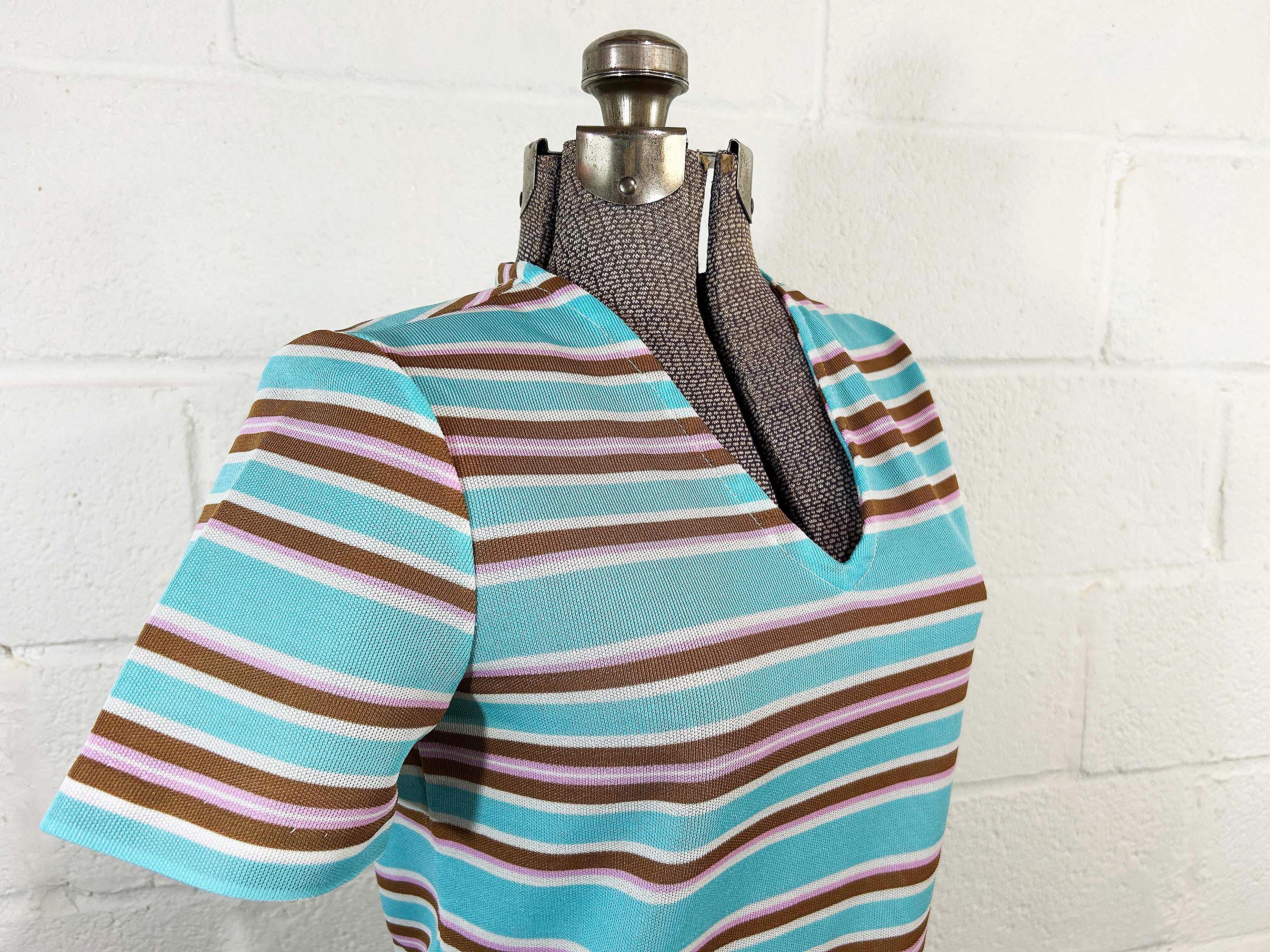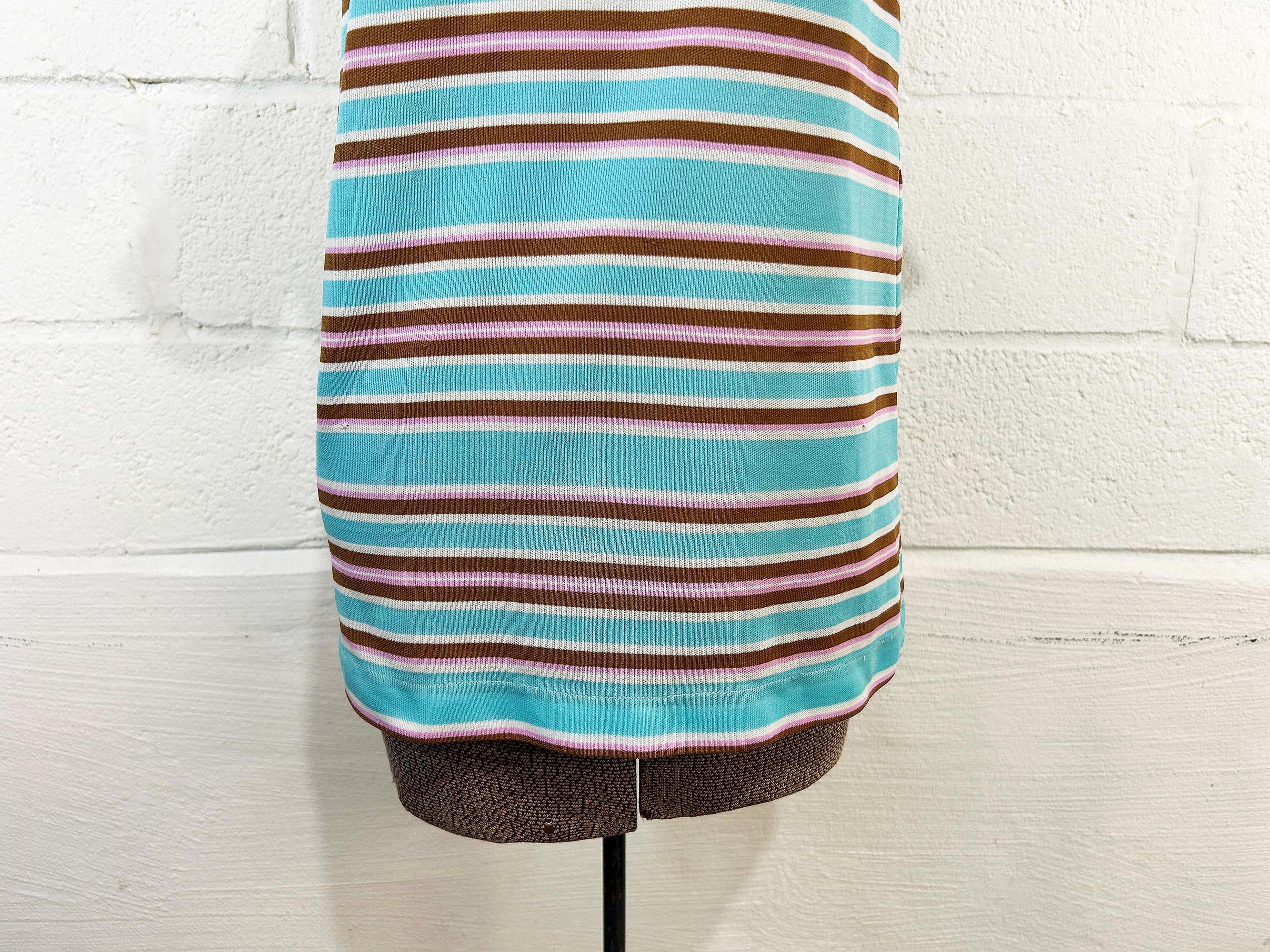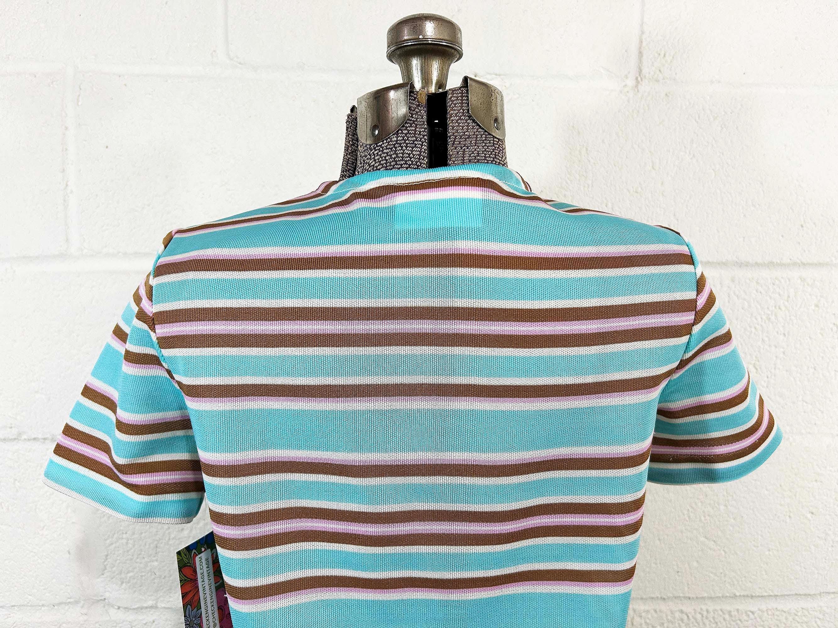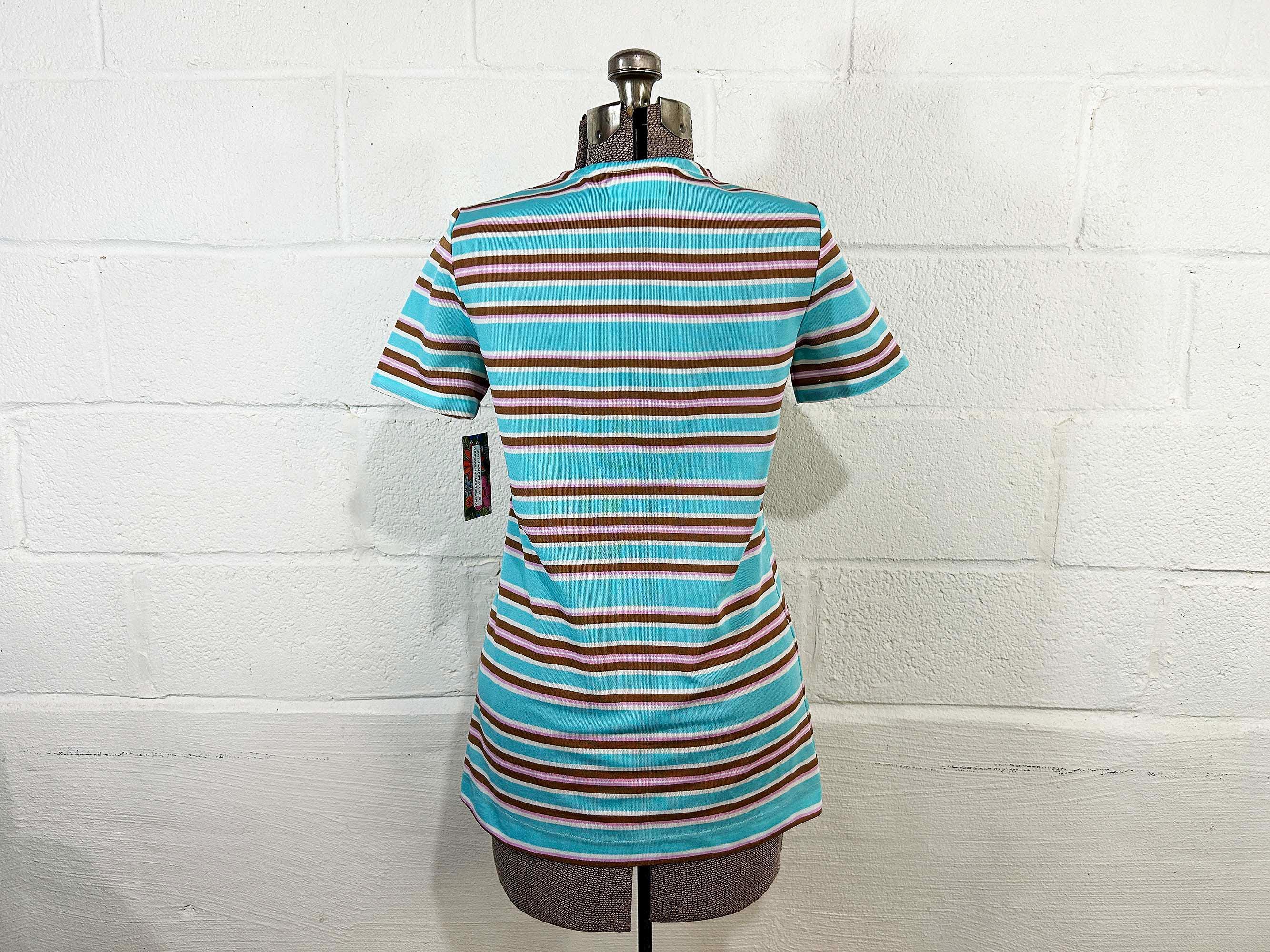 Super cute tunic length blue striped shirt! Deep v neck with short sleeves. Fabric has slight stretch. It is in good vintage condition with a few small snags.