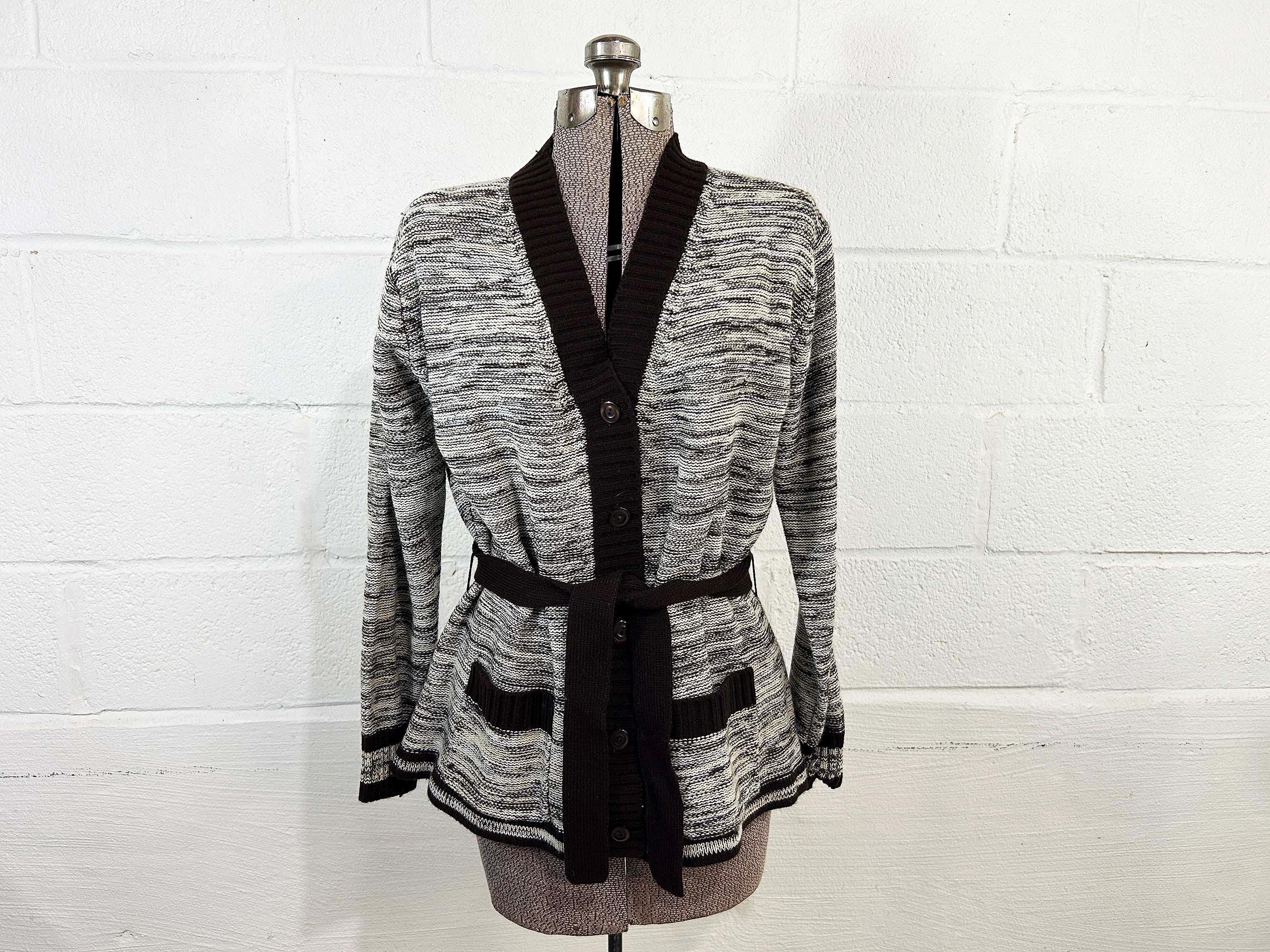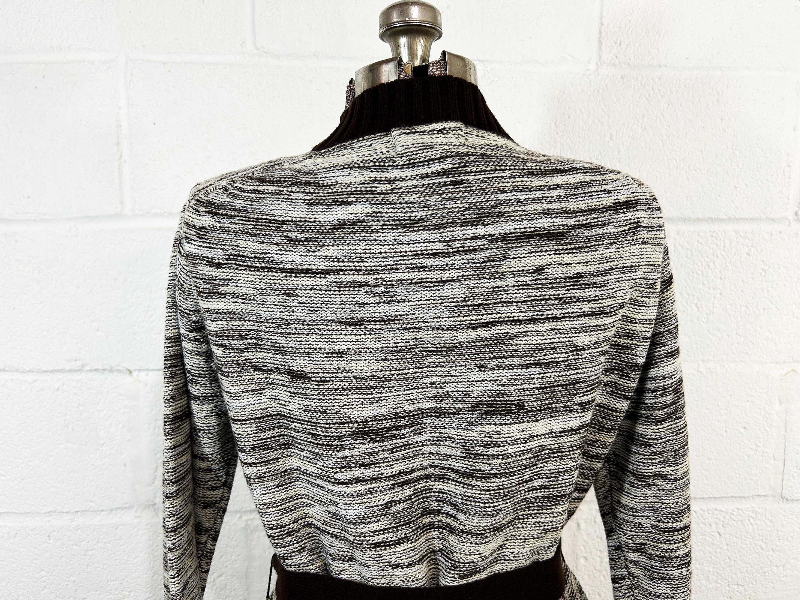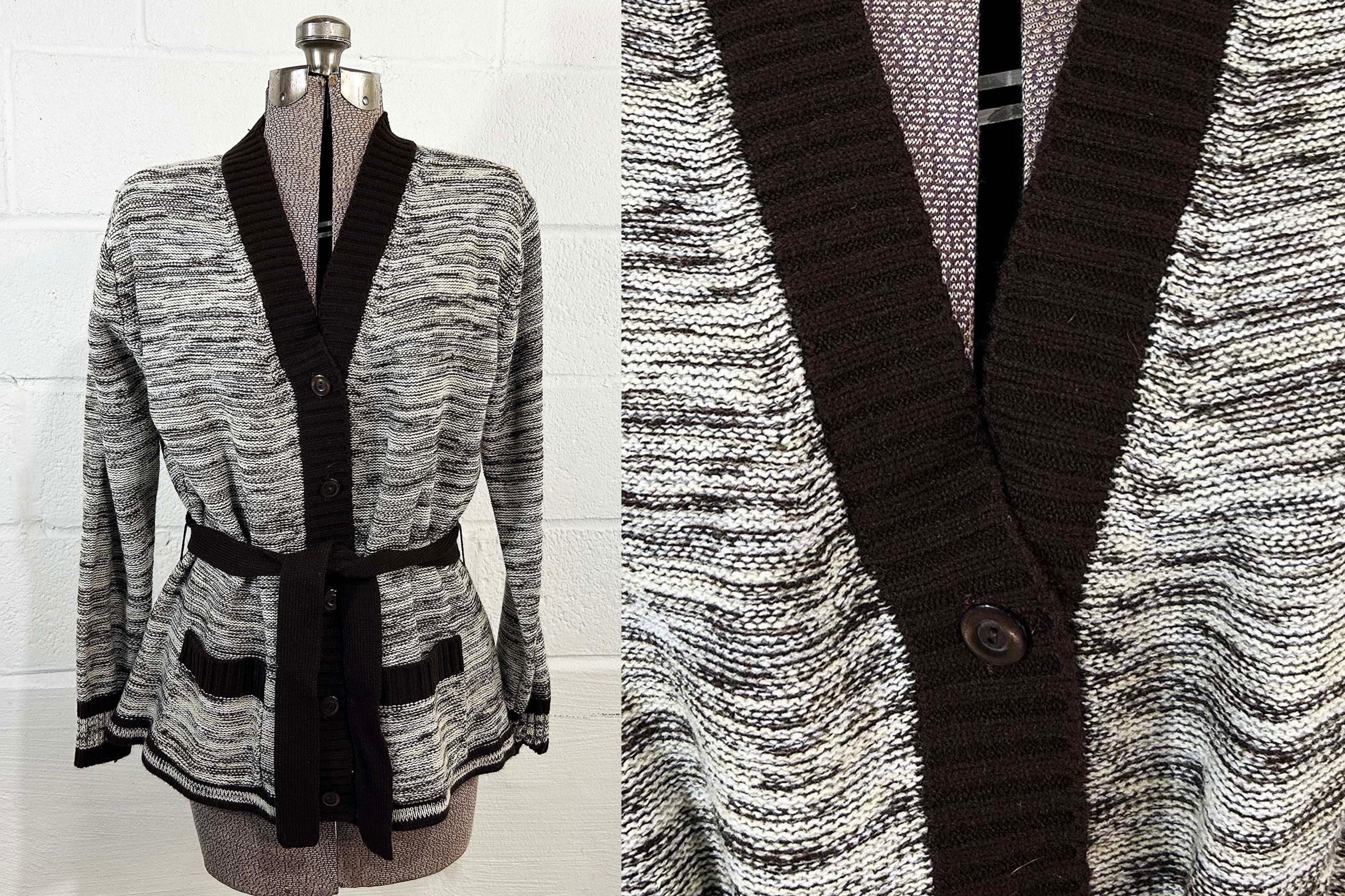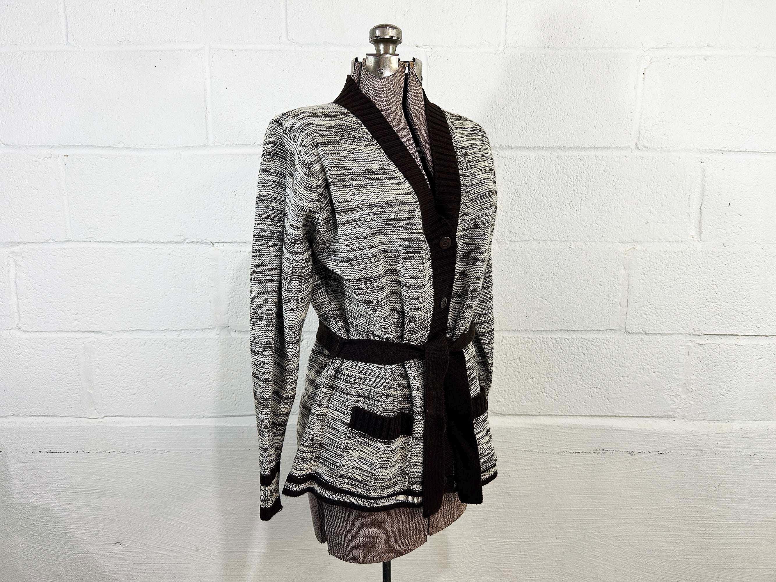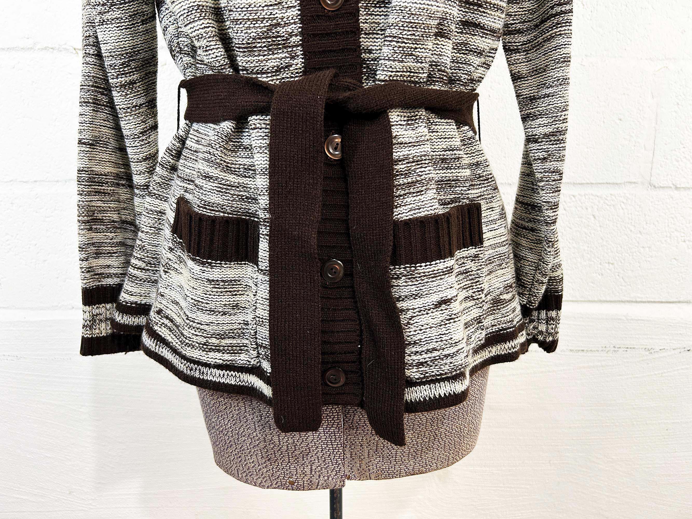 Cute space dyed brown button front cardigan with a matching belt and two front pockets. If this was my size I would be keeping it! So adorable. In good vintage condition with no significant wear. Fabric has stretch.