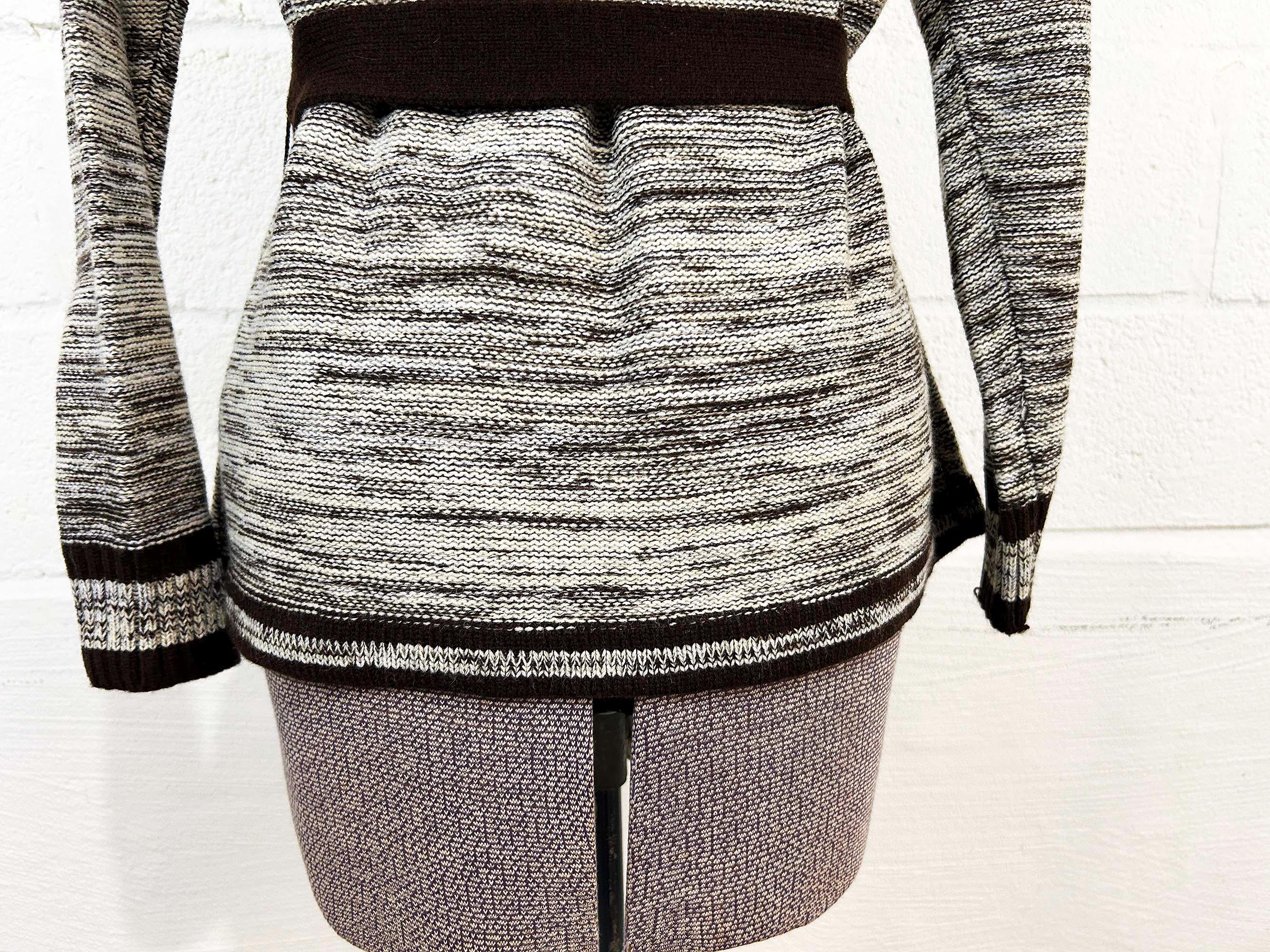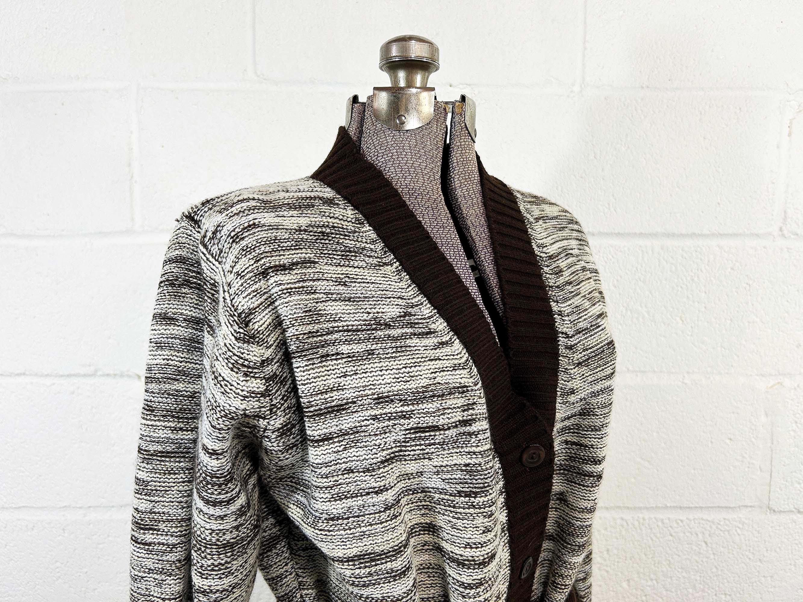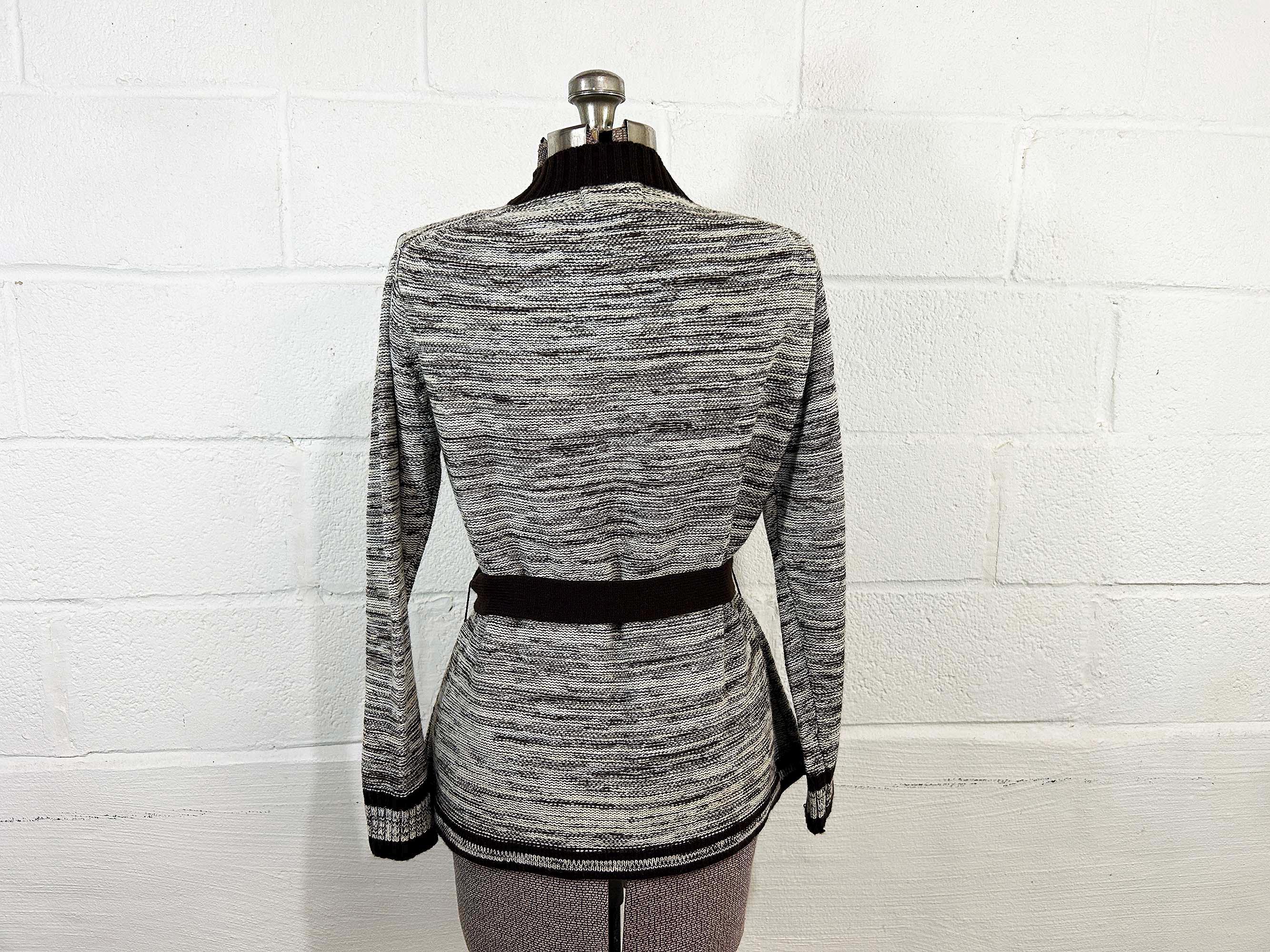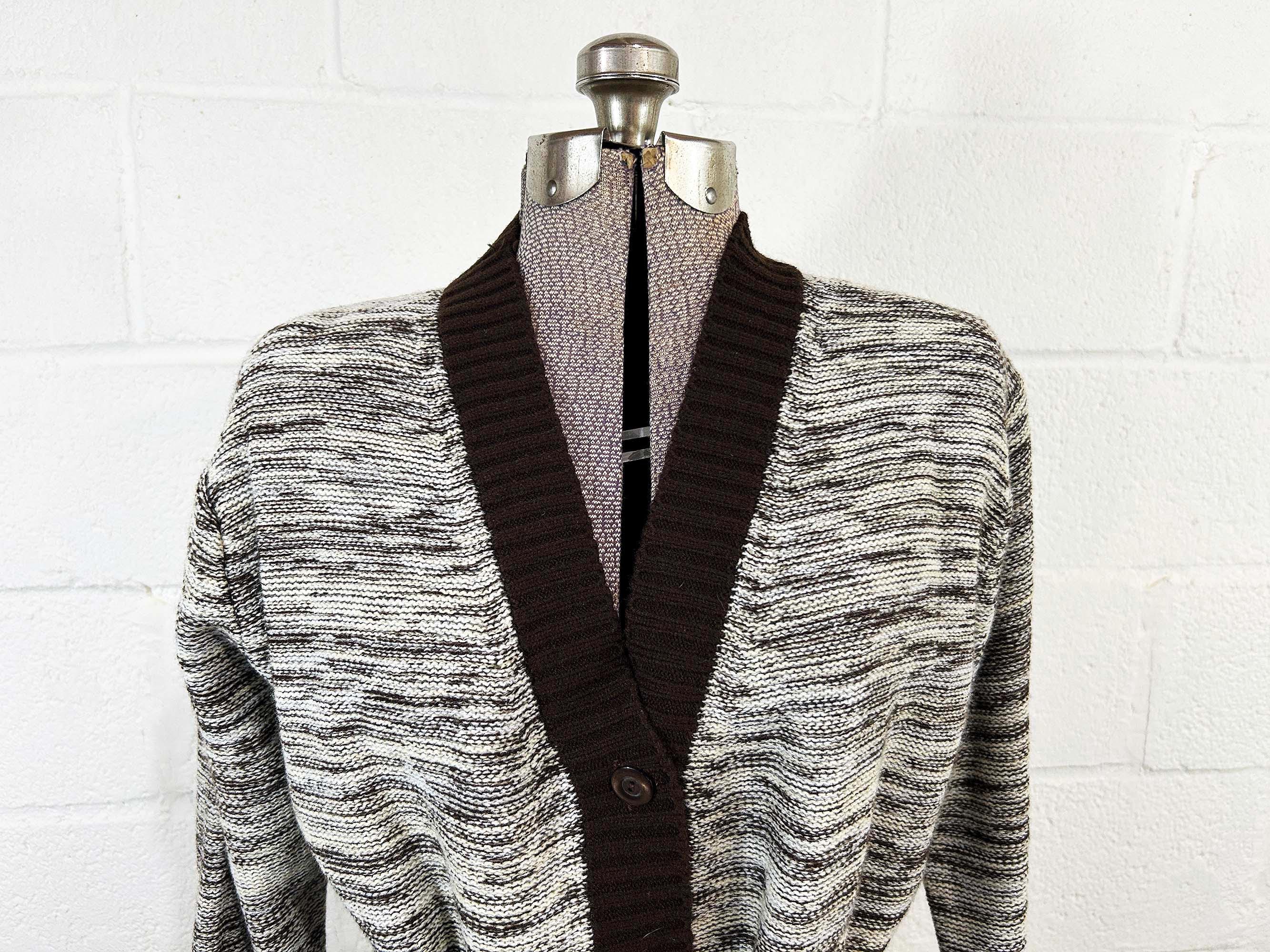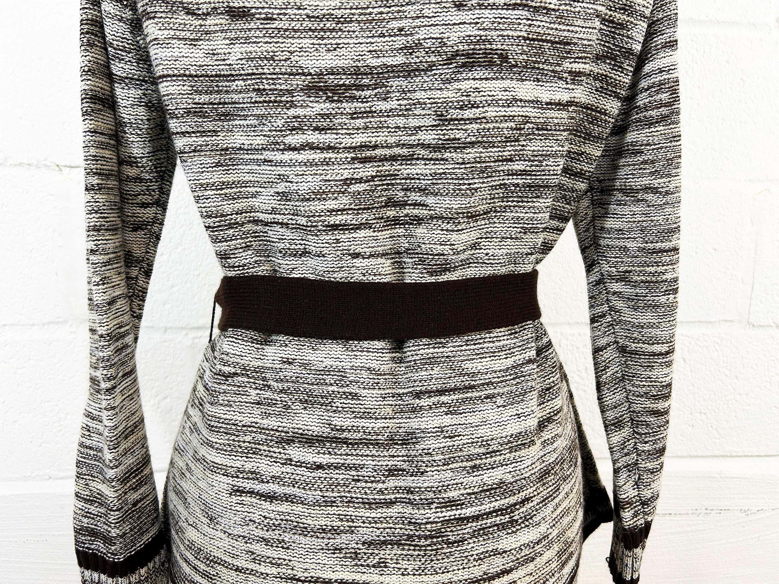 Cute space dyed brown button front cardigan with a matching belt and two front pockets. If this was my size I would be keeping it! So adorable. In good vintage condition with no significant wear. Fabric has stretch.