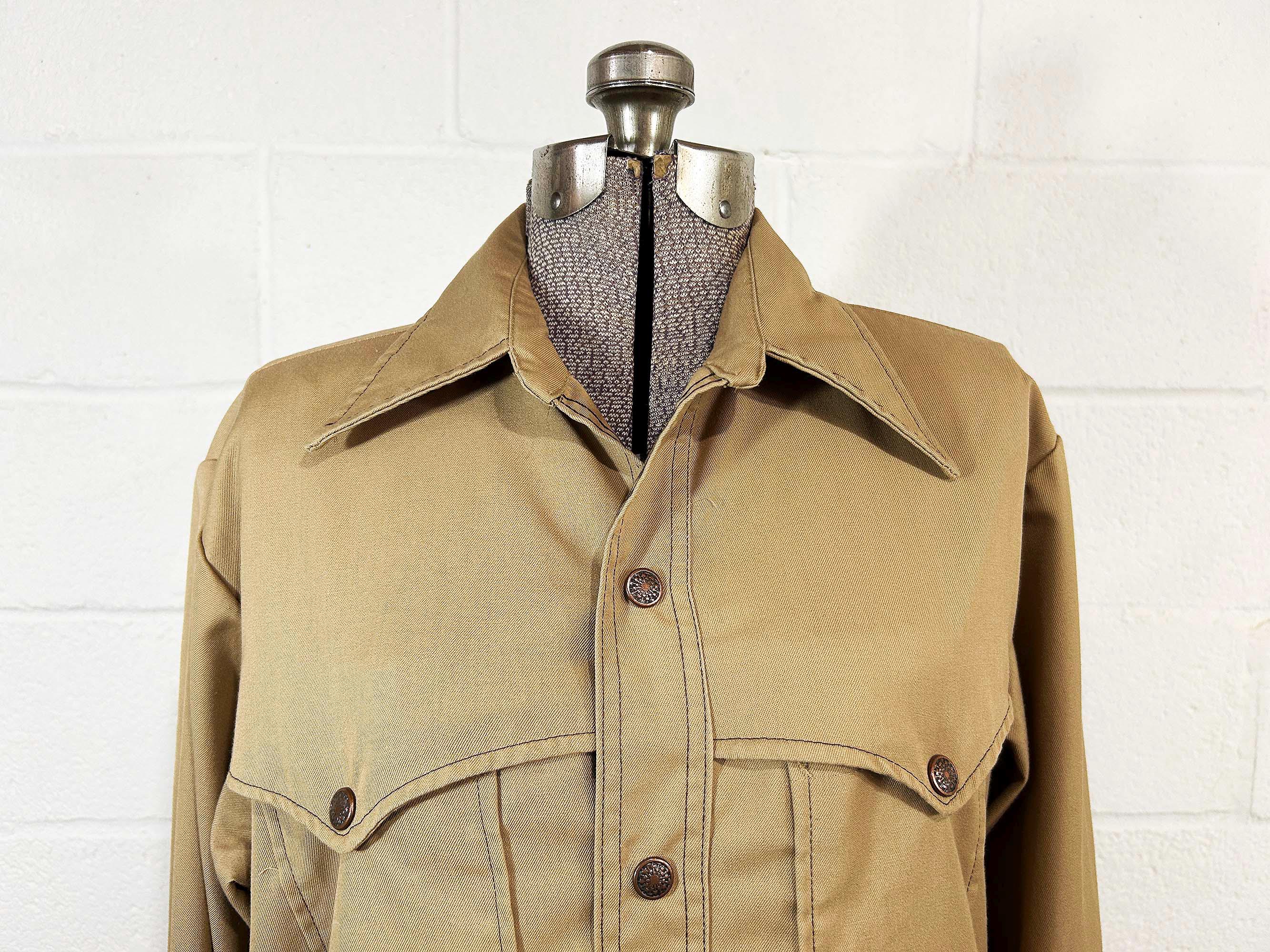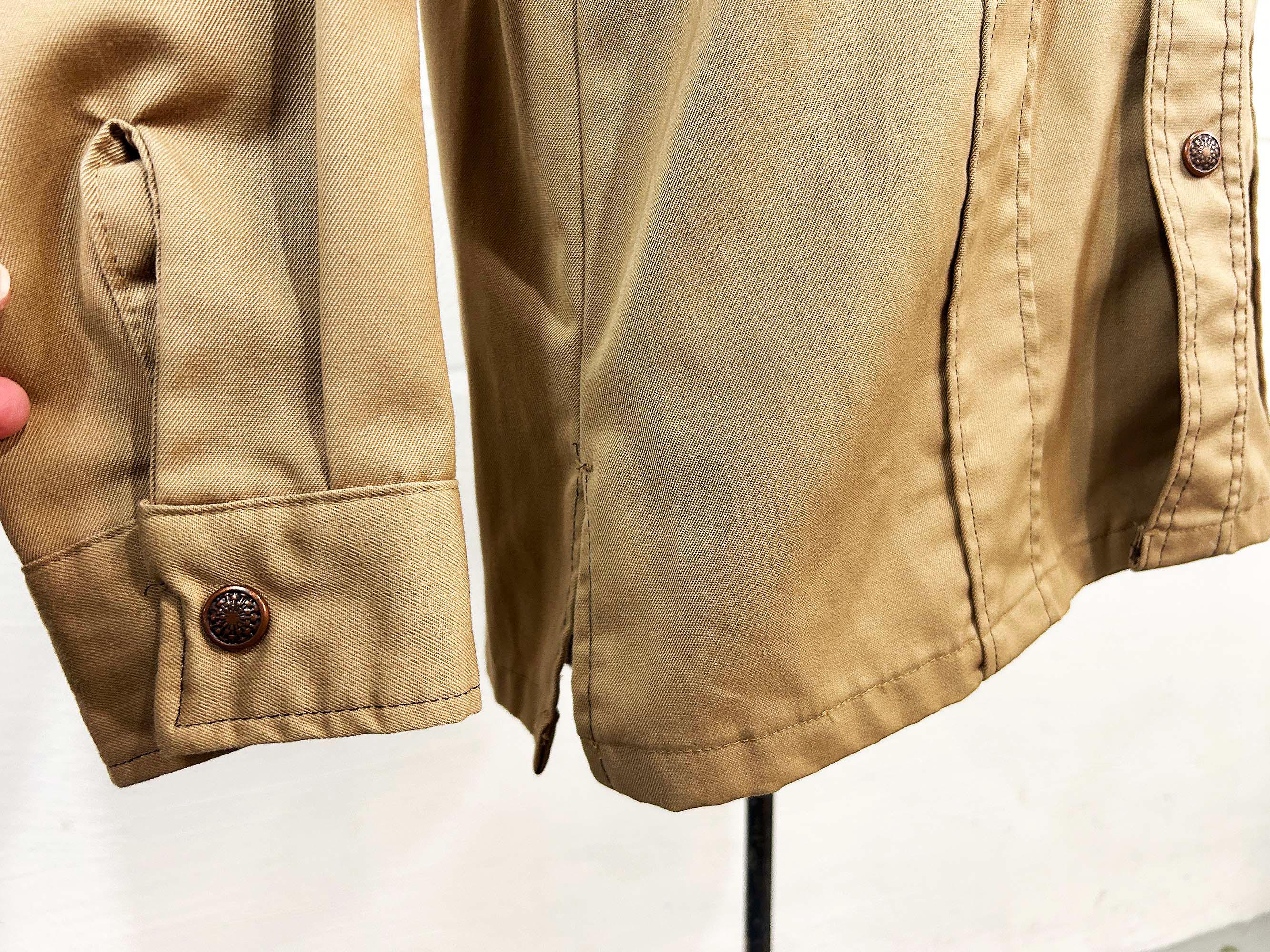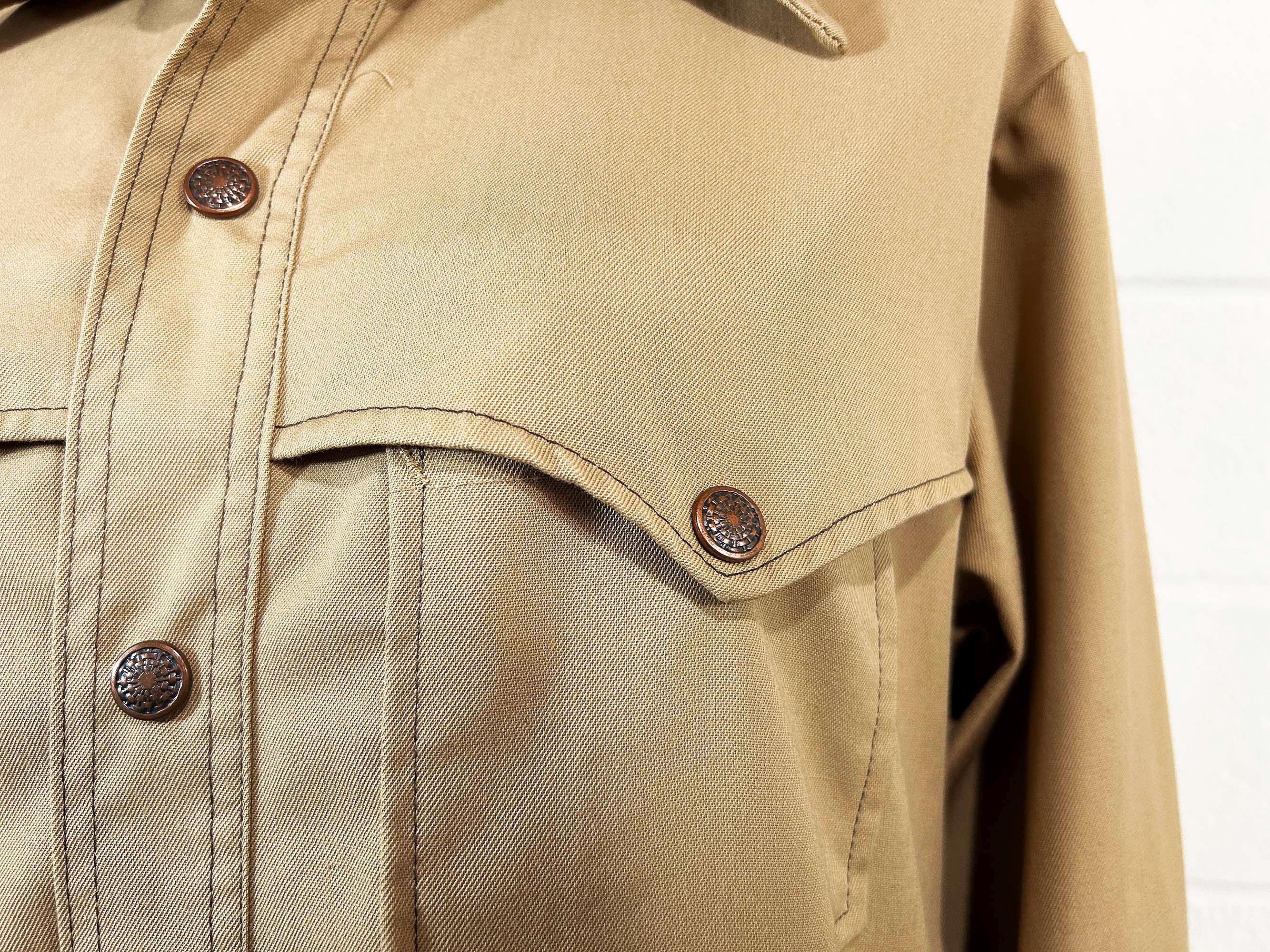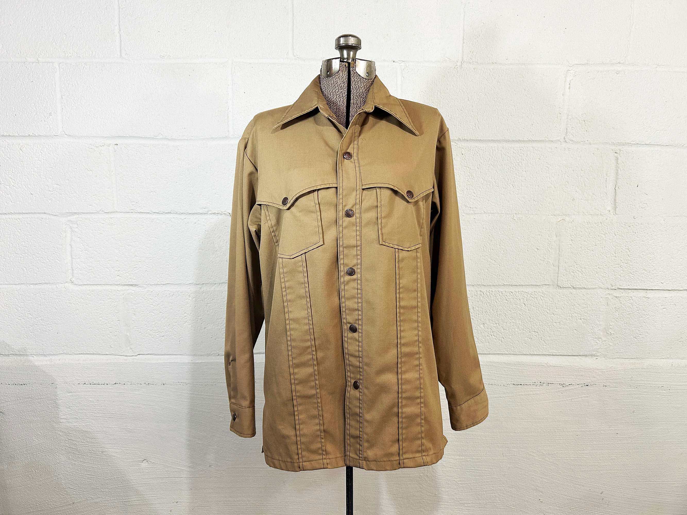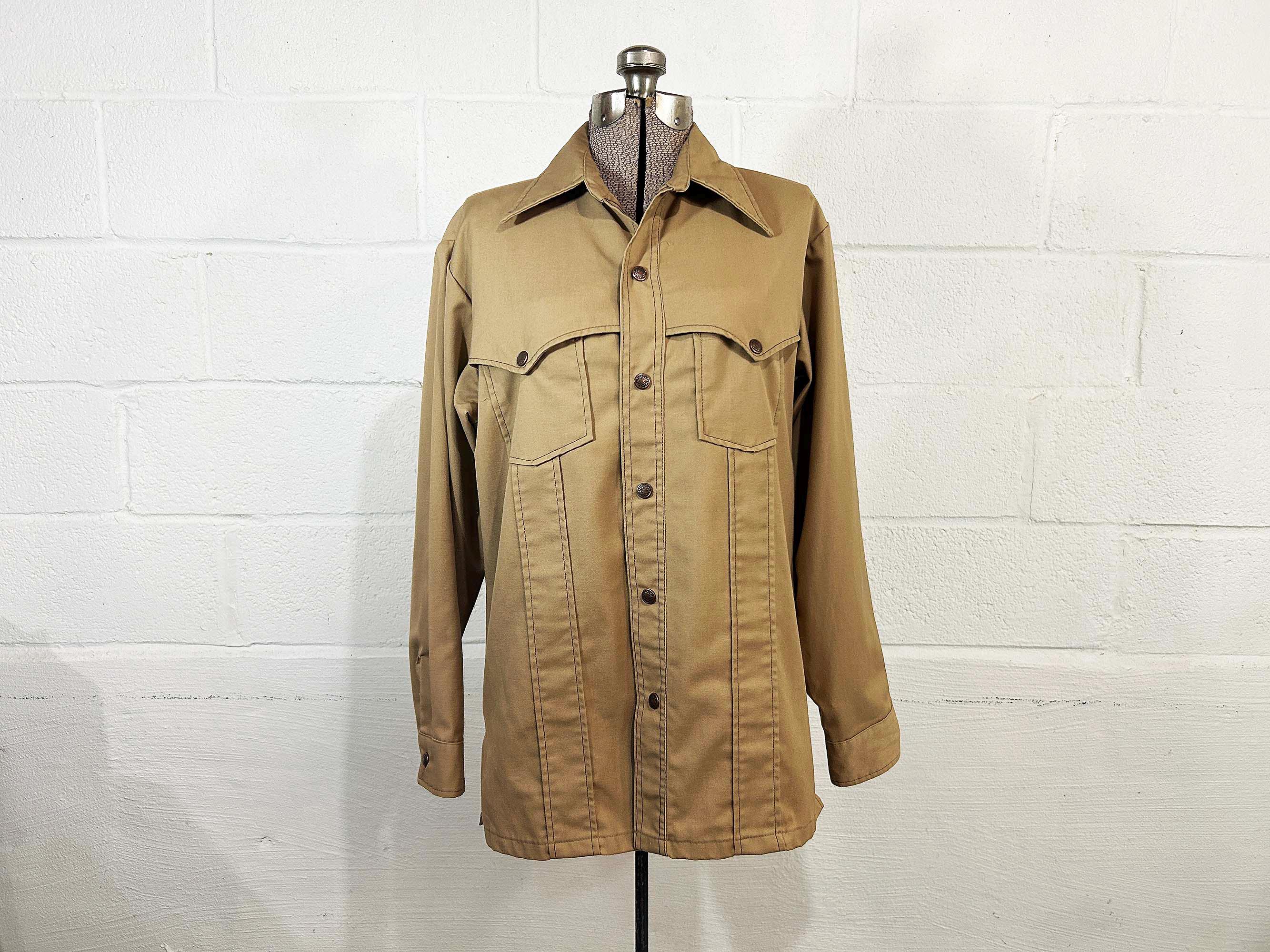 Heavyweight tan snap front shirt with long sleeves. Straight bottom hem and two front pockets. There are slits on either side of the bottom hem. In great shape with no significant wear. Fabric has no stretch.