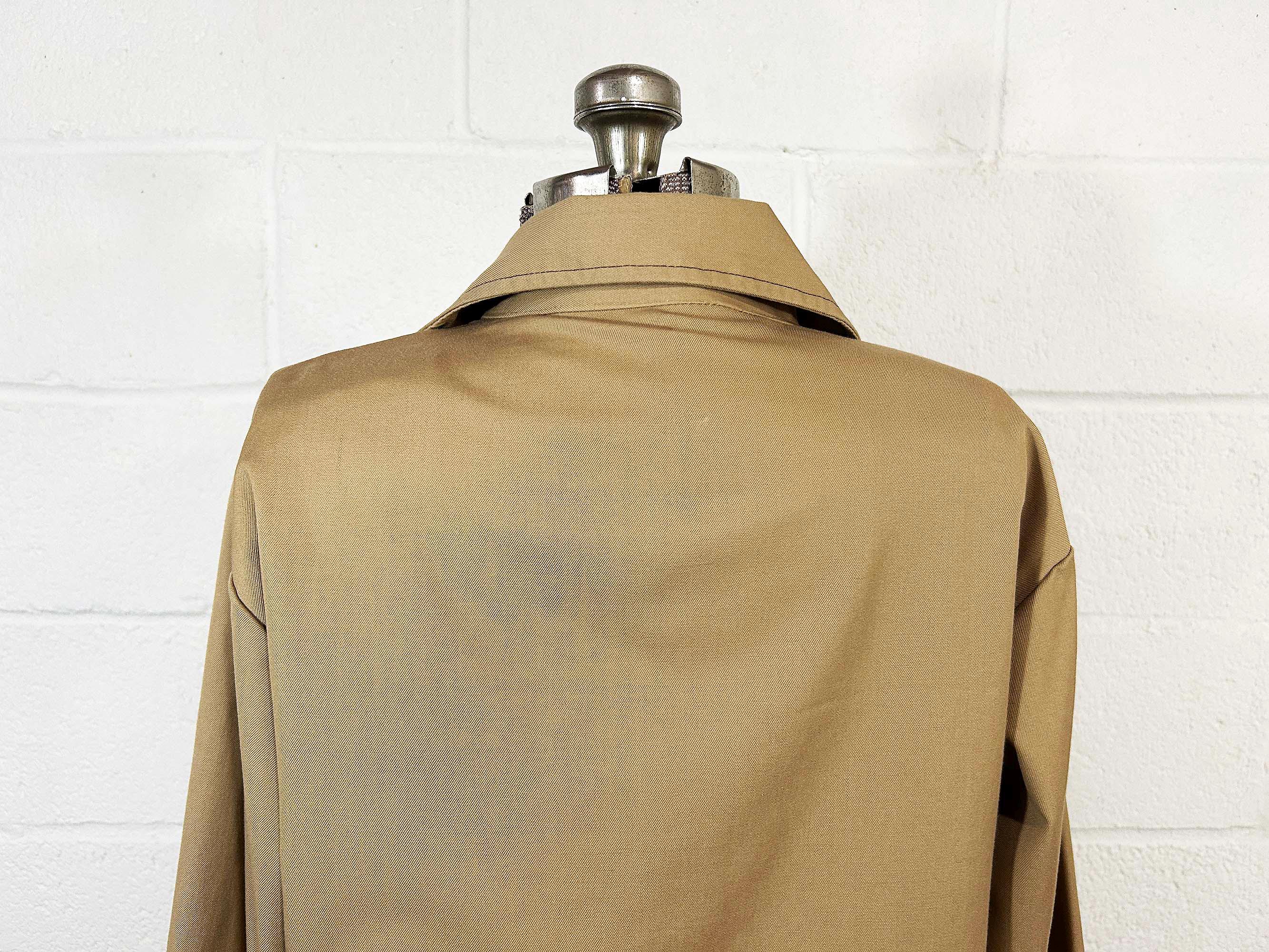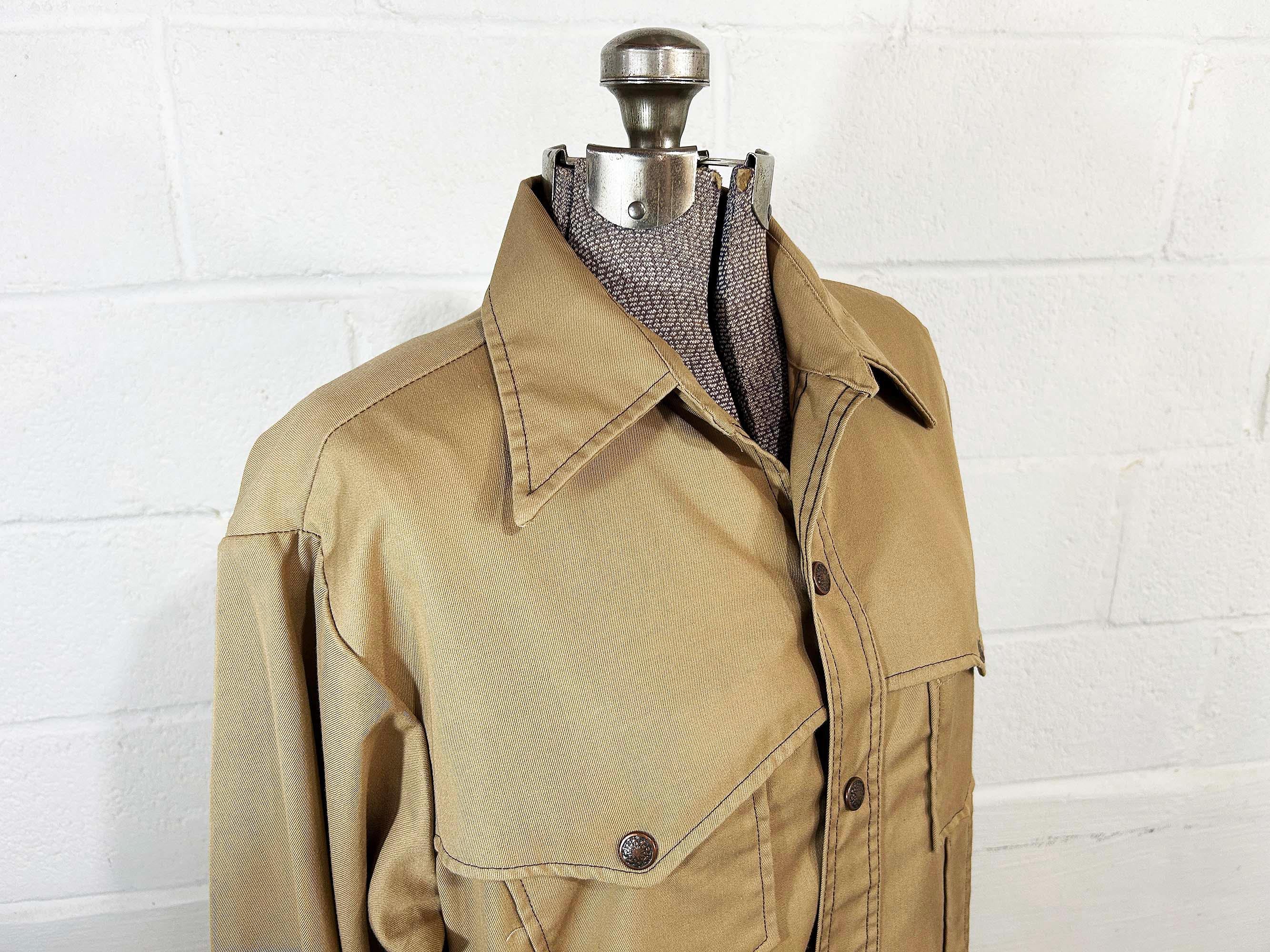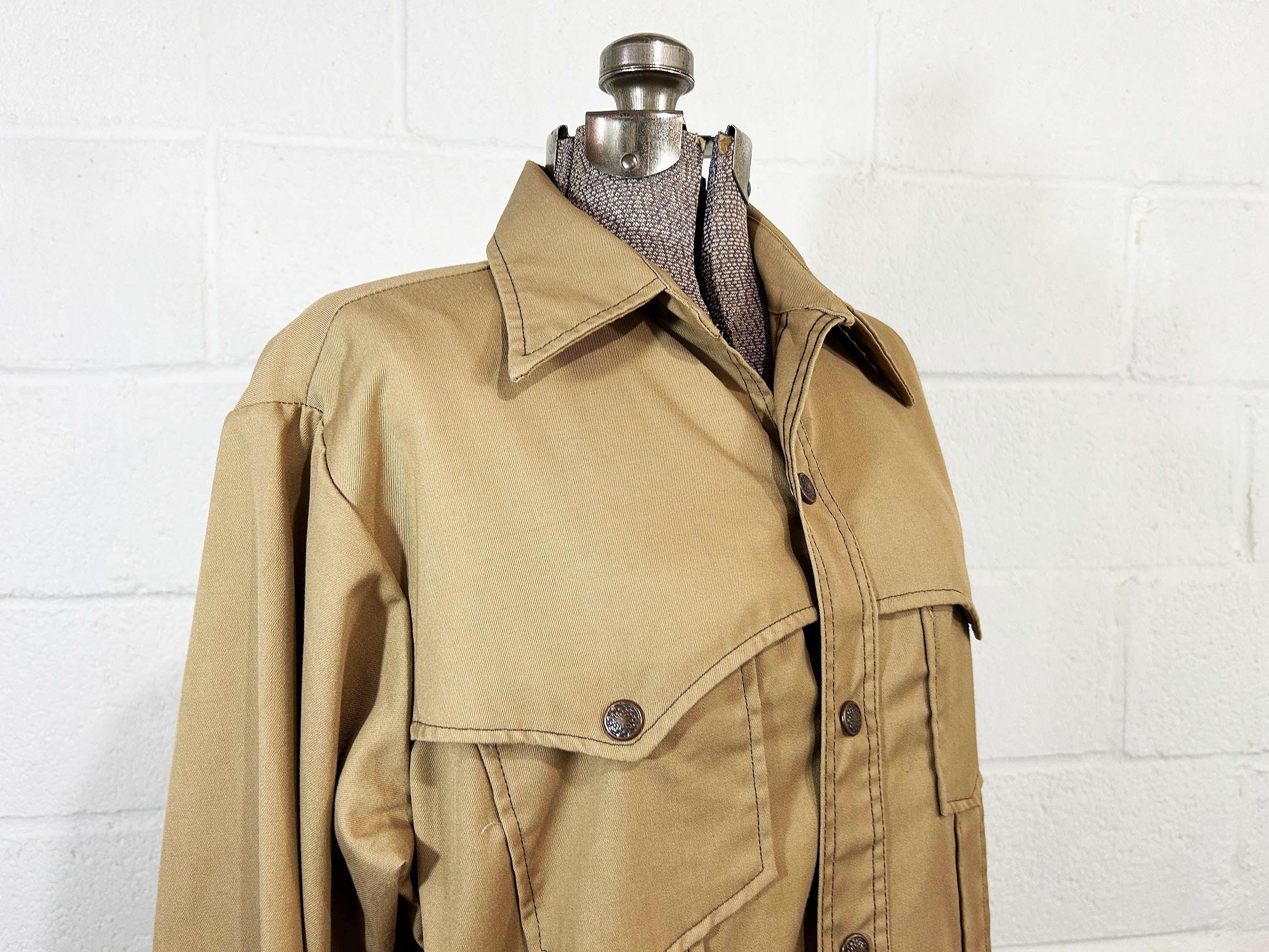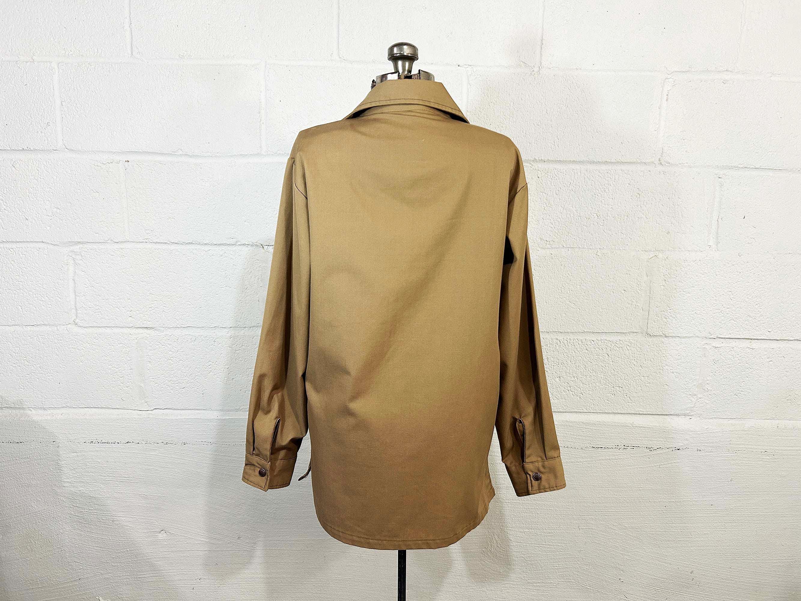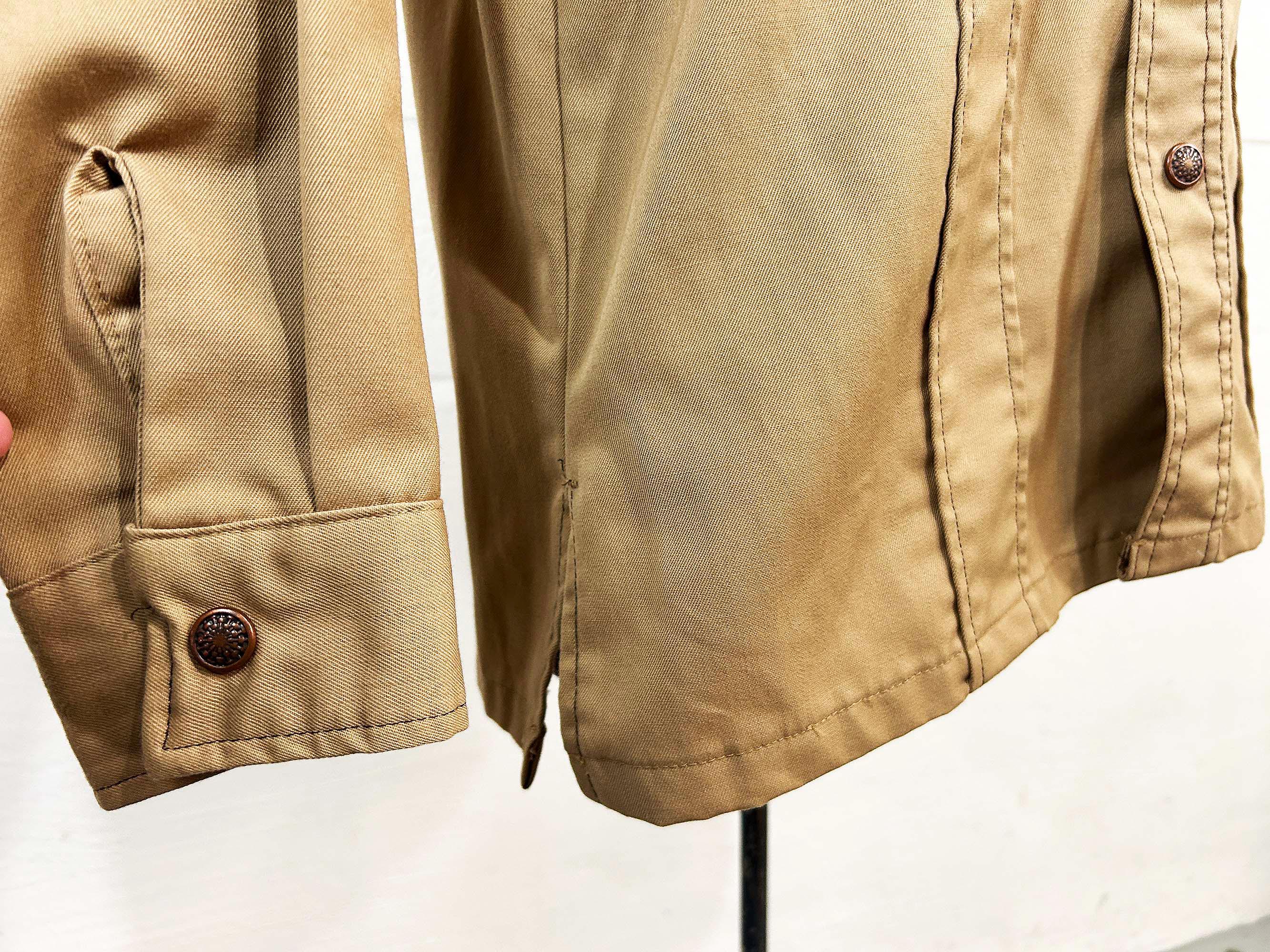 Heavyweight tan snap front shirt with long sleeves. Straight bottom hem and two front pockets. There are slits on either side of the bottom hem. In great shape with no significant wear. Fabric has no stretch.