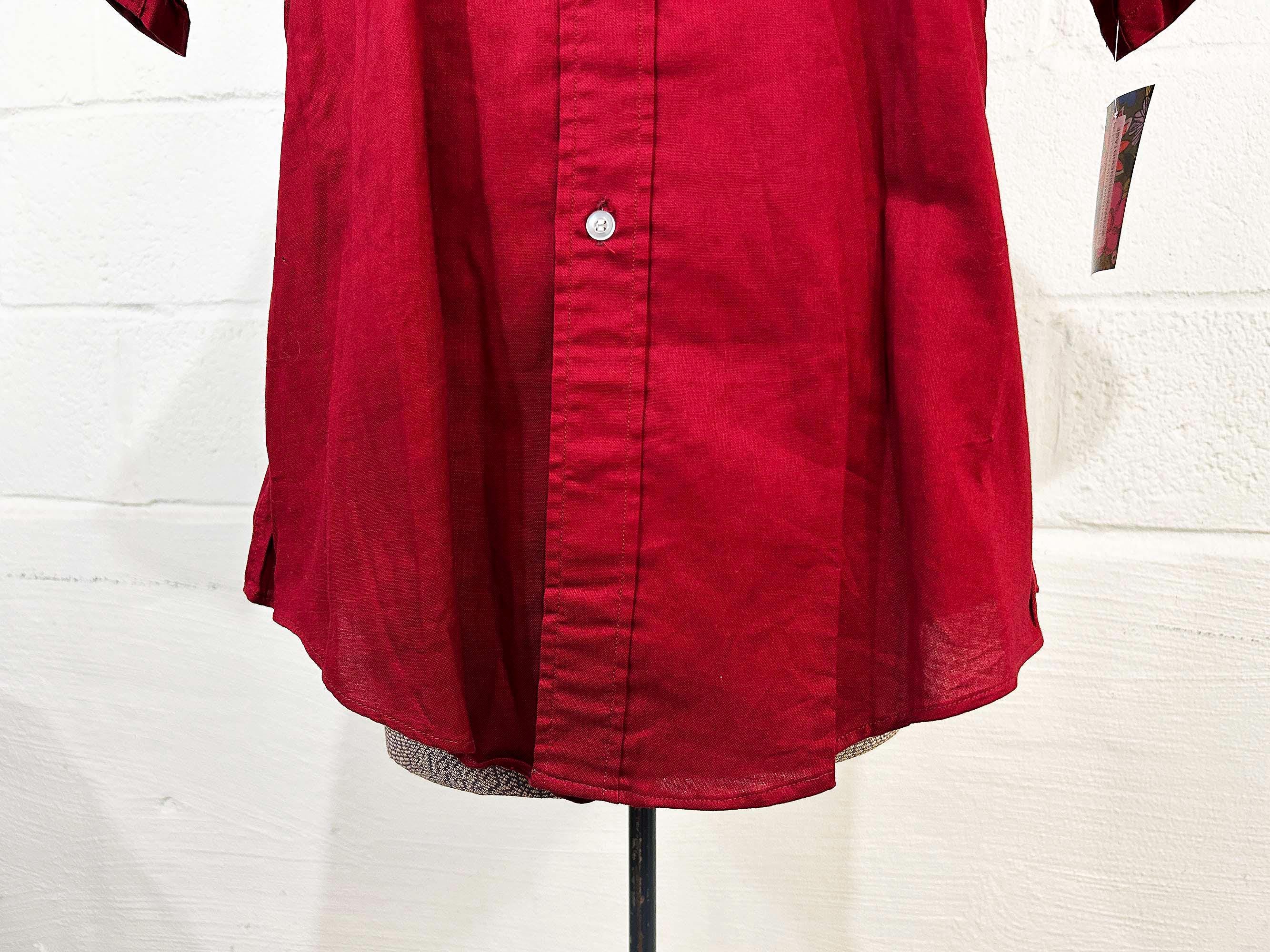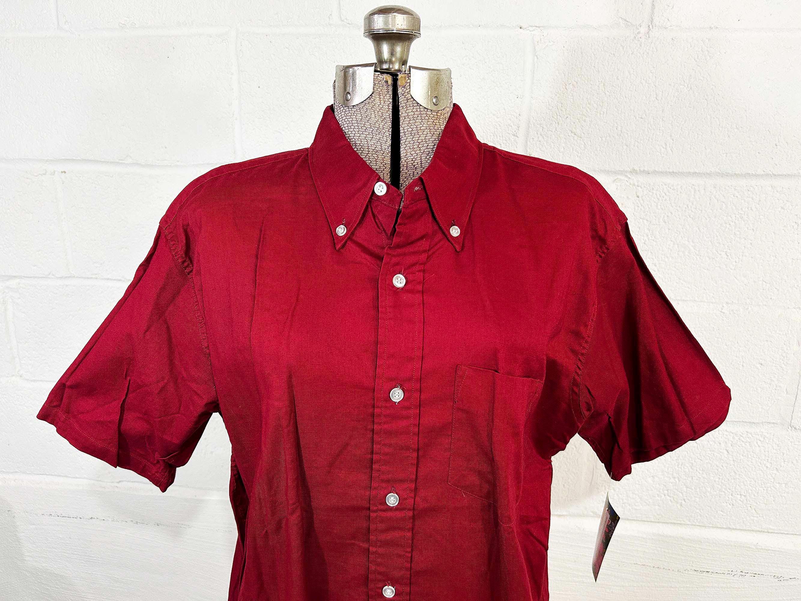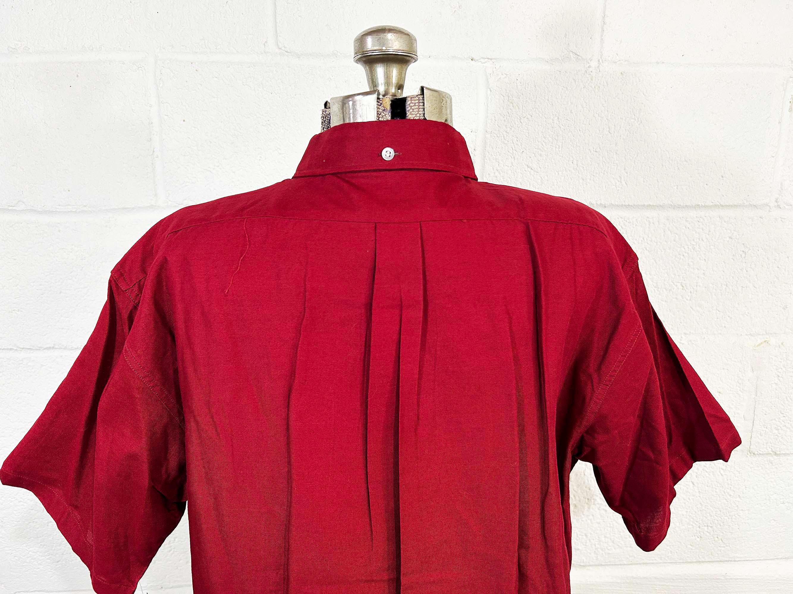 Cotton cranberry red button front shirt with short sleeves. Curved bottom hem and one front patch pocket. In excellent shape with no significant wear. Fabric has no stretch.