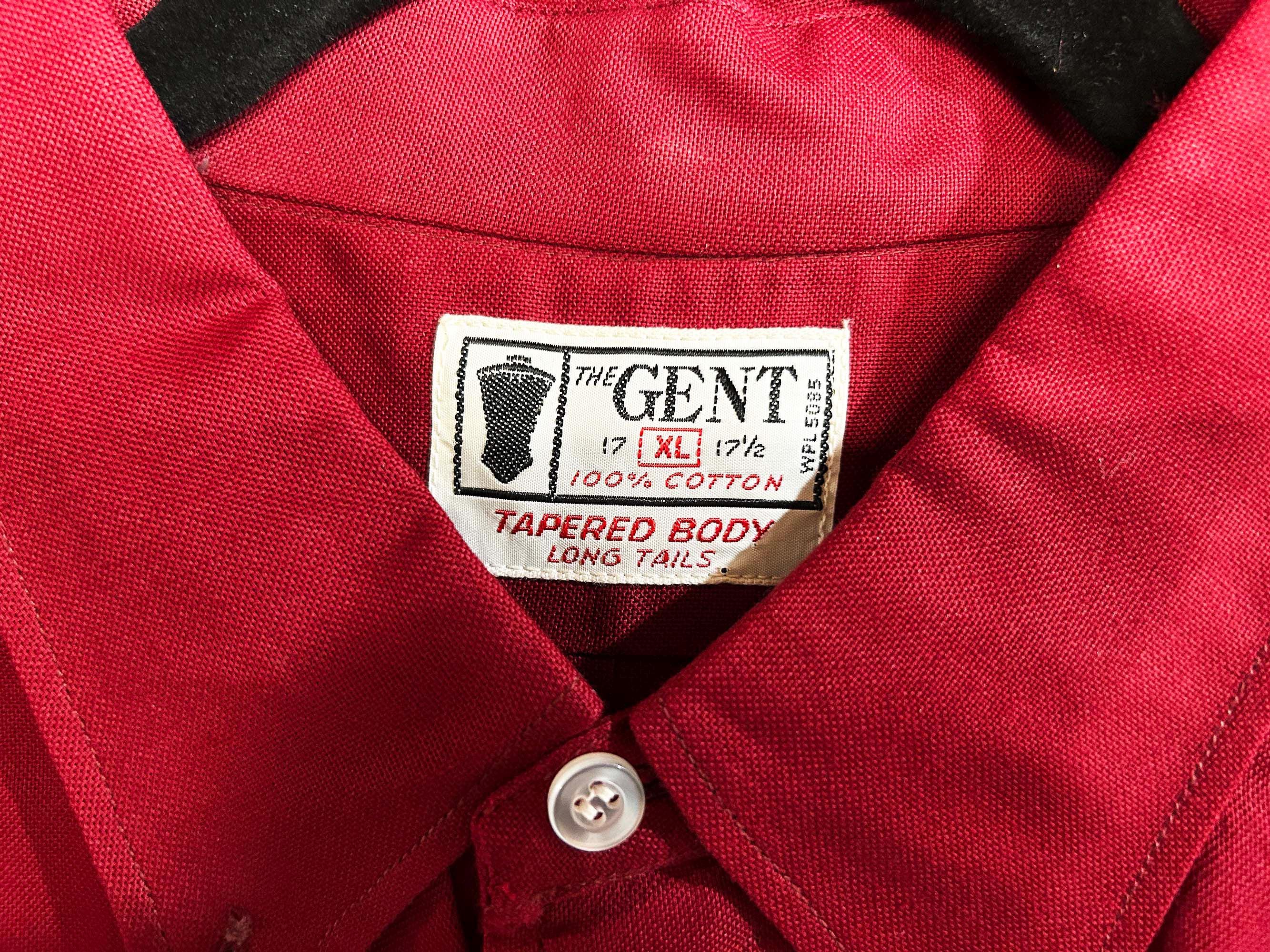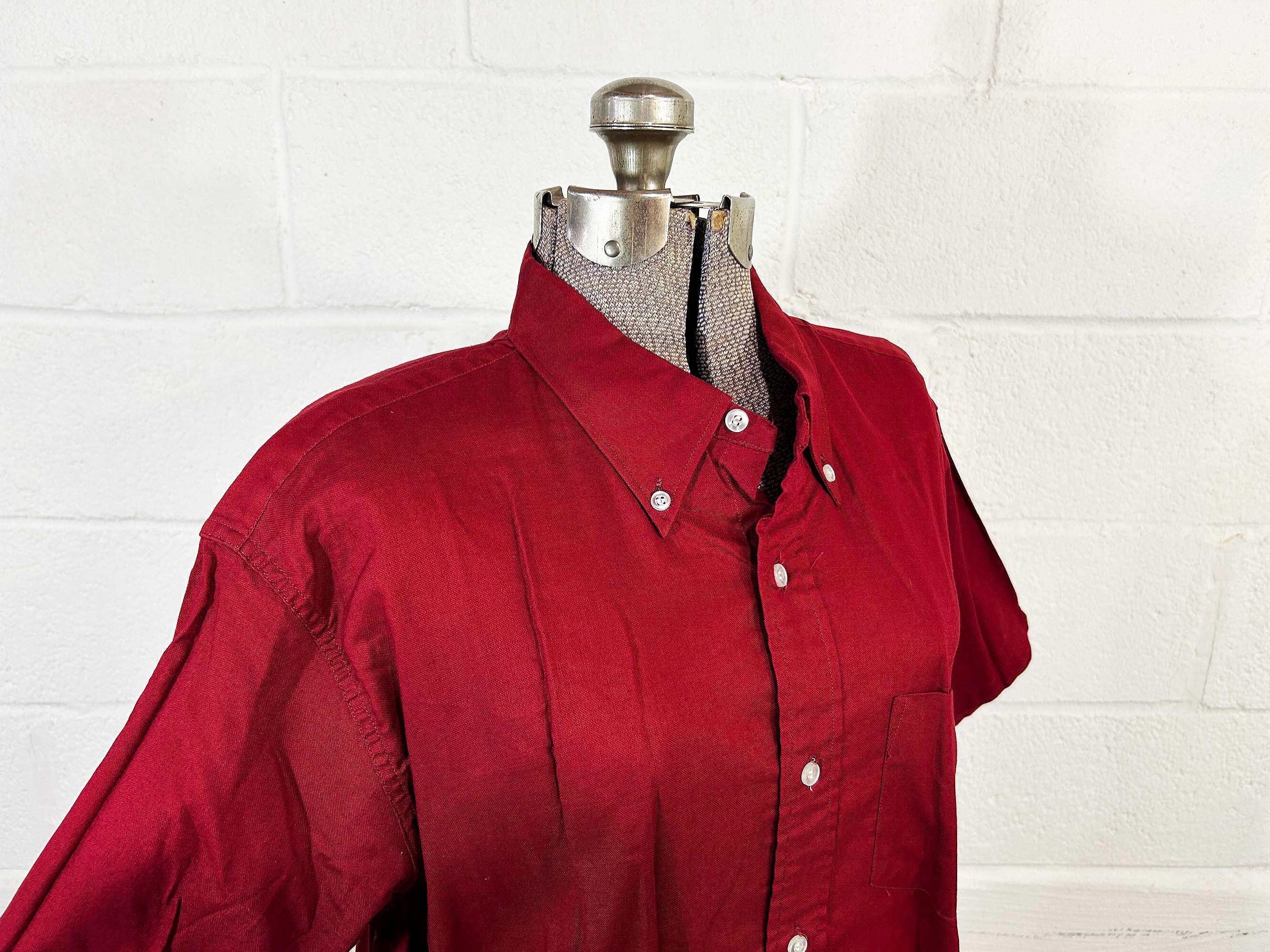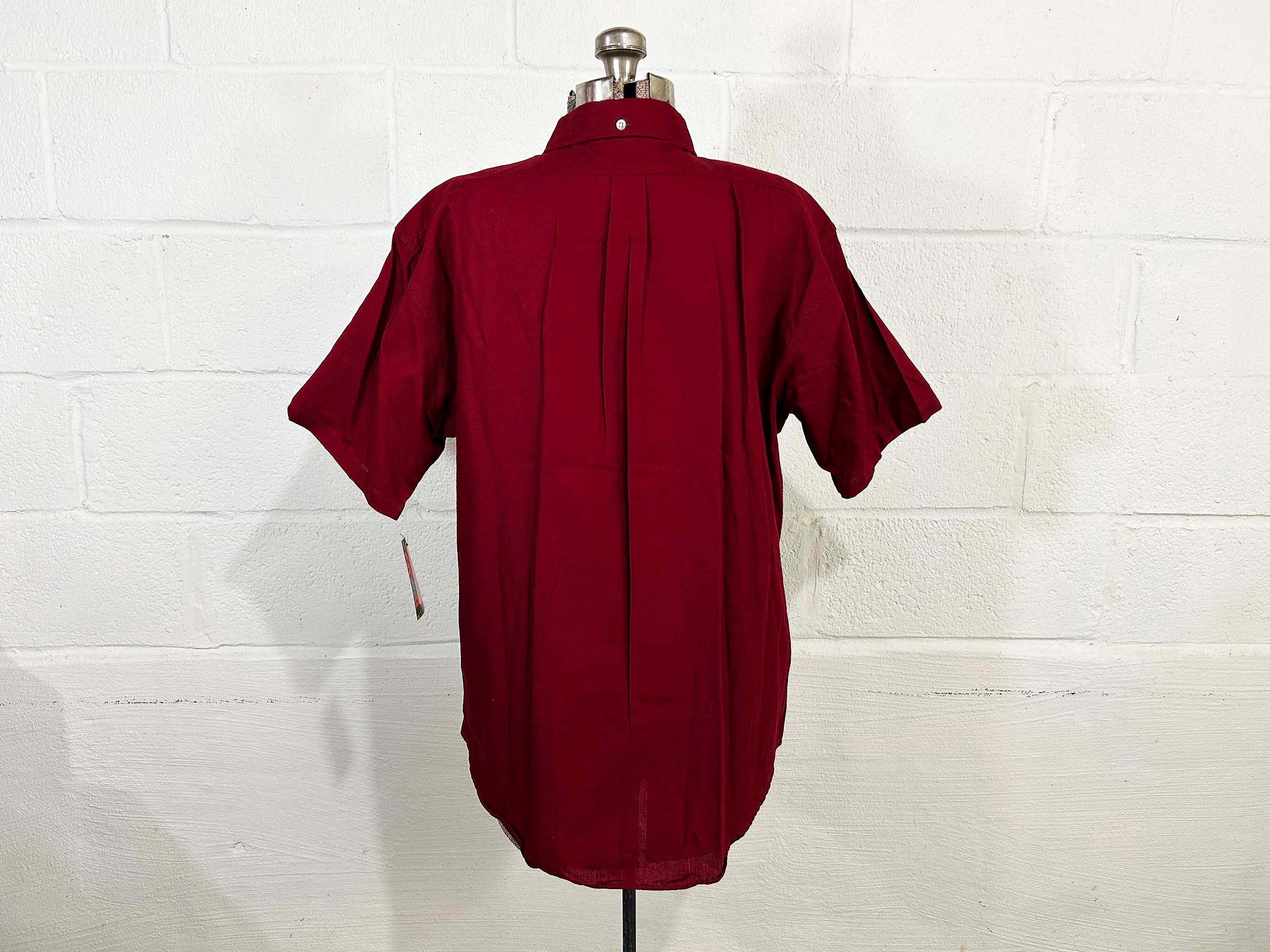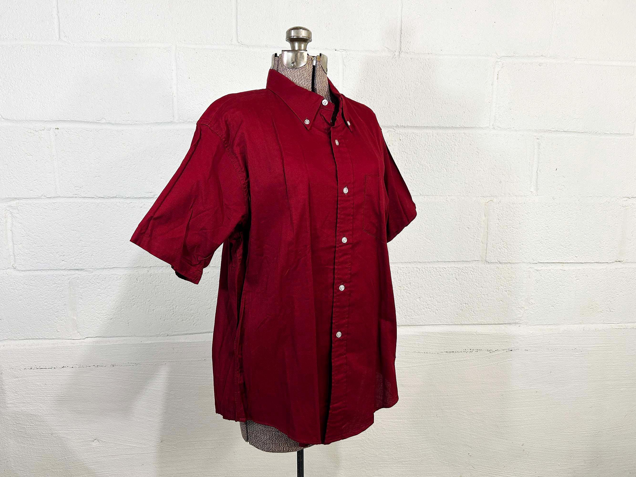 Cotton cranberry red button front shirt with short sleeves. Curved bottom hem and one front patch pocket. In excellent shape with no significant wear. Fabric has no stretch.