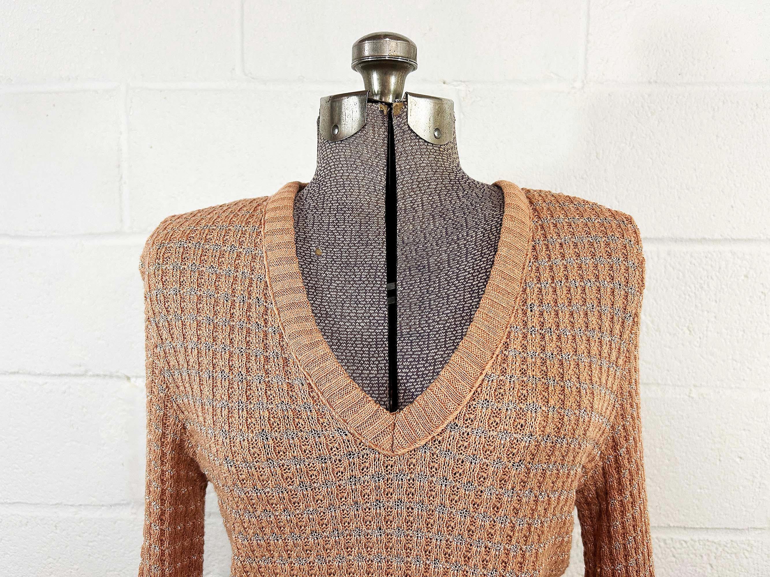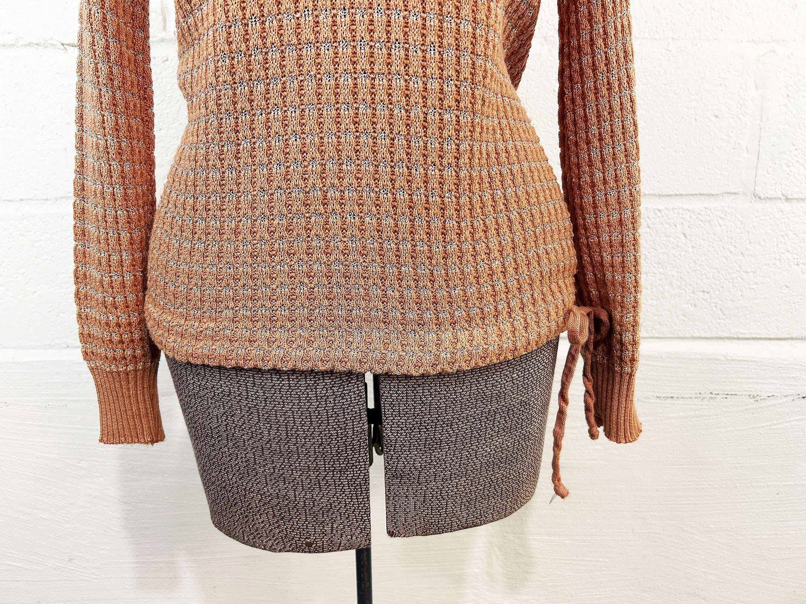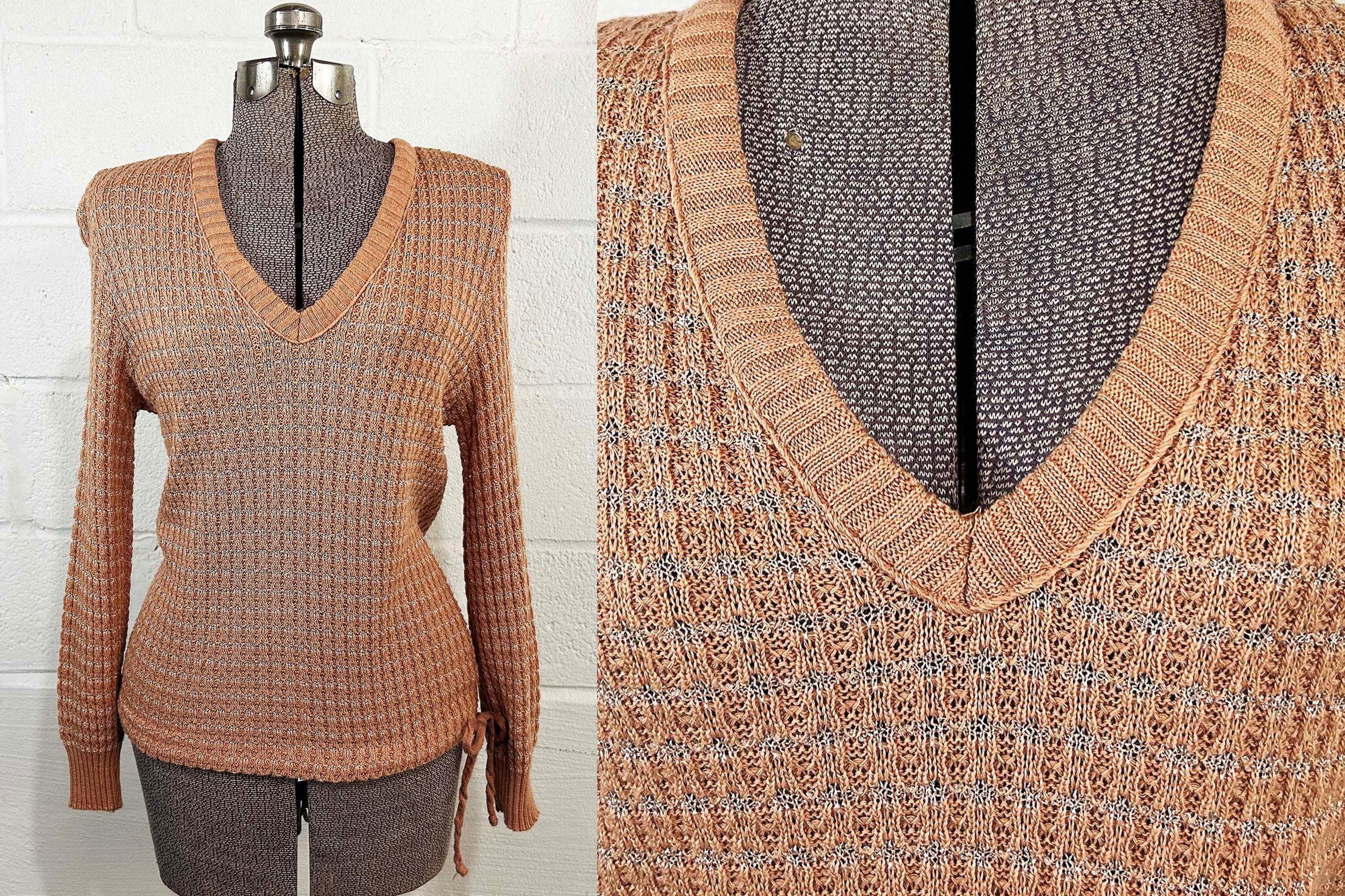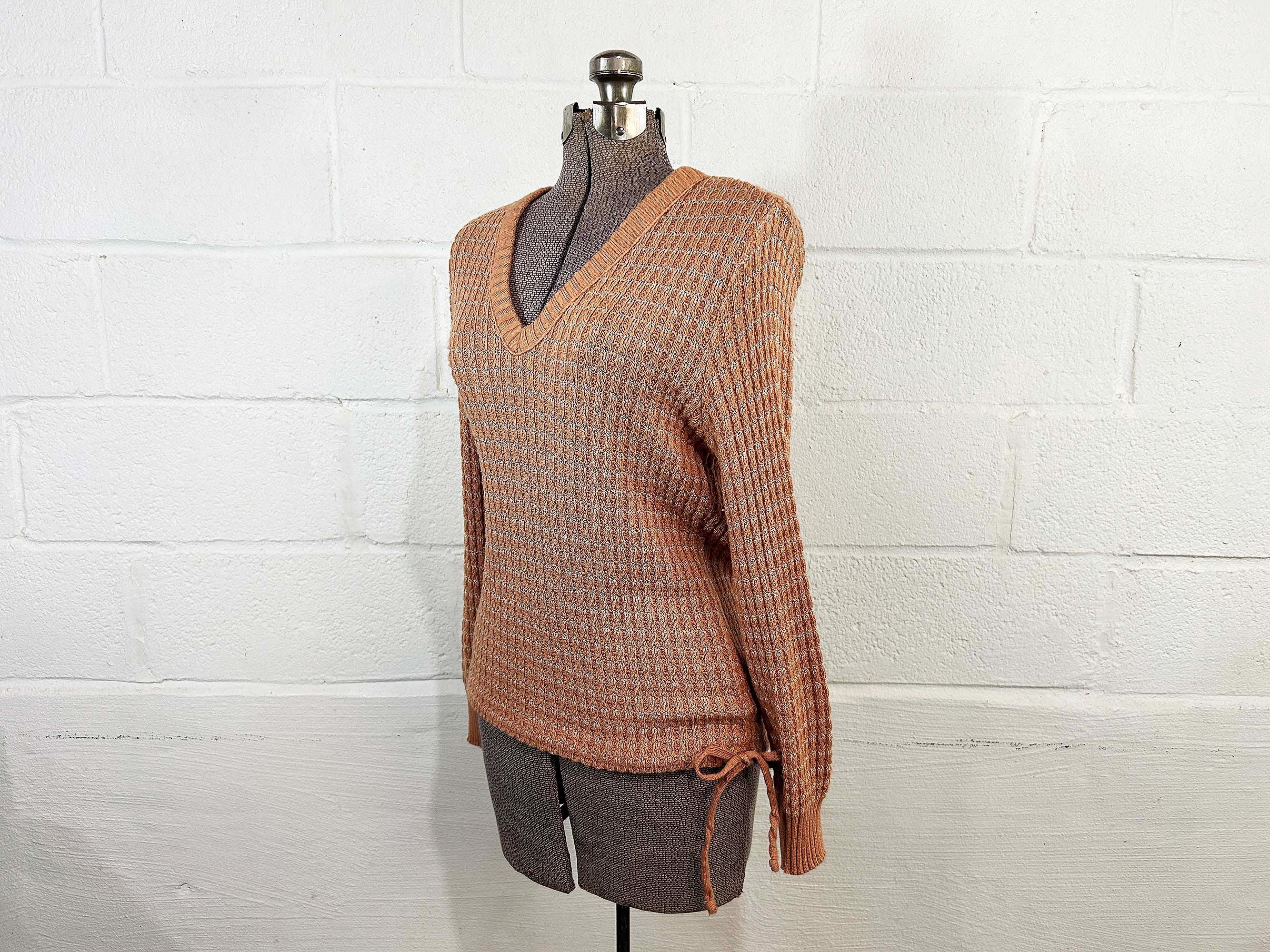 Light brown loose knit, deep v neck long sleeve sweater. Pullover style with a tie at the bottom hem. In great condition with no significant flaws. Fabric has stretch.
