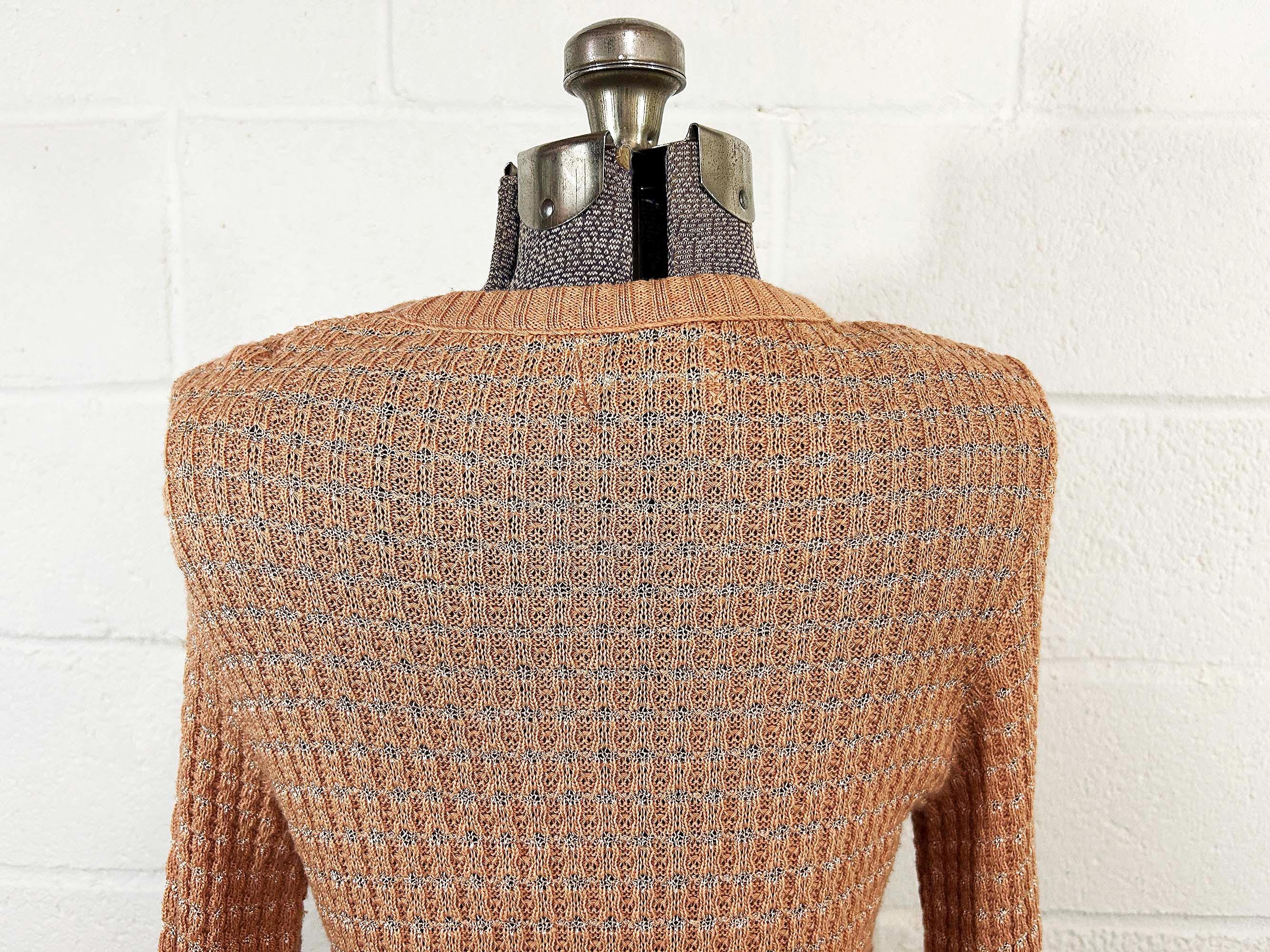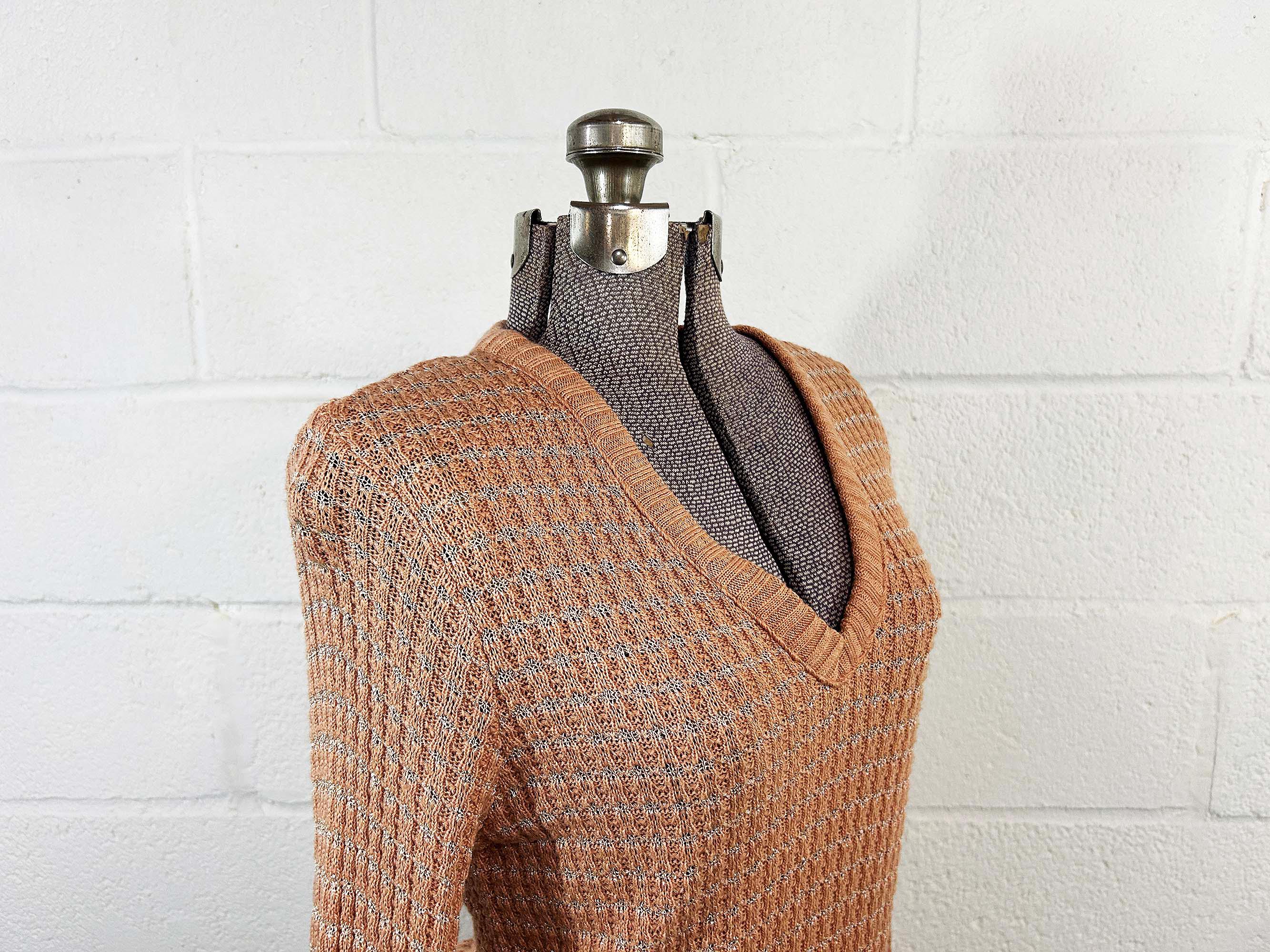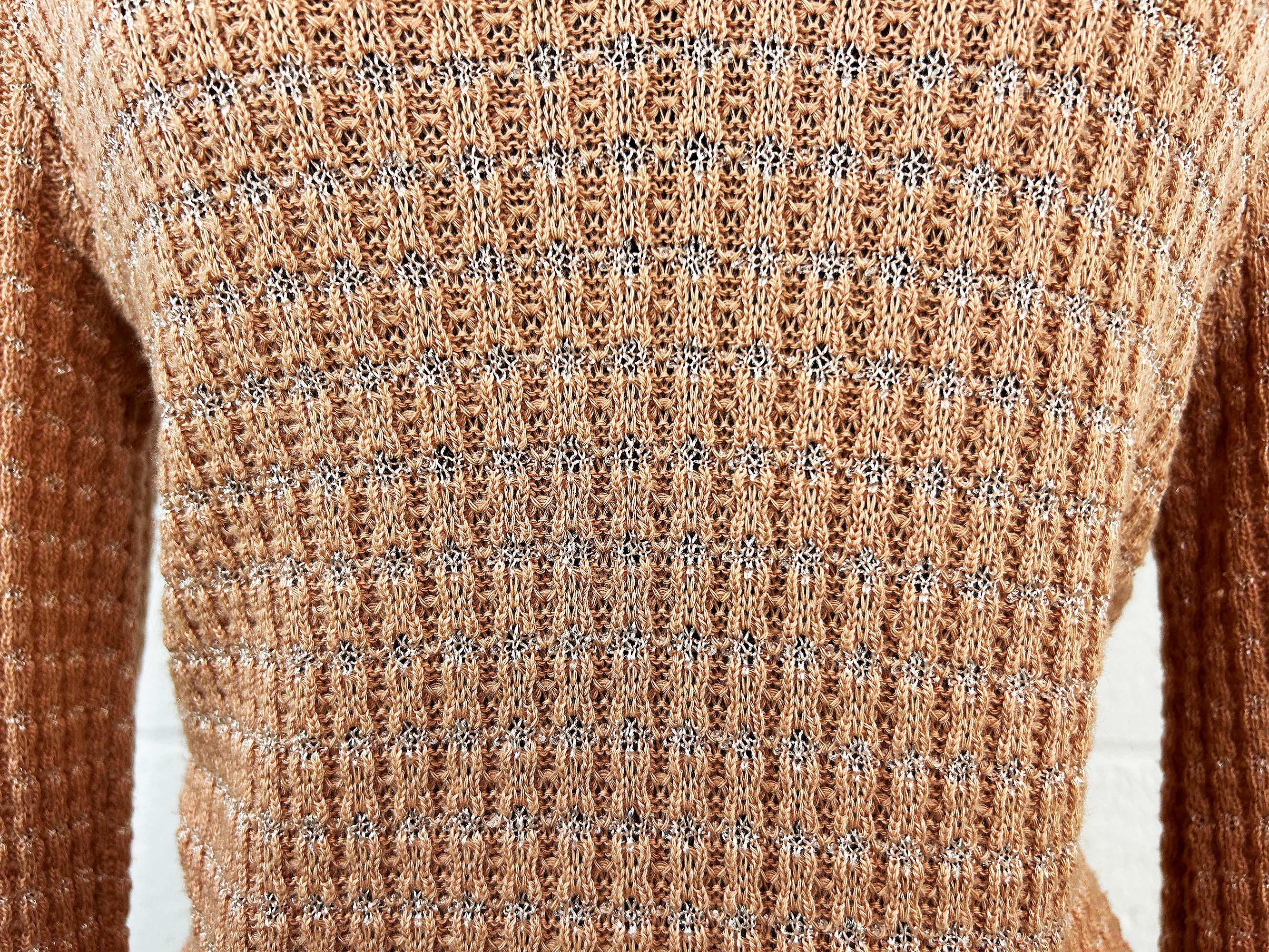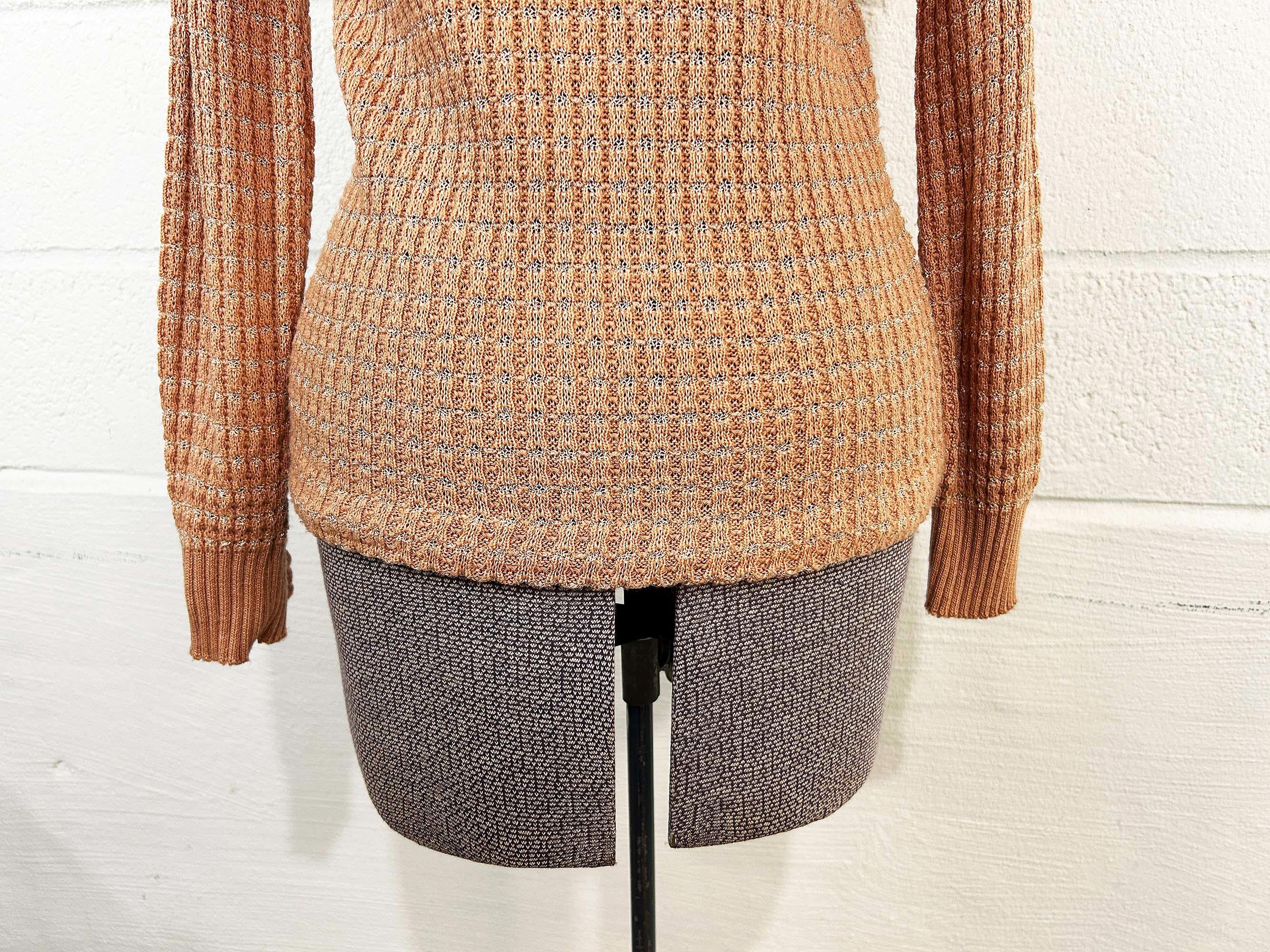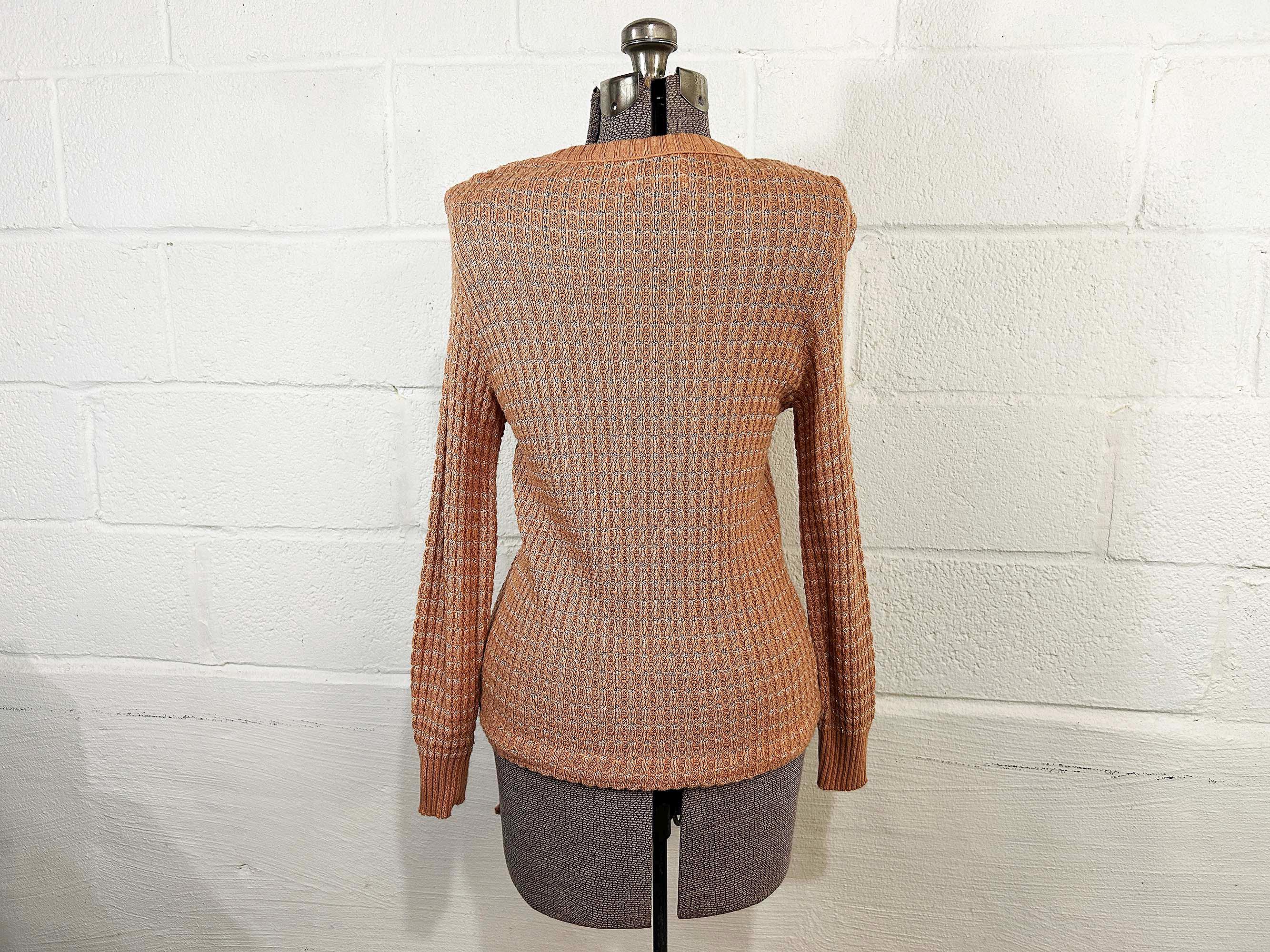 Light brown loose knit, deep v neck long sleeve sweater. Pullover style with a tie at the bottom hem. In great condition with no significant flaws. Fabric has stretch.