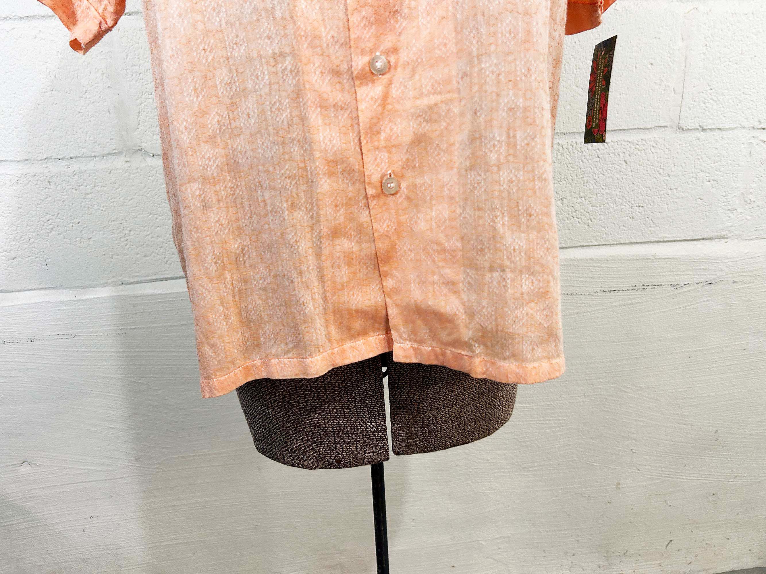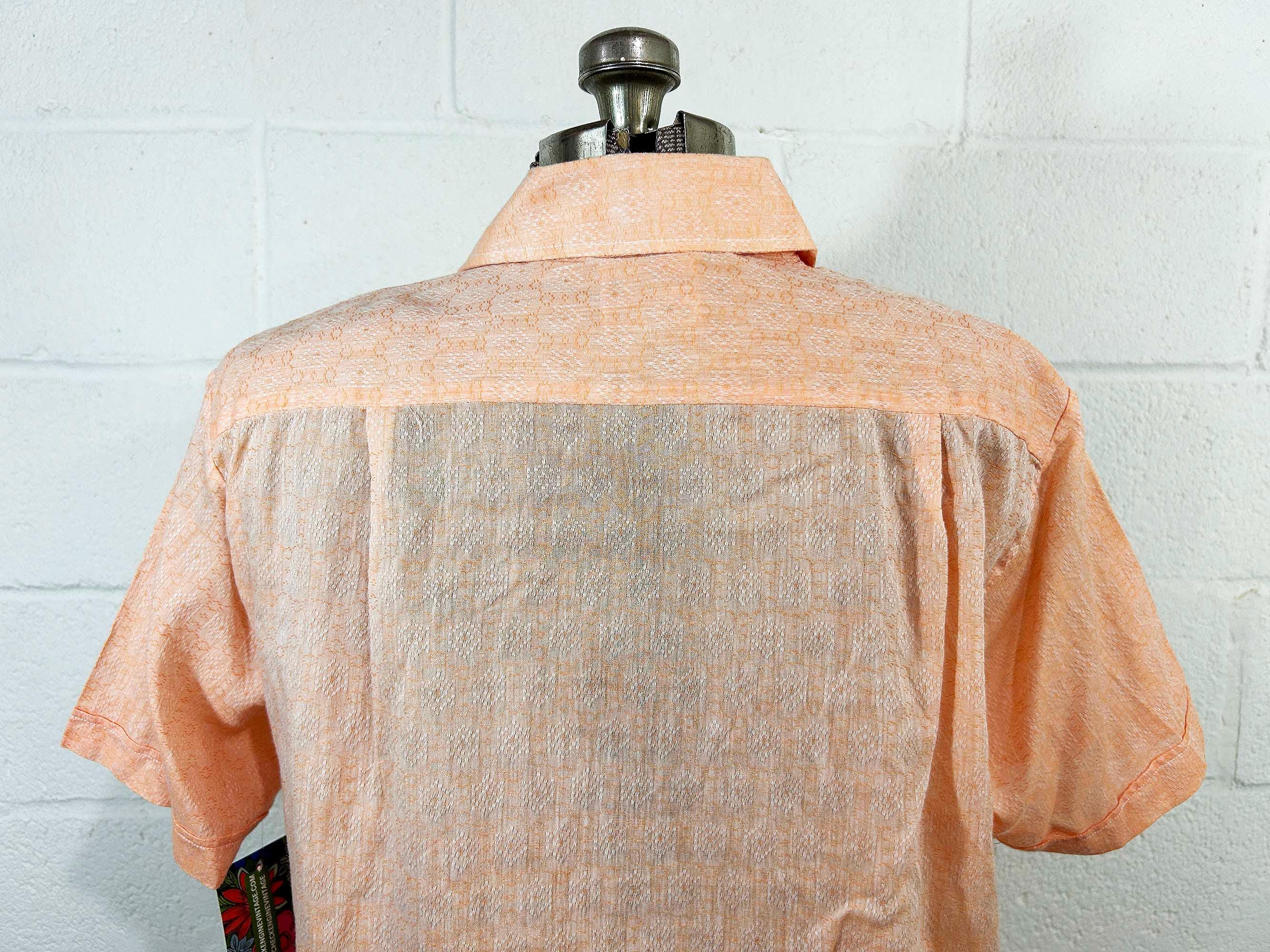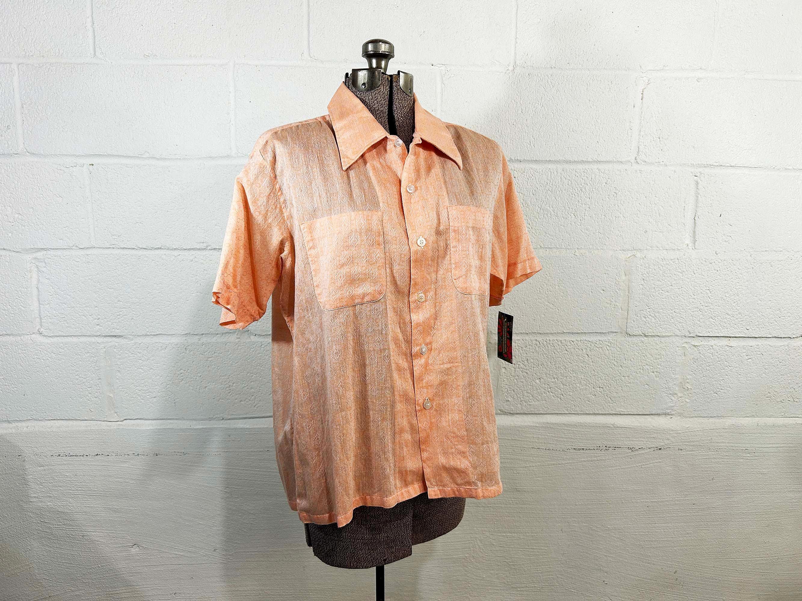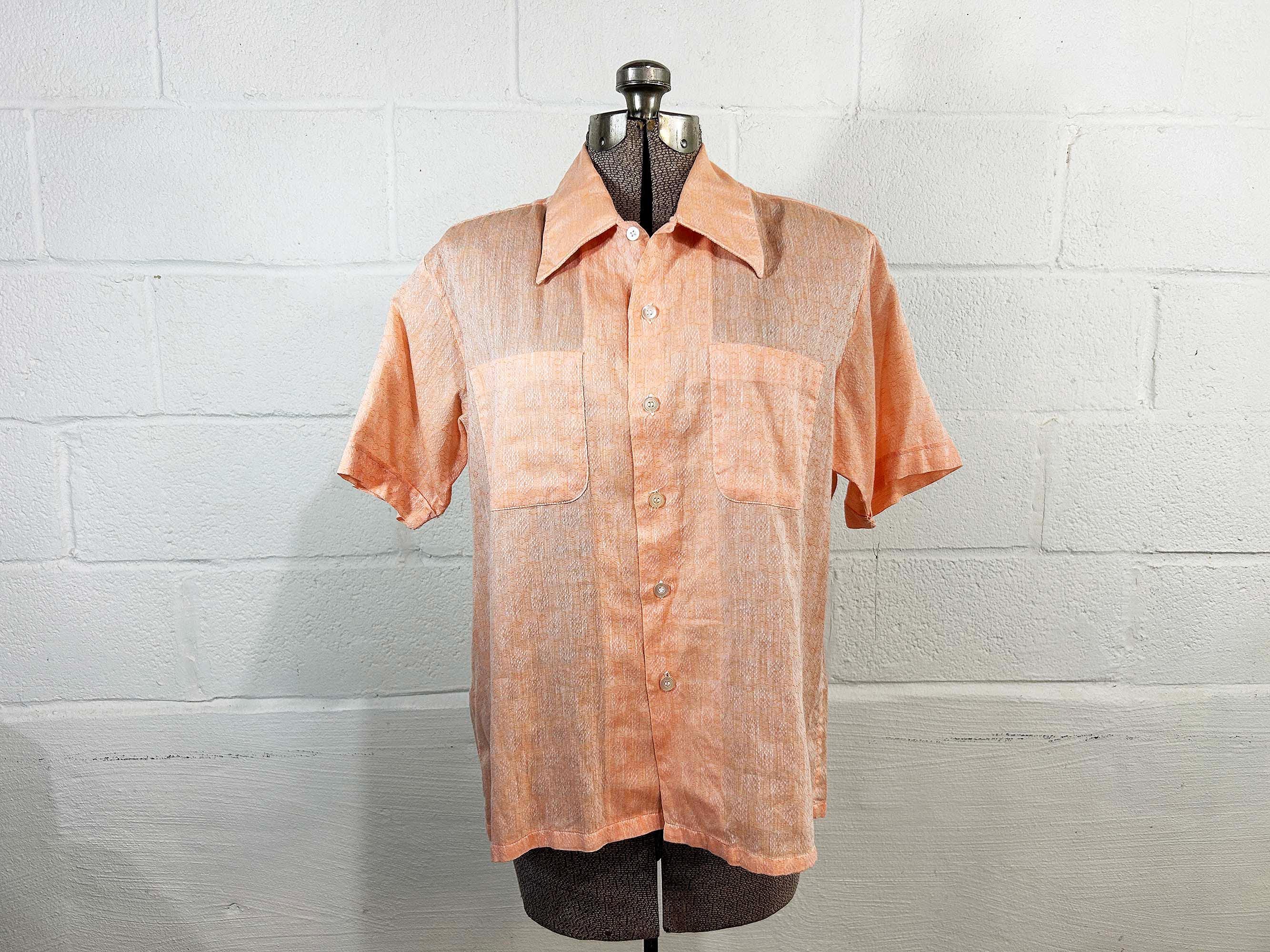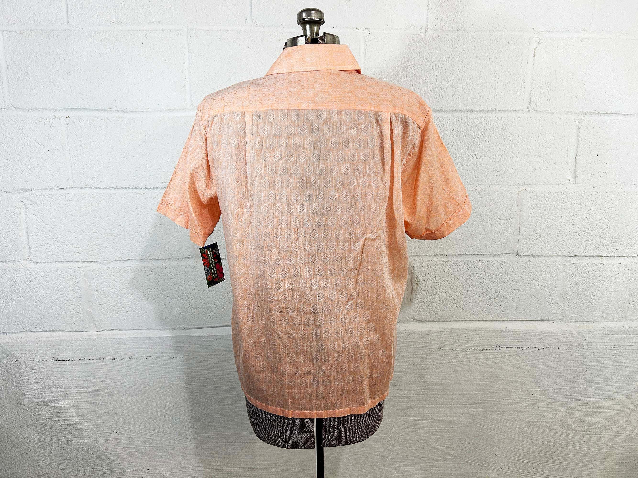 Great orange-y pink button up short sleeved shirt. It is in good shape with no significant flaws. Button up with a straight collar and 2 front chest pockets. Fabric is lightweight with some texture, sheer, and has NO stretch.