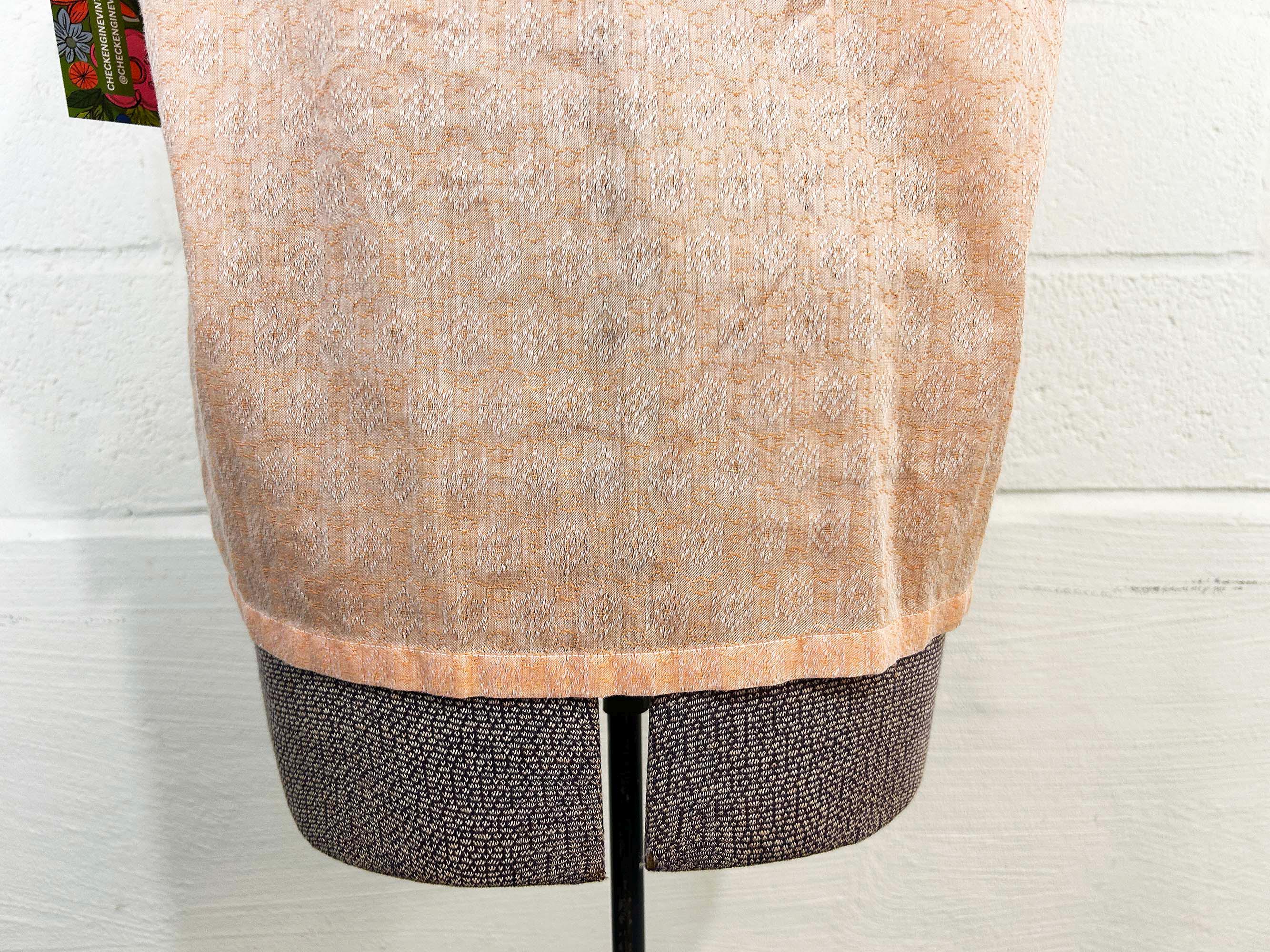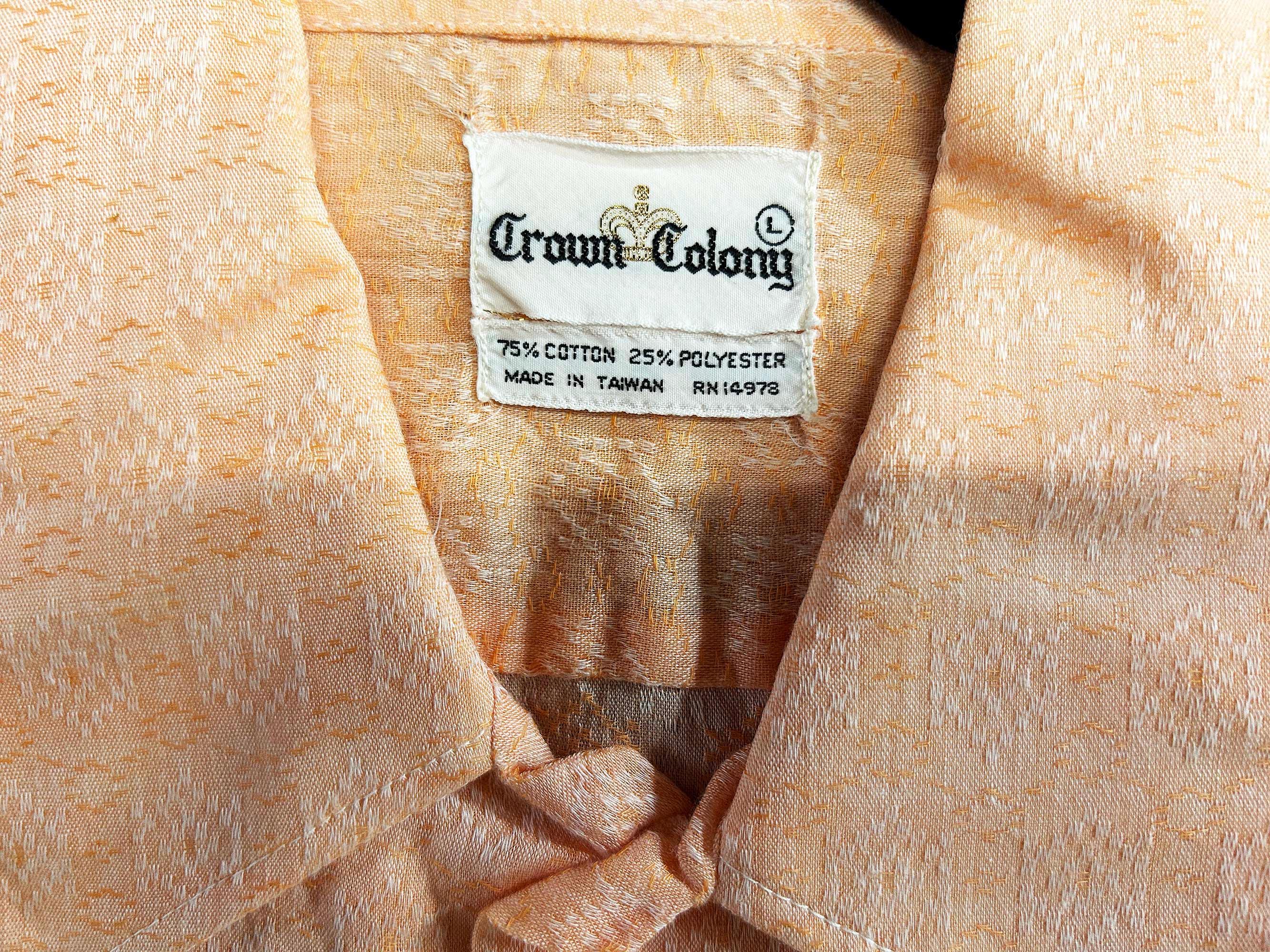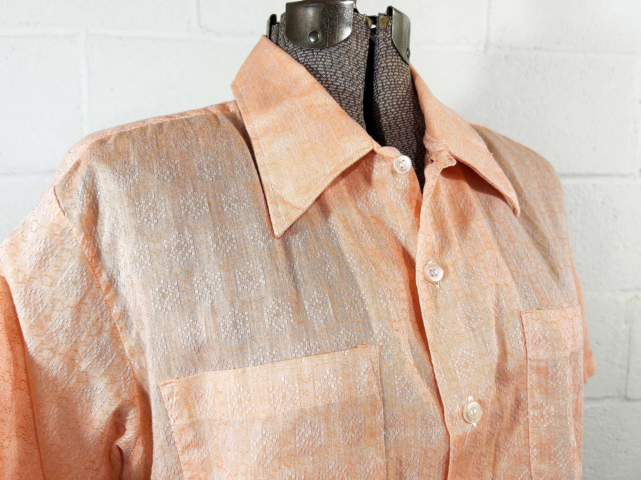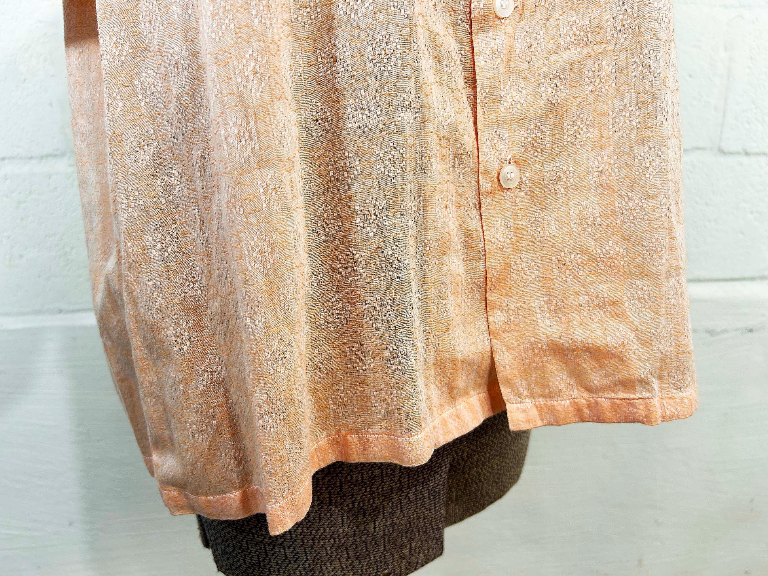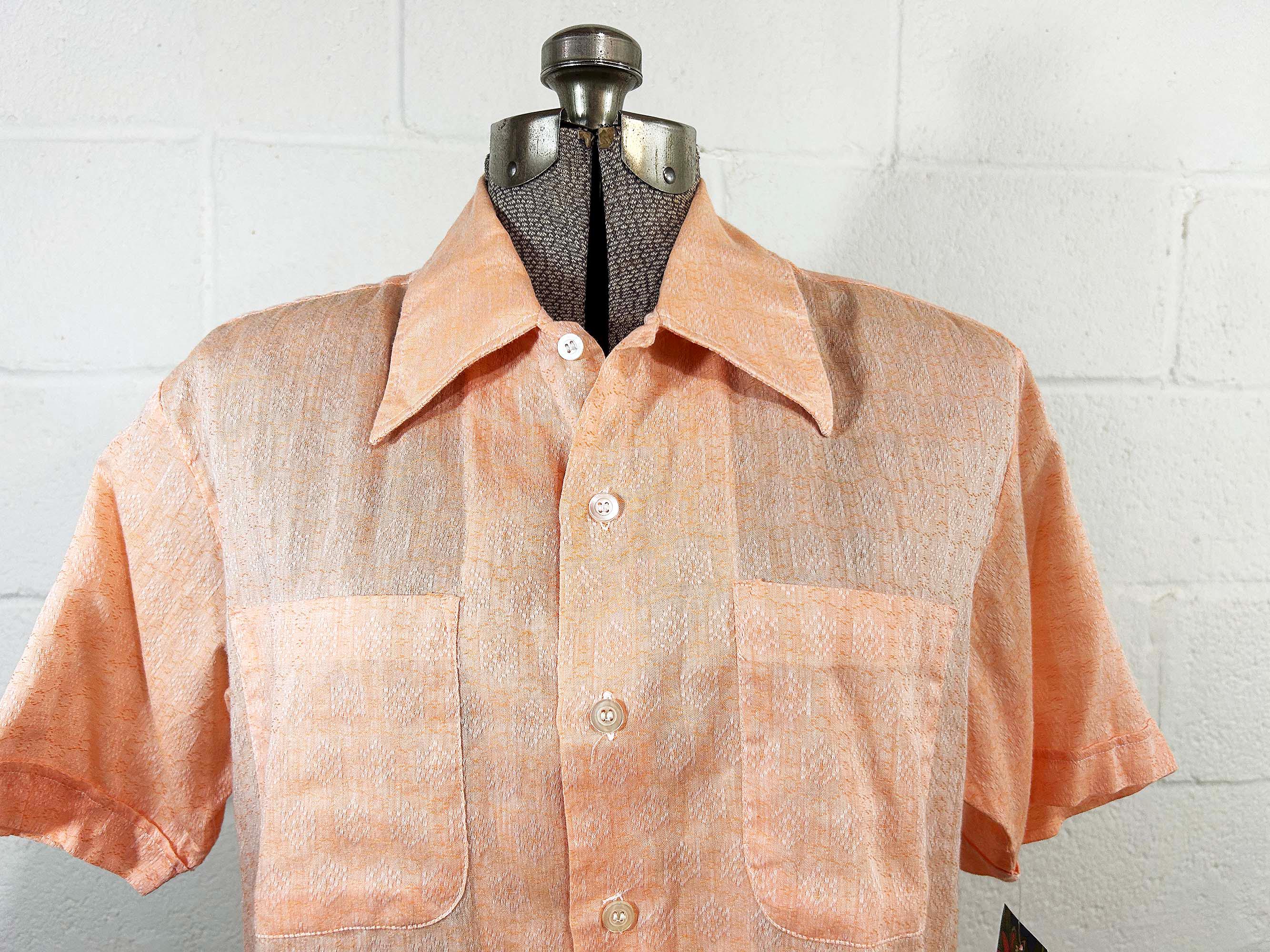 Great orange-y pink button up short sleeved shirt. It is in good shape with no significant flaws. Button up with a straight collar and 2 front chest pockets. Fabric is lightweight with some texture, sheer, and has NO stretch.