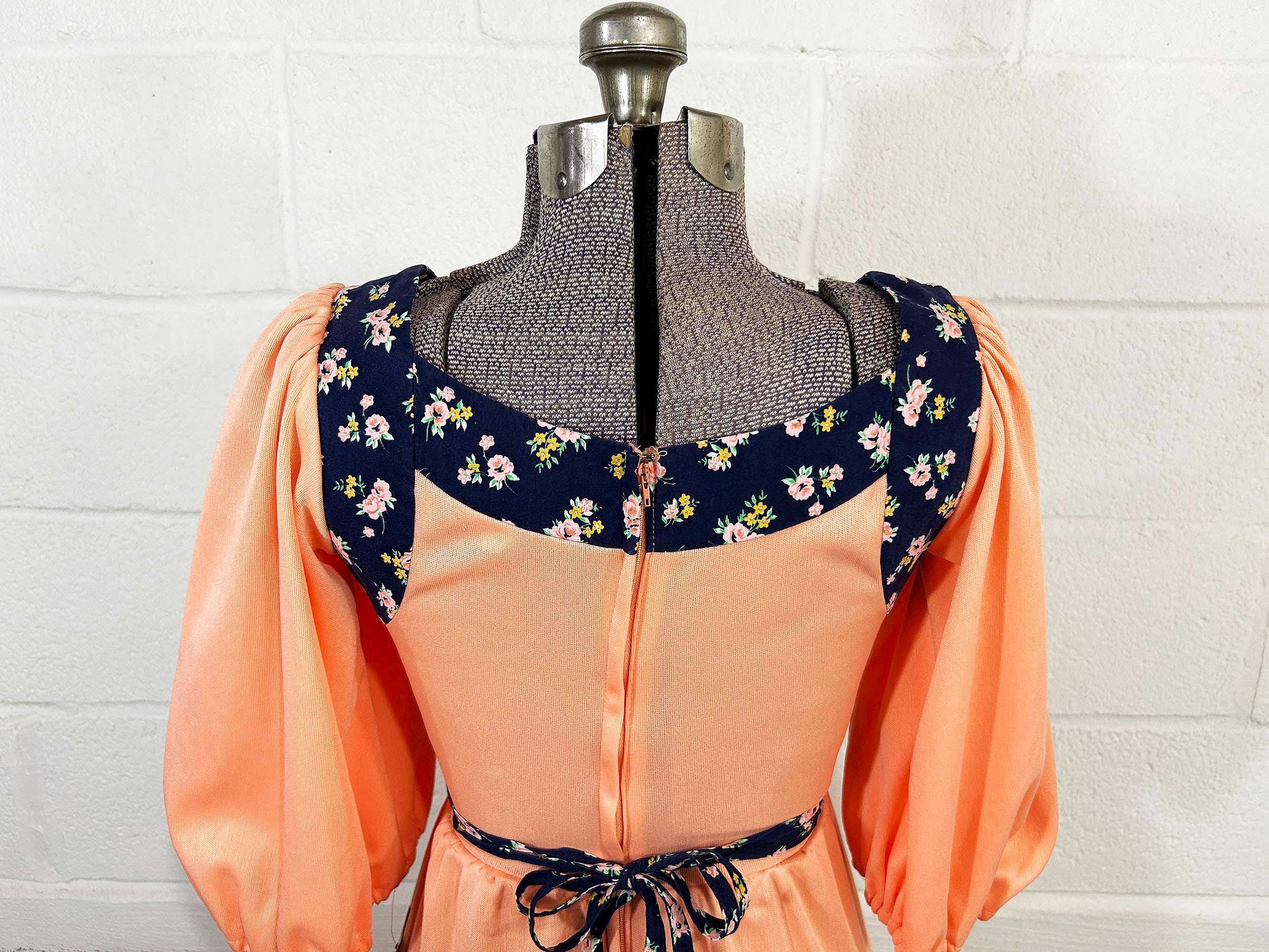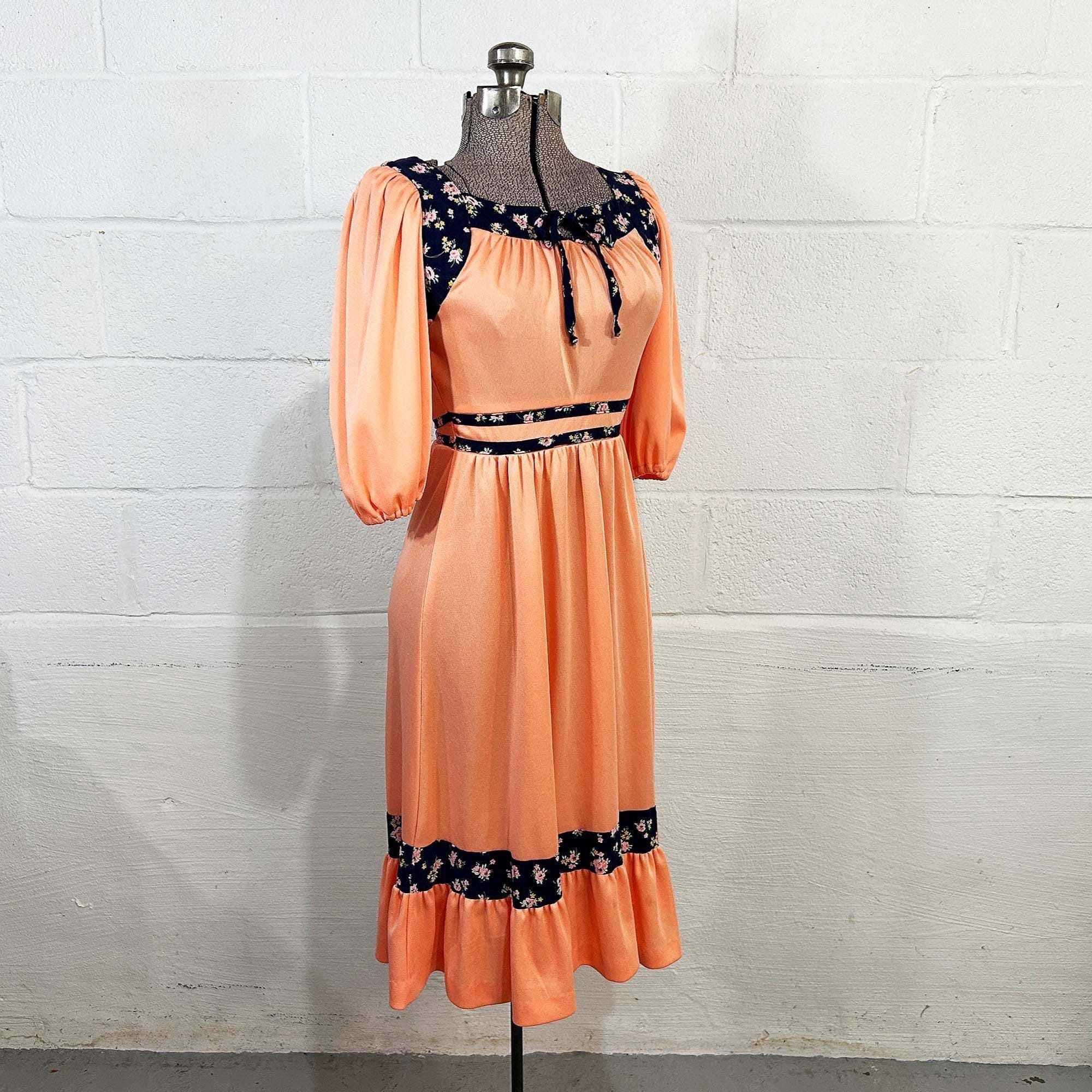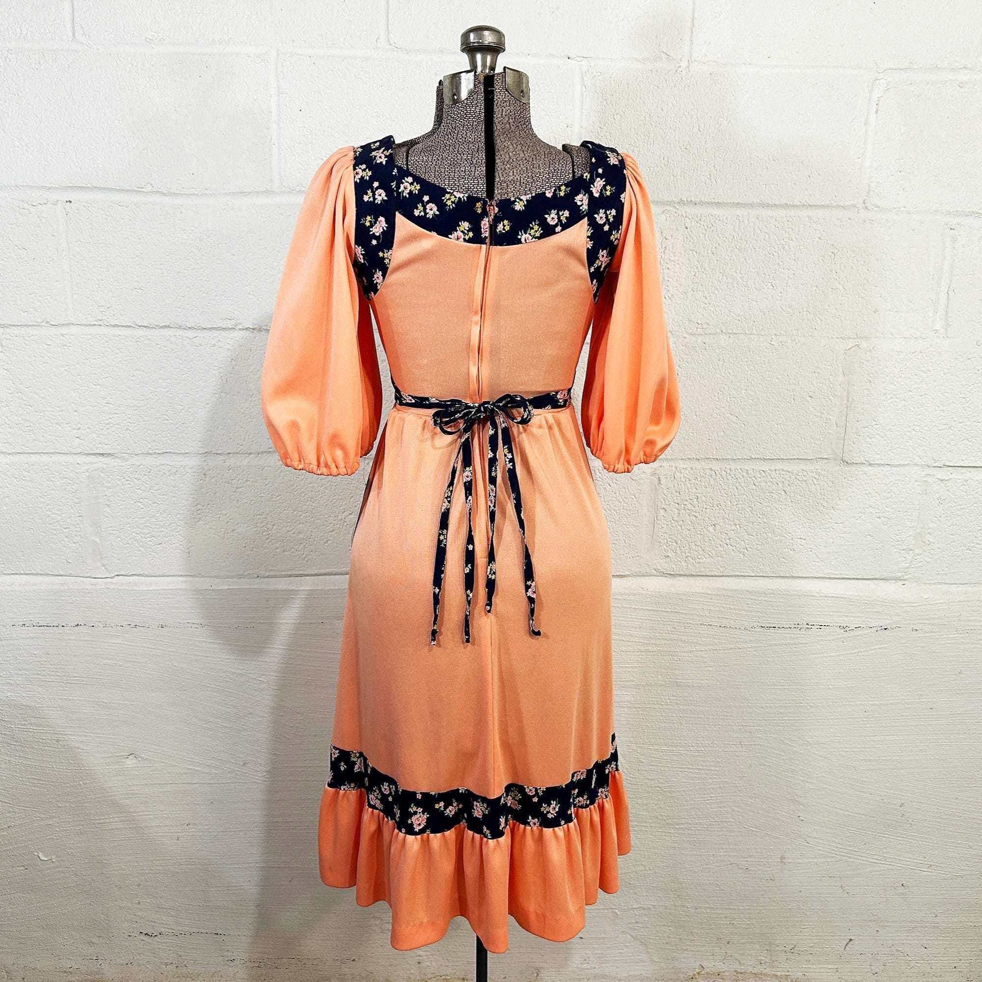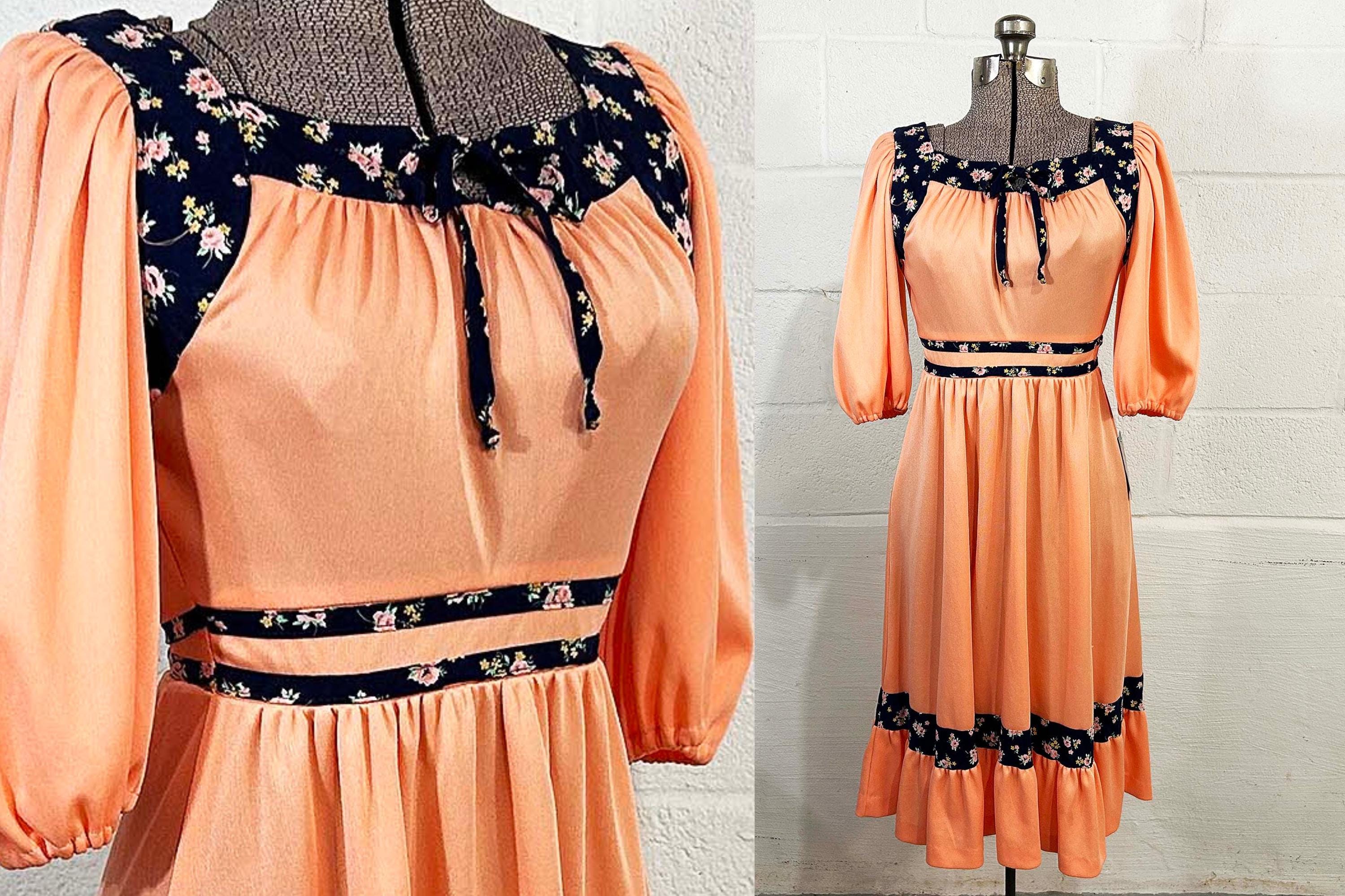 Incredible peach milkmaid style dress with navy blue floral trim. Square neckline, fitted bodice, and fit and flare cut skirt. Half sleeves with a zipper in the back. Attached tie fabric belt. The polyester fabric has slight stretch. It is in great condition with no significant wear - please be sure to inspect all photos.