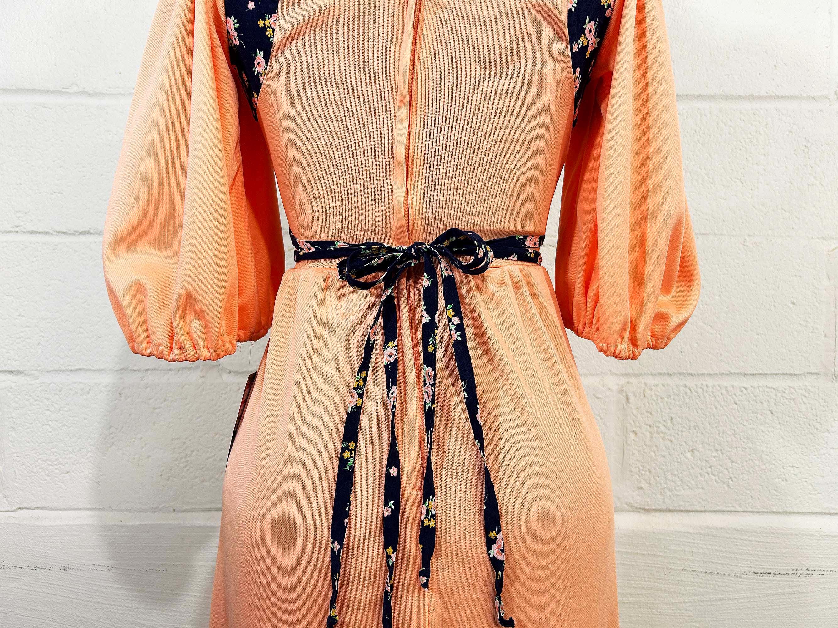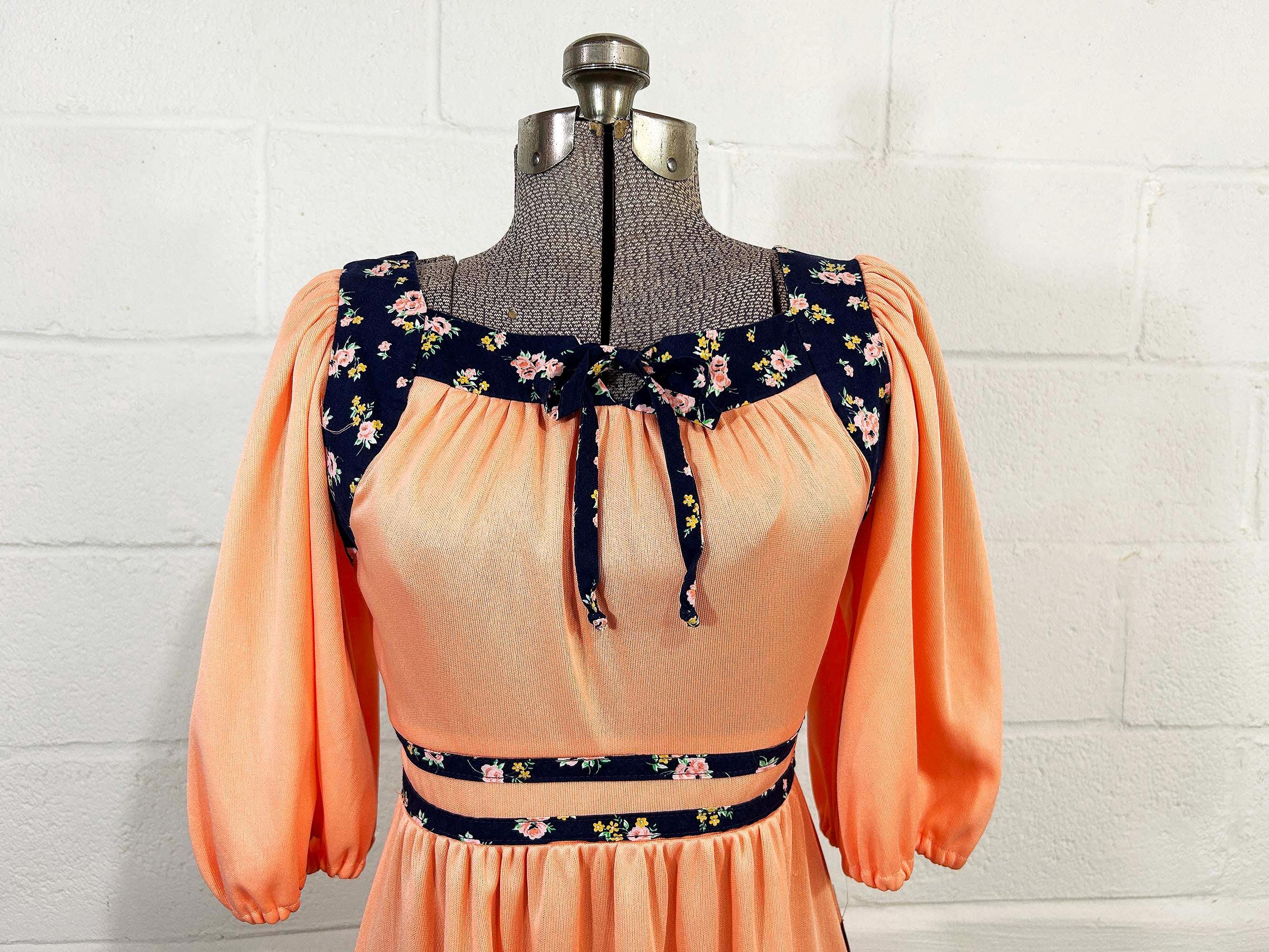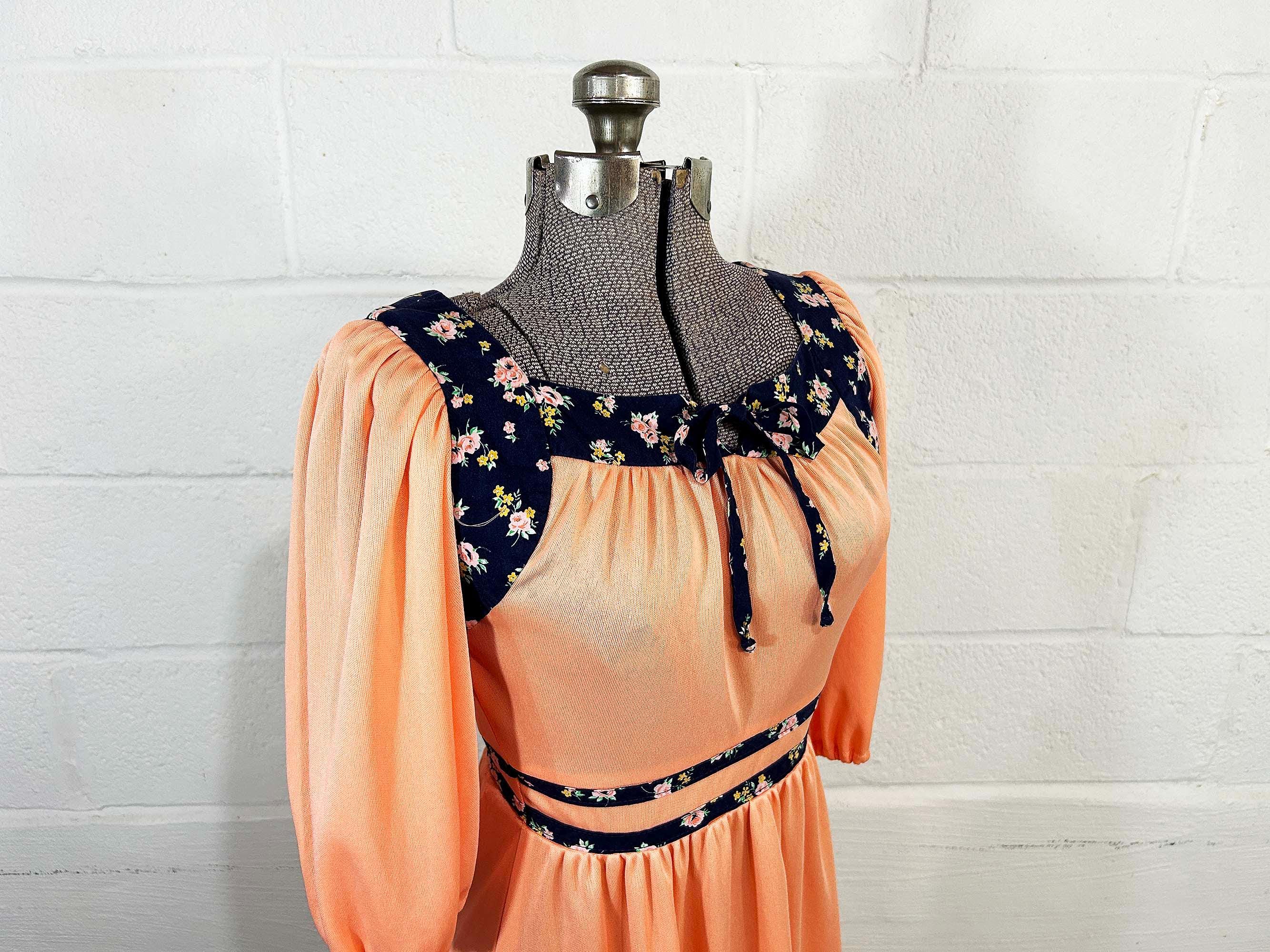 Incredible peach milkmaid style dress with navy blue floral trim. Square neckline, fitted bodice, and fit and flare cut skirt. Half sleeves with a zipper in the back. Attached tie fabric belt. The polyester fabric has slight stretch. It is in great condition with no significant wear - please be sure to inspect all photos.