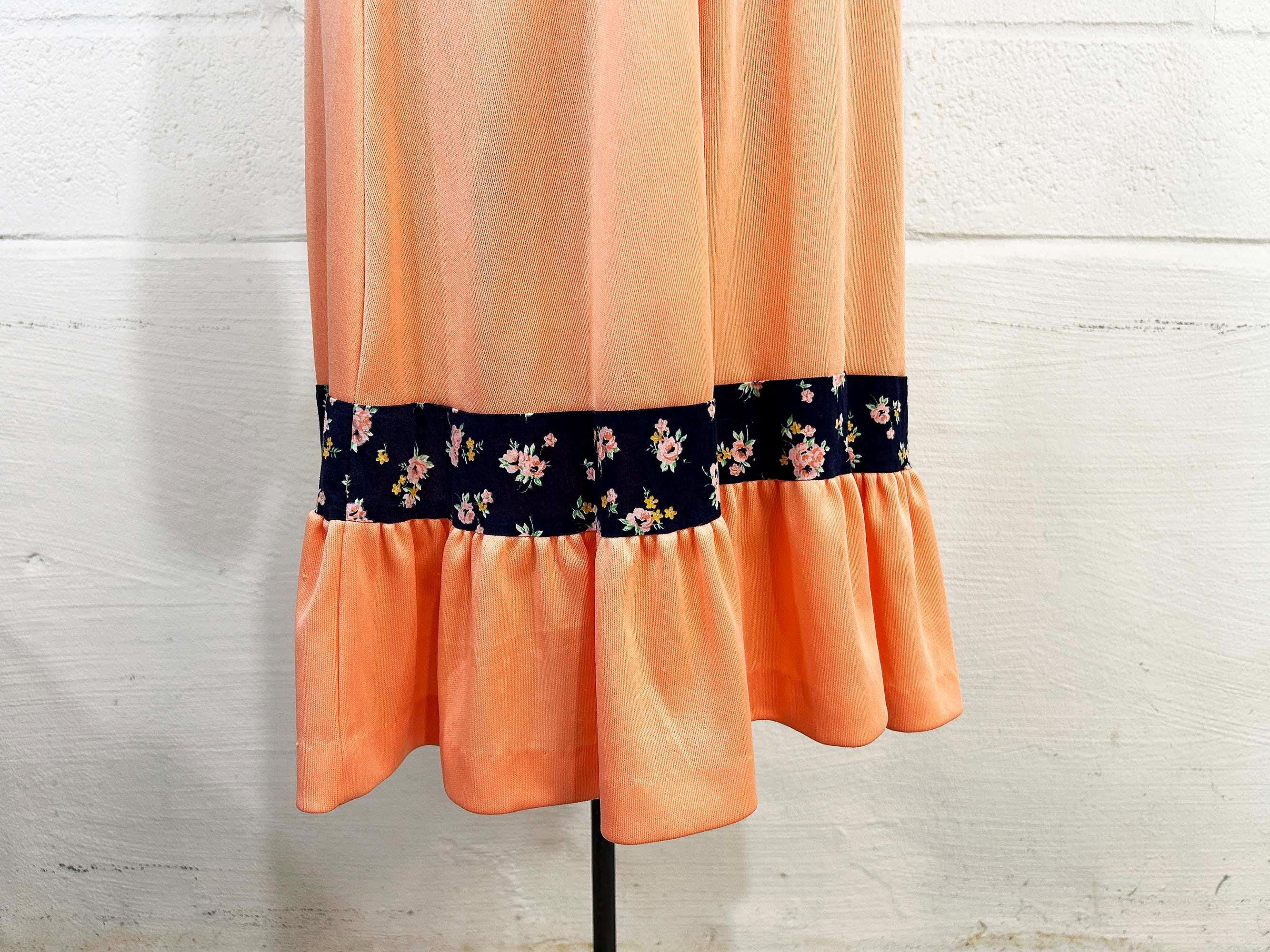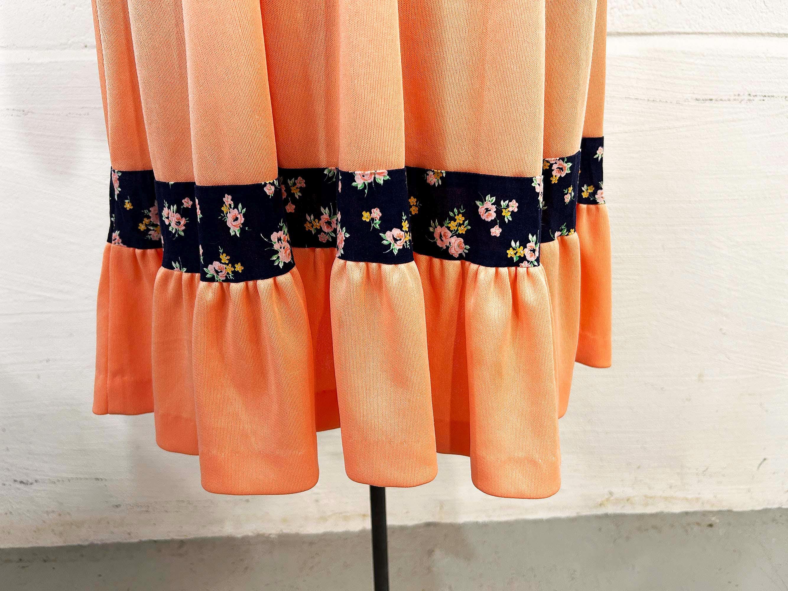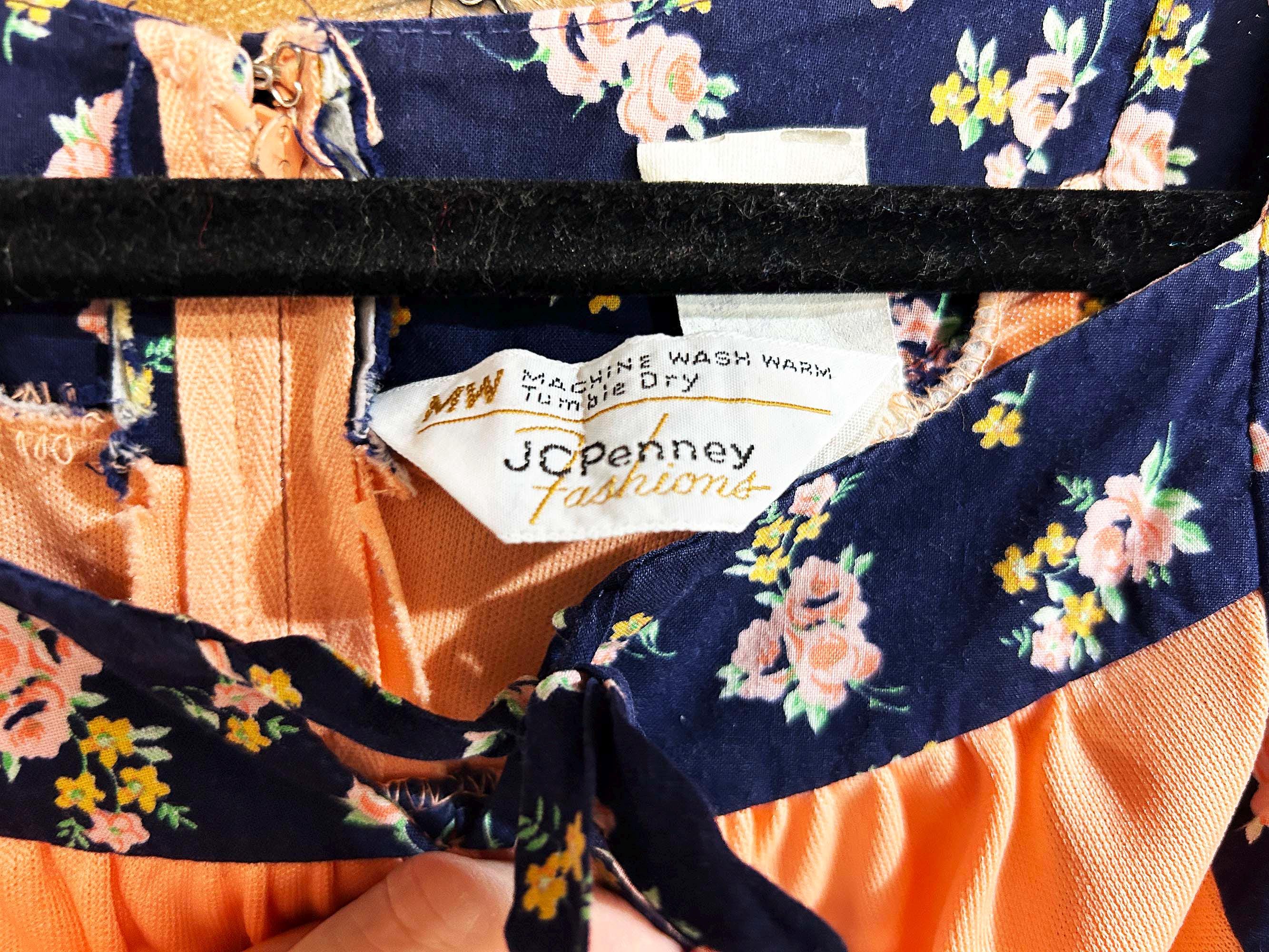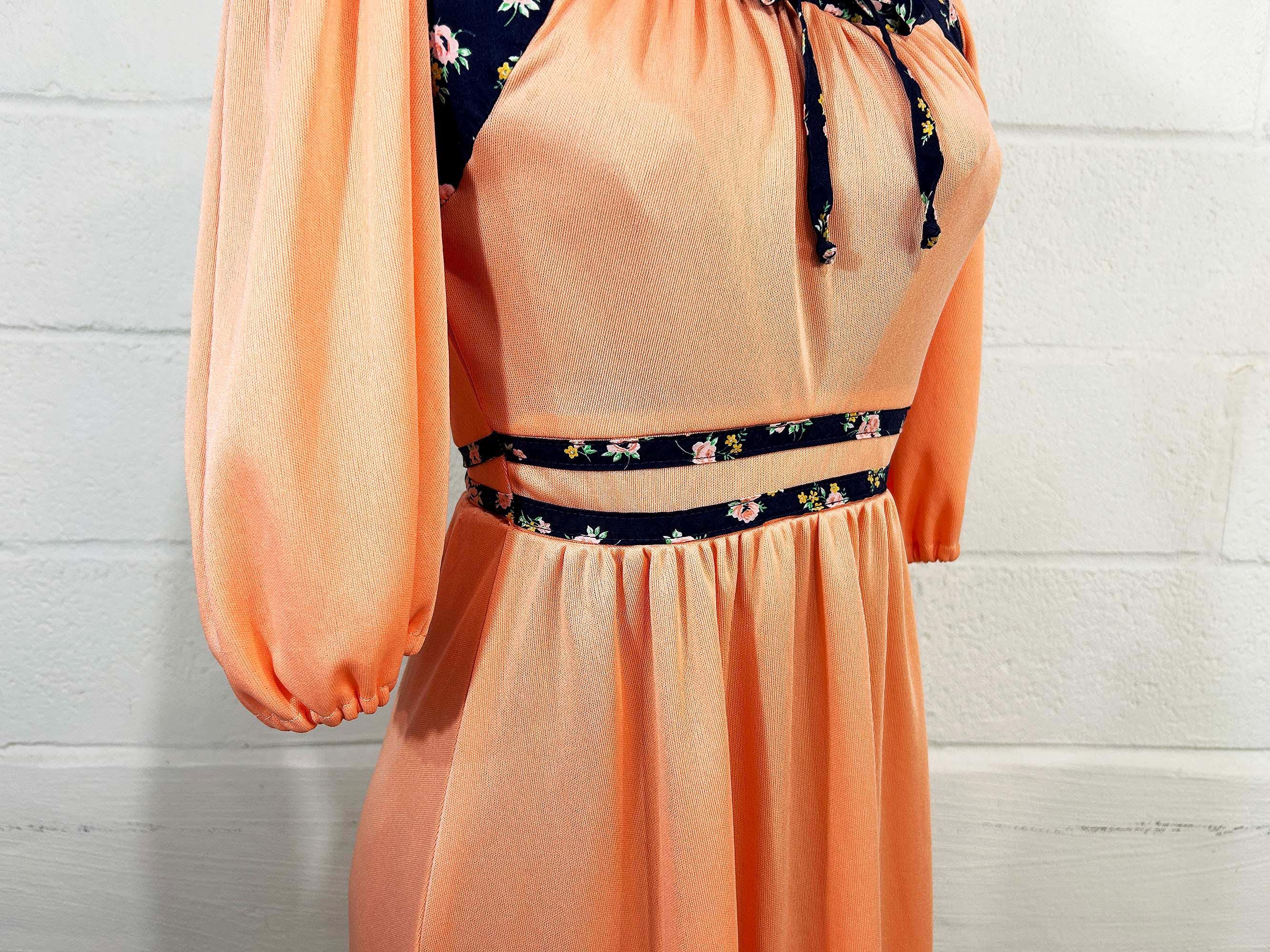 Incredible peach milkmaid style dress with navy blue floral trim. Square neckline, fitted bodice, and fit and flare cut skirt. Half sleeves with a zipper in the back. Attached tie fabric belt. The polyester fabric has slight stretch. It is in great condition with no significant wear - please be sure to inspect all photos.