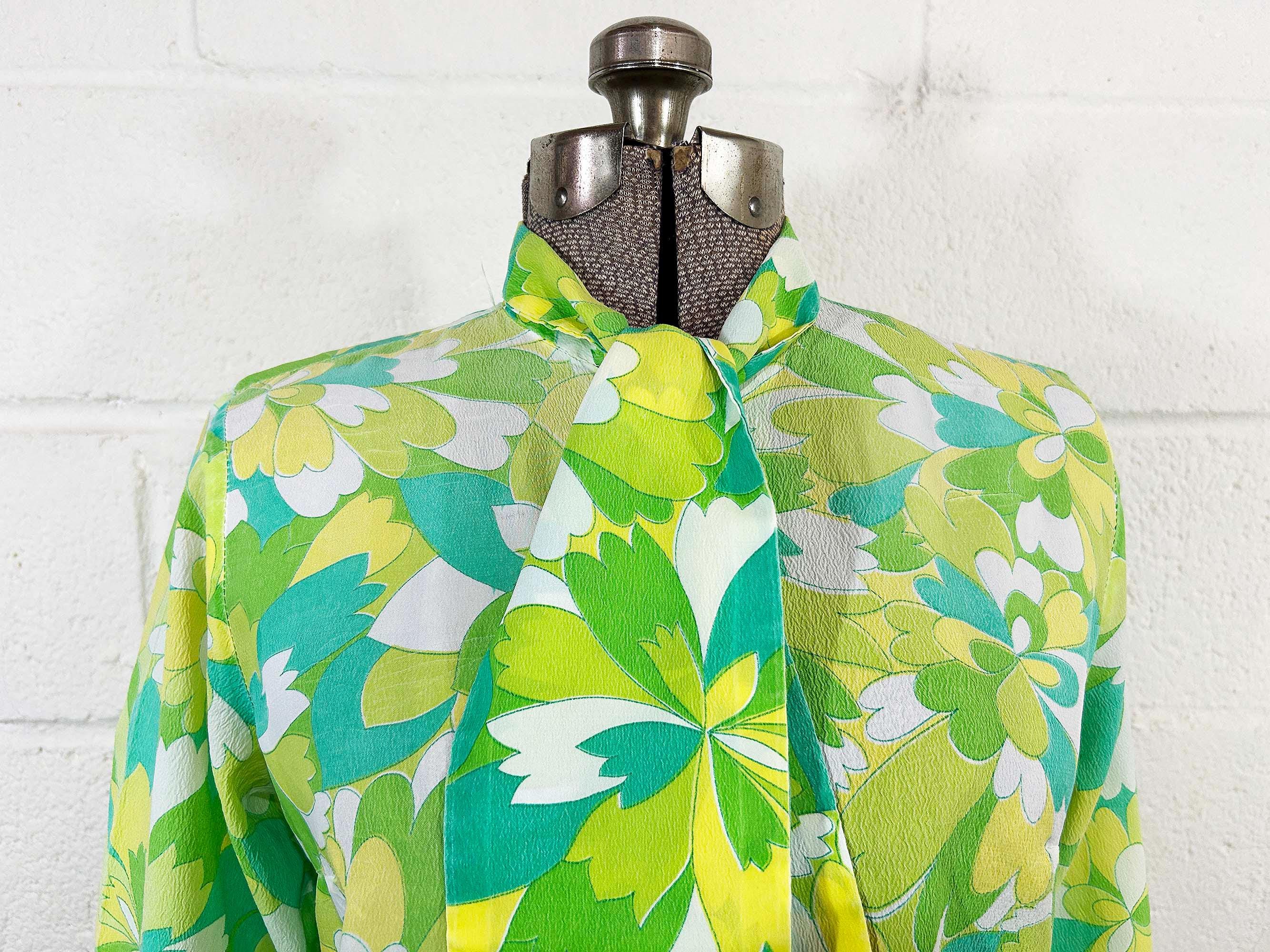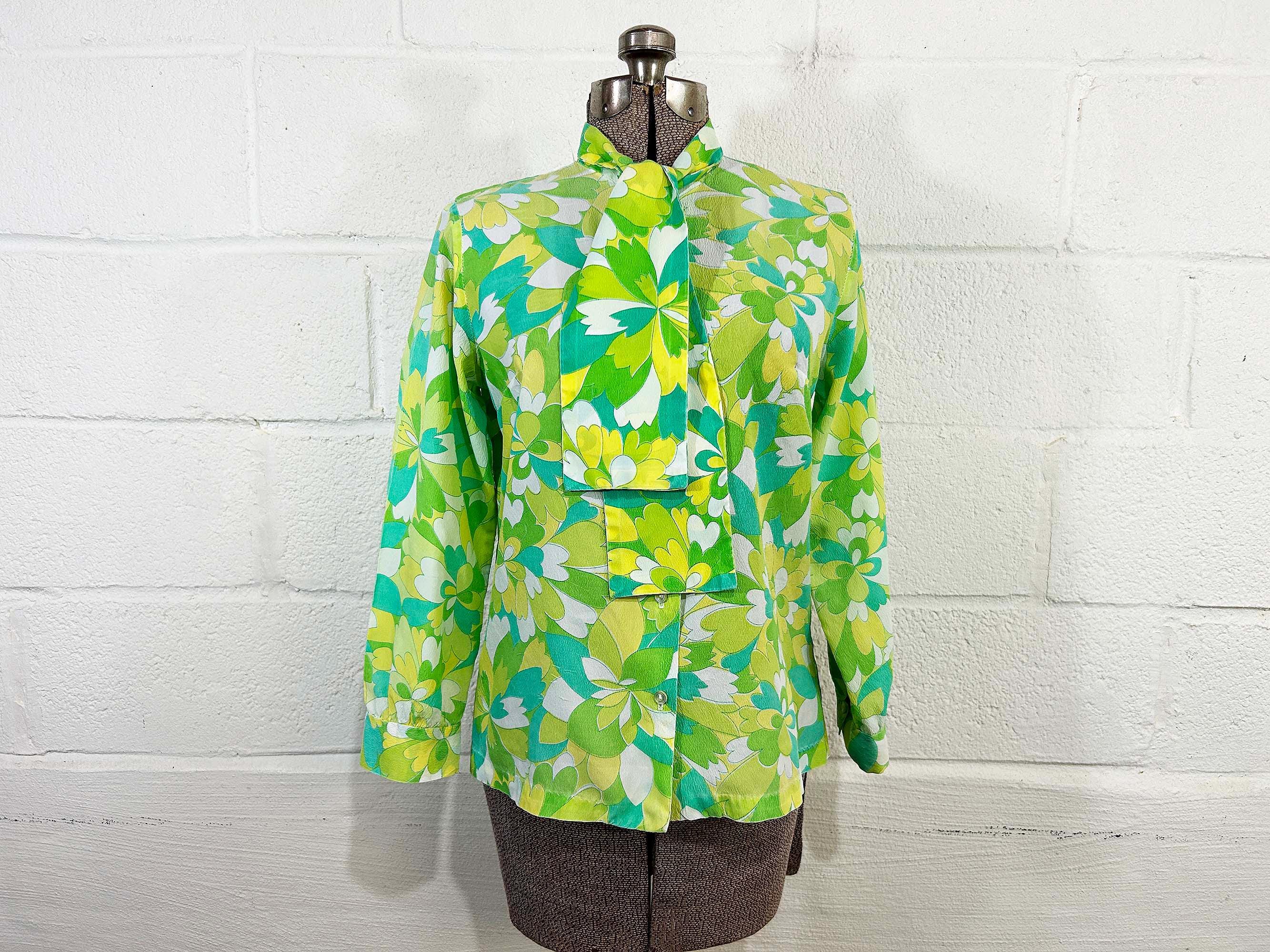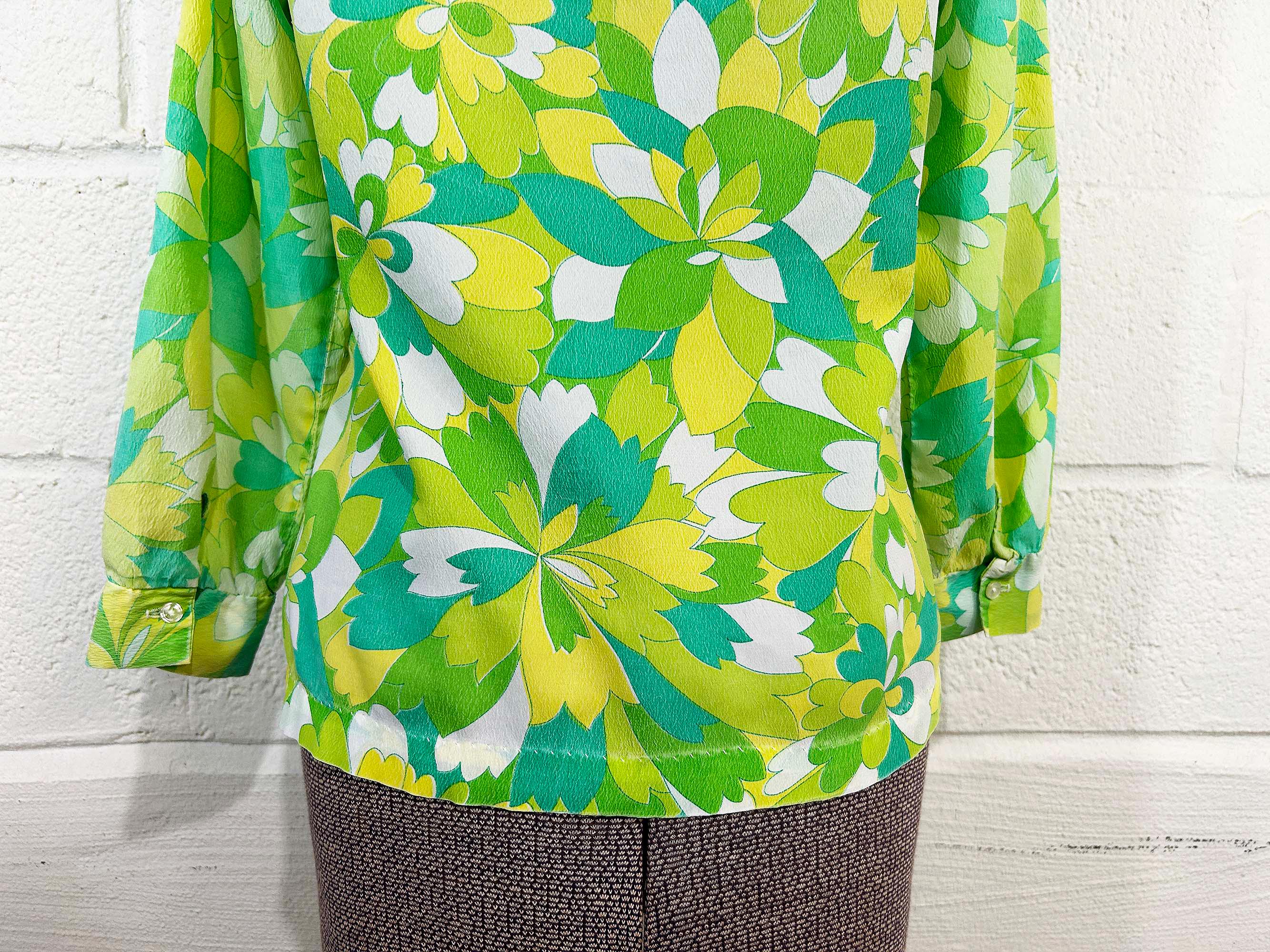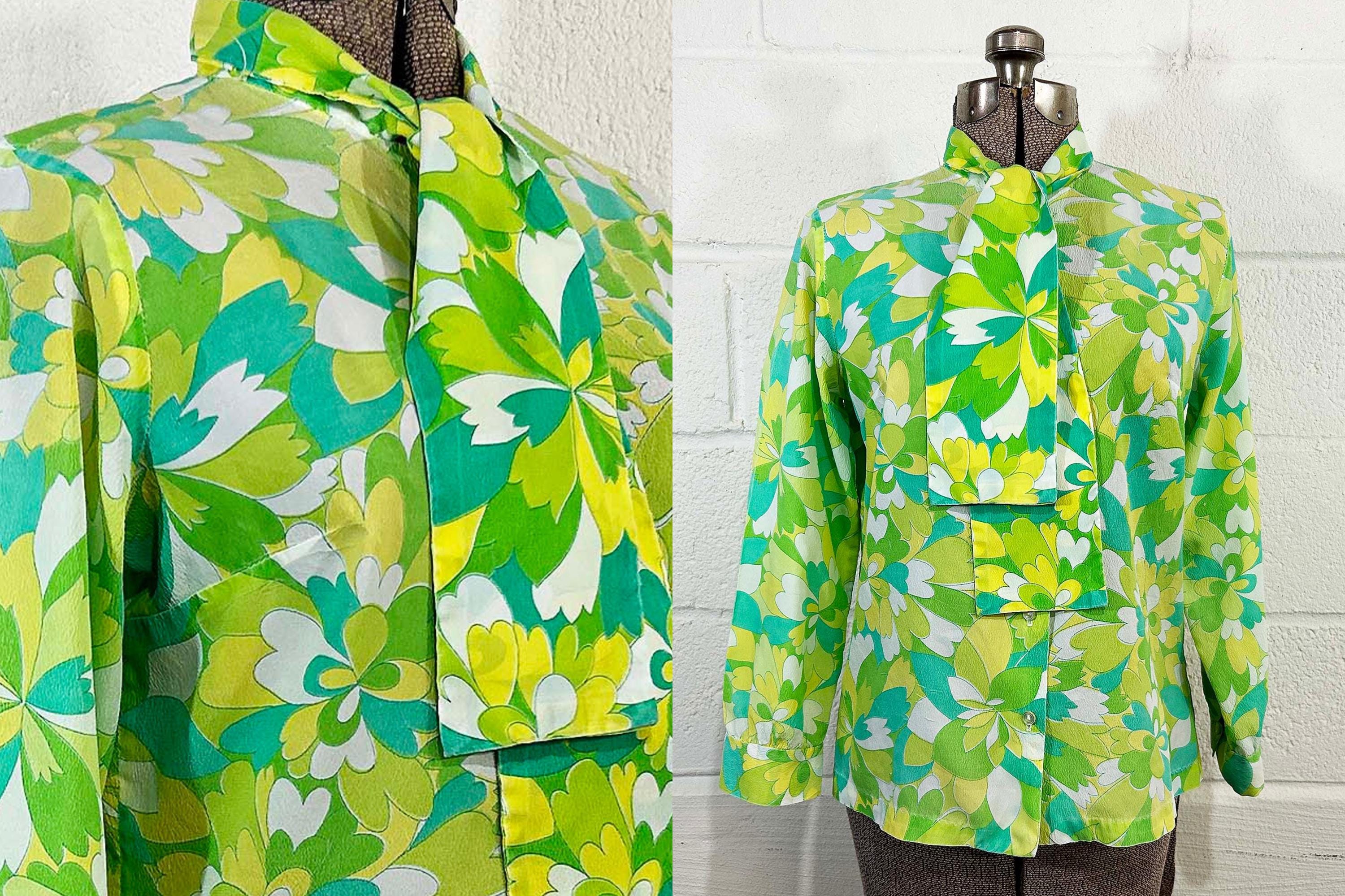 Cute bright green floral patterned long-sleeved top with a pussybow collar. Top is in good vintage condition - there is some all over fading on the print and some pulls at the seams - please be sure to inspect all photos closely. Button front style with buttons at the wrists. Fabric has no stretch and is lightweight.