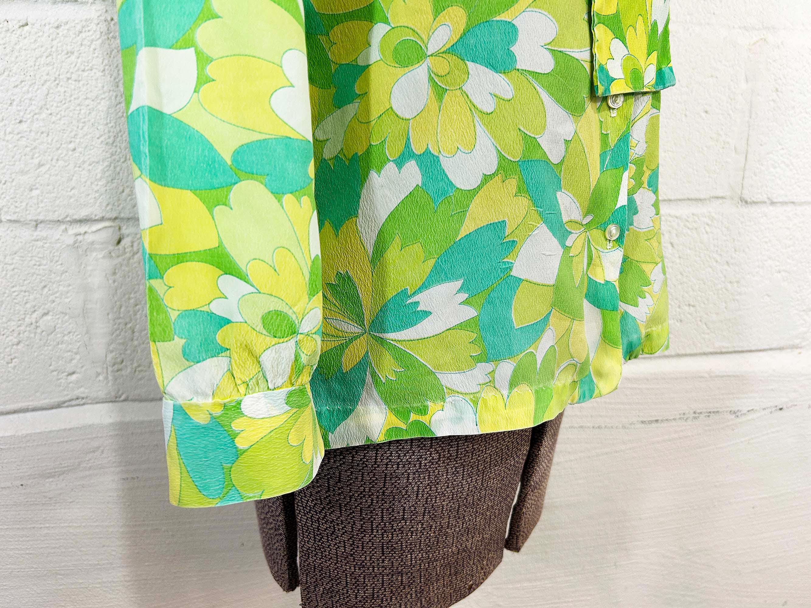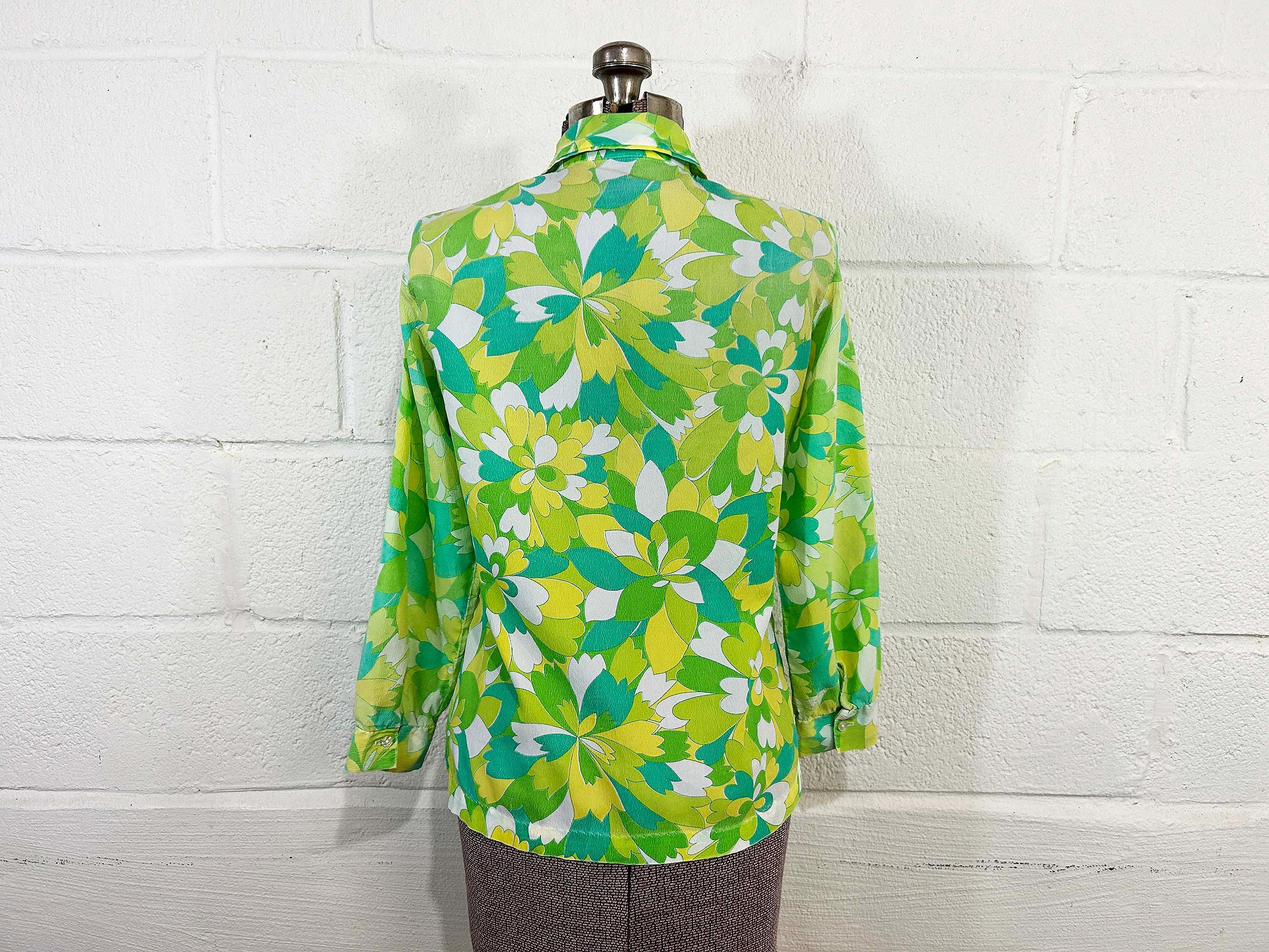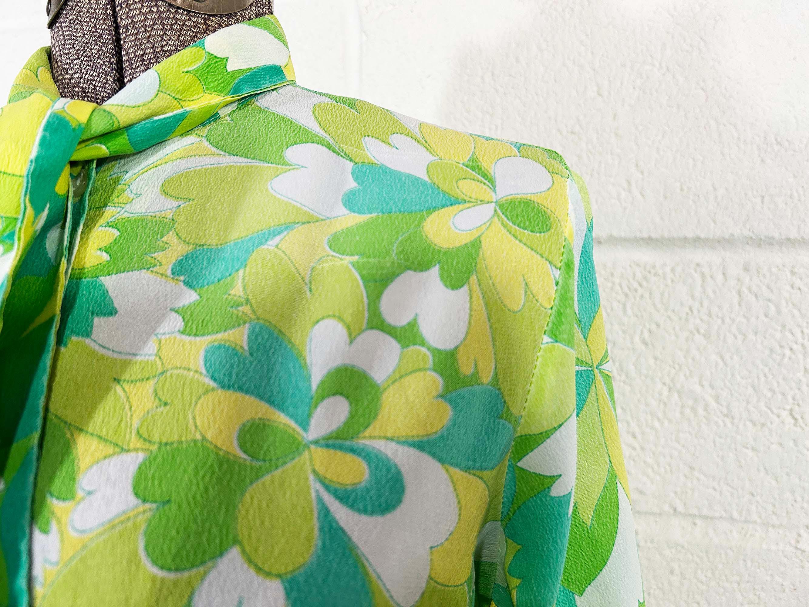 Cute bright green floral patterned long-sleeved top with a pussybow collar. Top is in good vintage condition - there is some all over fading on the print and some pulls at the seams - please be sure to inspect all photos closely. Button front style with buttons at the wrists. Fabric has no stretch and is lightweight.