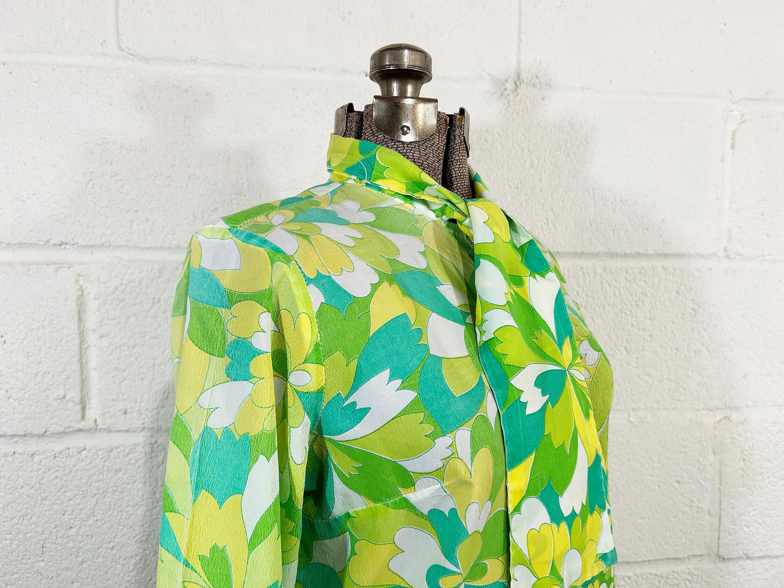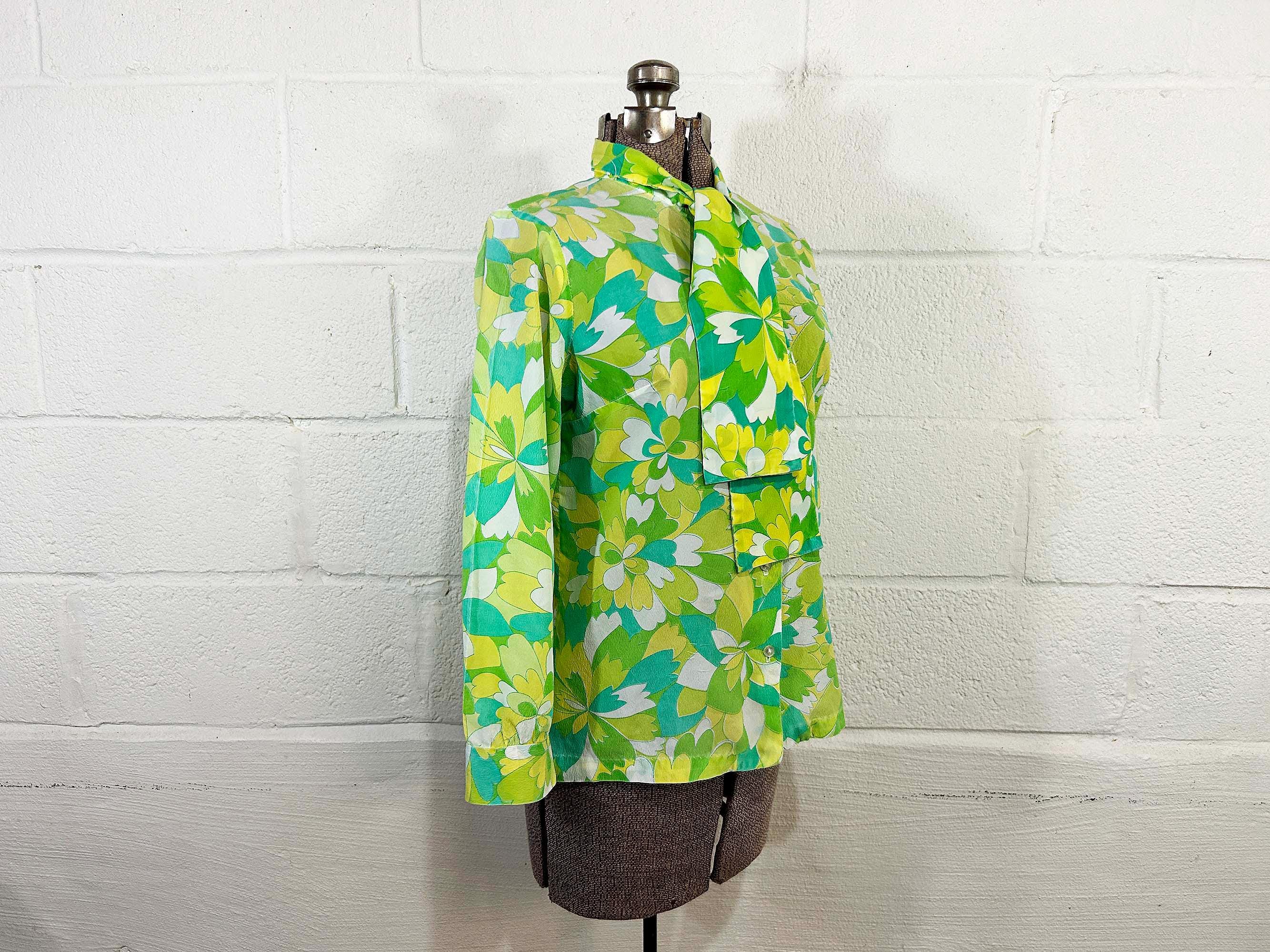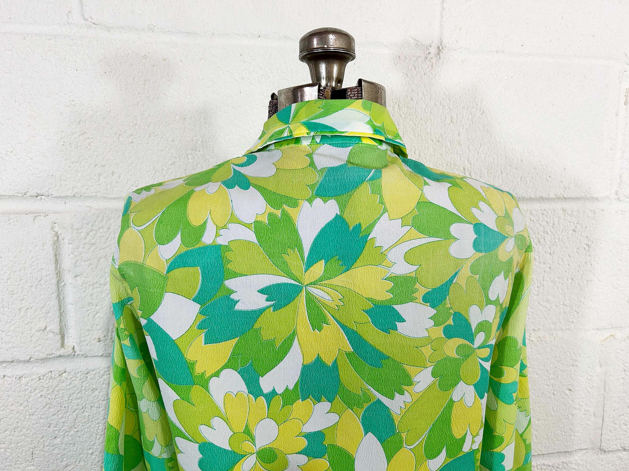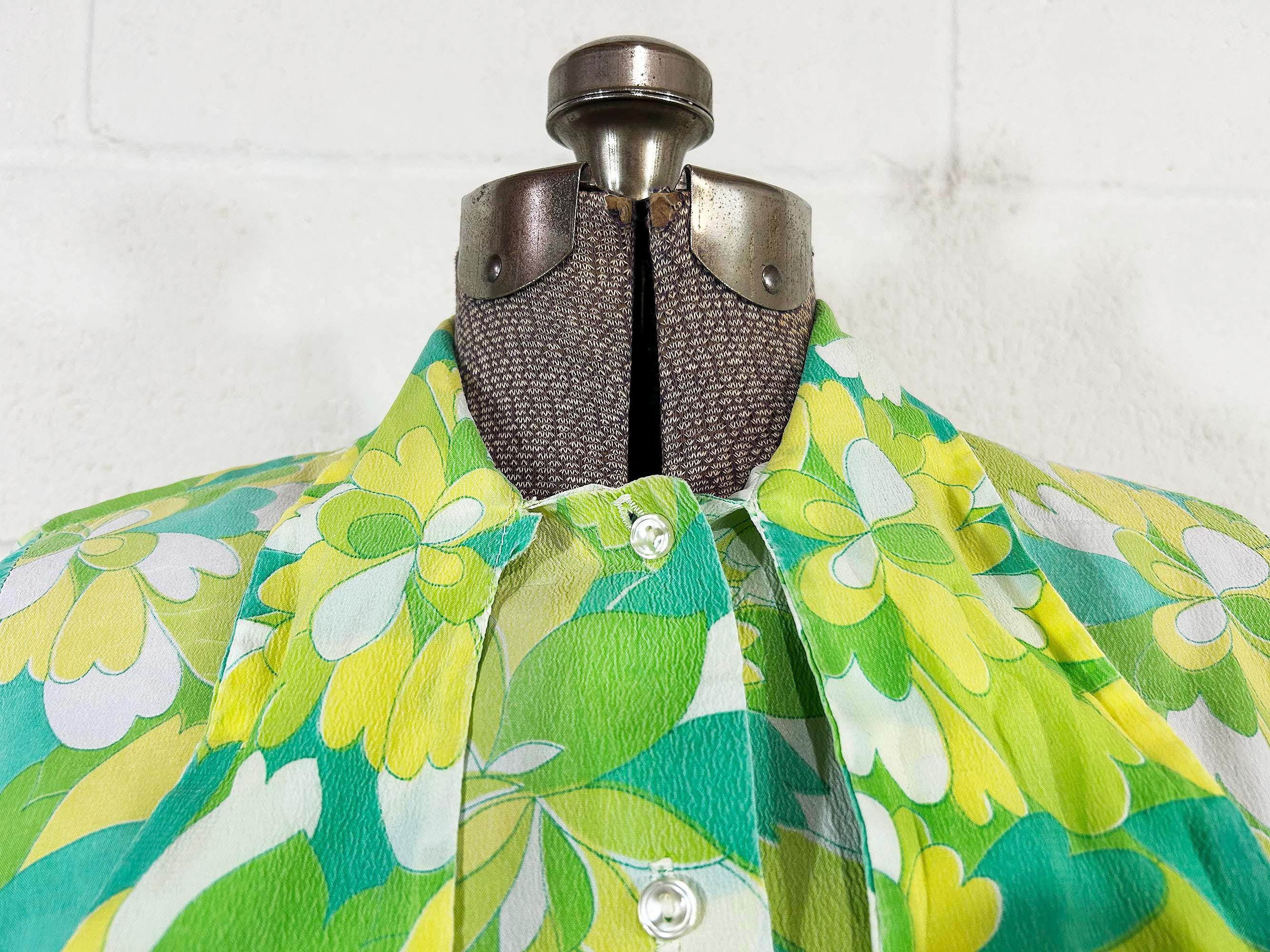 Cute bright green floral patterned long-sleeved top with a pussybow collar. Top is in good vintage condition - there is some all over fading on the print and some pulls at the seams - please be sure to inspect all photos closely. Button front style with buttons at the wrists. Fabric has no stretch and is lightweight.