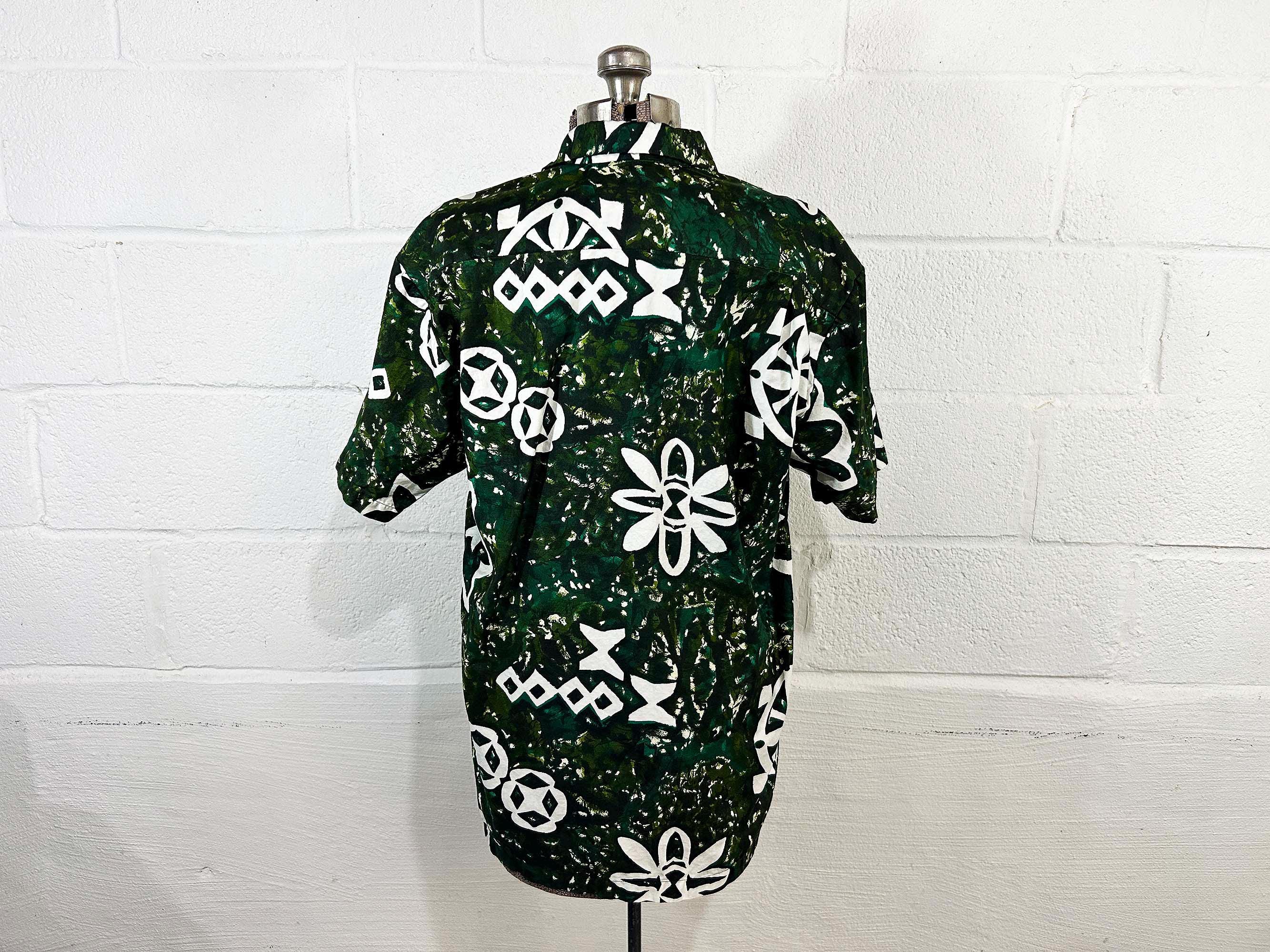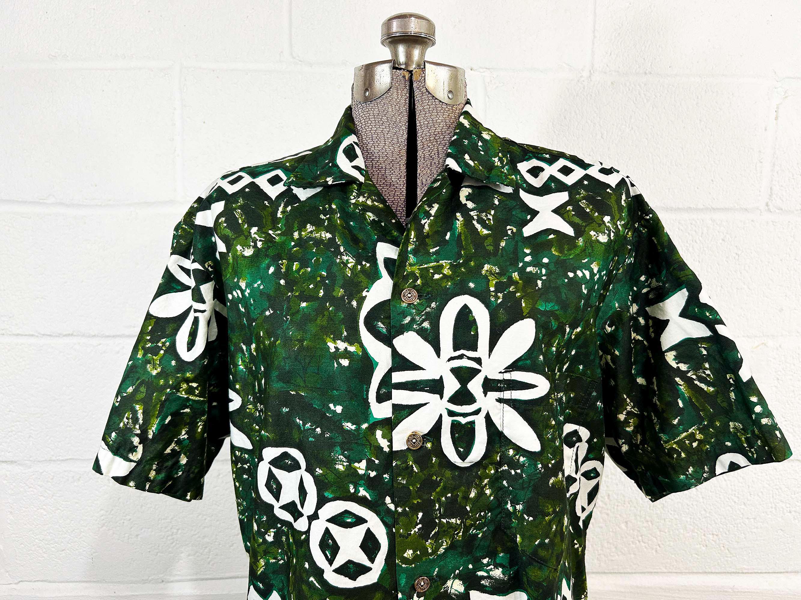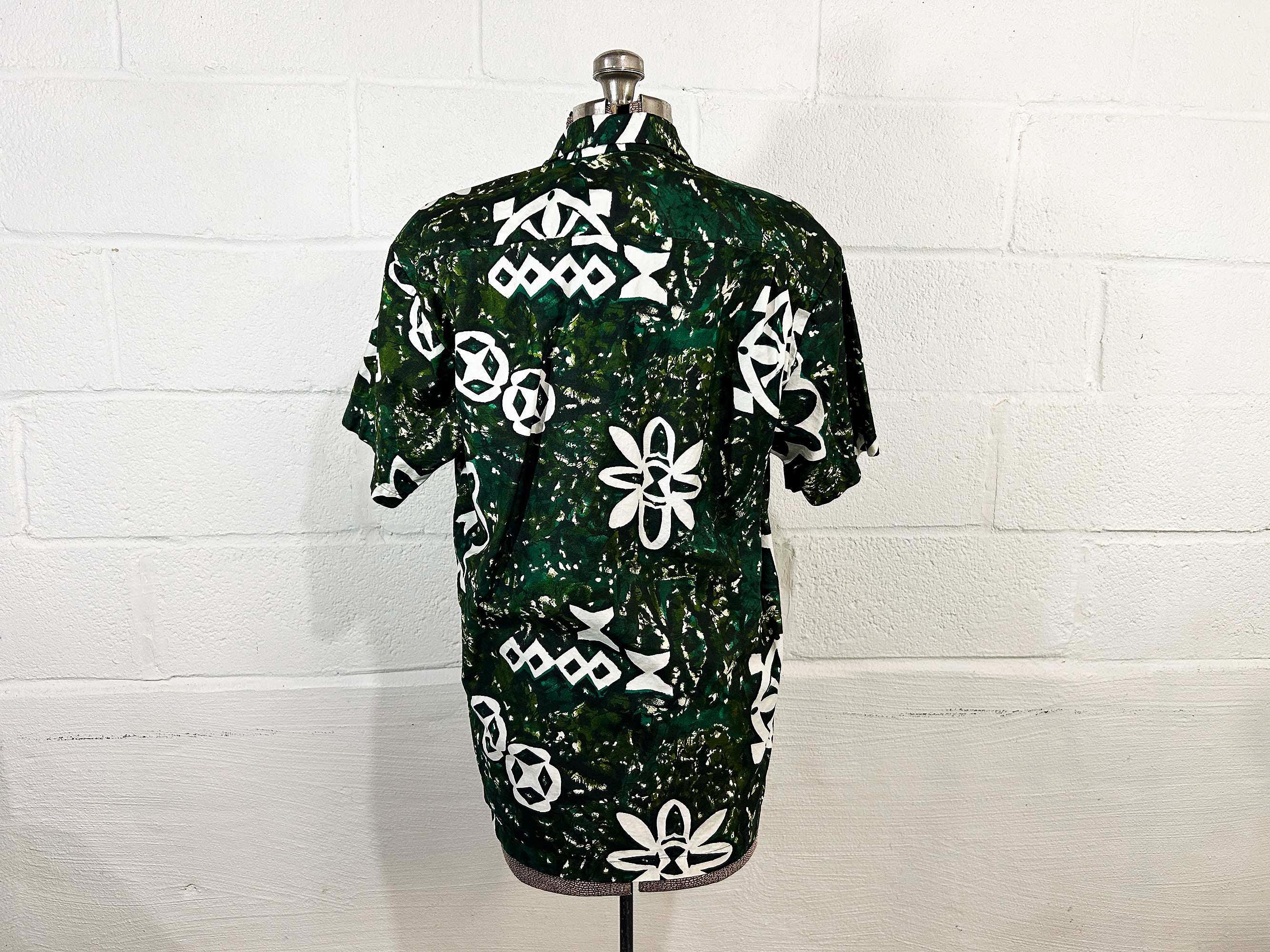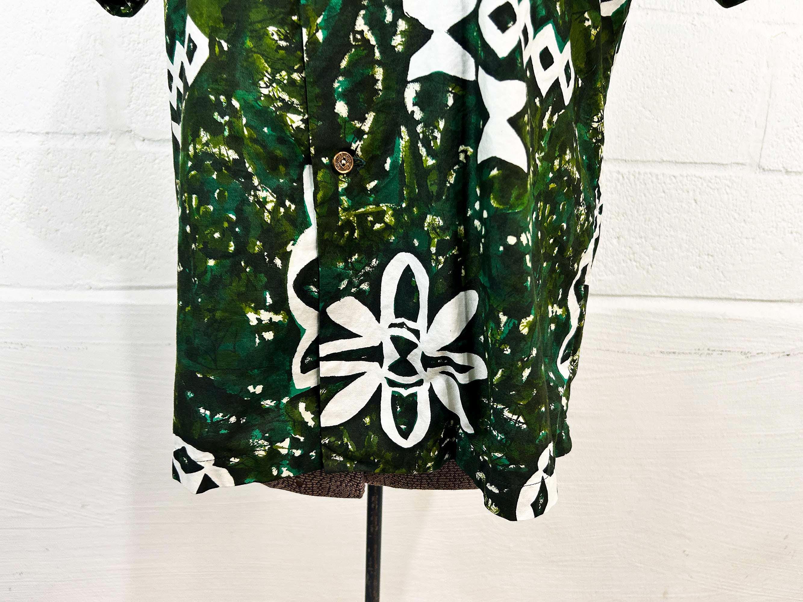 True vintage dark green collared short sleeved Hawaiian shirt. Shirt is in excellent vintage condition with no significant wear. One front chest pocket. Fabric has NO stretch and has a bit of sheen.