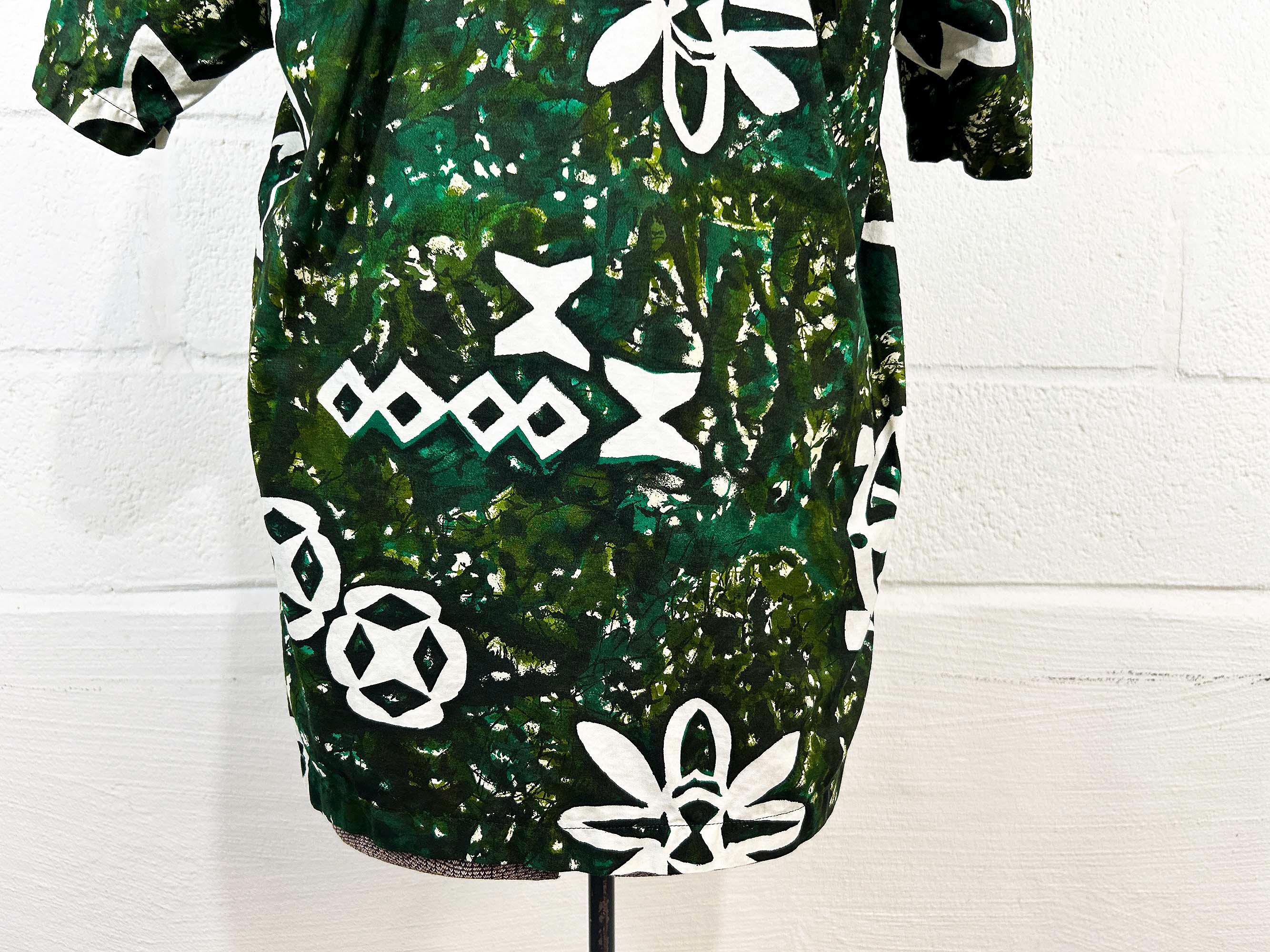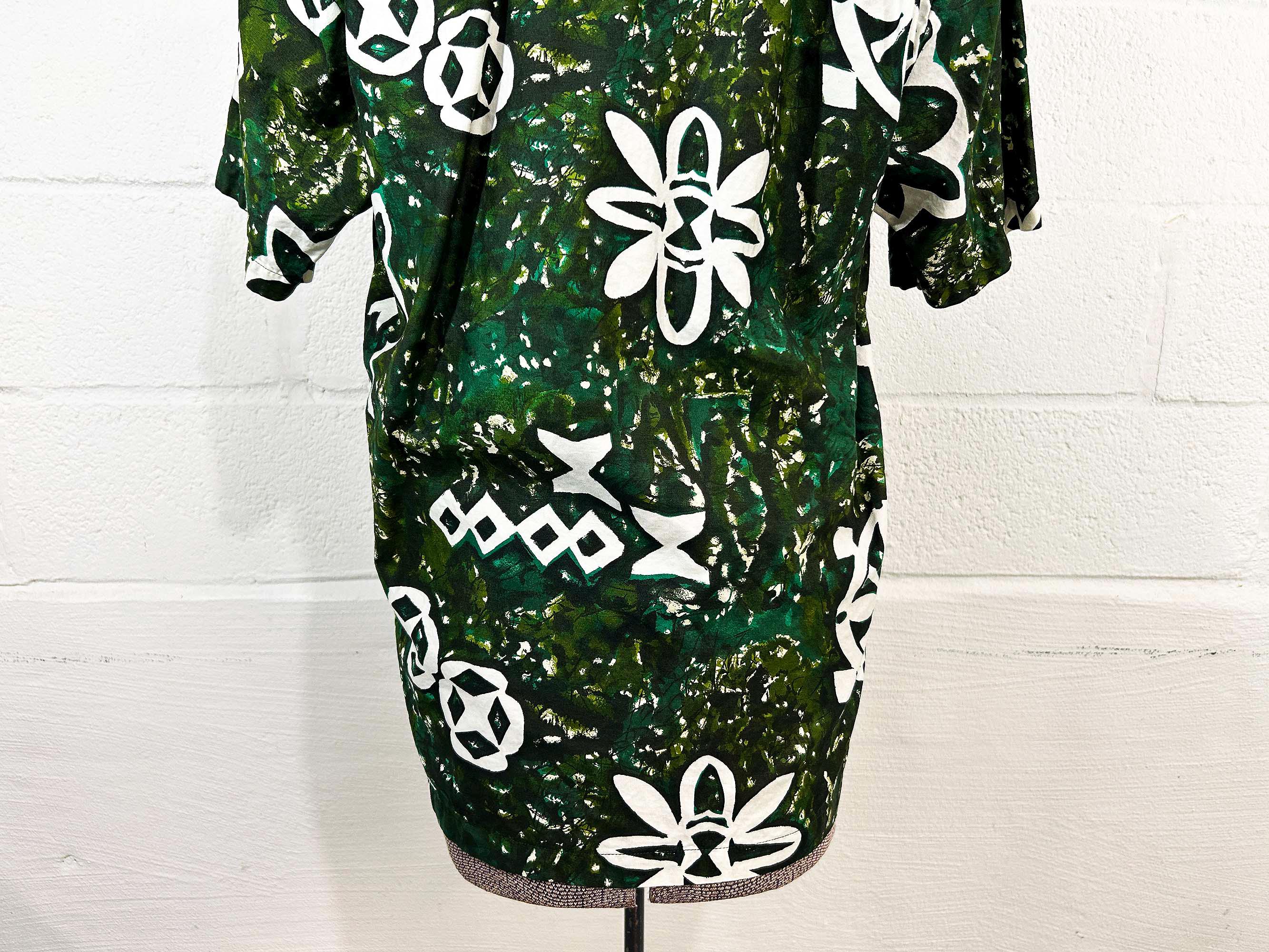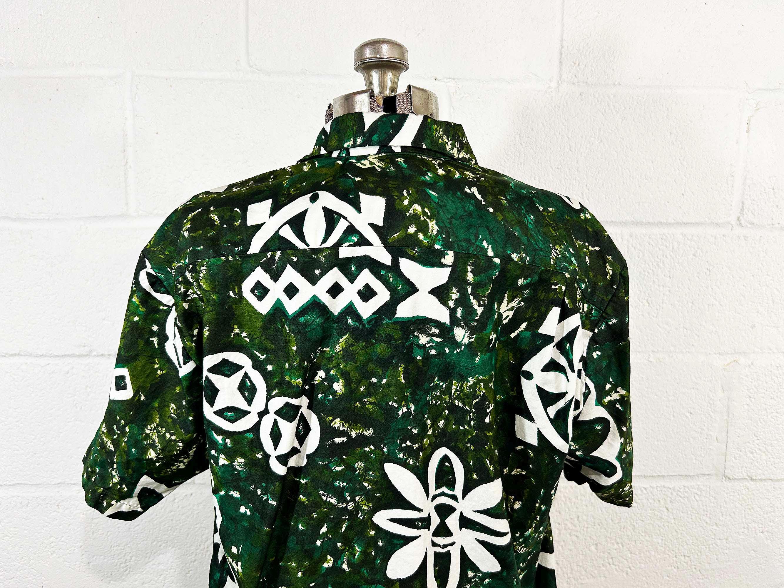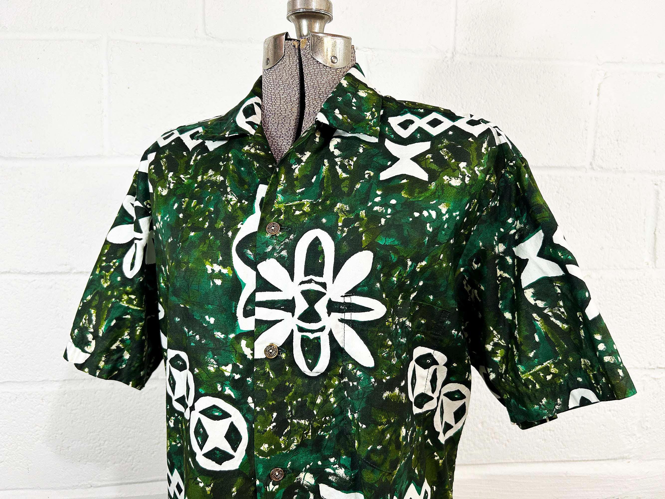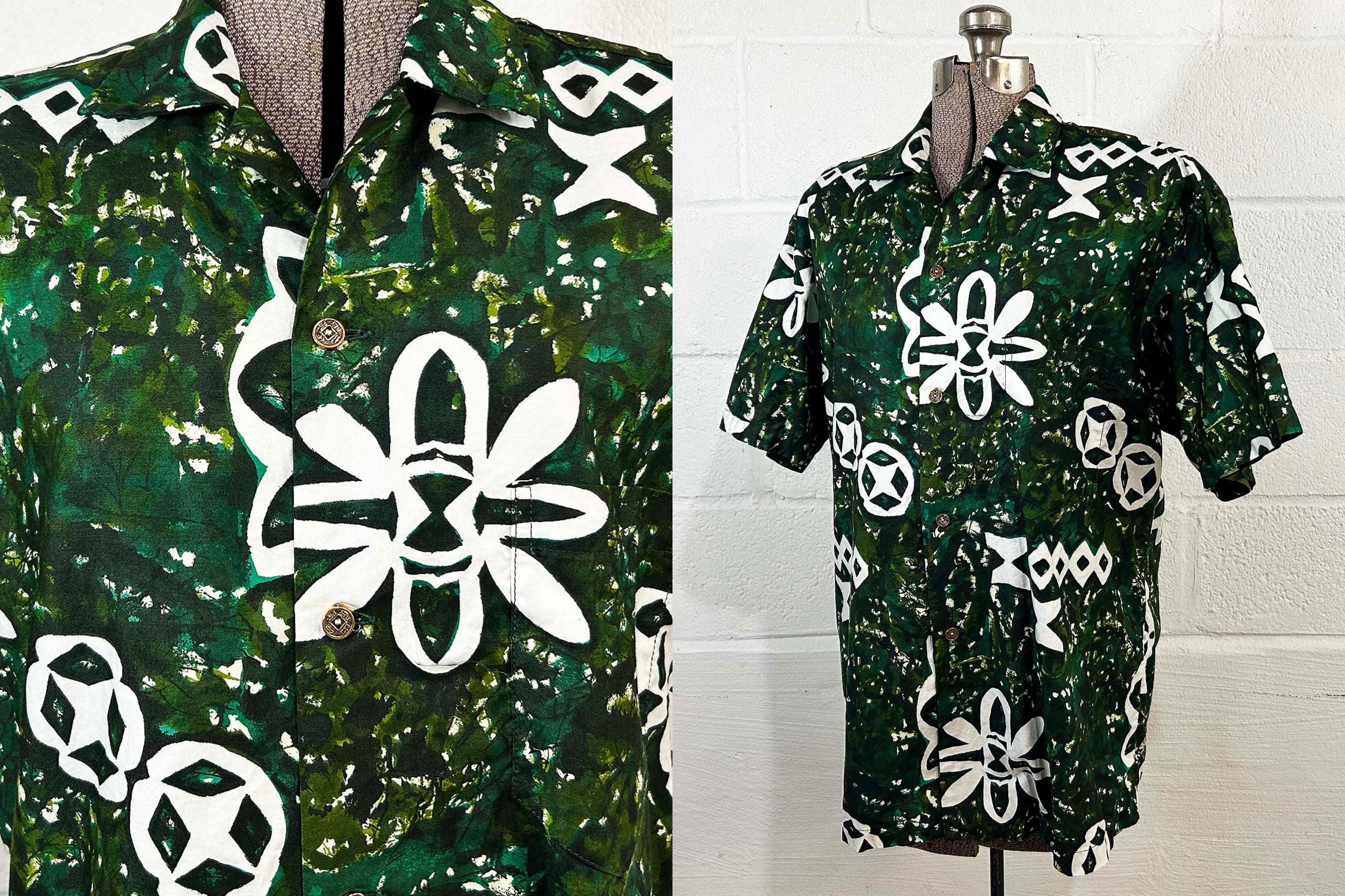 True vintage dark green collared short sleeved Hawaiian shirt. Shirt is in excellent vintage condition with no significant wear. One front chest pocket. Fabric has NO stretch and has a bit of sheen.